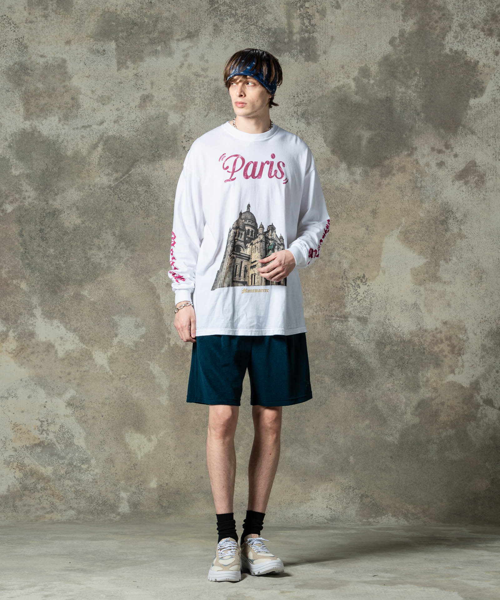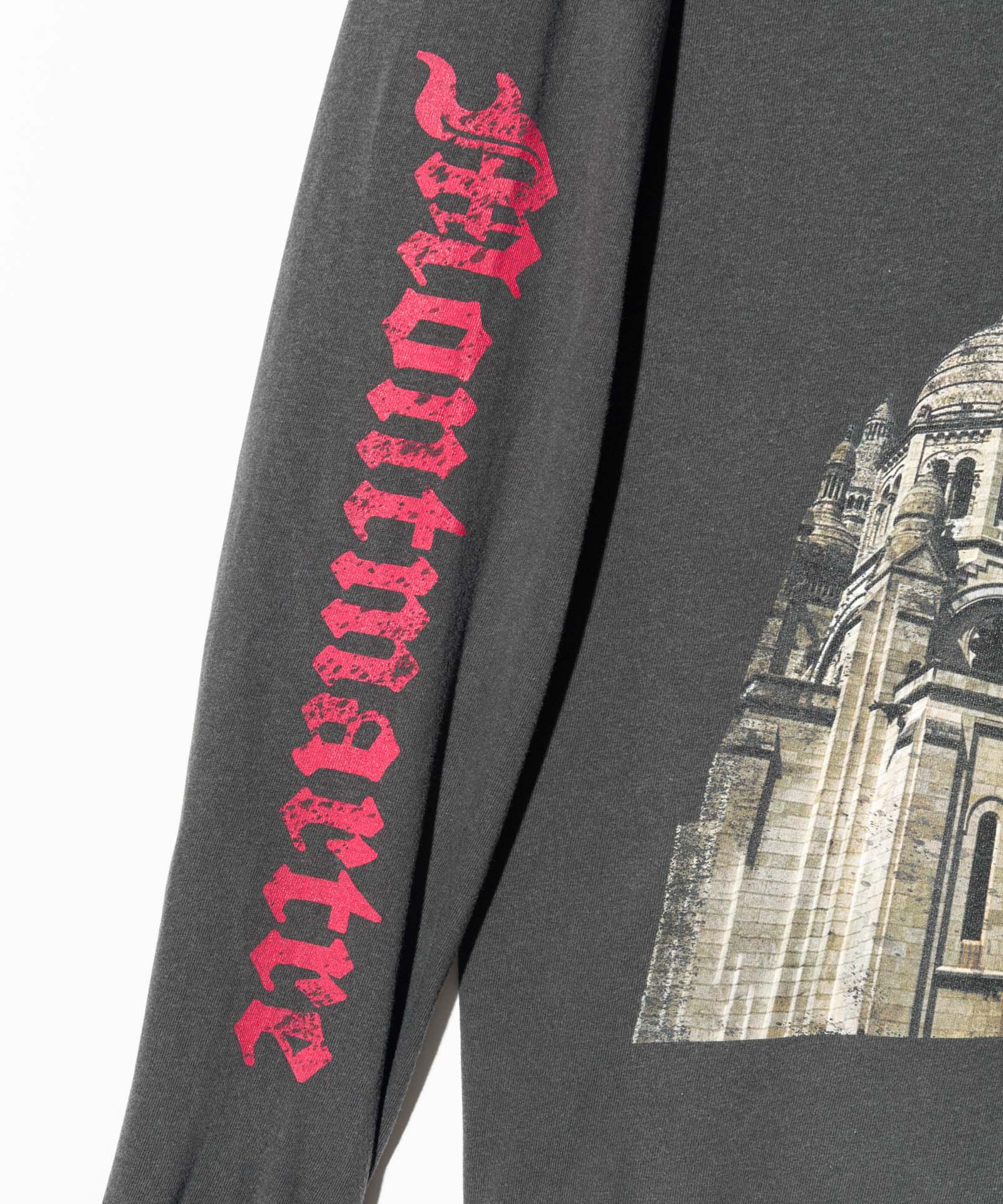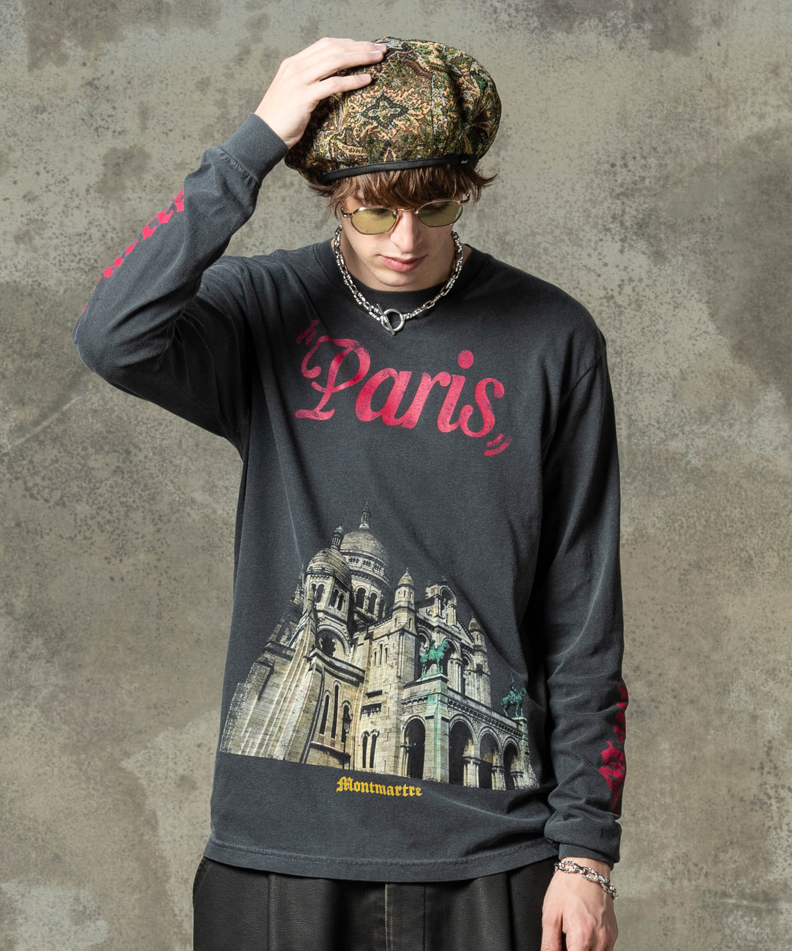デザイナーがインスピレーションを求めて訪れたパリで撮影した写真を用いたフォトロンT、Montmartre Long Sleeves T-Shirt。フロントに大胆に配したのはパリの街を見下ろすロケーションにある荘厳な寺院。グラフィックと胸元のロゴ、左右アームのプリントにはかすれの表現を加えて、時の流れを感じさせるテクスチャを乗せました。ボディに用いたのは6.1オンスミディアムウェイトのコットン100%生地。着丈を長めに、身幅を広めに設けたルーズフィットが今らしい着こなしを叶えます。
