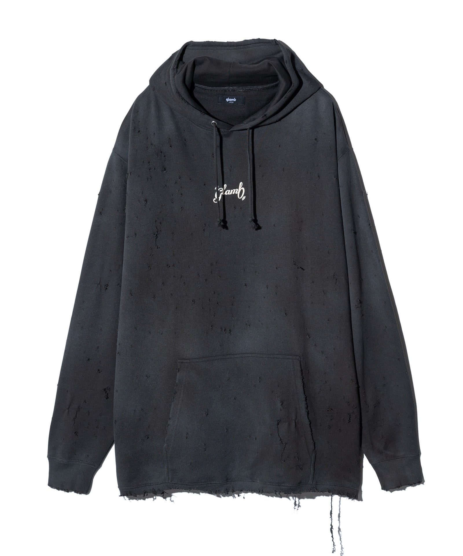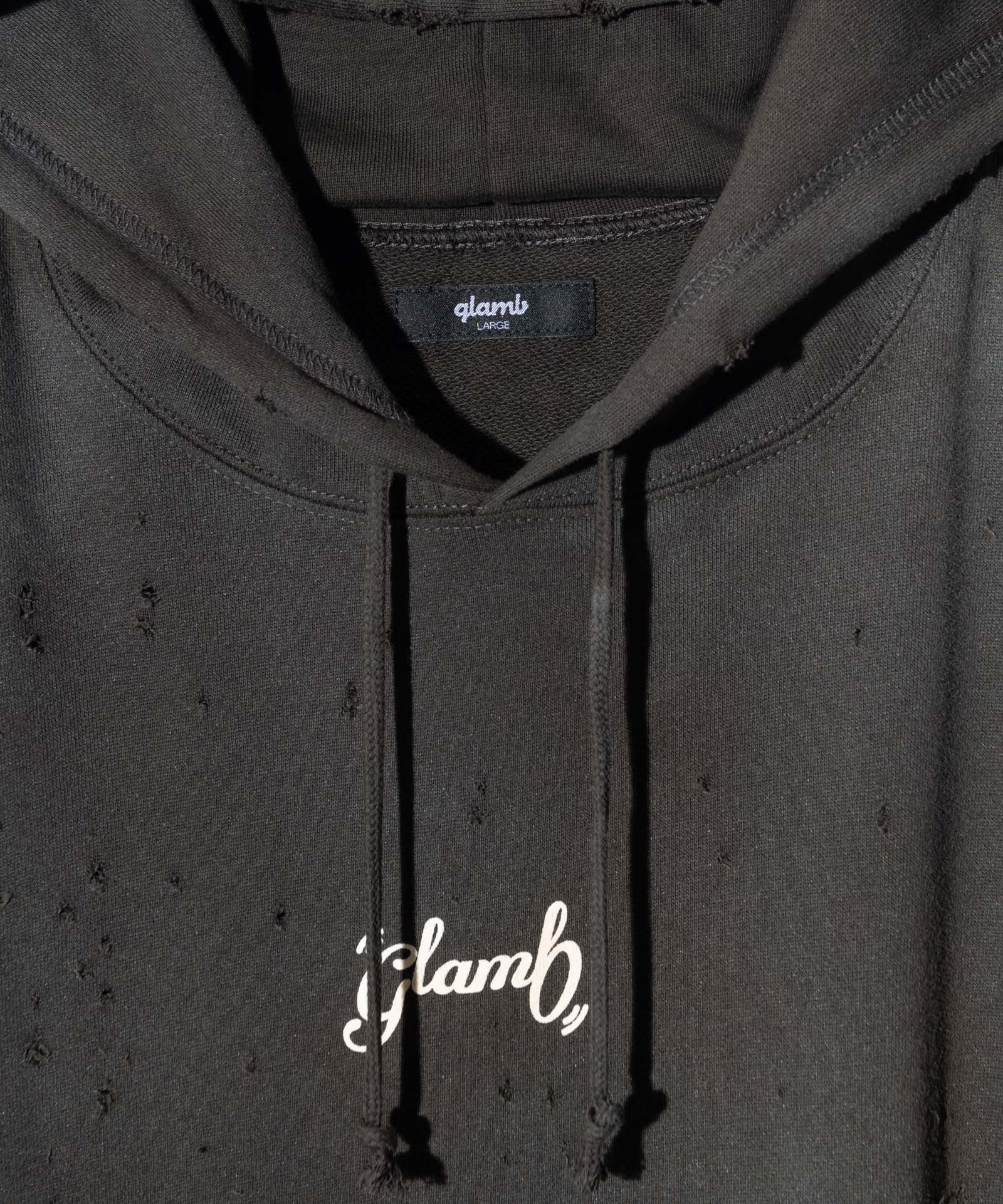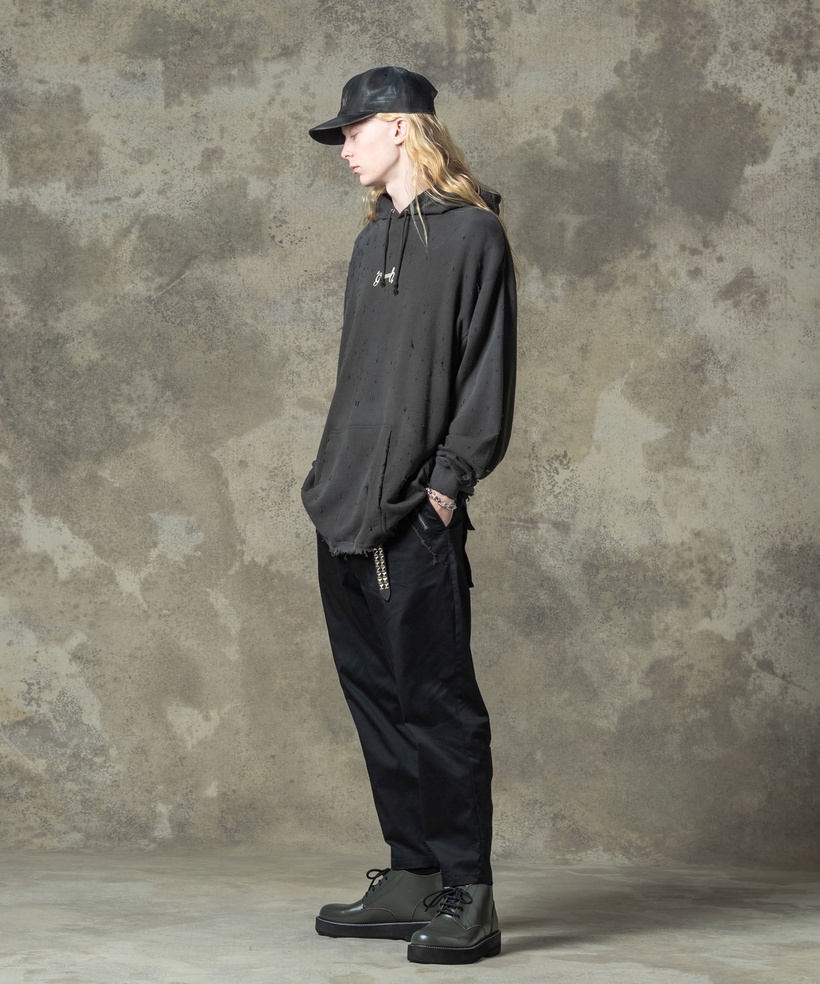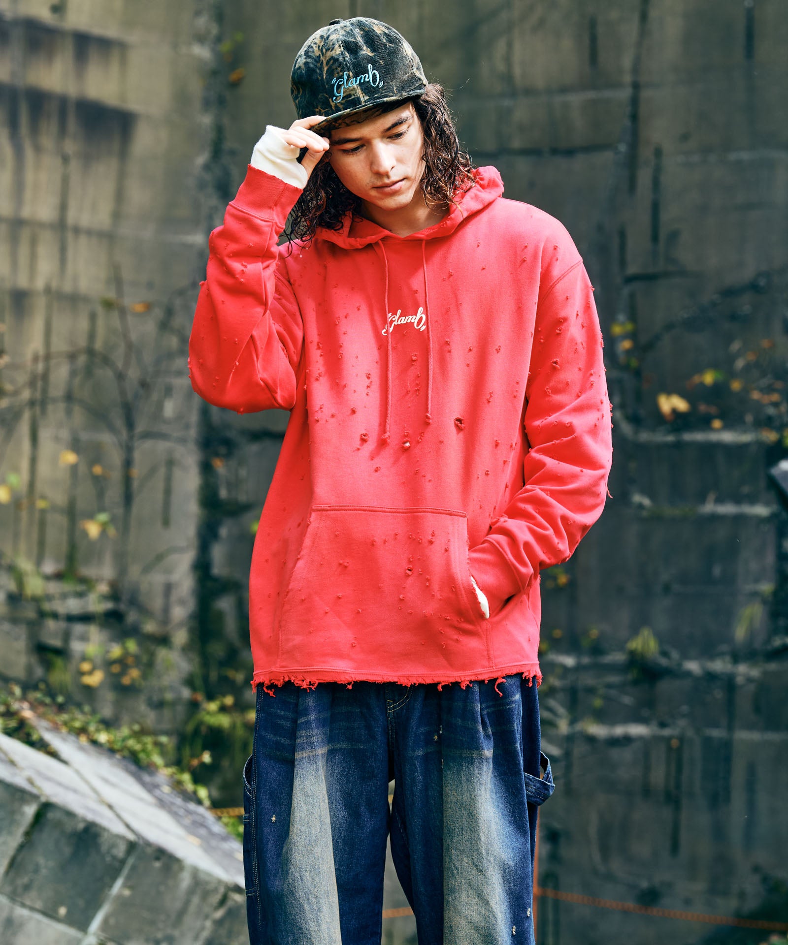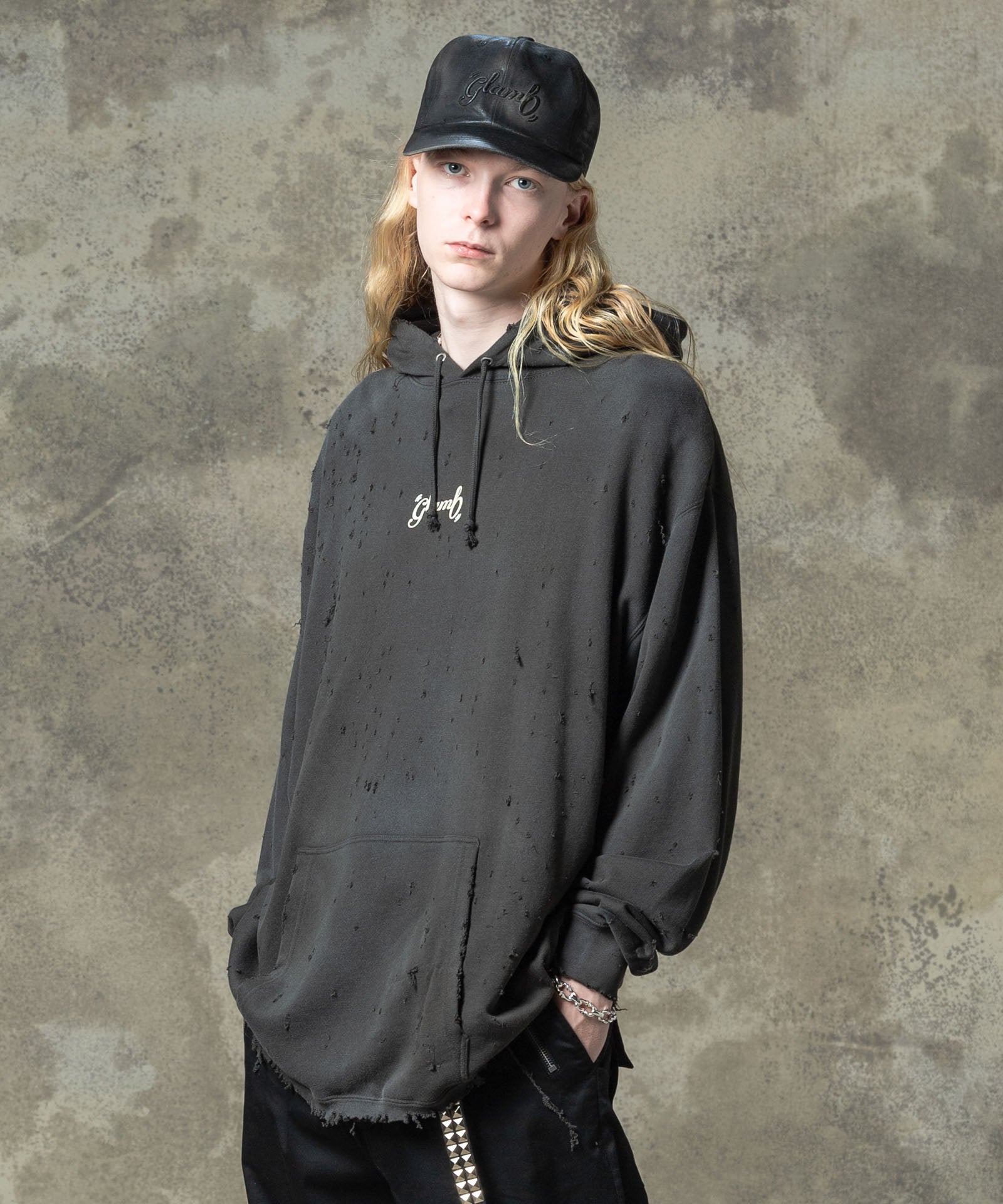 glambが培ってきた加工技術を余すところなく発揮、ダメージをアートに昇華したDestructive Hoodie。ハードなダメージの数々は門外不出の工具複数種を駆使してスクラッチやカットオフで刻み込んだもの。仕上げに施したブリーチと汚しをもたらすスプレー加工2種に至るまで、ブランドの職人が1枚1枚、手作業で向き合って仕上げています。テキスタイルに用いたのはコットン100%の裏パイル生地。着丈長め、身幅広めのビッグシルエットは加工のテクスチャを強調、インパクトあるトップススタイルを演出します。
