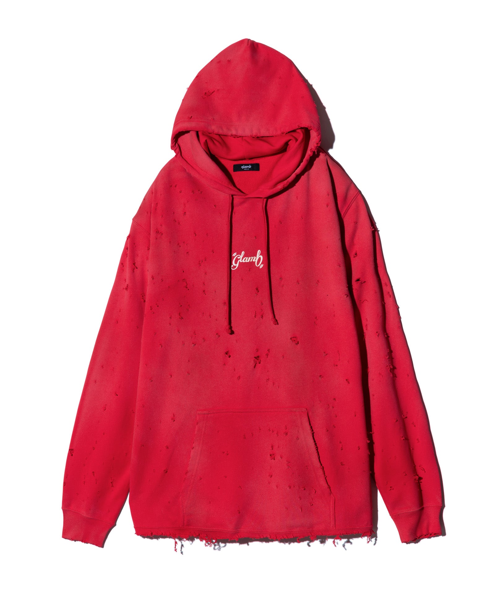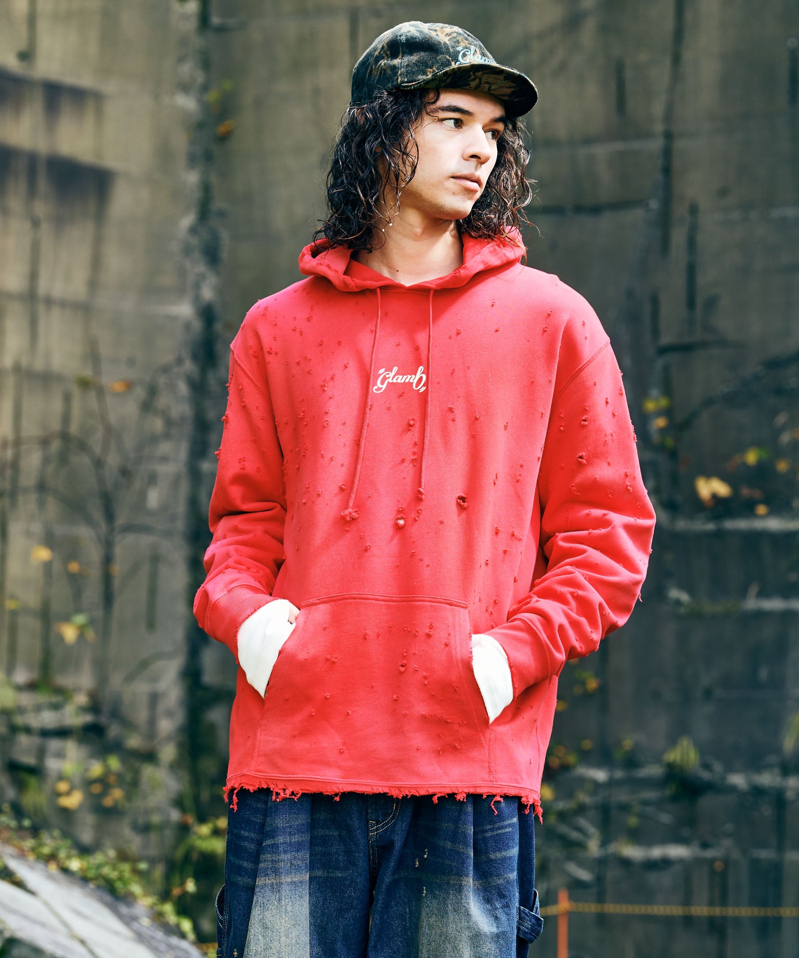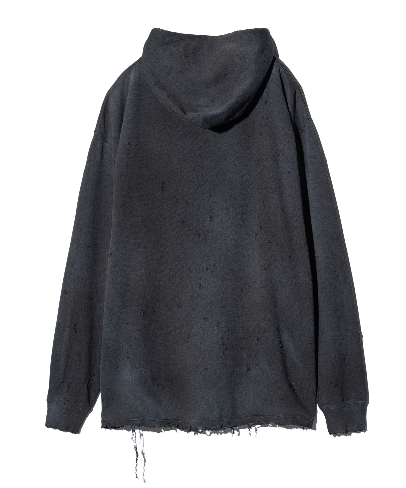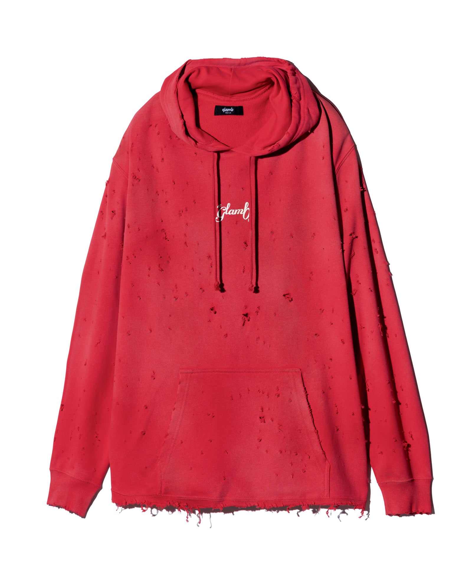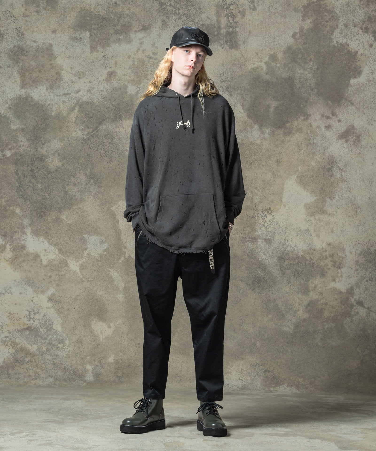 glambが培ってきた加工技術を余すところなく発揮、ダメージをアートに昇華したDestructive Hoodie。ハードなダメージの数々は門外不出の工具複数種を駆使してスクラッチやカットオフで刻み込んだもの。仕上げに施したブリーチと汚しをもたらすスプレー加工2種に至るまで、ブランドの職人が1枚1枚、手作業で向き合って仕上げています。テキスタイルに用いたのはコットン100%の裏パイル生地。着丈長め、身幅広めのビッグシルエットは加工のテクスチャを強調、インパクトあるトップススタイルを演出します。