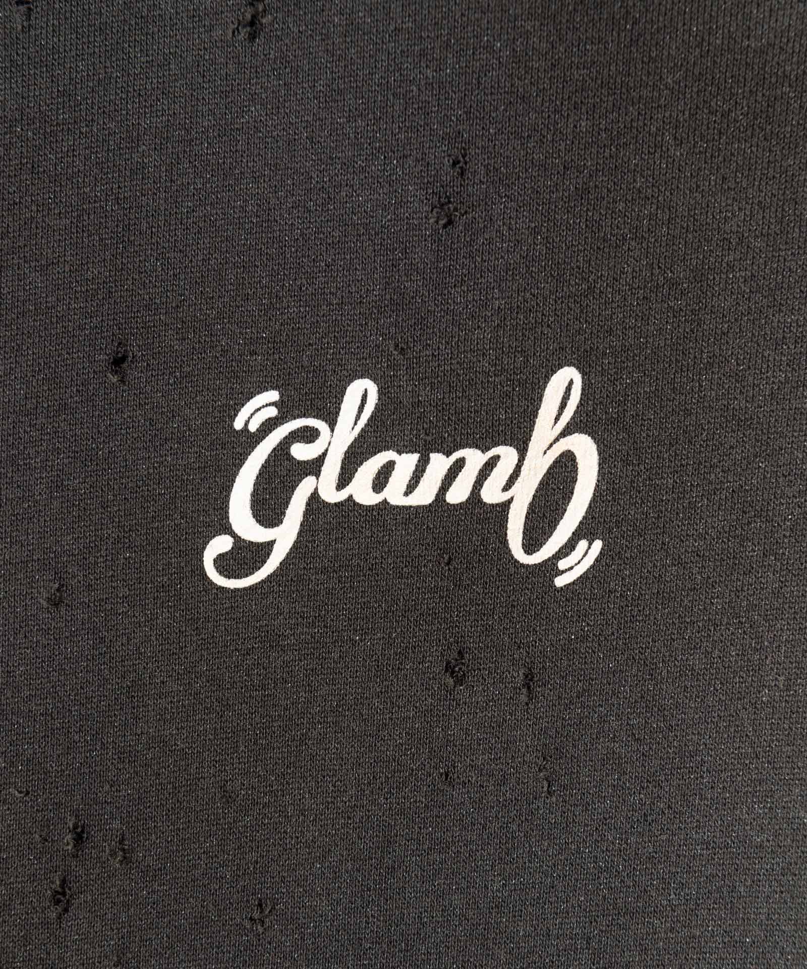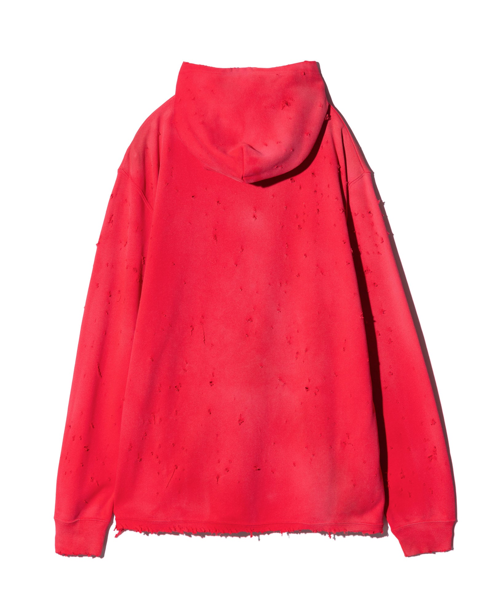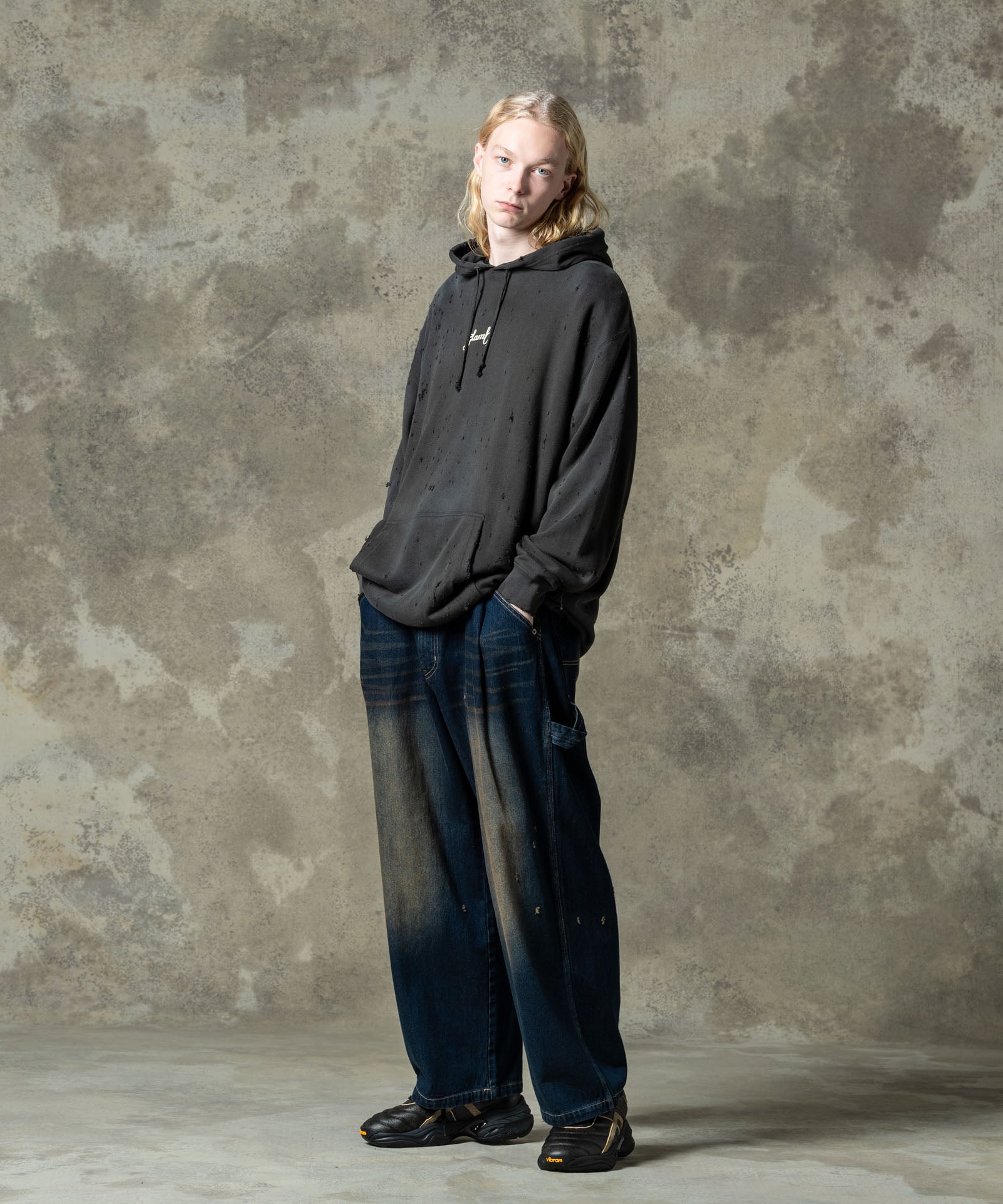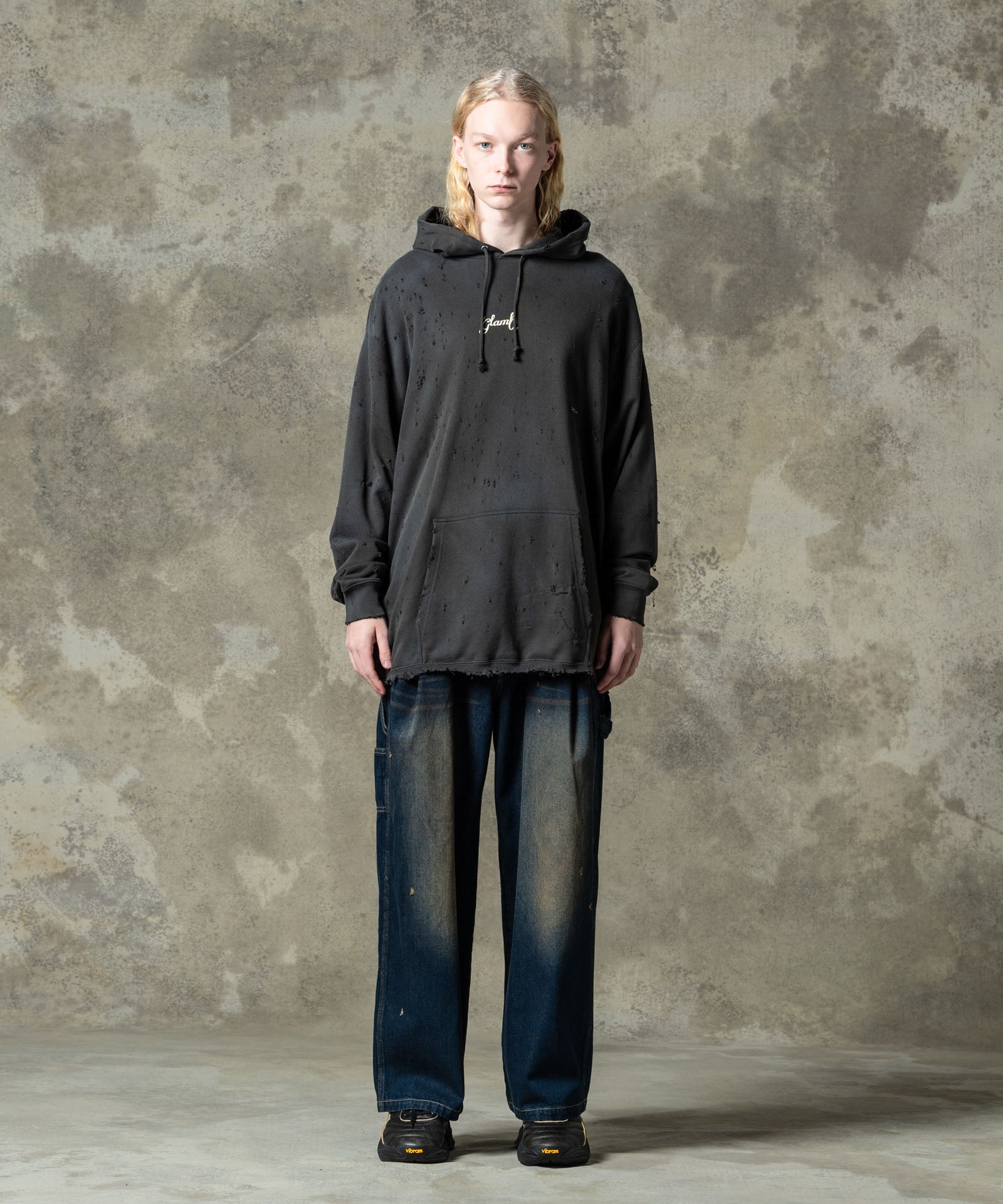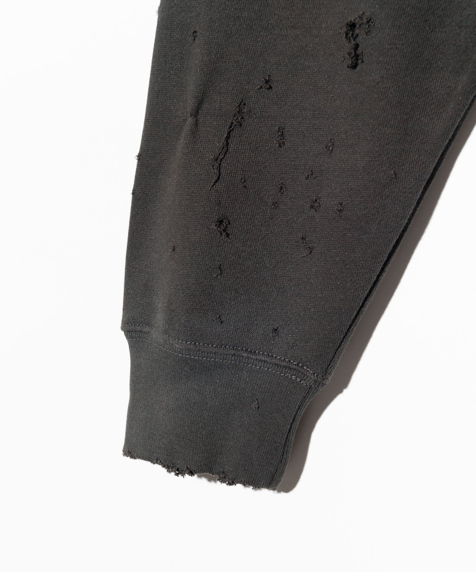 glambが培ってきた加工技術を余すところなく発揮、ダメージをアートに昇華したDestructive Hoodie。ハードなダメージの数々は門外不出の工具複数種を駆使してスクラッチやカットオフで刻み込んだもの。仕上げに施したブリーチと汚しをもたらすスプレー加工2種に至るまで、ブランドの職人が1枚1枚、手作業で向き合って仕上げています。テキスタイルに用いたのはコットン100%の裏パイル生地。着丈長め、身幅広めのビッグシルエットは加工のテクスチャを強調、インパクトあるトップススタイルを演出します。