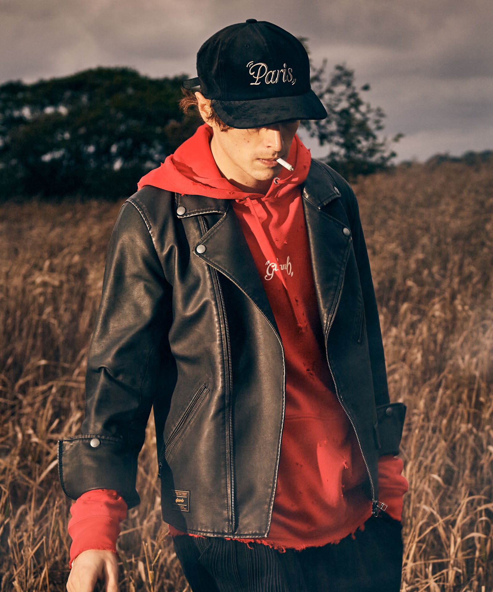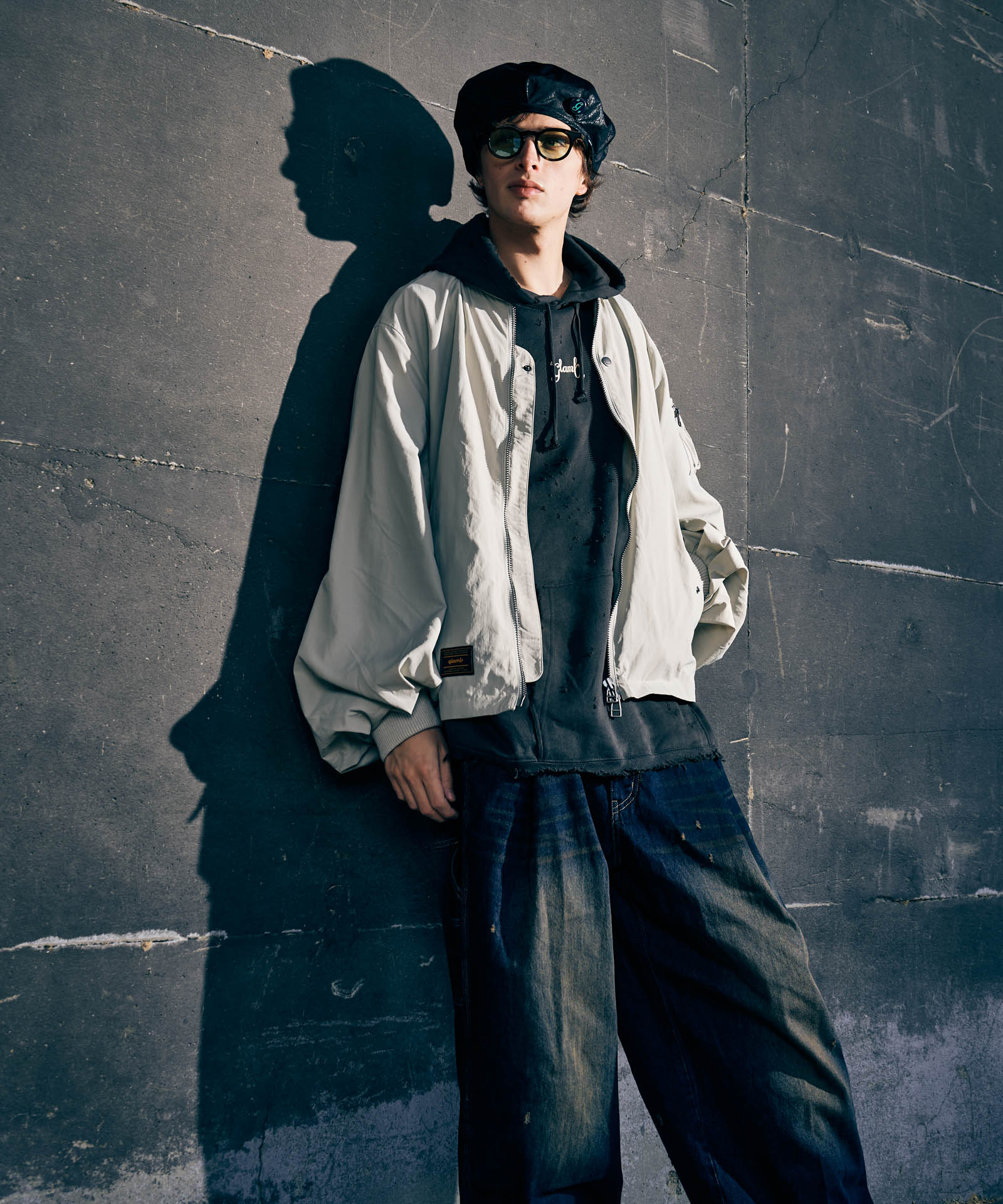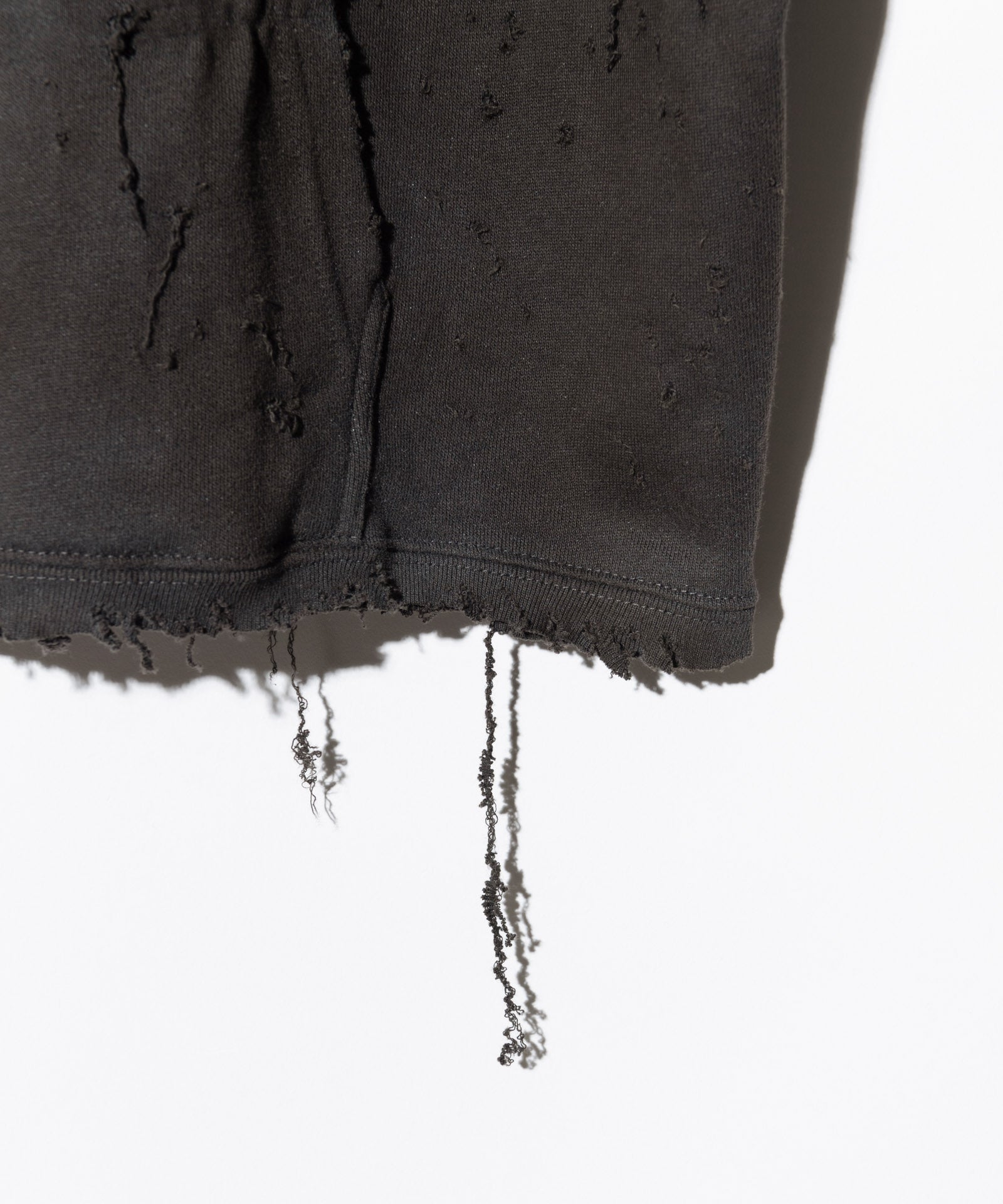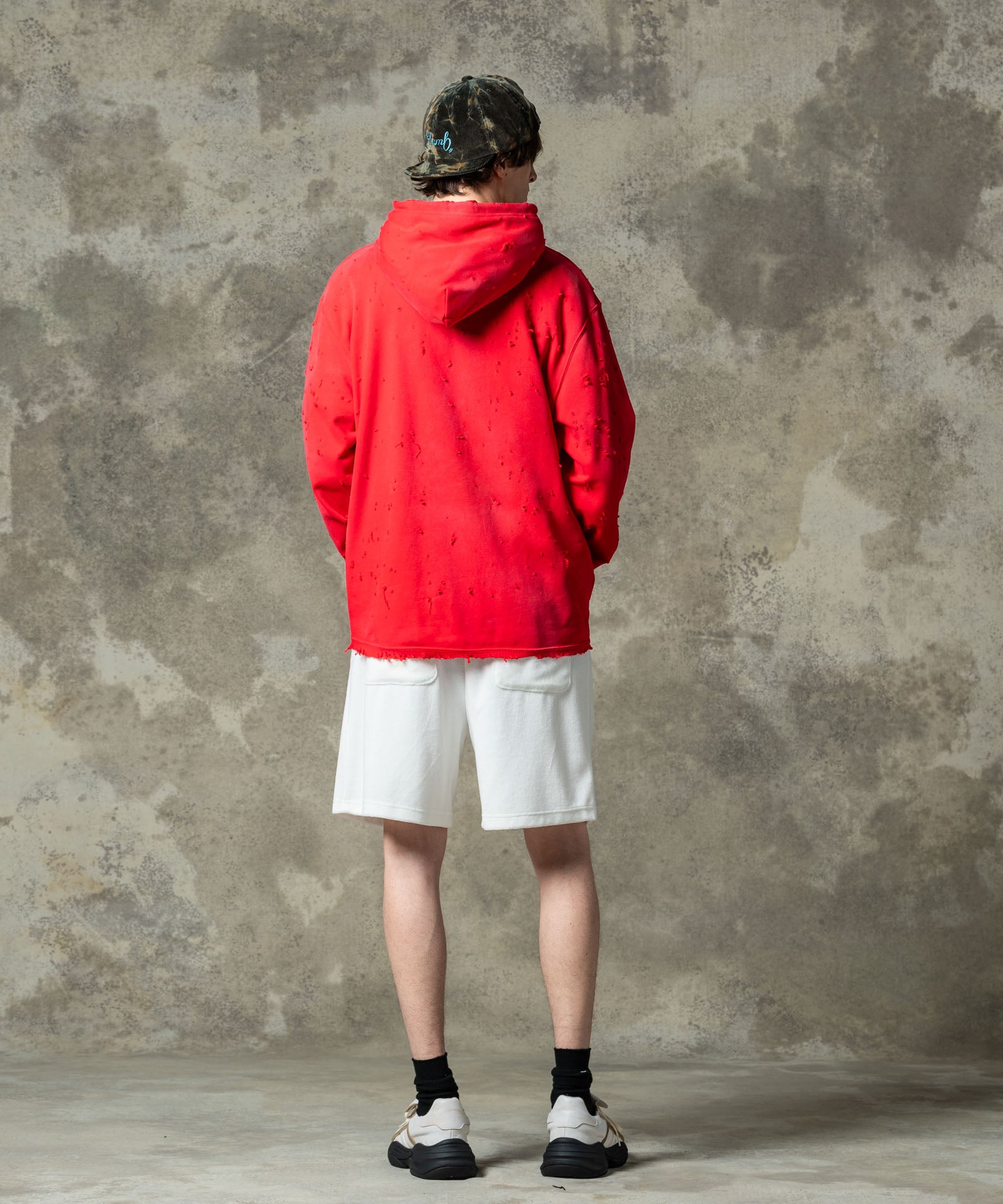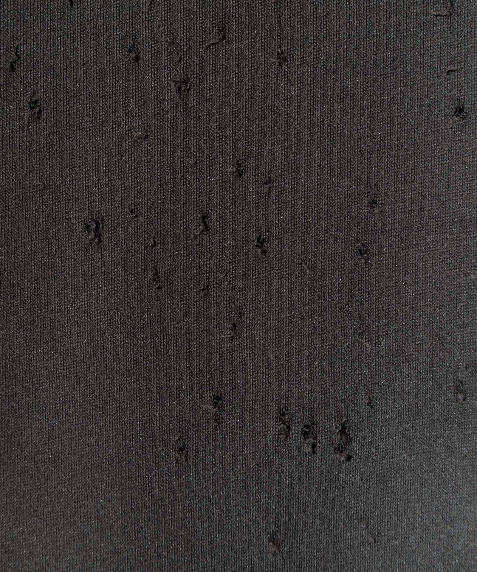 glambが培ってきた加工技術を余すところなく発揮、ダメージをアートに昇華したDestructive Hoodie。ハードなダメージの数々は門外不出の工具複数種を駆使してスクラッチやカットオフで刻み込んだもの。仕上げに施したブリーチと汚しをもたらすスプレー加工2種に至るまで、ブランドの職人が1枚1枚、手作業で向き合って仕上げています。テキスタイルに用いたのはコットン100%の裏パイル生地。着丈長め、身幅広めのビッグシルエットは加工のテクスチャを強調、インパクトあるトップススタイルを演出します。