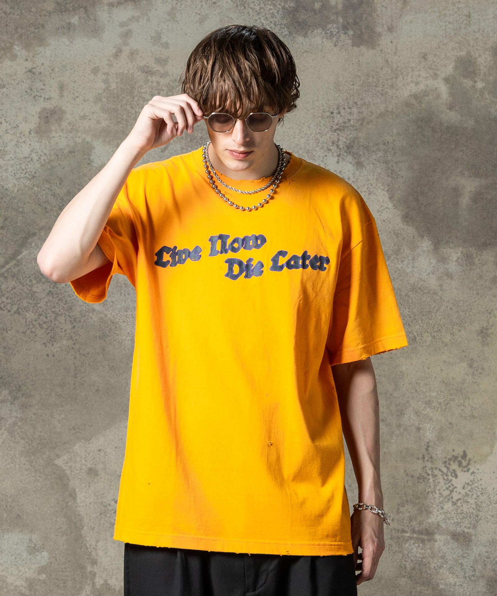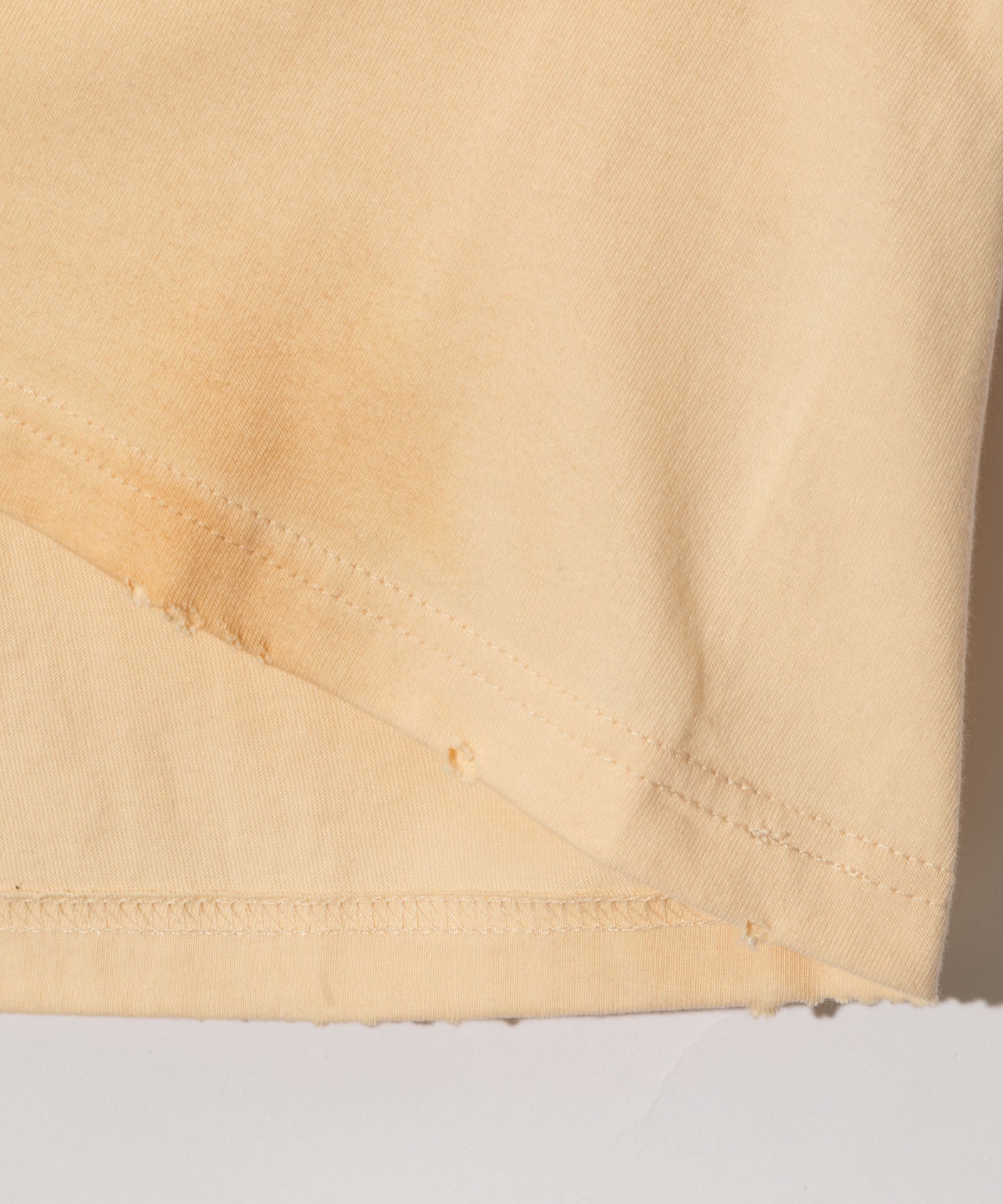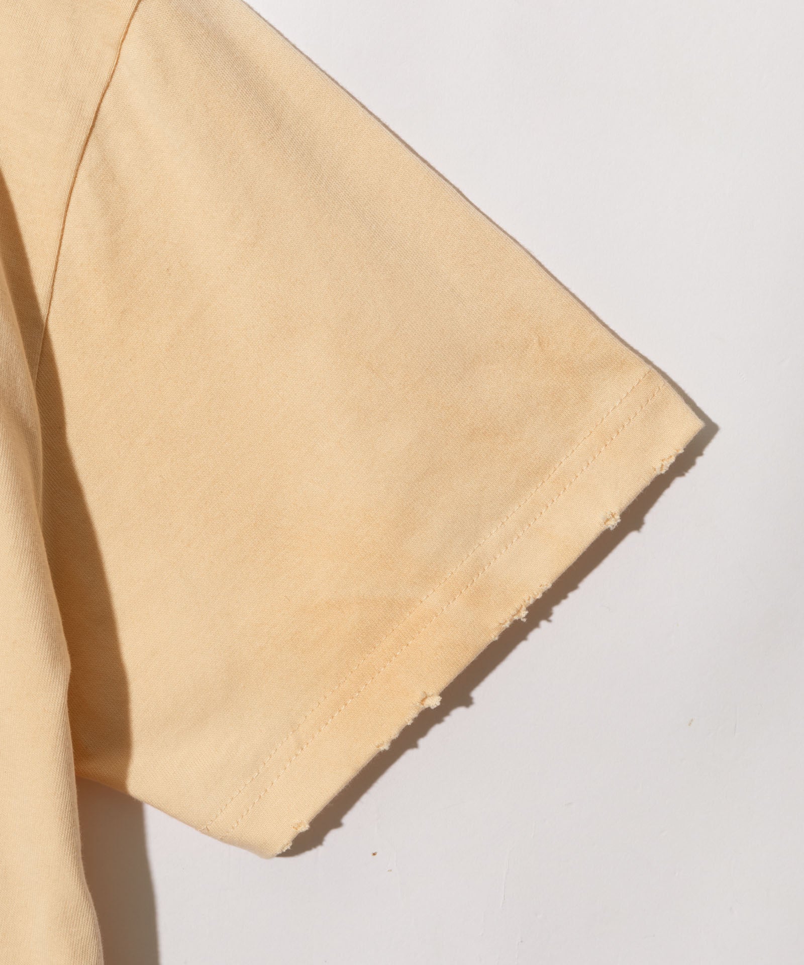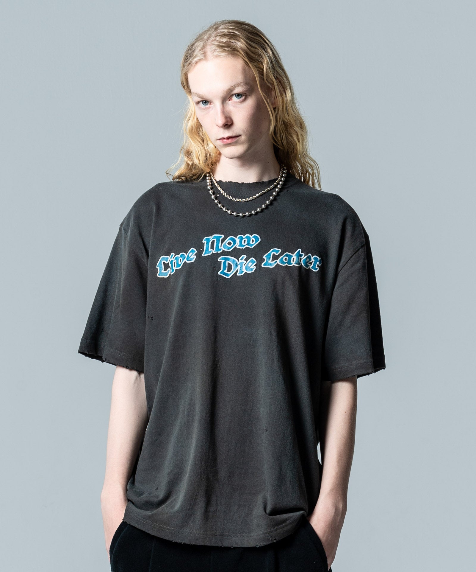 加工とプリントの双方からブランドの掲げるグランジスタイルを表現したGrunge Message T-Shirt。首周りと袖口、裾に刻んだダメージの数々は熟練の職人が手作業であしらったもの。フロントにクラックプリント、バックスタイルにはさらに発泡プリントも重ねてブランドのメッセージを乗せました。テキスタイルにはコットン100%の上質な5.6オンスミディアムウェイト天竺を使用。ボディは着丈を長めに、身幅を広めに設けたルーズシルエットとなっております。