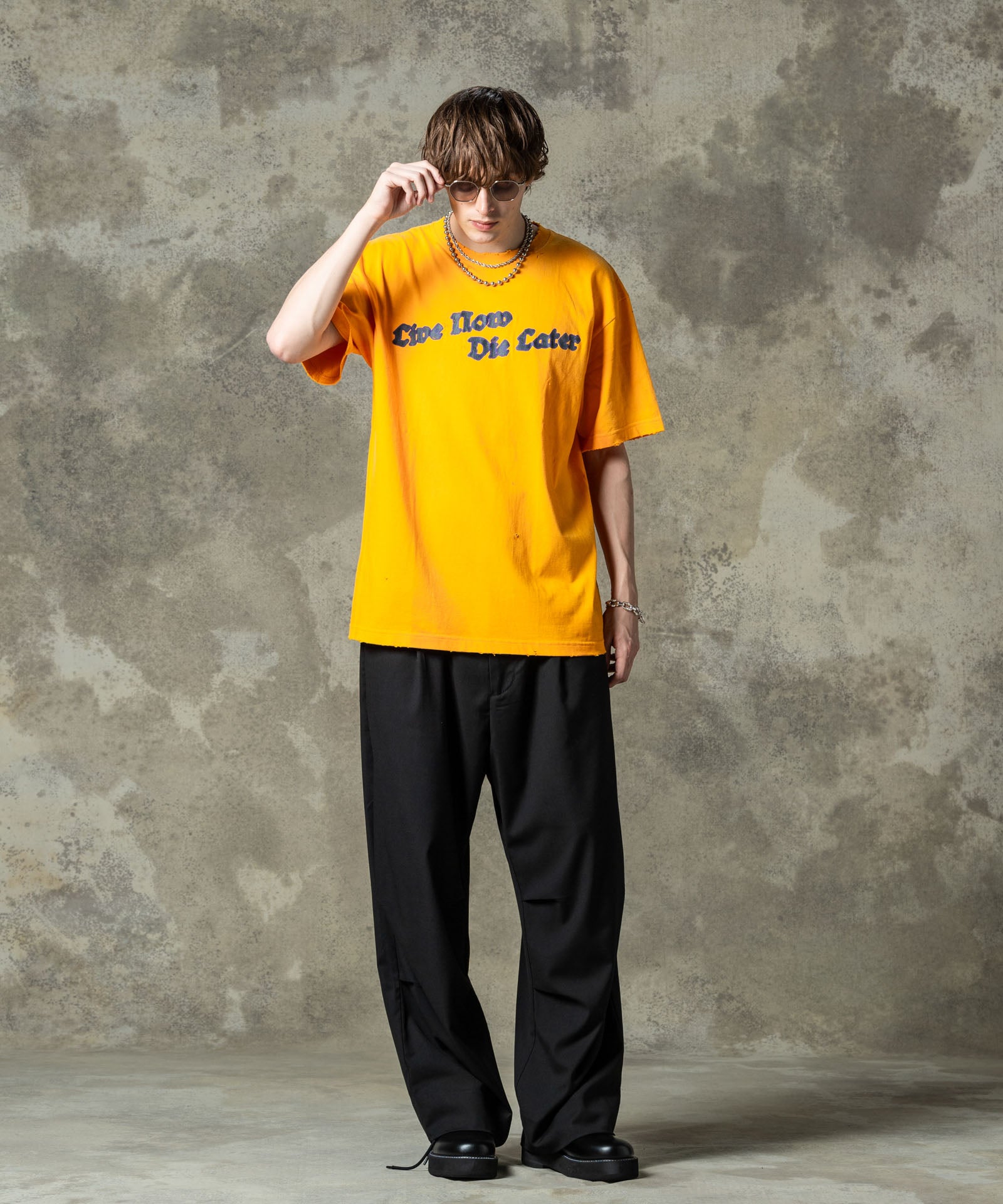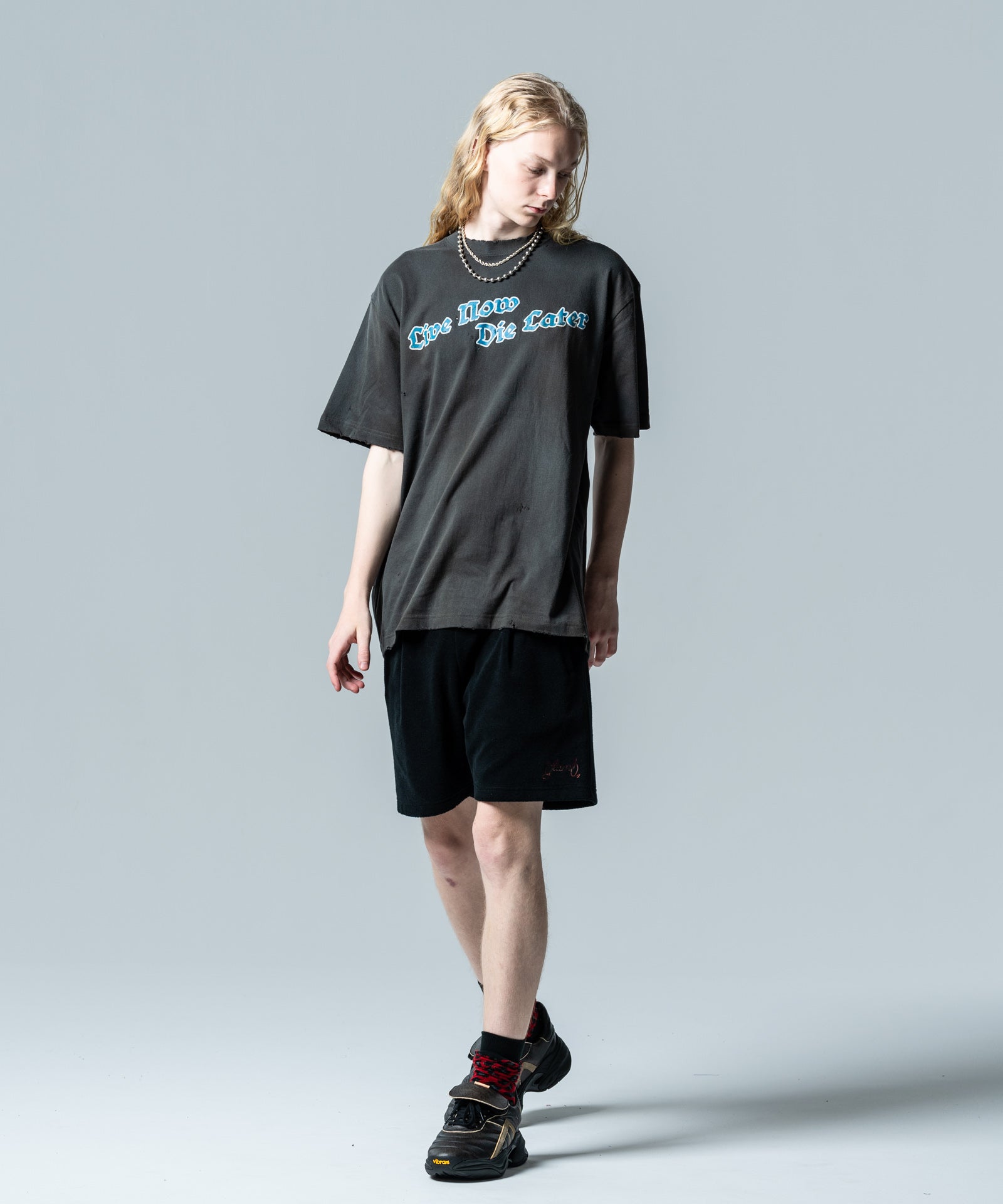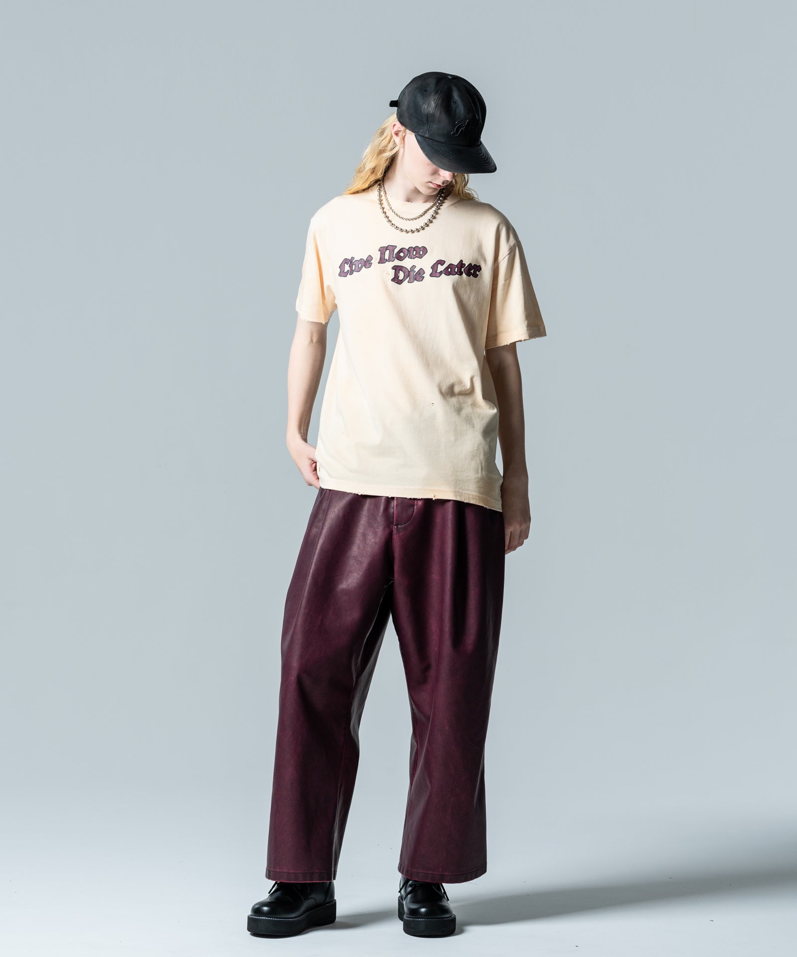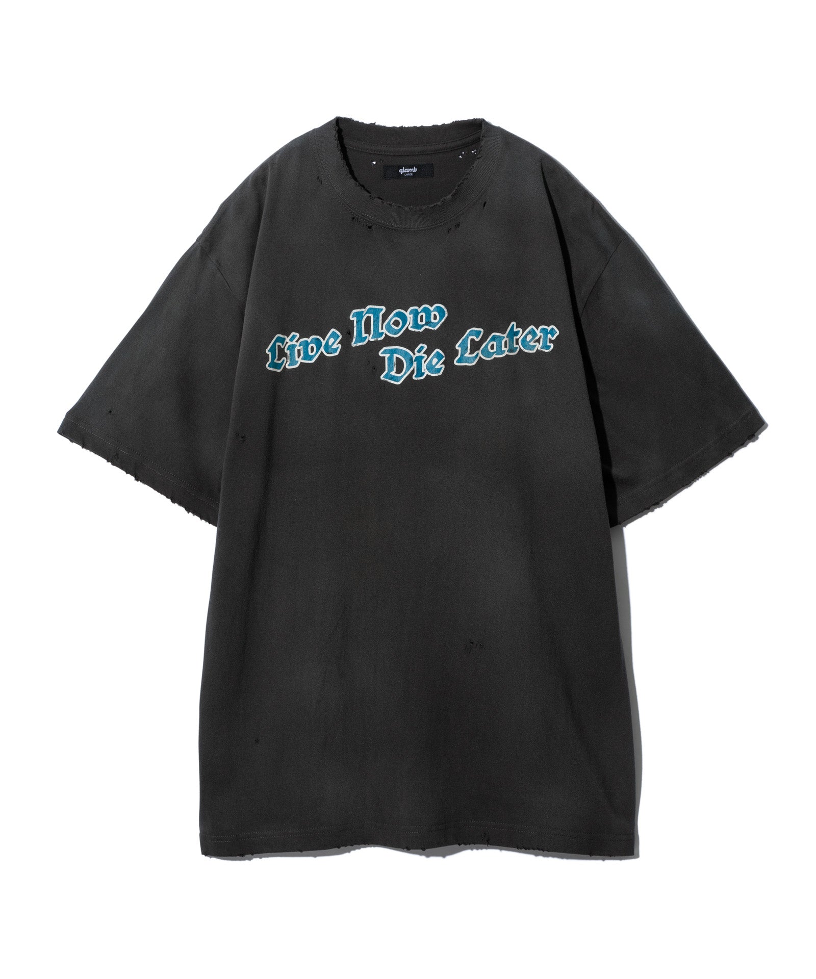 加工とプリントの双方からブランドの掲げるグランジスタイルを表現したGrunge Message T-Shirt。首周りと袖口、裾に刻んだダメージの数々は熟練の職人が手作業であしらったもの。フロントにクラックプリント、バックスタイルにはさらに発泡プリントも重ねてブランドのメッセージを乗せました。テキスタイルにはコットン100%の上質な5.6オンスミディアムウェイト天竺を使用。ボディは着丈を長めに、身幅を広めに設けたルーズシルエットとなっております。