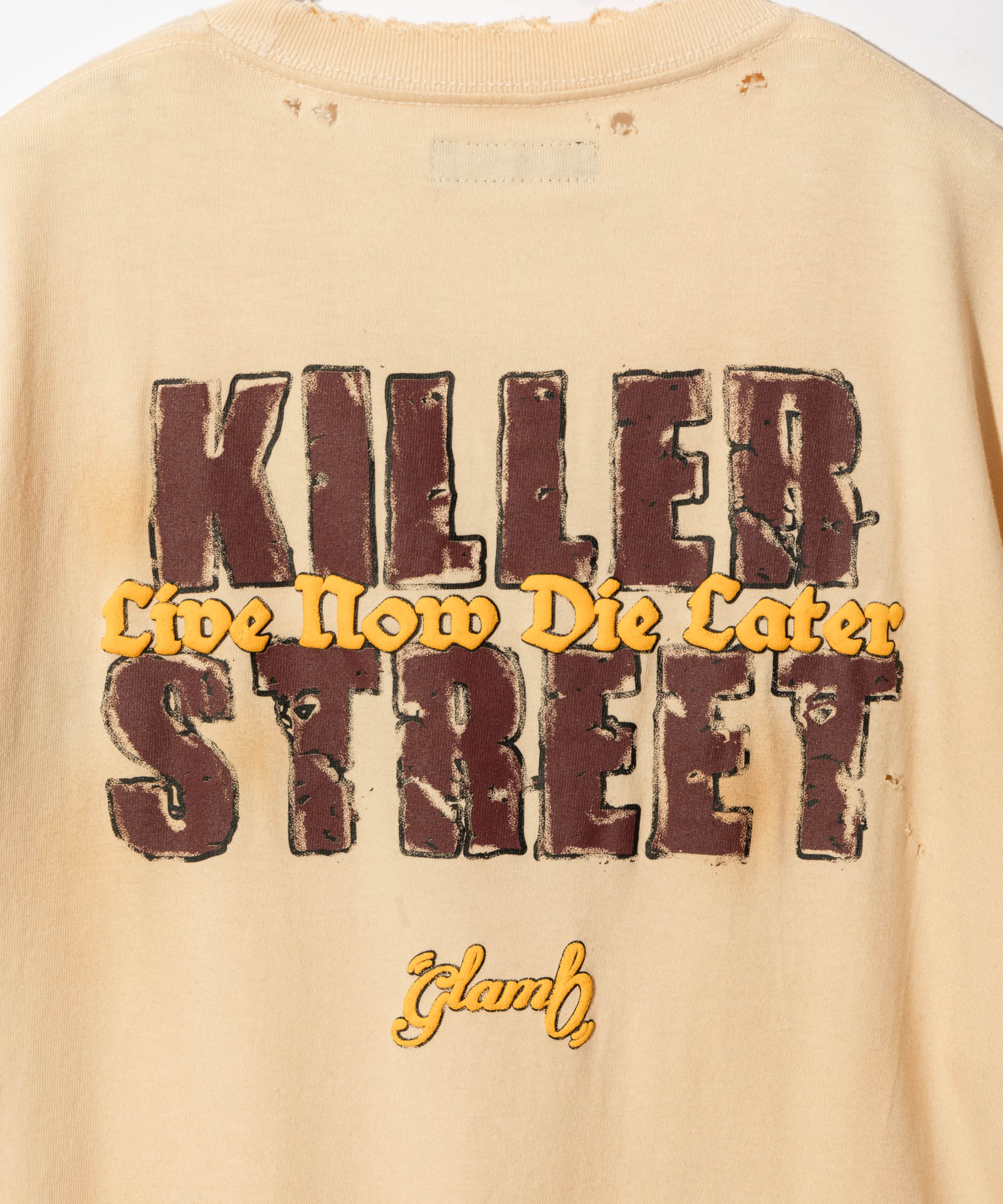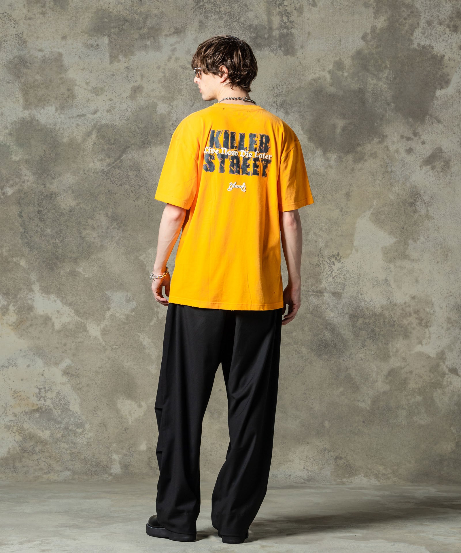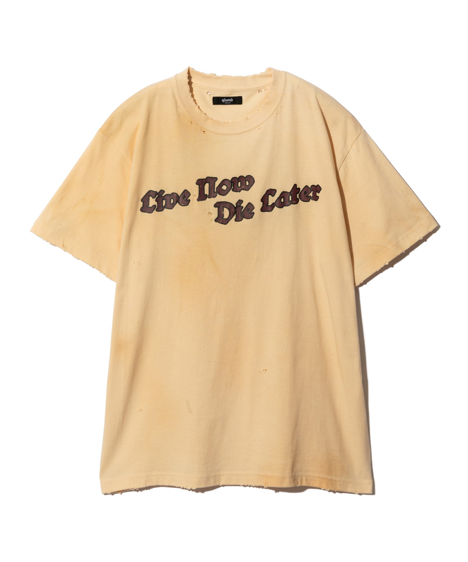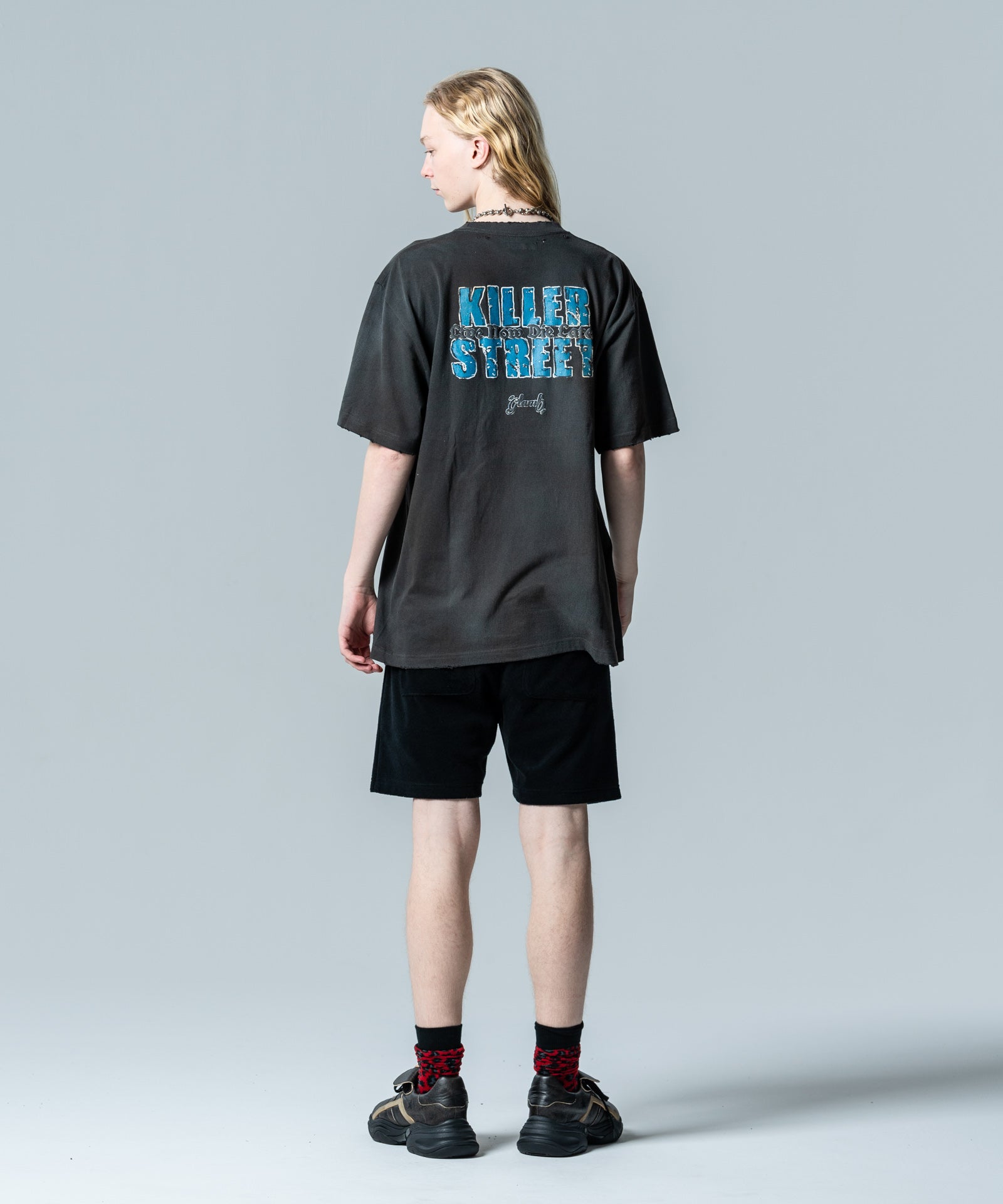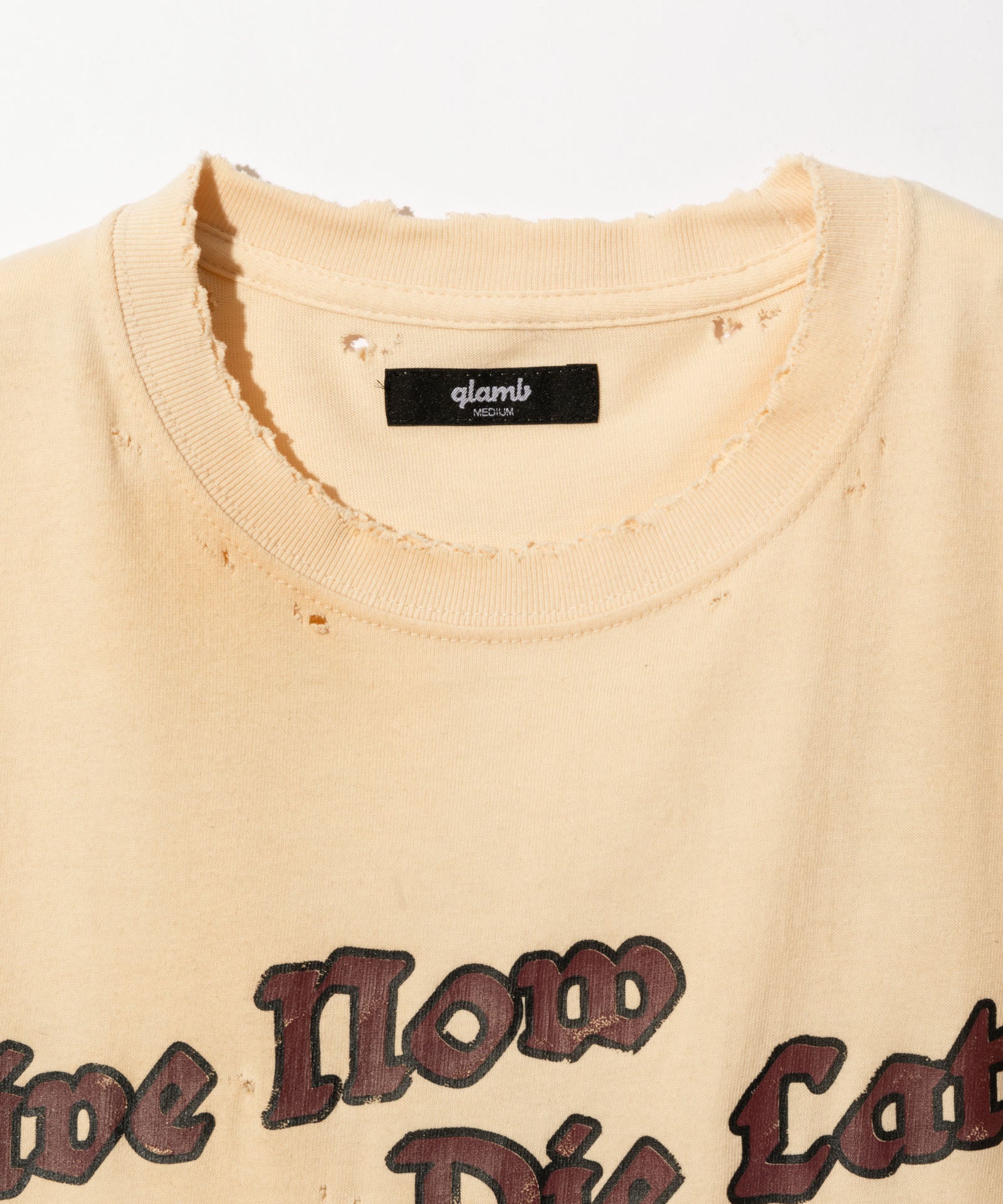 加工とプリントの双方からブランドの掲げるグランジスタイルを表現したGrunge Message T-Shirt。首周りと袖口、裾に刻んだダメージの数々は熟練の職人が手作業であしらったもの。フロントにクラックプリント、バックスタイルにはさらに発泡プリントも重ねてブランドのメッセージを乗せました。テキスタイルにはコットン100%の上質な5.6オンスミディアムウェイト天竺を使用。ボディは着丈を長めに、身幅を広めに設けたルーズシルエットとなっております。