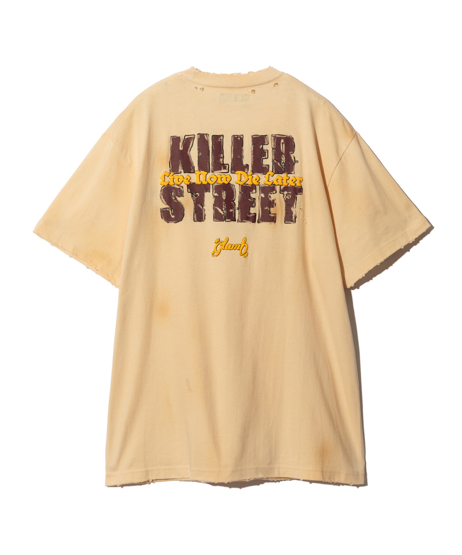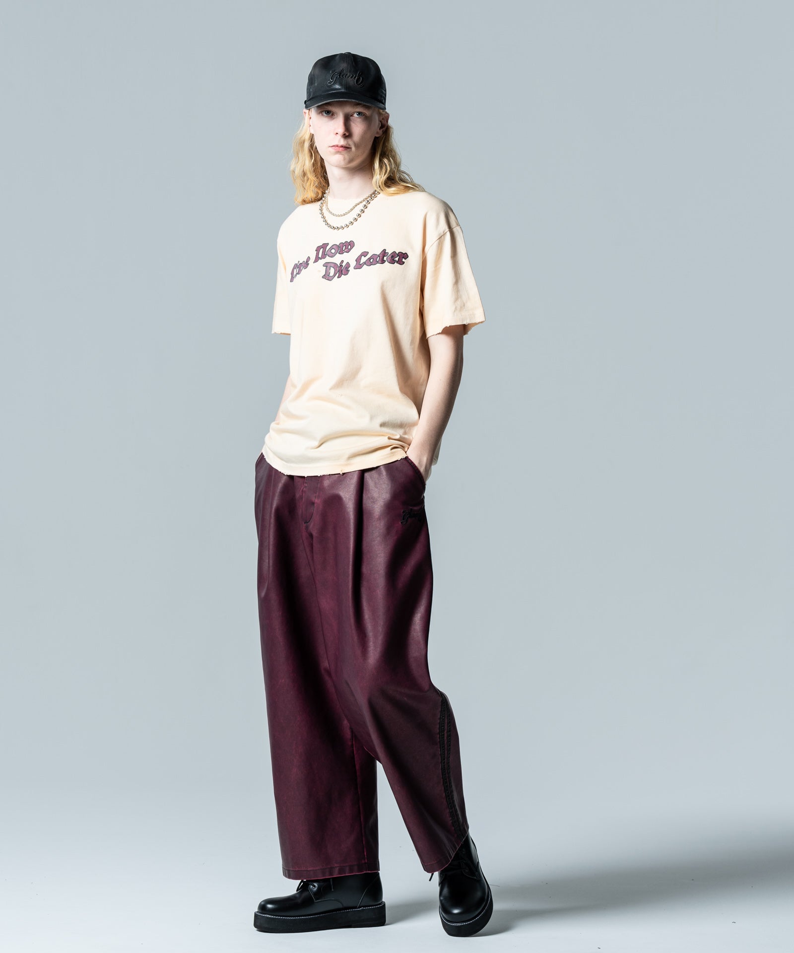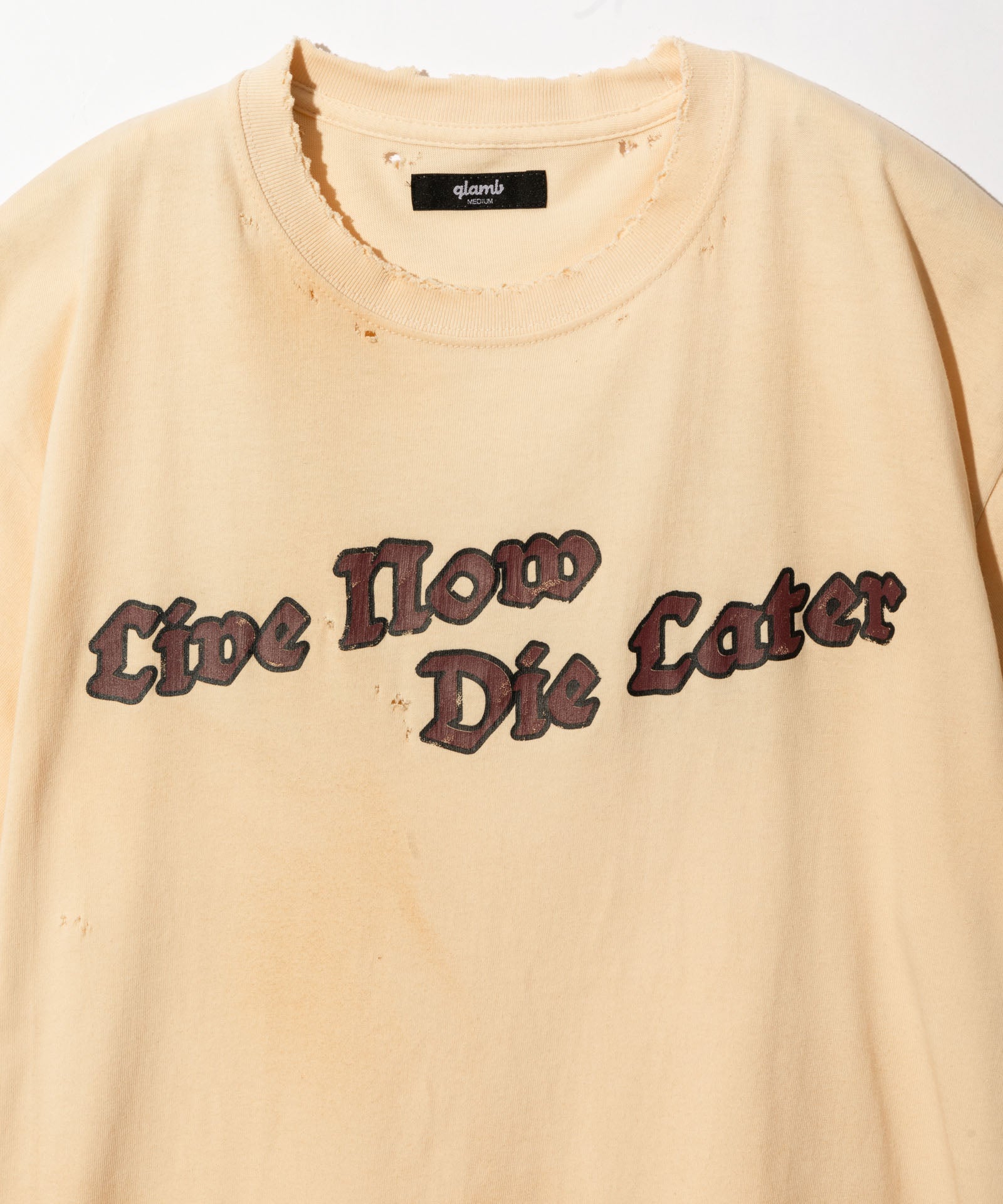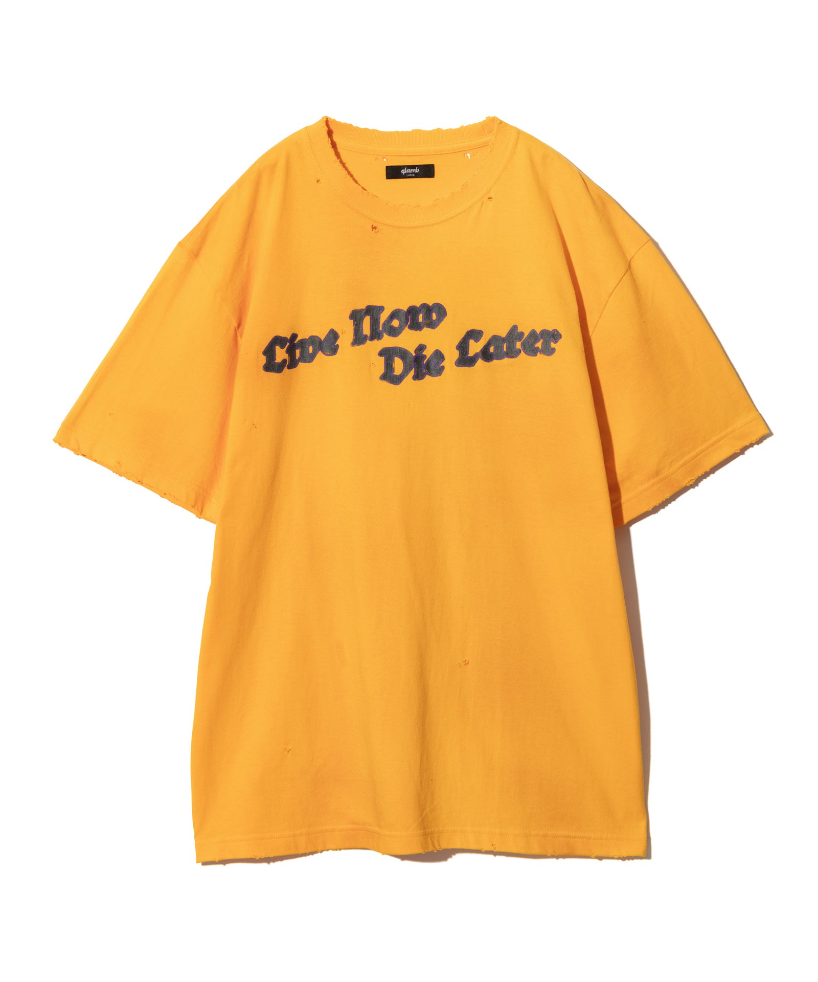 加工とプリントの双方からブランドの掲げるグランジスタイルを表現したGrunge Message T-Shirt。首周りと袖口、裾に刻んだダメージの数々は熟練の職人が手作業であしらったもの。フロントにクラックプリント、バックスタイルにはさらに発泡プリントも重ねてブランドのメッセージを乗せました。テキスタイルにはコットン100%の上質な5.6オンスミディアムウェイト天竺を使用。ボディは着丈を長めに、身幅を広めに設けたルーズシルエットとなっております。