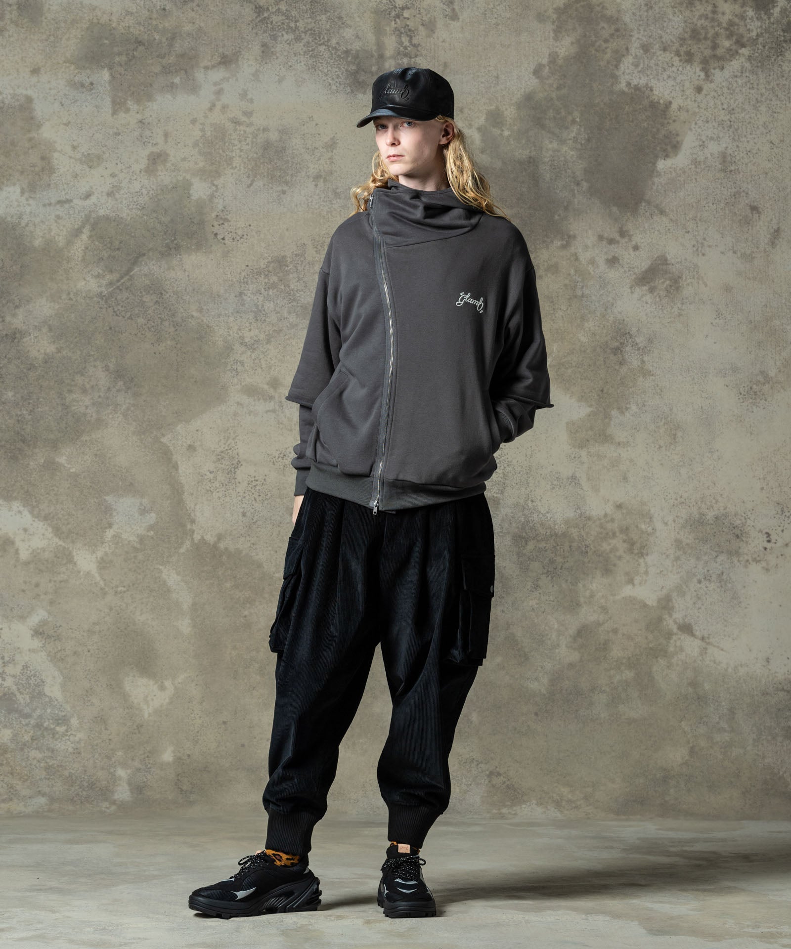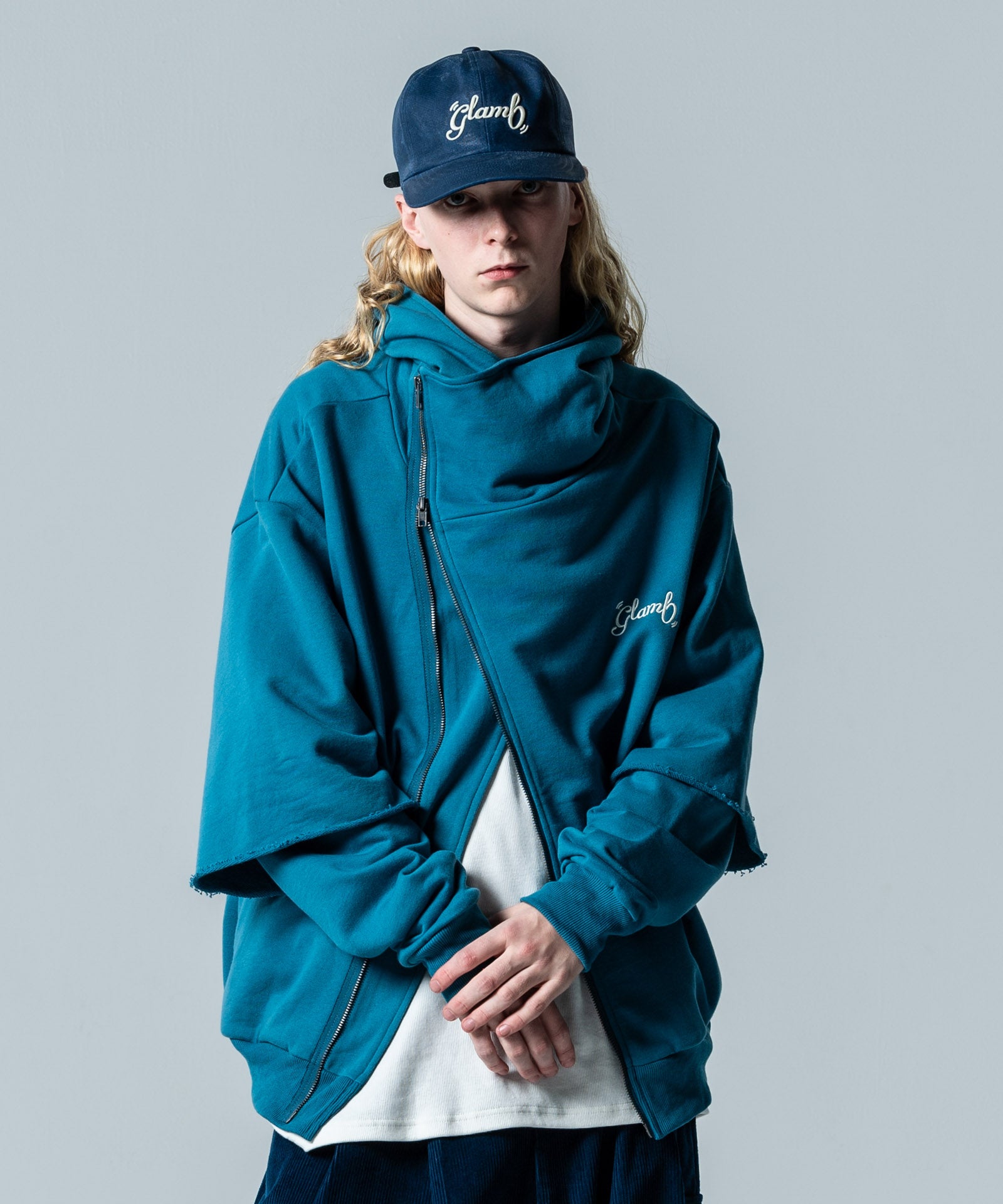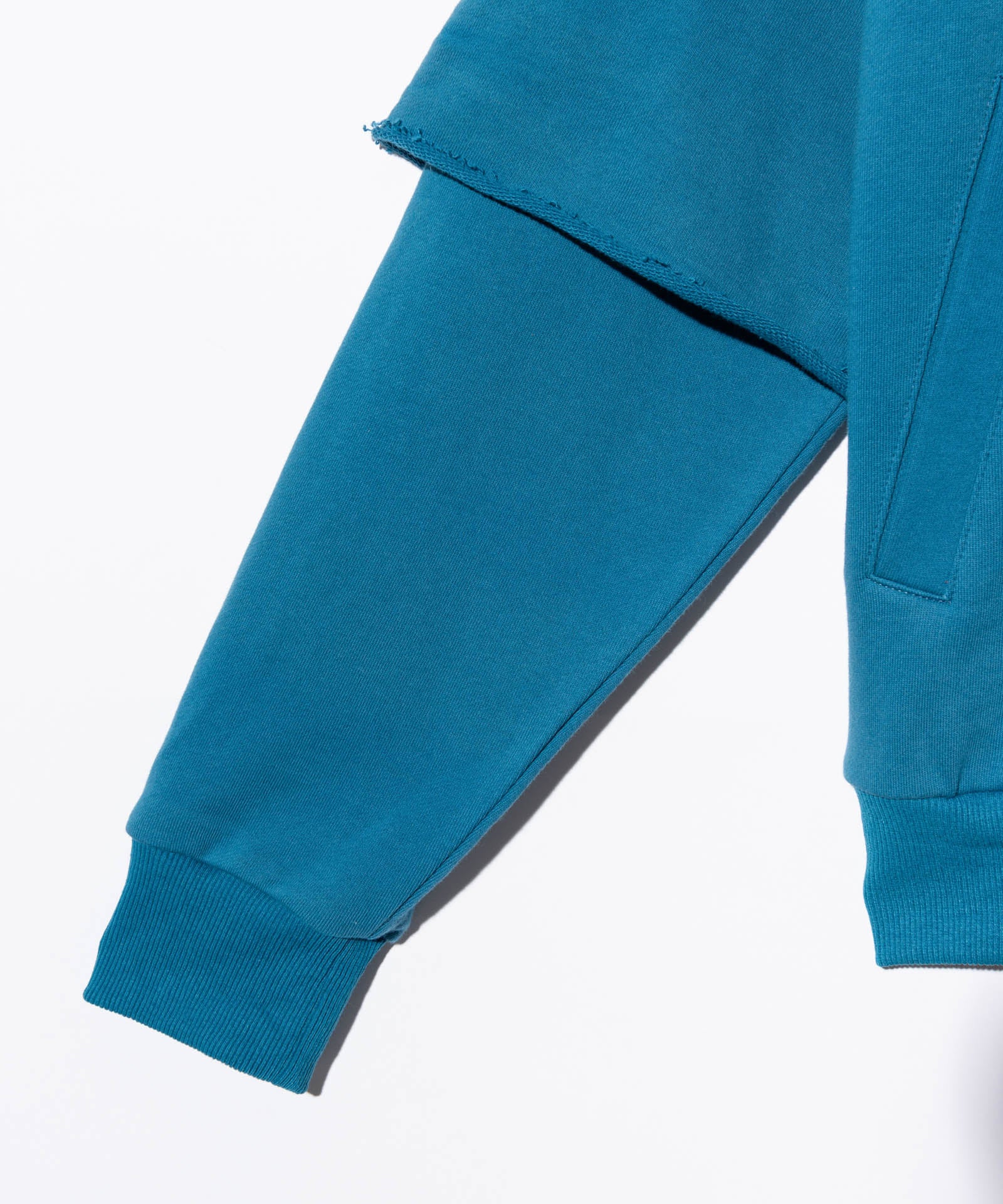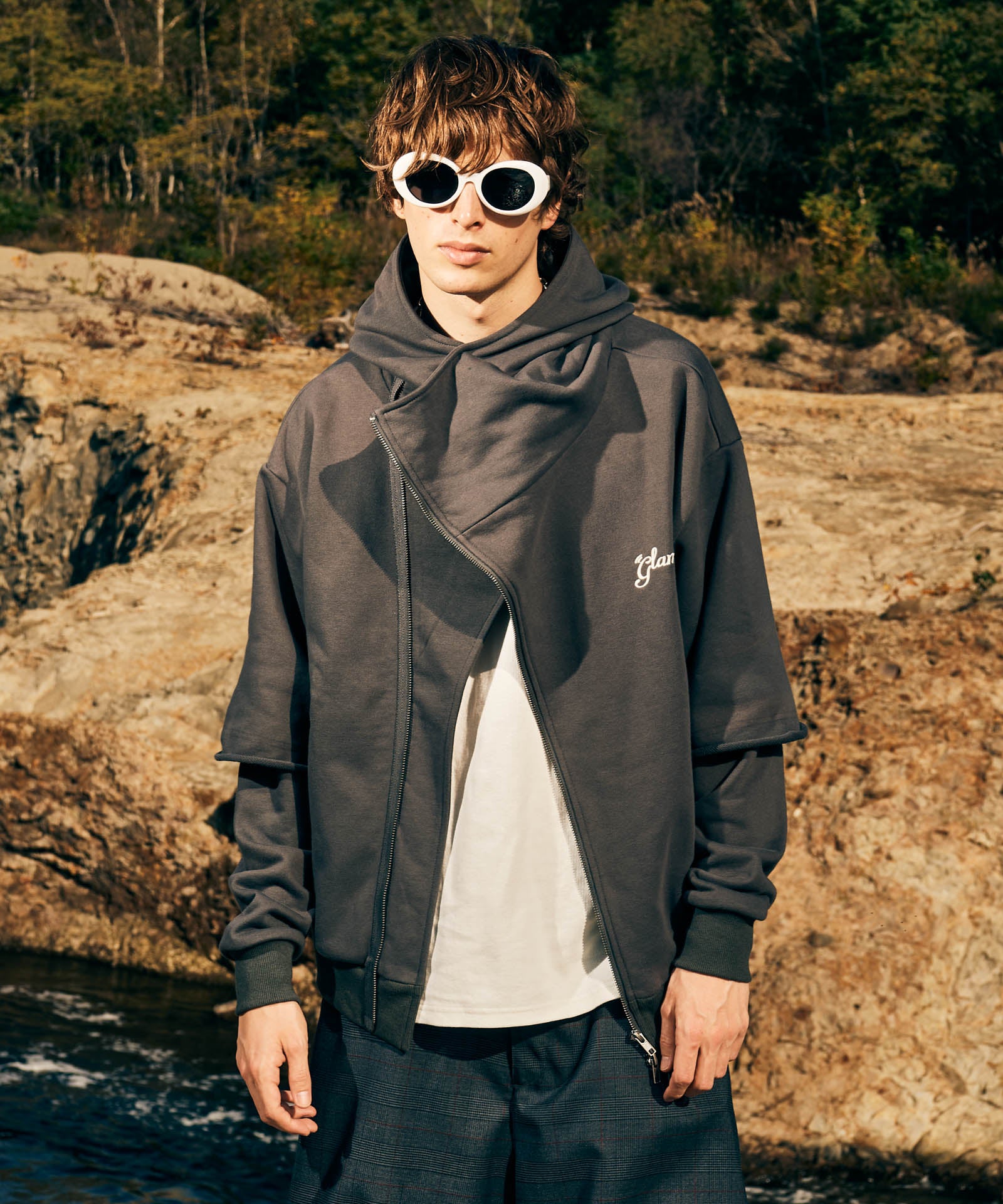 イマジネーション溢れるパターンワークがストリートスタイルをモードに昇華するAsymmetry Layered Hoodie。フロントデザインはライダースを思わせるダブル仕立てながら、ジップのラインは不規則に湾曲。首元にスペースを生み出すことでボリュームあるハイネックのフードを構成します。さらにアームはフェイクレイヤードを用いた2枚仕立て。半袖の袖口を切りっぱなしとすることで前衛的なテクスチャを持たせています。首元にはスナップボタンを付属しており、ボタンのみで留めたスタイリングも可能に。シルエットは着丈と身幅にゆとりを持たせたオーバーサイズとなっております。