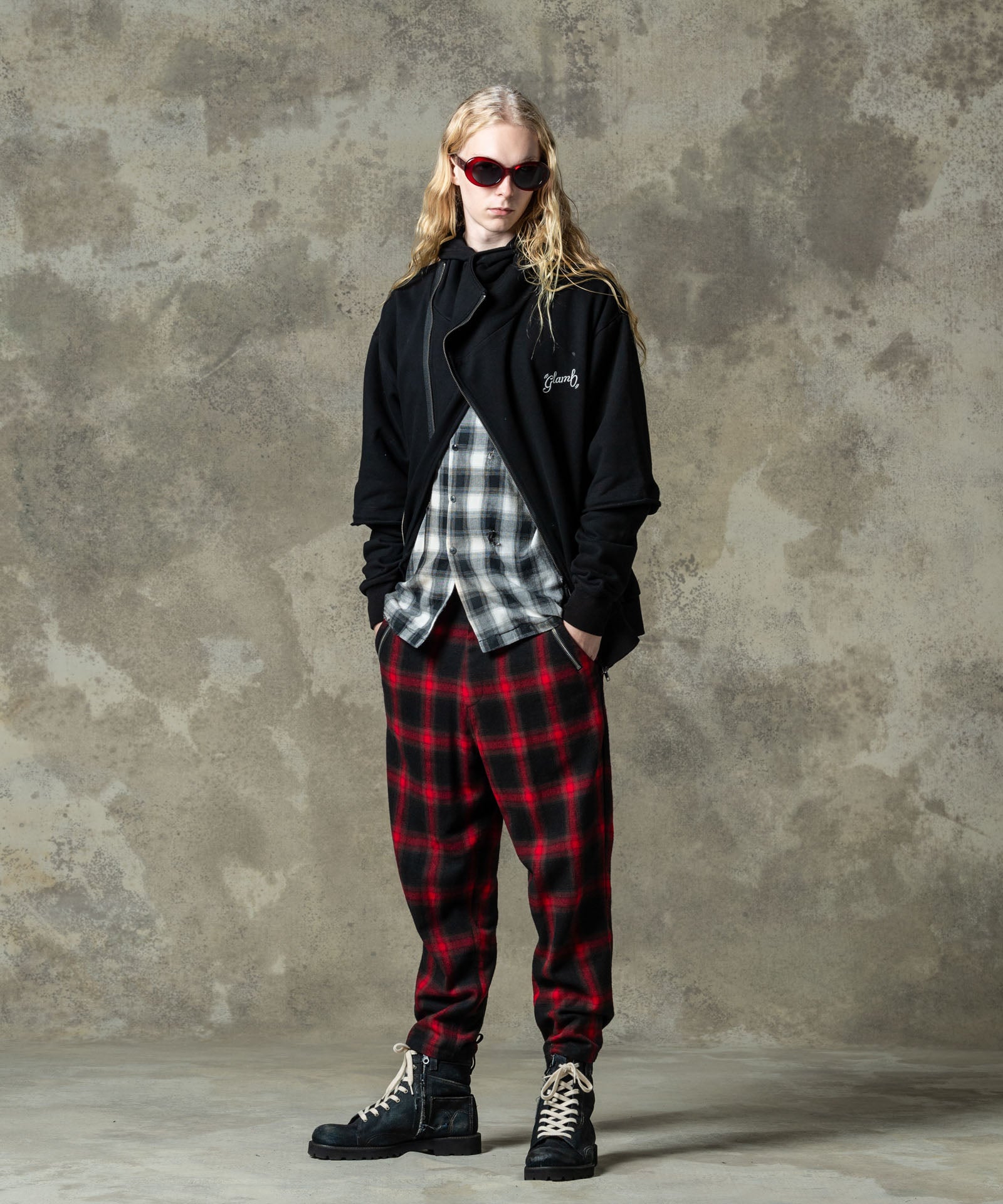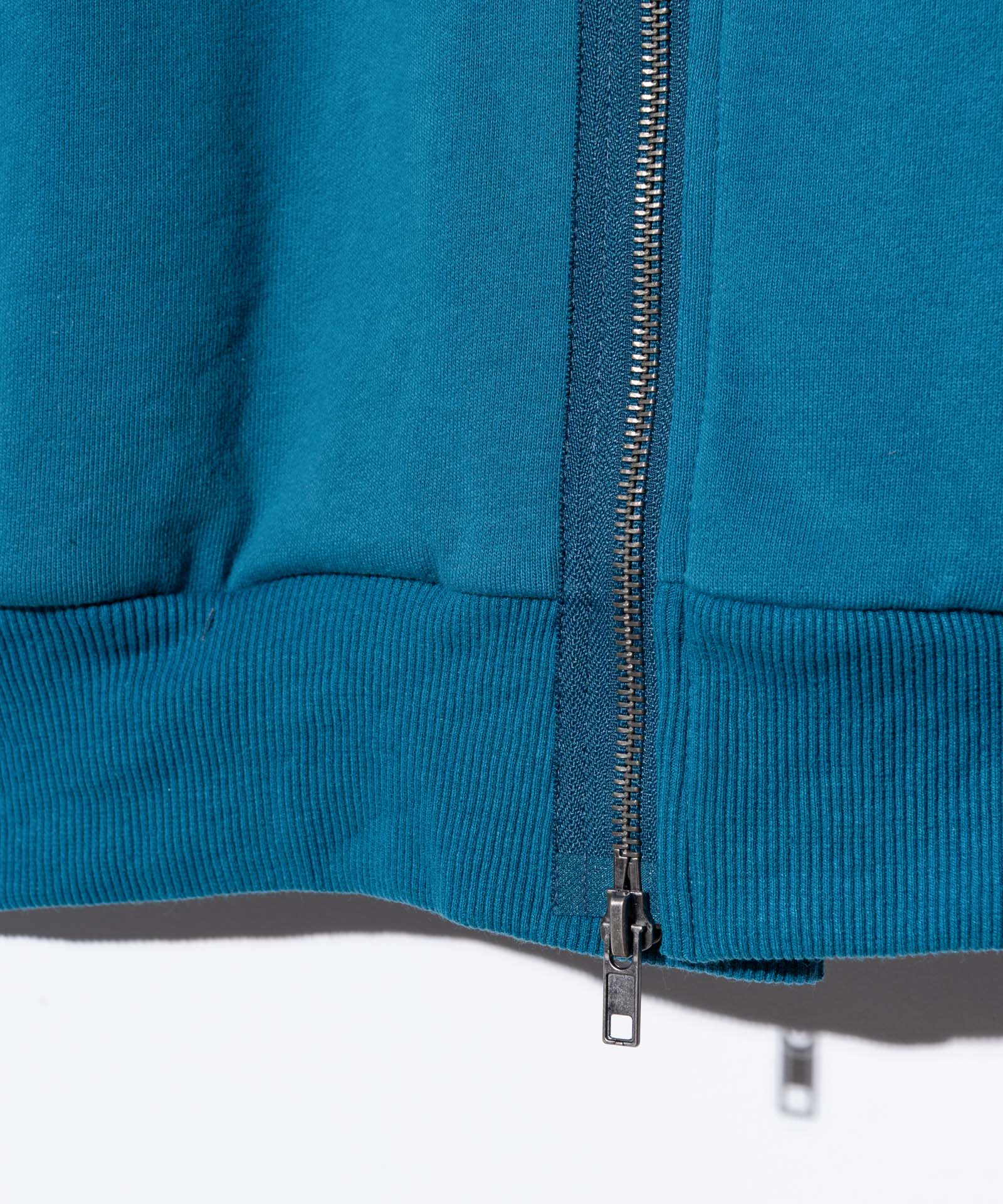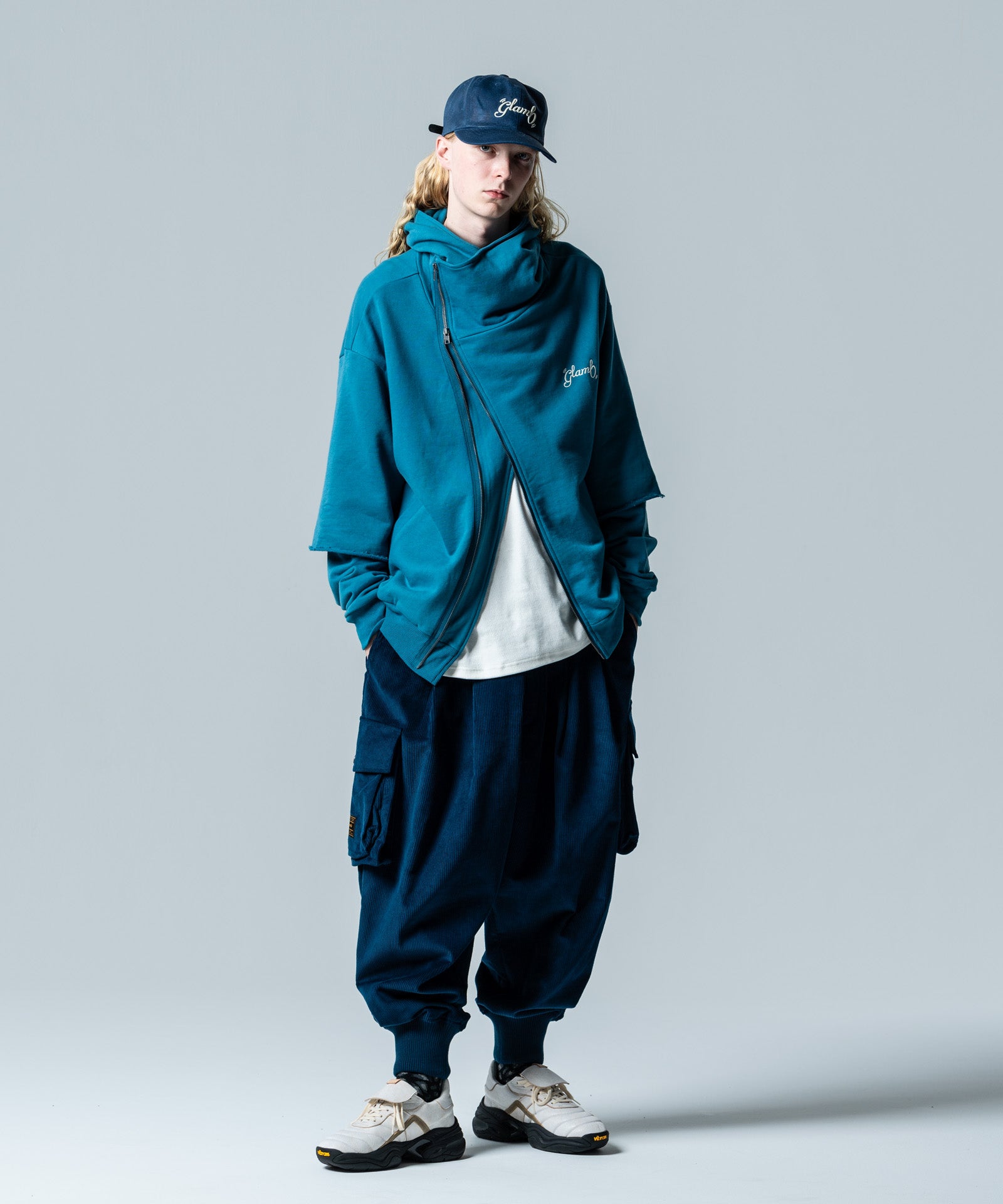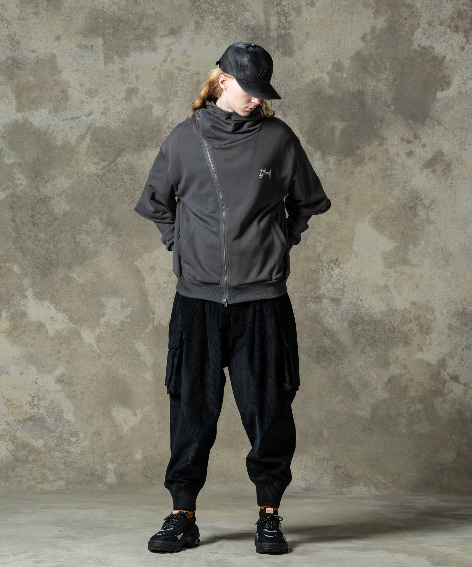 イマジネーション溢れるパターンワークがストリートスタイルをモードに昇華するAsymmetry Layered Hoodie。フロントデザインはライダースを思わせるダブル仕立てながら、ジップのラインは不規則に湾曲。首元にスペースを生み出すことでボリュームあるハイネックのフードを構成します。さらにアームはフェイクレイヤードを用いた2枚仕立て。半袖の袖口を切りっぱなしとすることで前衛的なテクスチャを持たせています。首元にはスナップボタンを付属しており、ボタンのみで留めたスタイリングも可能に。シルエットは着丈と身幅にゆとりを持たせたオーバーサイズとなっております。