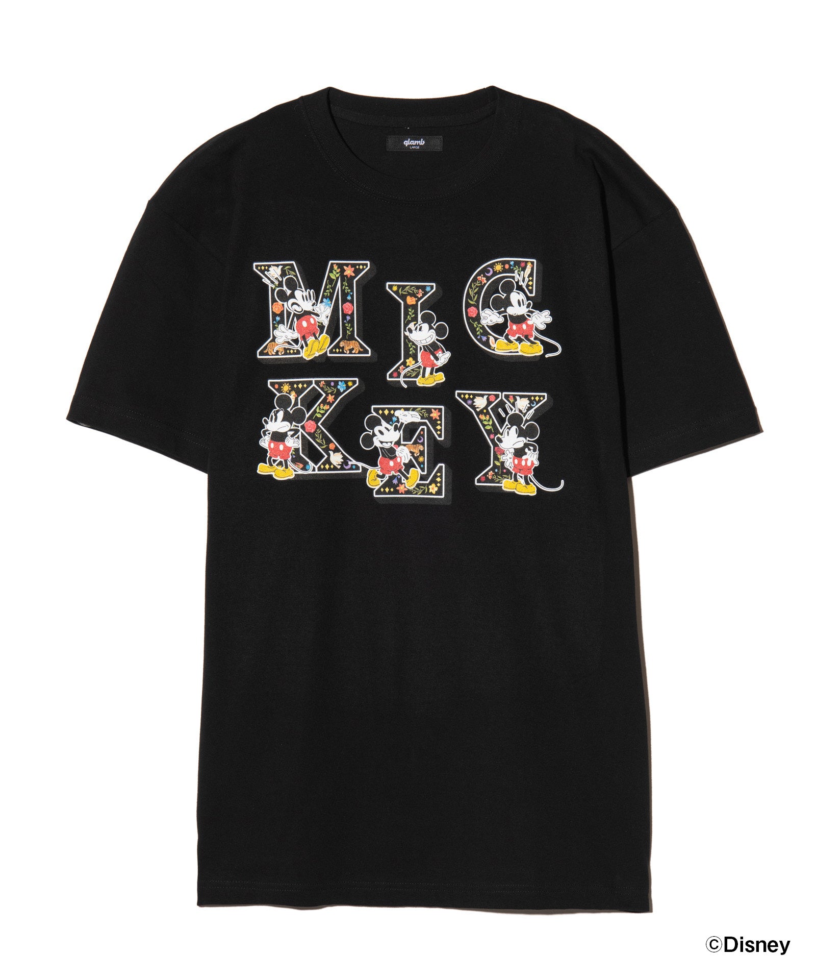 glambから[ミッキーマウス]プリントアイテムが待望の新登場、[ミッキーマウス]の多彩な表情をお楽しみいただける[Mickey Mouse] Logo T-Shirt。胸元にあしらわれたロゴは一文字ごとに異なるフラワーやアニマルを散りばめたもの。アルファベットに応じて異なる[ミッキーマウス]のリアクションも目を引く一枚となっています。首裏にはglambスピンロゴをあしらいバックスタイルにも隙無くデザイン。テキスタイルにはコットン100%の5.6オンスミディアムウェイト天竺を使用、オーバーサイズシルエットに設定しておりUSライクなトップススタイルを演出します。