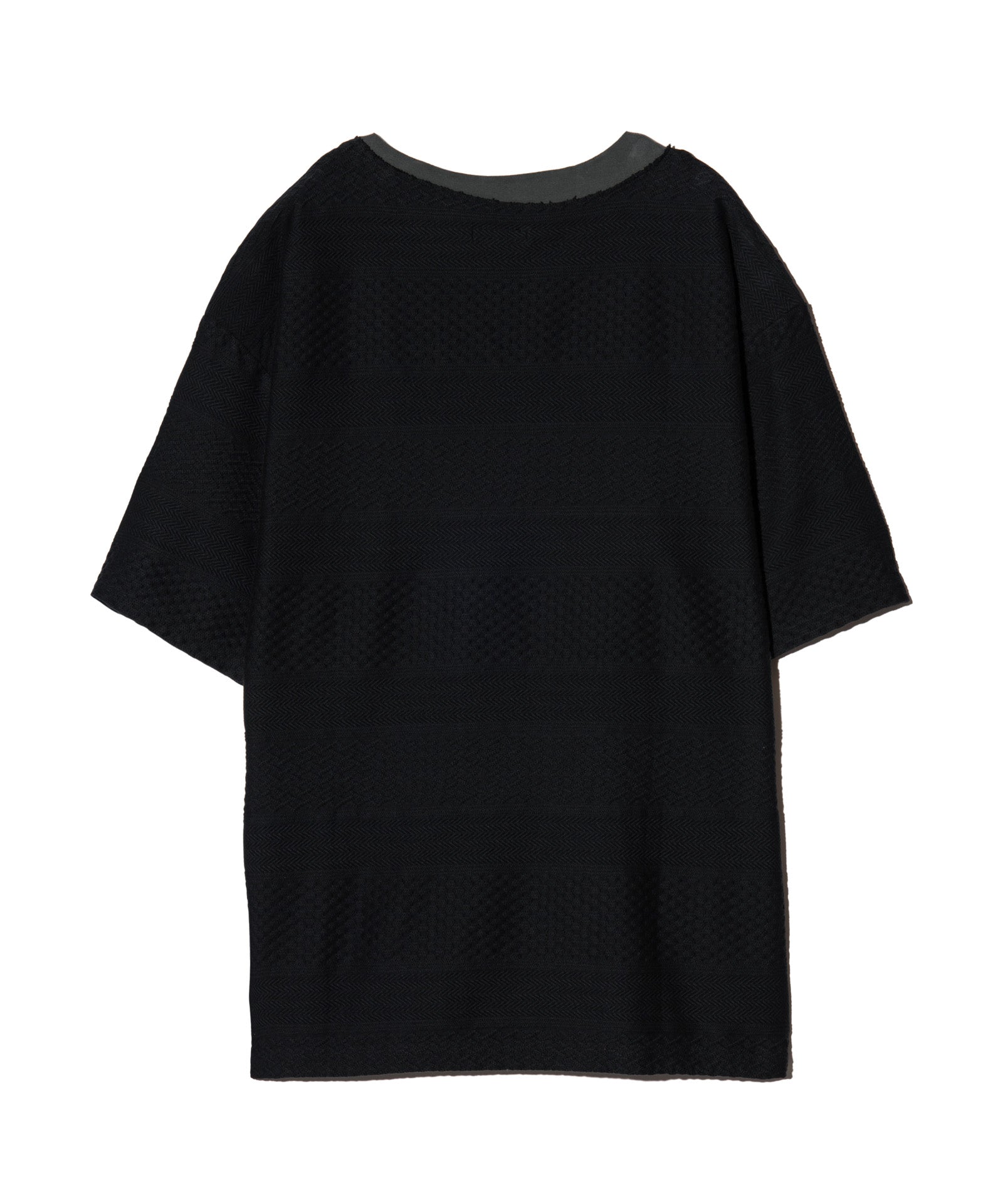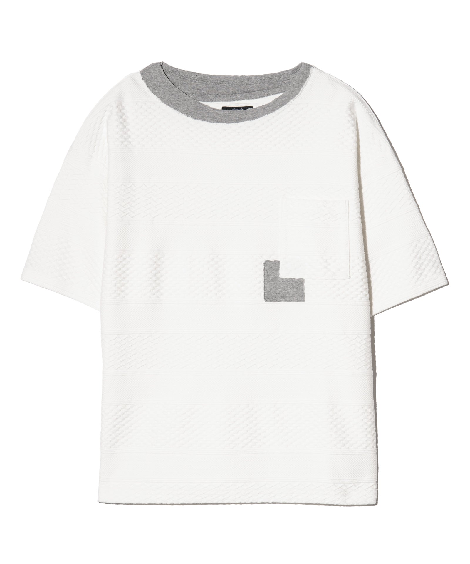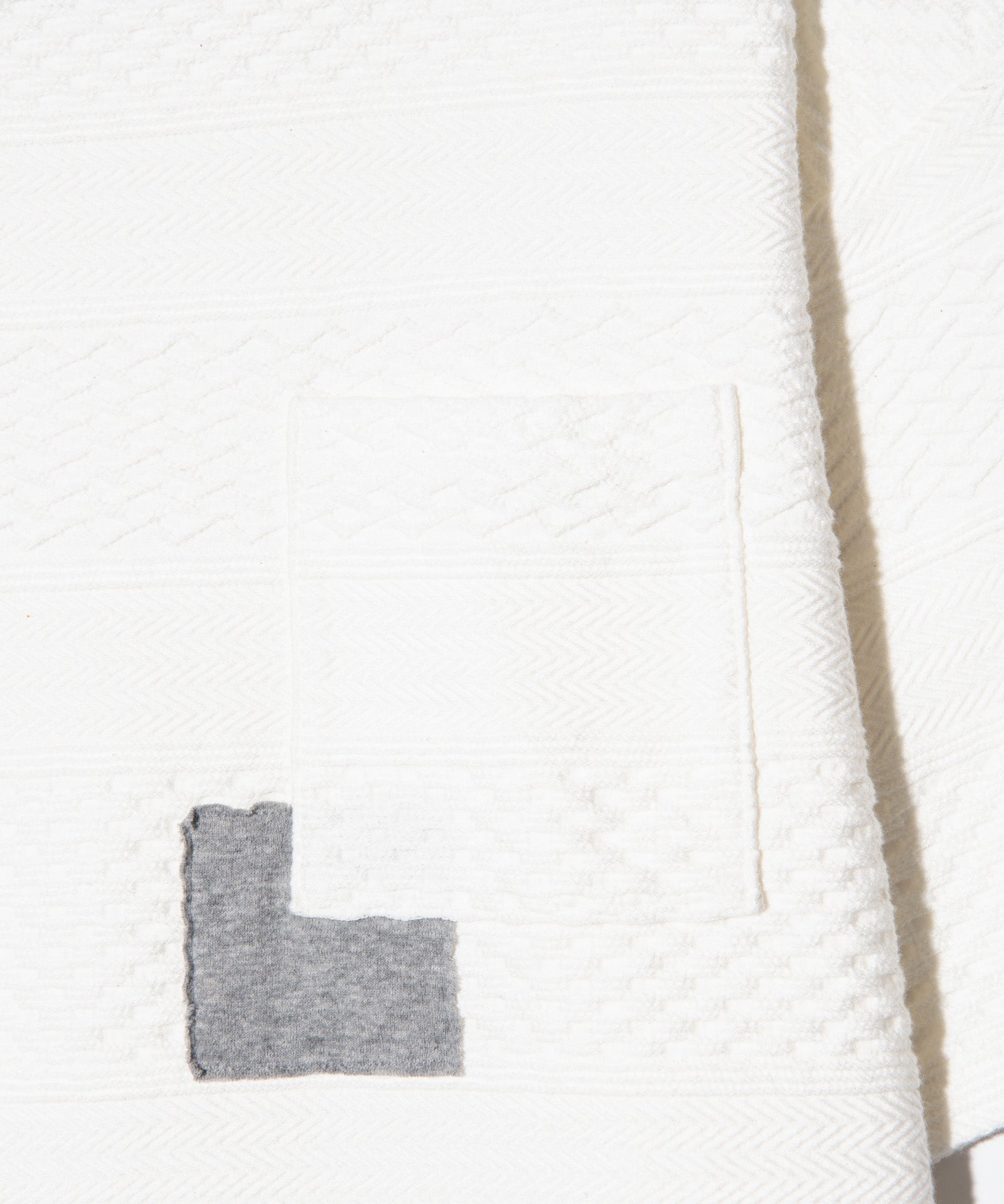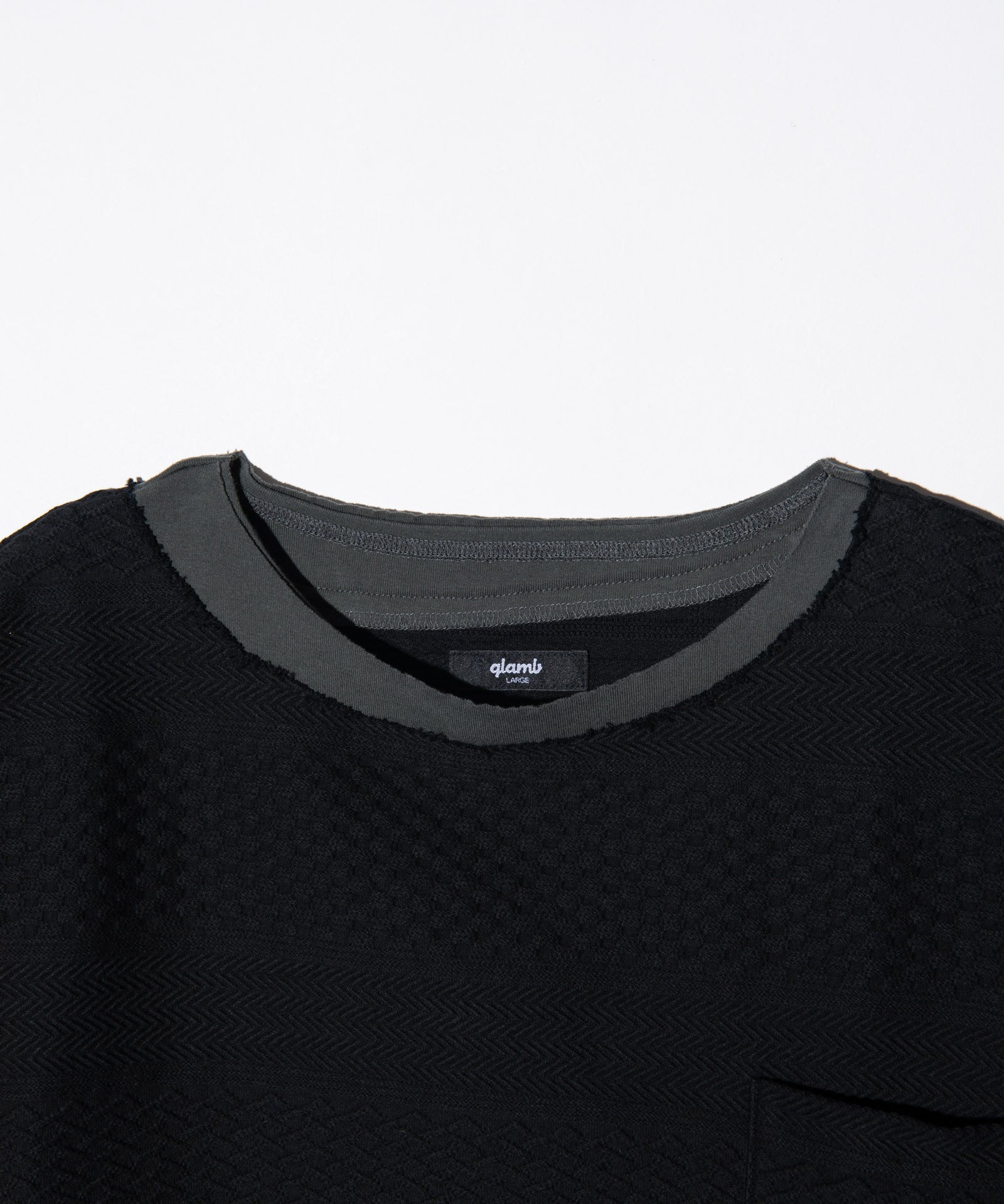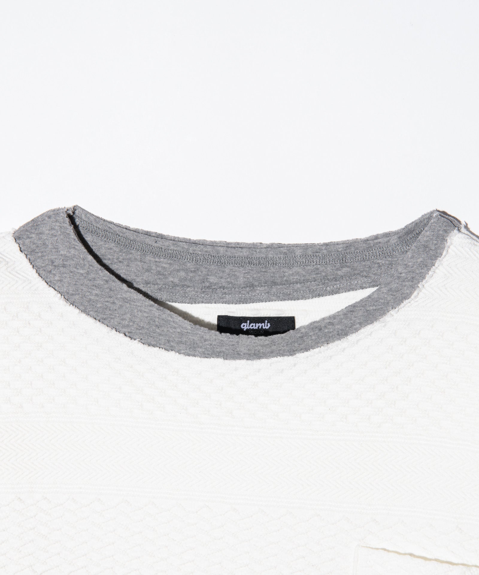 複雑なテクスチャを描く異素材使いとブランドが得意とするフェイクレイヤードを掛け合わせ、重層的なトップススタイリングを形作るBoat Neck Layered T-Shirt。ボディに使用したのは、ヘリンボーンや鱗柄をボーダー状に組み上げた国産のケーブルジャガード生地。そこへあしらわれたフライス生地のフェイクレイヤードパーツは、敢えて右肩が落ちたようなアシンメトリーなバランスでニュアンスをつけて施しました。他にも首元はグラインダーでダメージ加工、胸元のポケットにはフェイクレイヤード部分との同生地を挟み込むようパッチワーク。随所に加えられたディテールの数々にglambのイズムが詰まった1枚となっています。