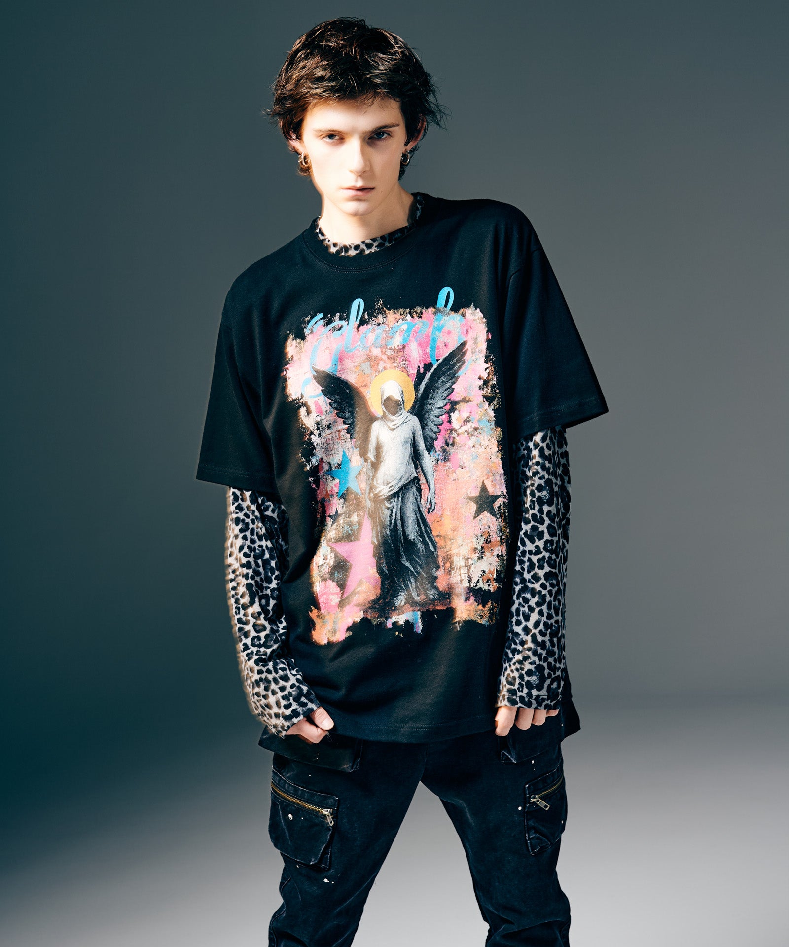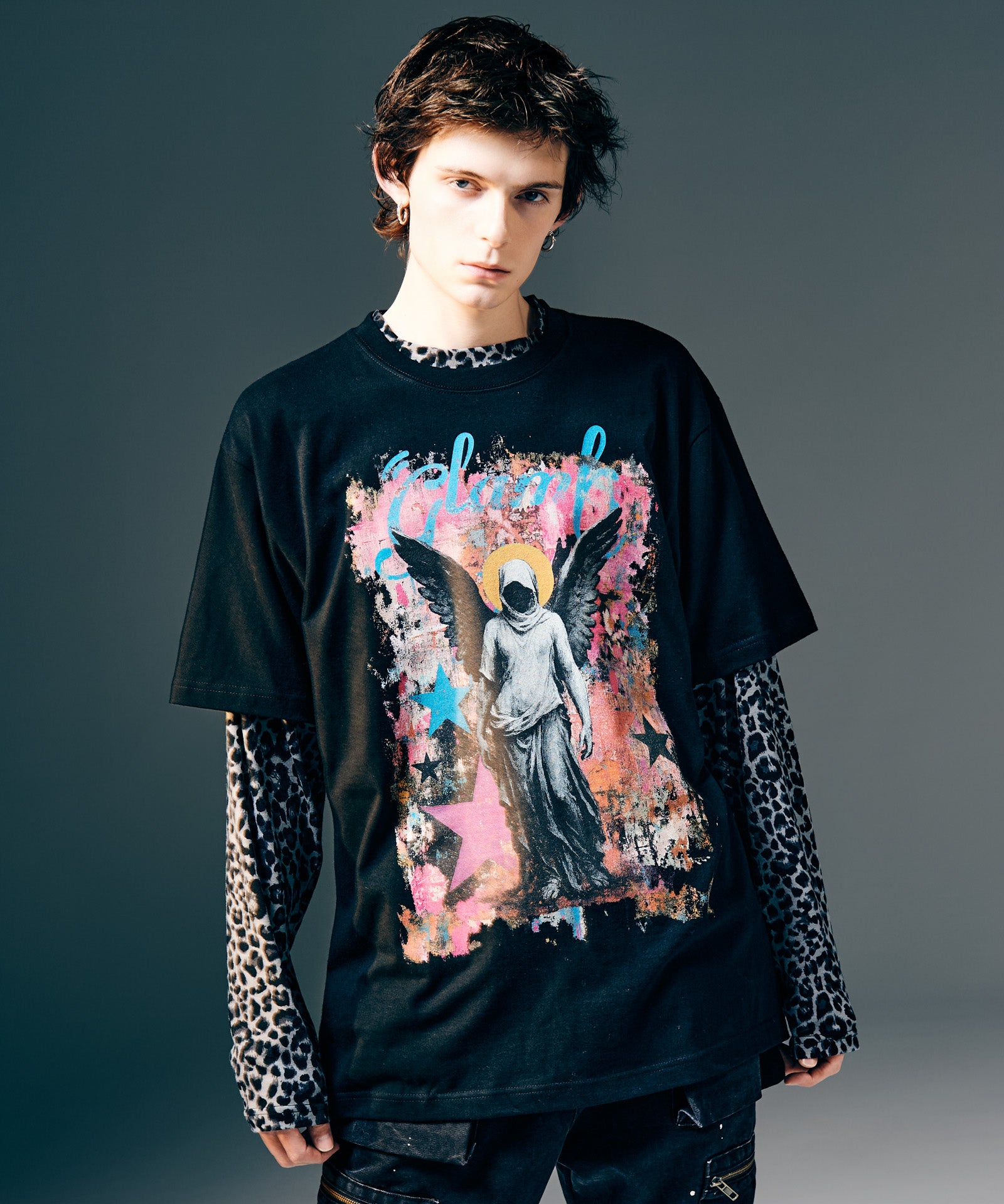 宗教画とストリートアートを掛け合わせ、今季のglambのムードを1枚のTシャツに閉じ込めたのがAngel T-Shirt。グラフィックのモチーフとなったのはコレクションテーマ“Rebirth”からイメージした天使像。ラフでエネルギッシュなタッチのペイントを背景に重ね合わせて、Tシャツをキャンバスにしたアートを描き上げています。生地に用いたのはタフに使い回していただけるコットン100%のミディアムウェイト5.6オンス天竺。ルーズなボックスシルエットはタイムレスな着こなしを叶えます。