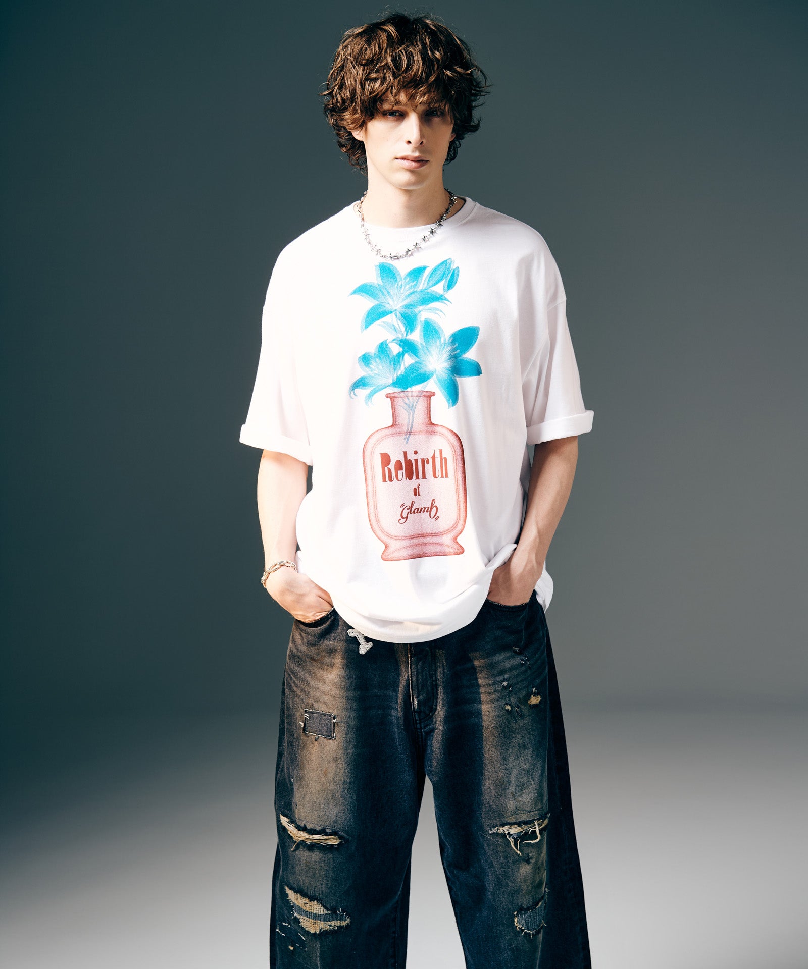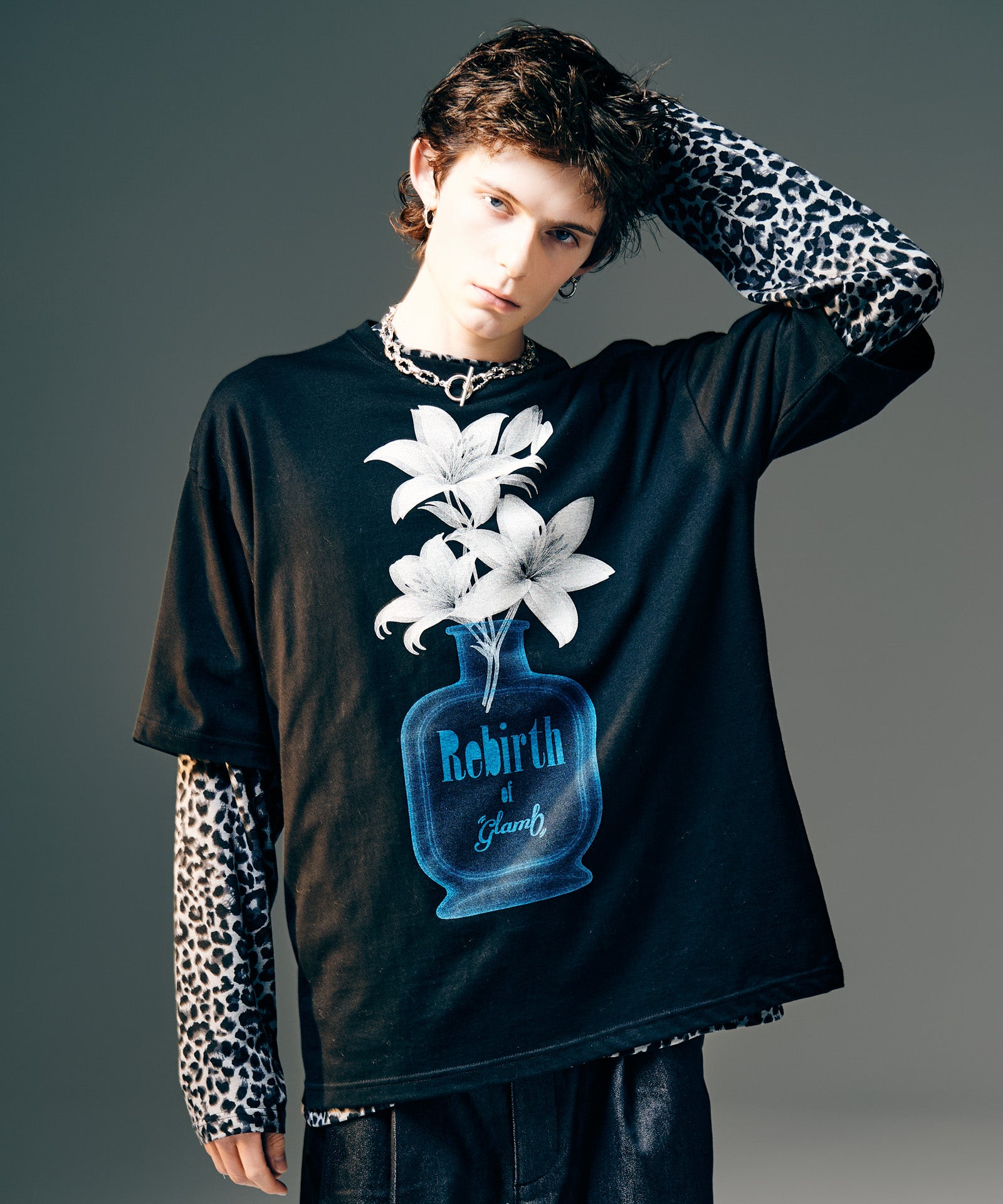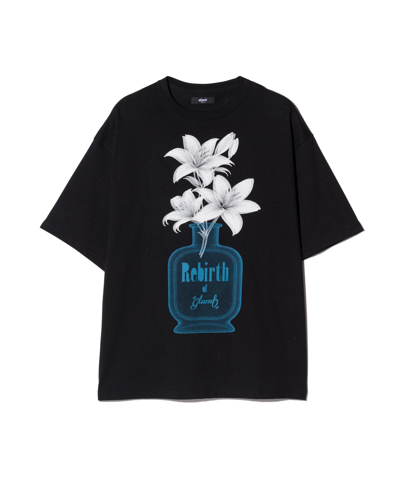 glamb定番モチーフである百合の花を、遊び心を込めて乗せたPerfume Bottle T-Shirt。今季のコレクションテーマを冠したフレグランスボトルに生けられたのは1本の百合。レントゲン撮影のような効果を持たせることで、独特の無機質な陰影が生命を逆説的に表現します。テキスタイルに使用したのはコットン100%の5.6オンスミディアムウェイト天竺。サイジングに余裕を設けたビッグシルエットは秋冬のインナー使いのみならず、春夏のトップススタイリングでもバランスよく着回していただけます。