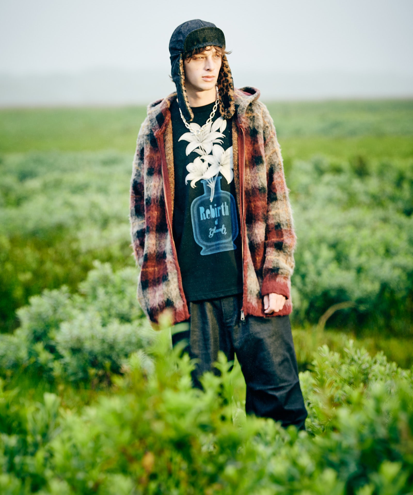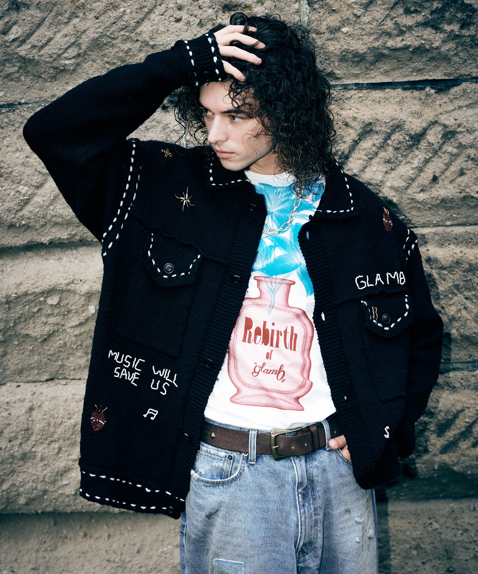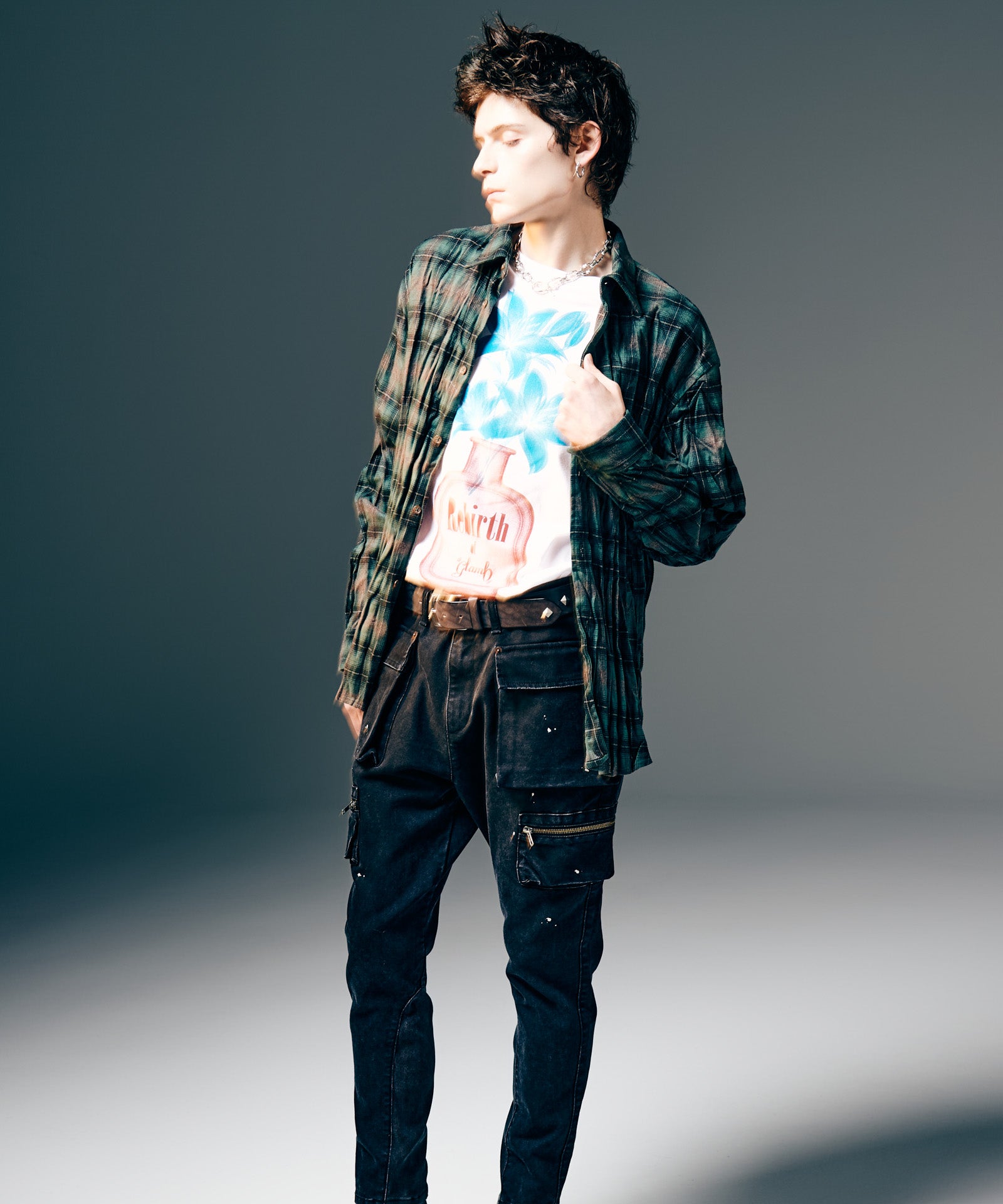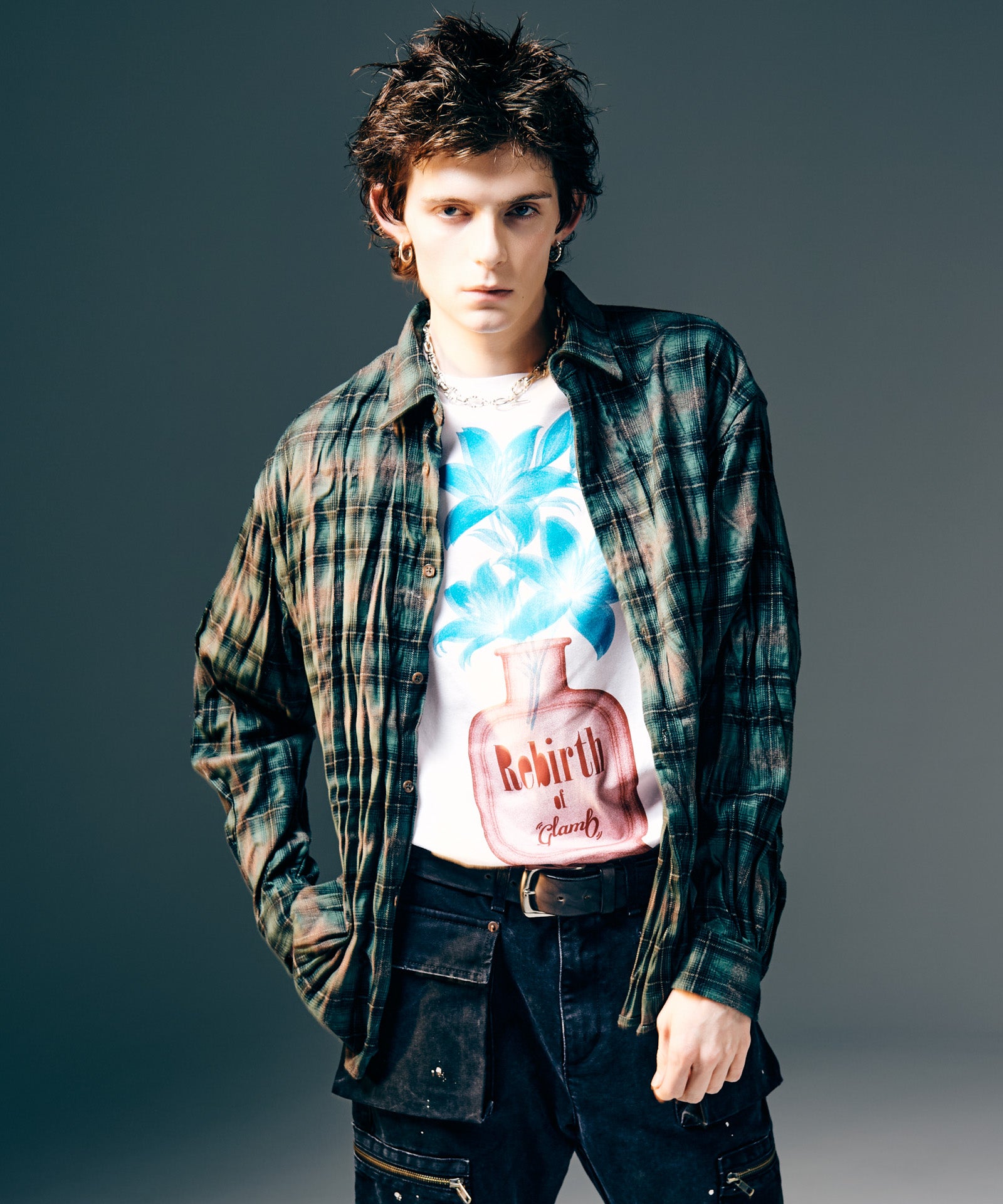 glamb定番モチーフである百合の花を、遊び心を込めて乗せたPerfume Bottle T-Shirt。今季のコレクションテーマを冠したフレグランスボトルに生けられたのは1本の百合。レントゲン撮影のような効果を持たせることで、独特の無機質な陰影が生命を逆説的に表現します。テキスタイルに使用したのはコットン100%の5.6オンスミディアムウェイト天竺。サイジングに余裕を設けたビッグシルエットは秋冬のインナー使いのみならず、春夏のトップススタイリングでもバランスよく着回していただけます。