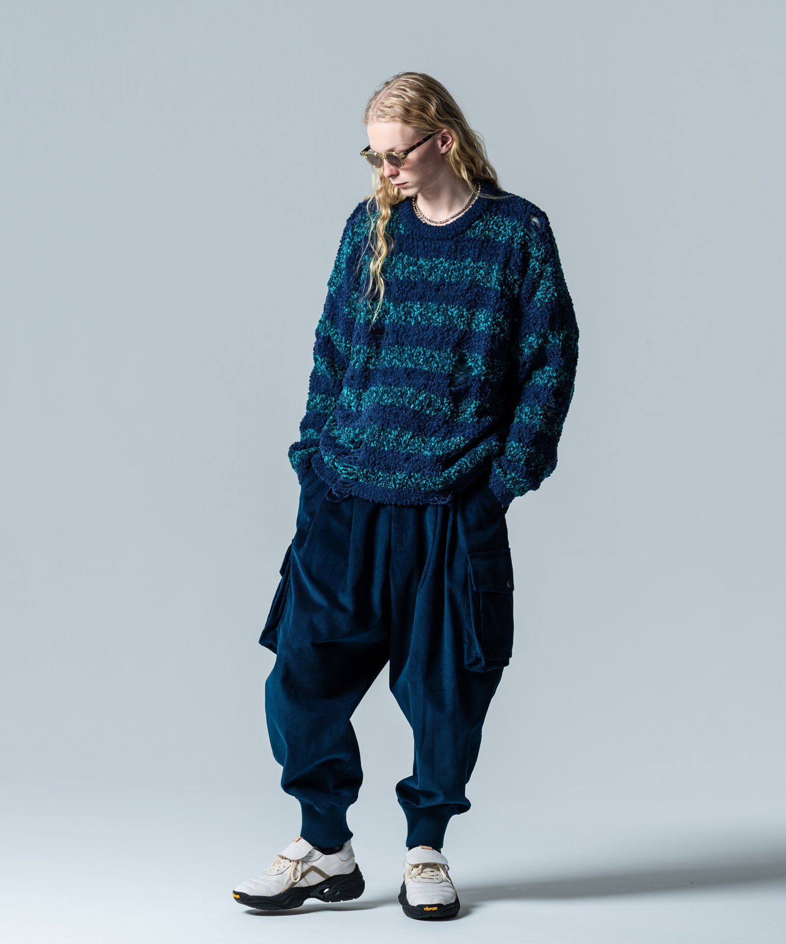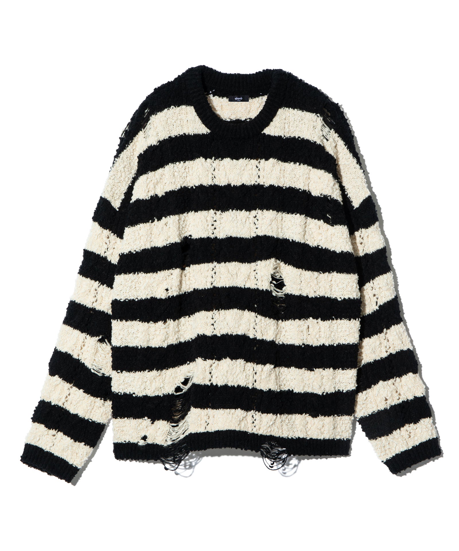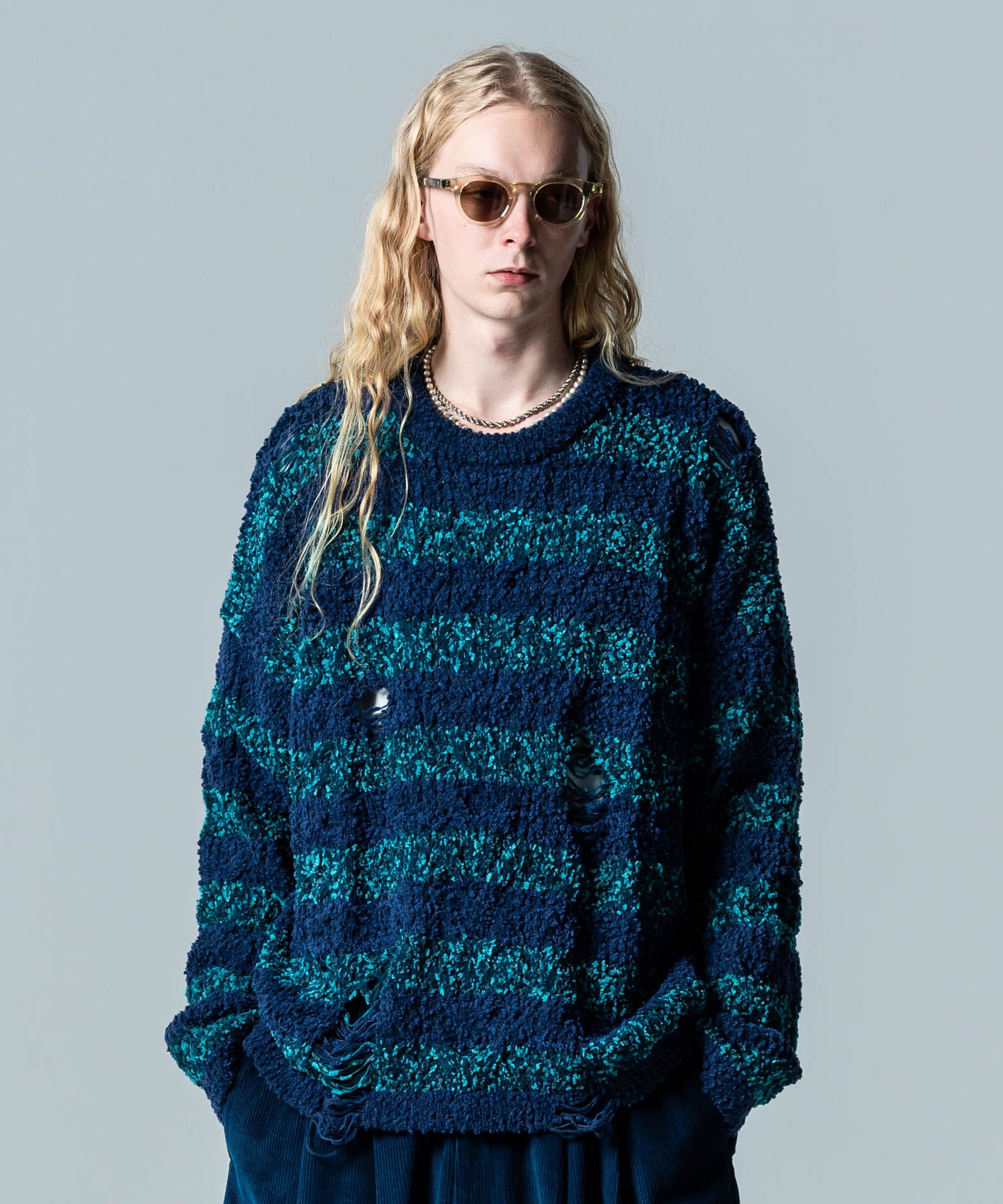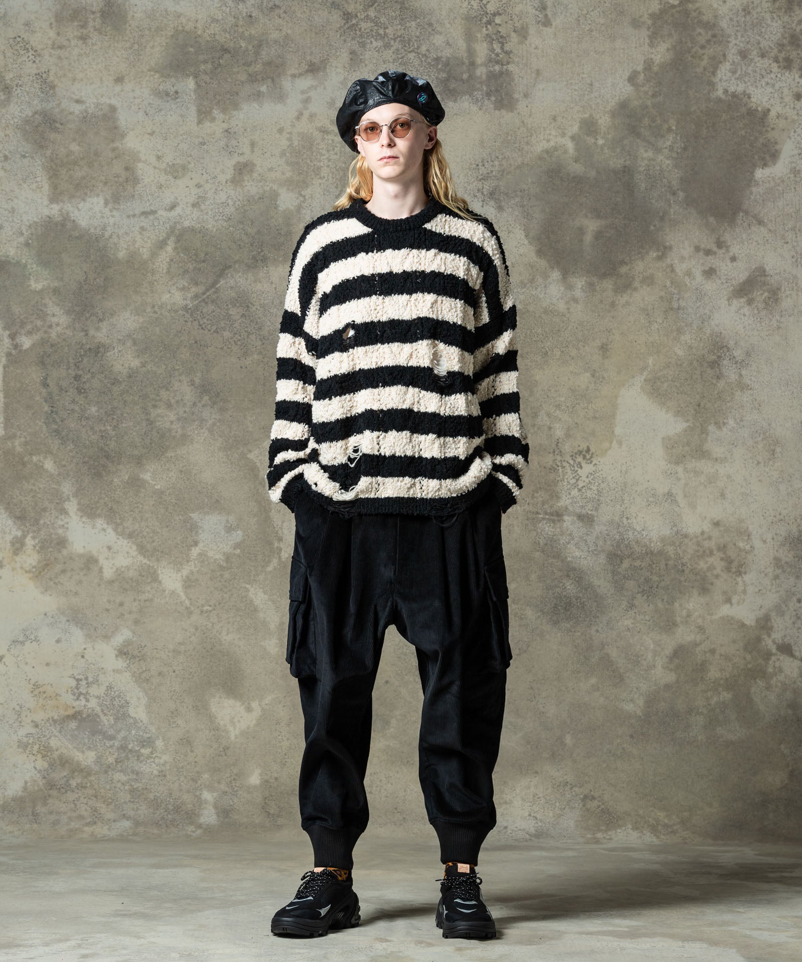 グランジスタイルの永遠の定番であるワイドピッチボーダーニットは今春もglambより登場。ランダムな凹凸を見せる編み地は、太さムラのあるファンシーヤーンを編み糸に用いて表現したもの。ブランケットのようにソフトな肌触りの生地となっていますが、glambは要所にクラッシュを追加。穴部分は糸をカットするのではなく針抜きという編み糸を減らす技法を用いており、ほつれによる穴の広がりを防止しています。シルエットはワイドな身幅にドロップショルダーを組み合わせたオーバーサイズ。ロックマインド溢れる柄と抜け感ある素材のミックスが現在進行形のグランジルックを提案します。