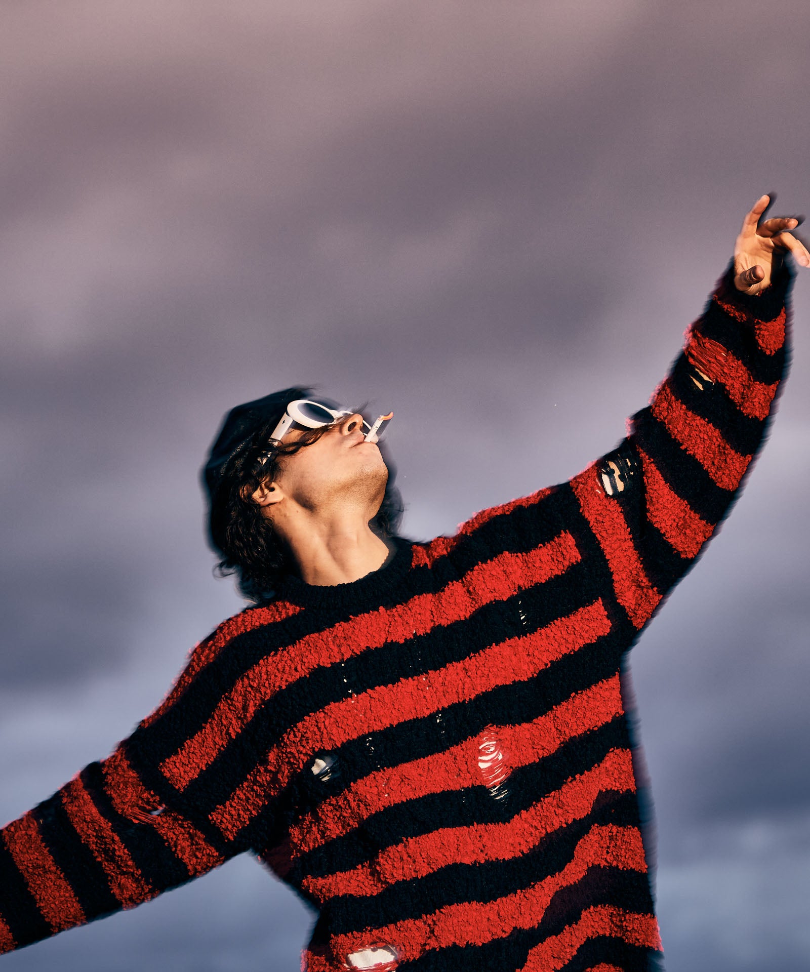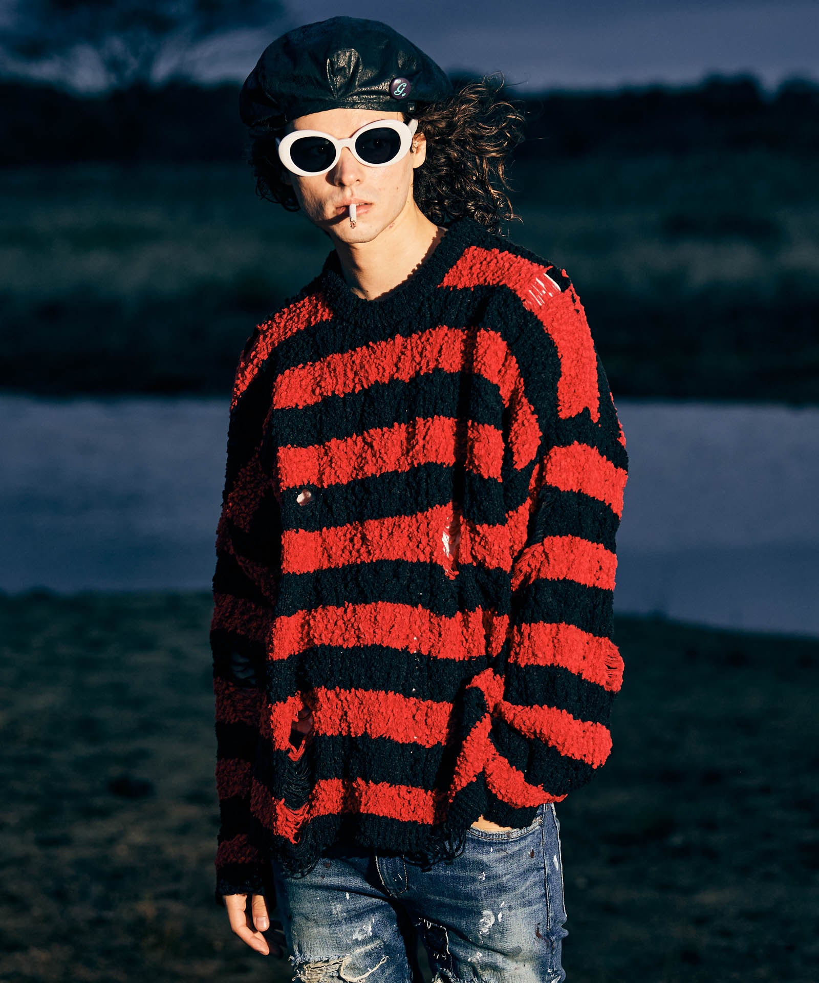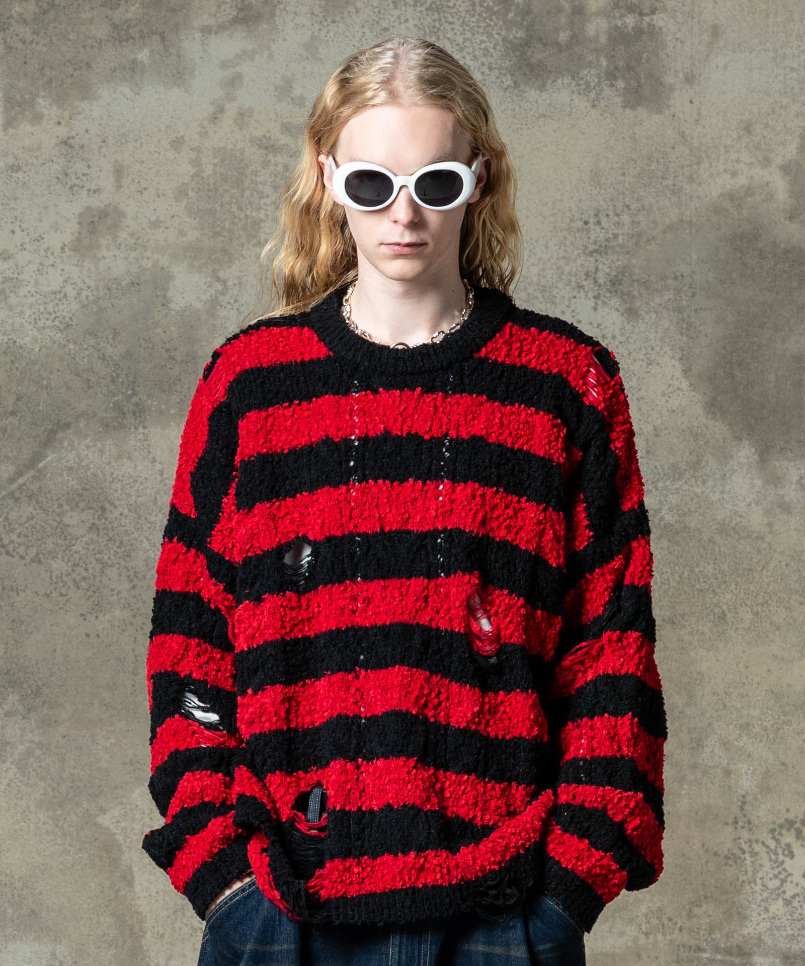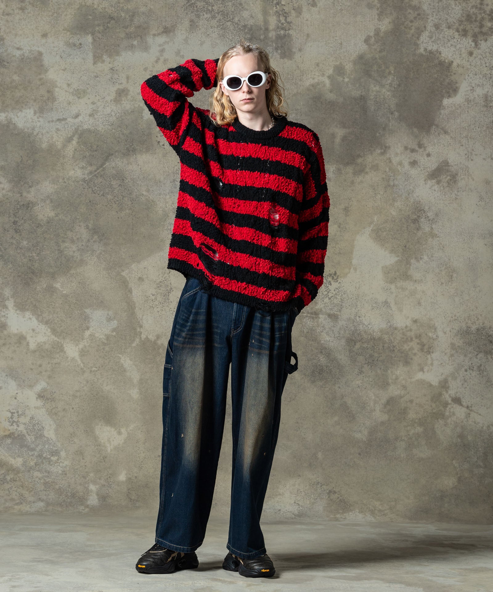 グランジスタイルの永遠の定番であるワイドピッチボーダーニットは今春もglambより登場。ランダムな凹凸を見せる編み地は、太さムラのあるファンシーヤーンを編み糸に用いて表現したもの。ブランケットのようにソフトな肌触りの生地となっていますが、glambは要所にクラッシュを追加。穴部分は糸をカットするのではなく針抜きという編み糸を減らす技法を用いており、ほつれによる穴の広がりを防止しています。シルエットはワイドな身幅にドロップショルダーを組み合わせたオーバーサイズ。ロックマインド溢れる柄と抜け感ある素材のミックスが現在進行形のグランジルックを提案します。
