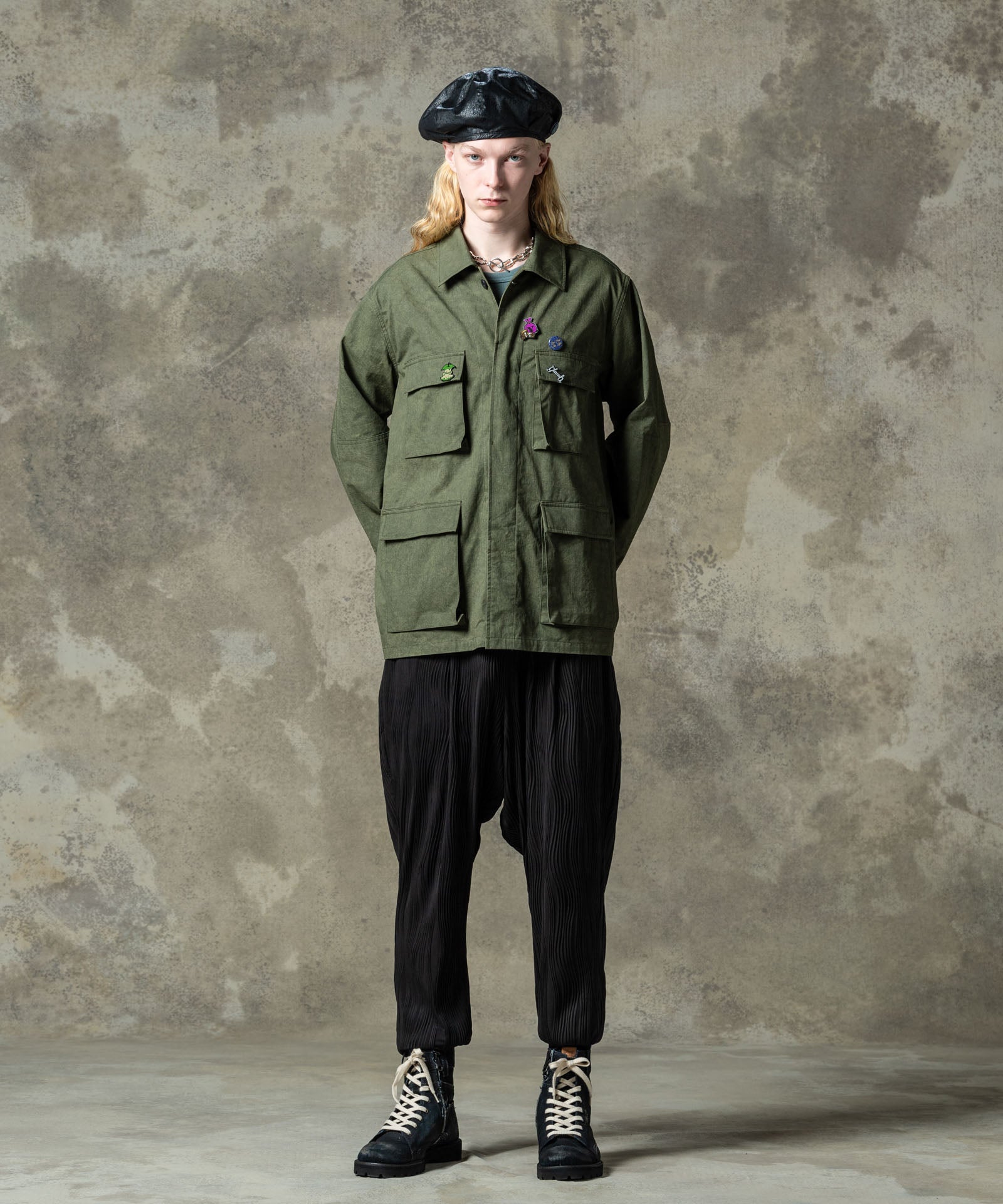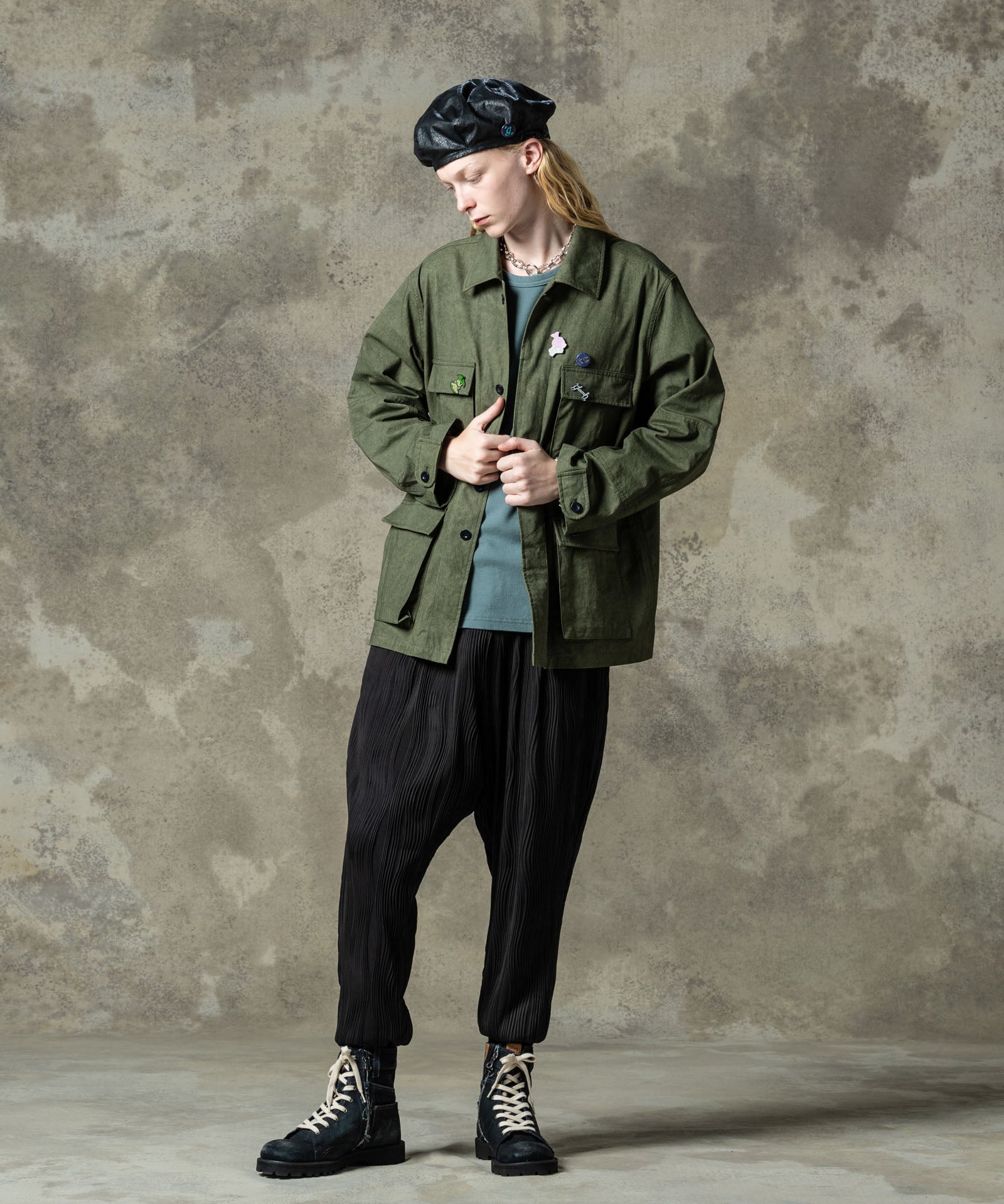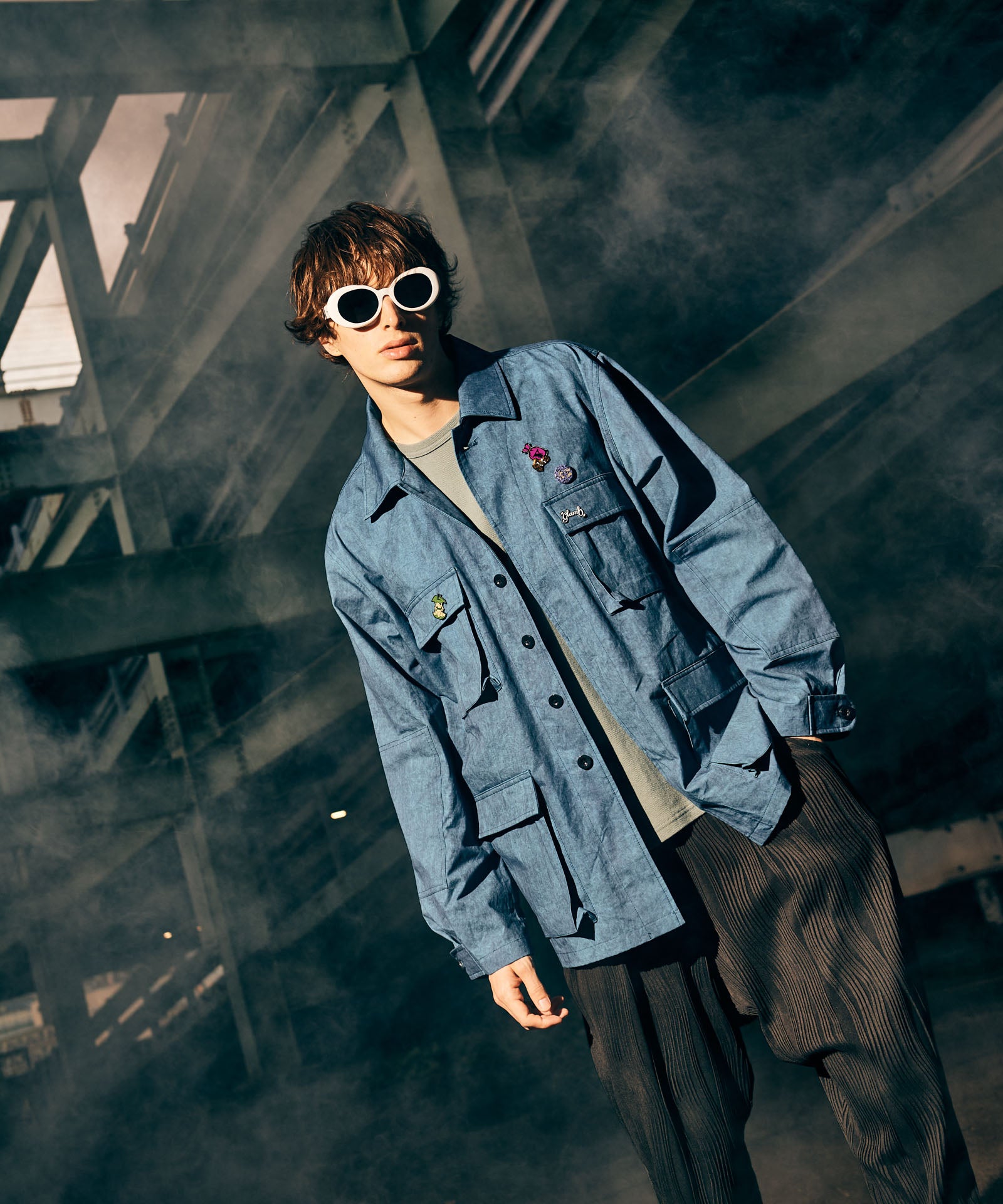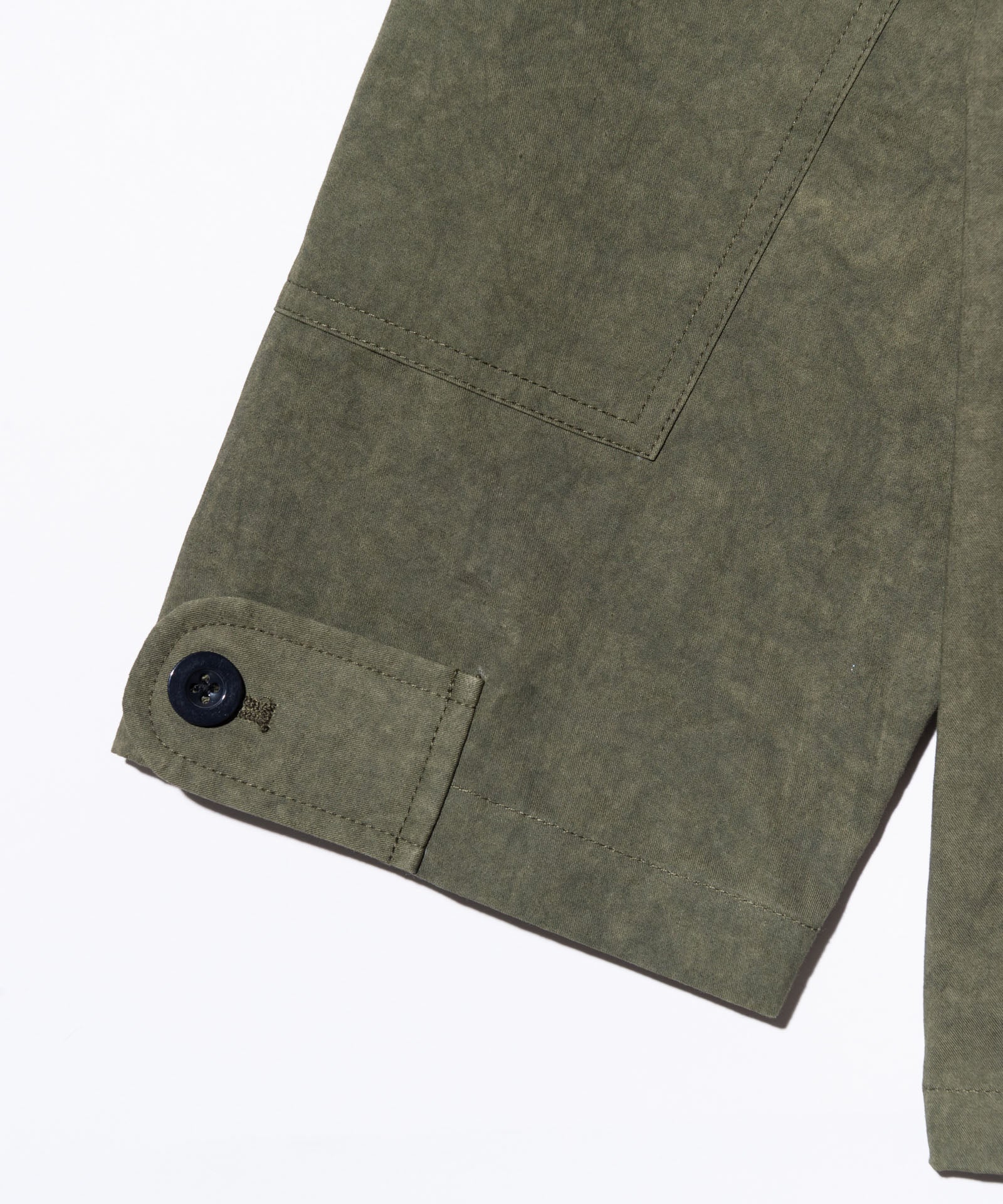 ミリタリーシャツからディテールを削ぎ落し、アダルトな1枚にまとめたMinimal Military Shirt。オーバーサイズシルエットのボディはミリタリーらしさを残しながら、前身頃のボタンは第一ボタン以外は比翼仕立て。テキスタイルにはムラ感ある色合いのコットン生地を用いることでミニマルでありながら奥行のある佇まいにまとめています。袖口には2つボタンのタブを配してさりげないアクセントに。今季展開となるGB Pins Setを付けるアレンジもおすすめです。