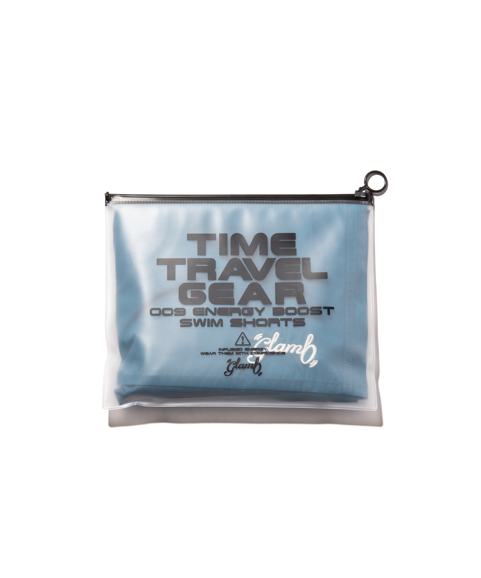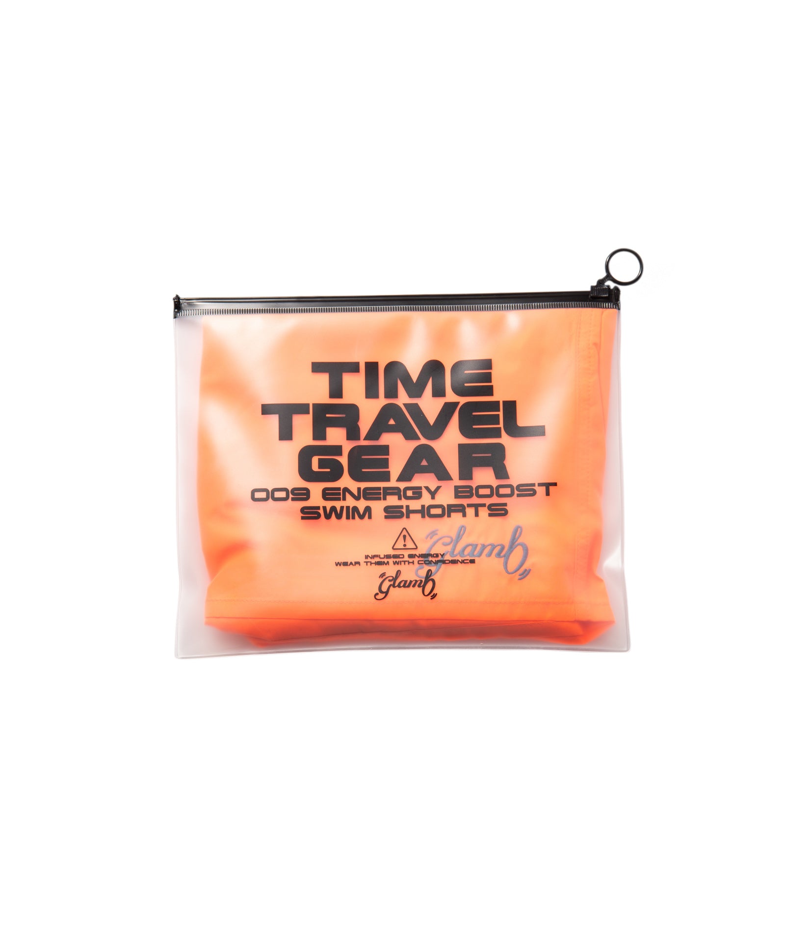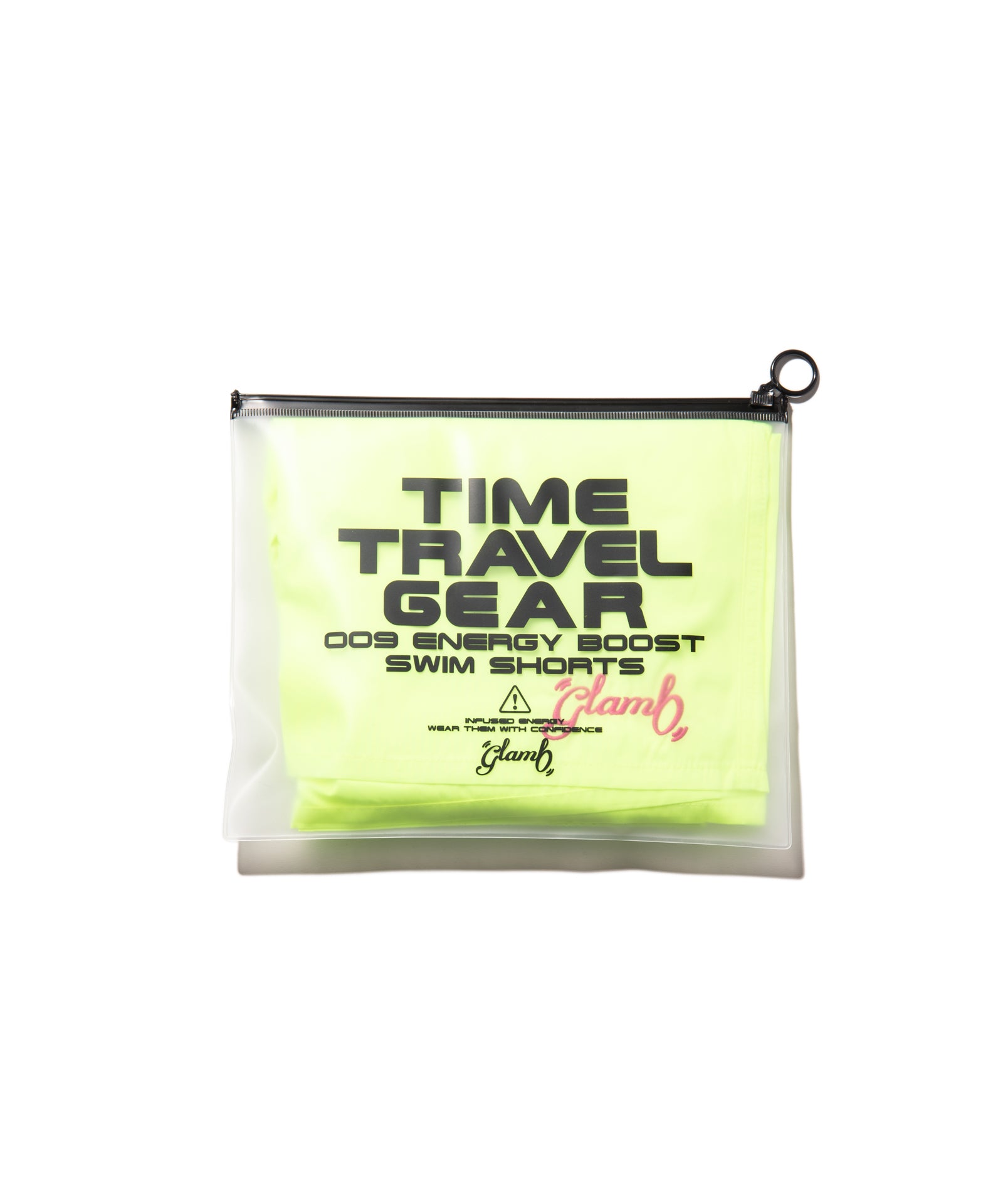 今季のテーマ“TIME TRAVELER”のコンセプトを色濃く反映するシリーズ「TIME TRAVEL GEAR」から、穿けばエナジードリンク代わりになってくれるTIME TRAVELER Energy Boost Shorts (GEAR 009)。タイムトラベルの際の無重力では液体を飲むのが難しいもの。防水仕様となるパッケージに書かれた“INFUSED ENERGY”の言葉通り、こちらは着用でエナジーを補給できる頼りになる一本です。股上を深く設けたルーズシルエットのこちらはバックポケットのシルバータグがアクセント。本体両脇のジップポケットは袋布にメッシュ生地を使用、腰元にはDカンを加えてレジャーシーンでの使い勝手を向上。時代によっては陸地だったところも水没している、そんな時のために備えていただきたいタイムトラベルギアは同生地を用いたNeon Bucket Hatとのコンビもおすすめです。