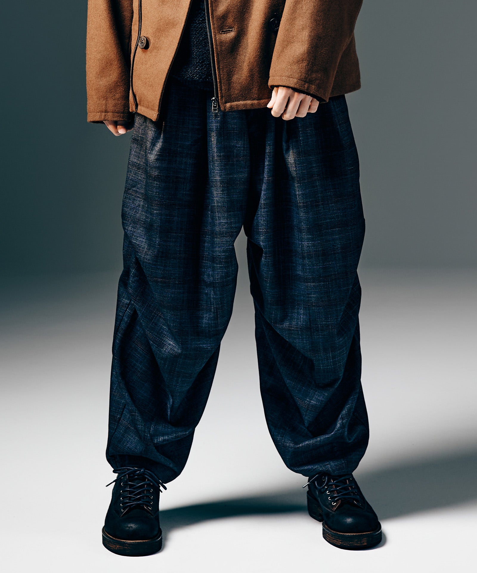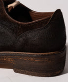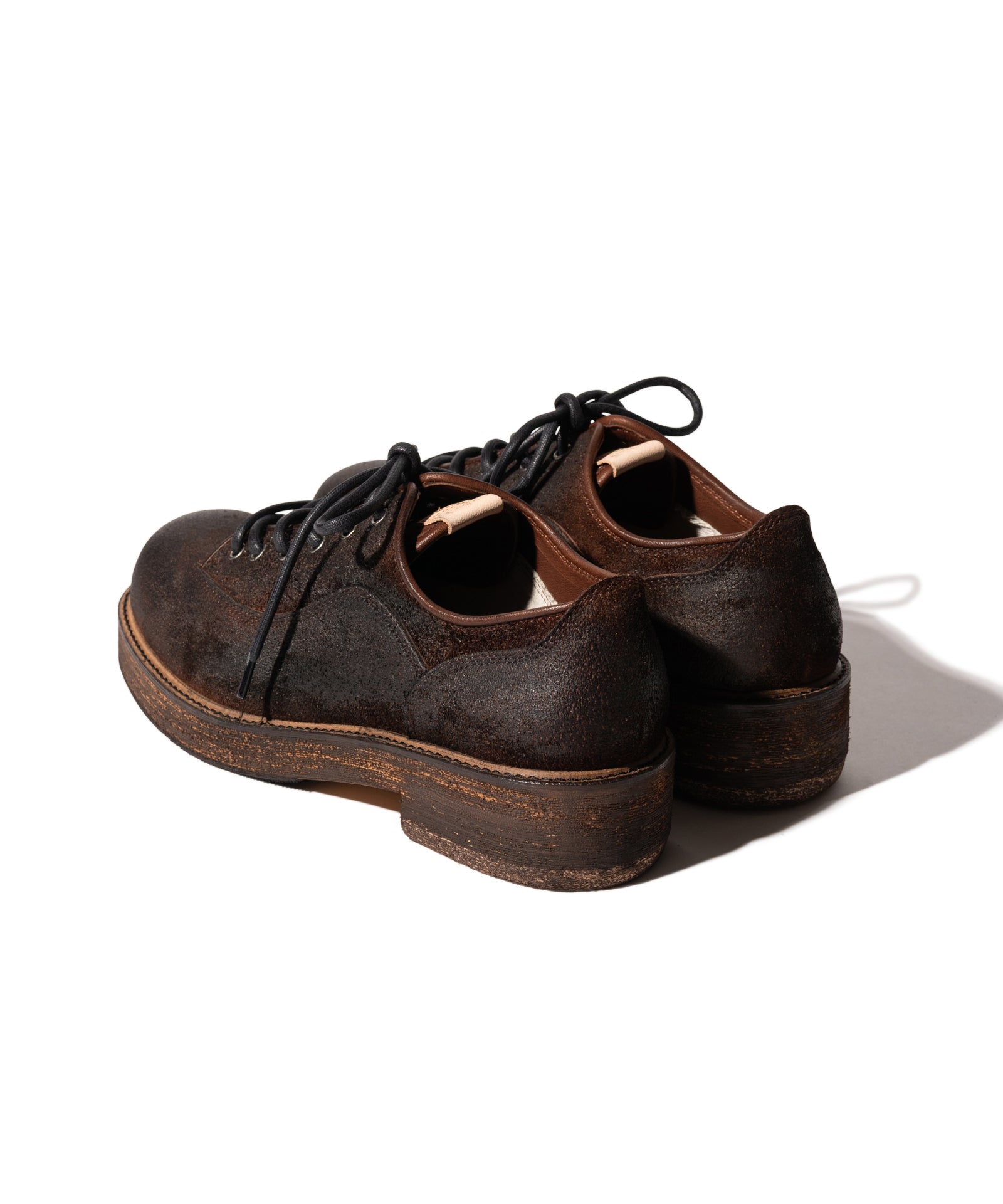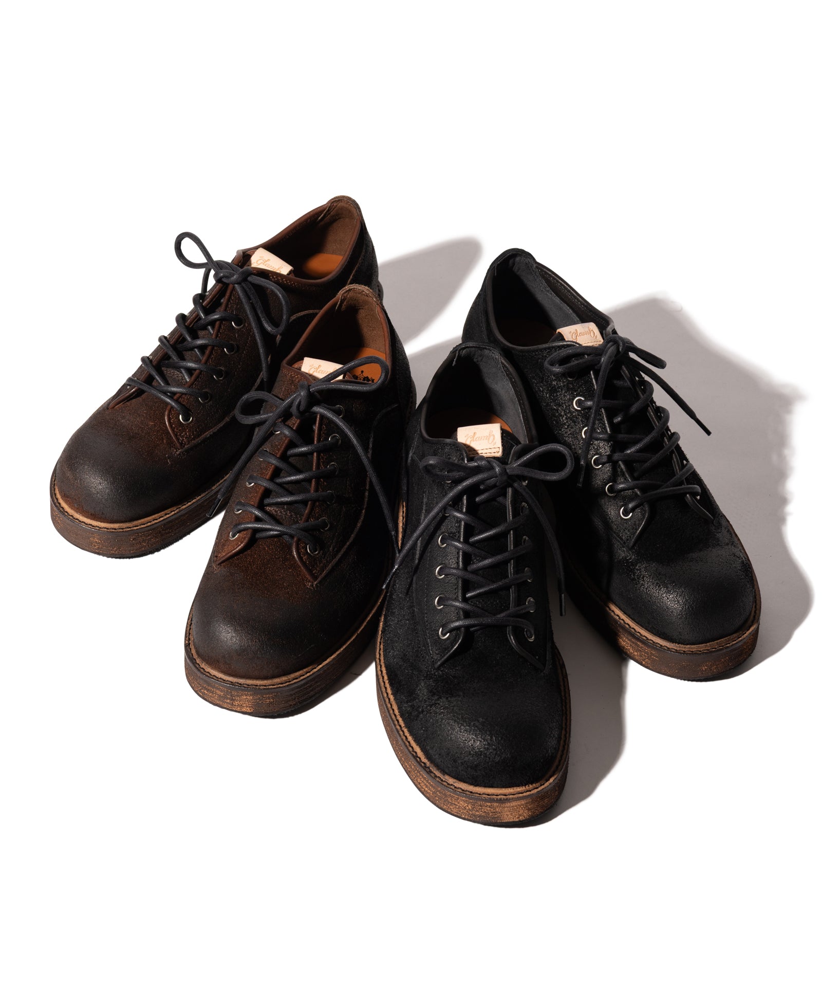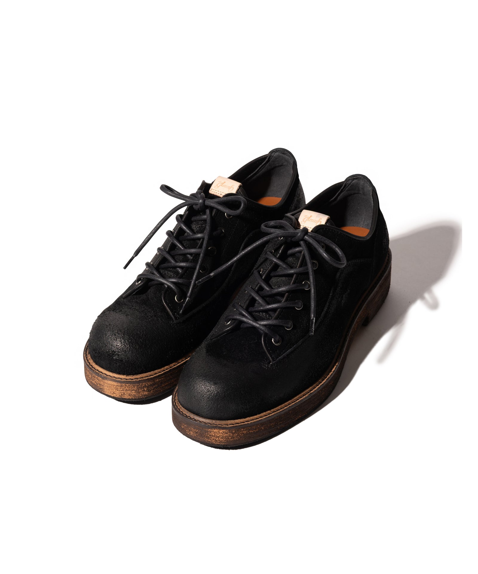東京に拠点を置くブランドのシューズファクトリーのクラフトマンシップにより、永き愛用による経年変化の表情をアッパーからソールまで巧みに描き出したDirt Work Shoes。スエードの牛革を用いたアッパーは、縫製後に濃色のクリームを生地表面に加えながら革目を潰して経年変化の表情を演出。ソールも外面を粗く削った後に汚し加工を加えることで立体的なテクスチャに。熟練の職人が目を利かせて行った、MADE IN JAPANならではの丹念な仕上げをお楽しみください。またglambのシューズラインの特徴であるスタイルアップ効果は本作でも。4cmのボリュームソールはボトムスシルエットを向上させながらスタイリング全体をワンランク上の佇まいへ導きます。