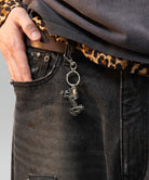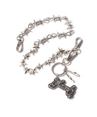 スタイリングにロックやパンクのムードを忍ばせるのに絶好のSpiky Wallet Chain Necklace。本体は有刺鉄線と星のチェーンを半分で使い分け。スタイリング時に前後を入れ替えることで2WAYの見せ方をお楽しみいただけます。さらに腰元のアクセントとしてロゴチャームも付属。リング部分には鍵用フックを2つ設けており、キーホルダーとしての用途にも対応します。