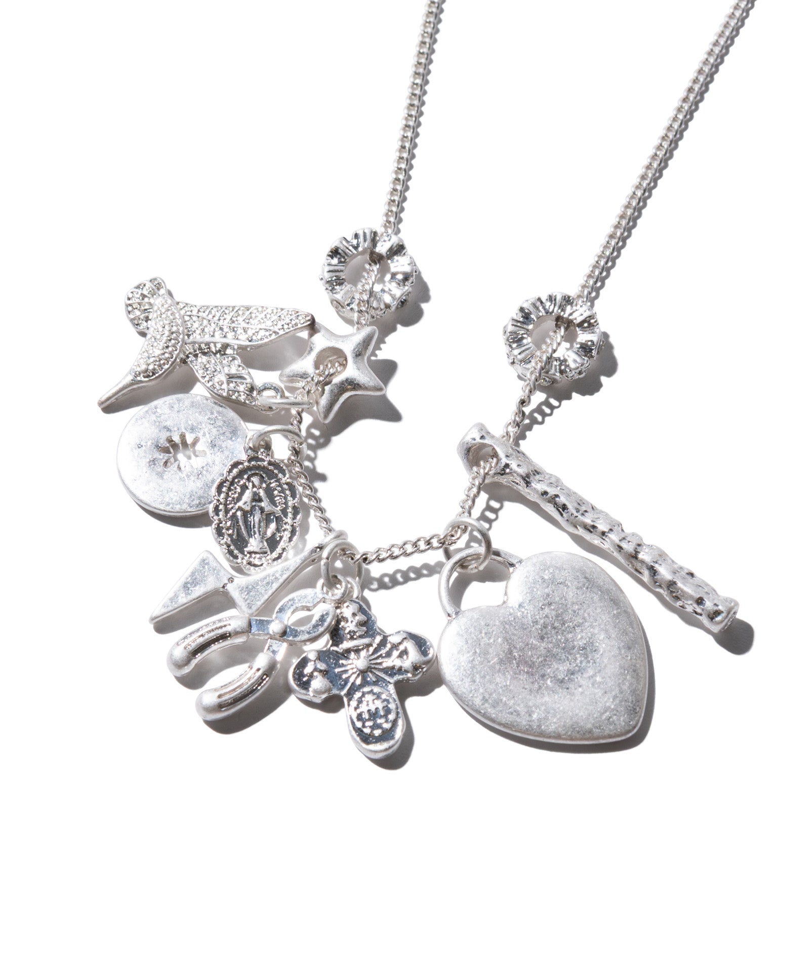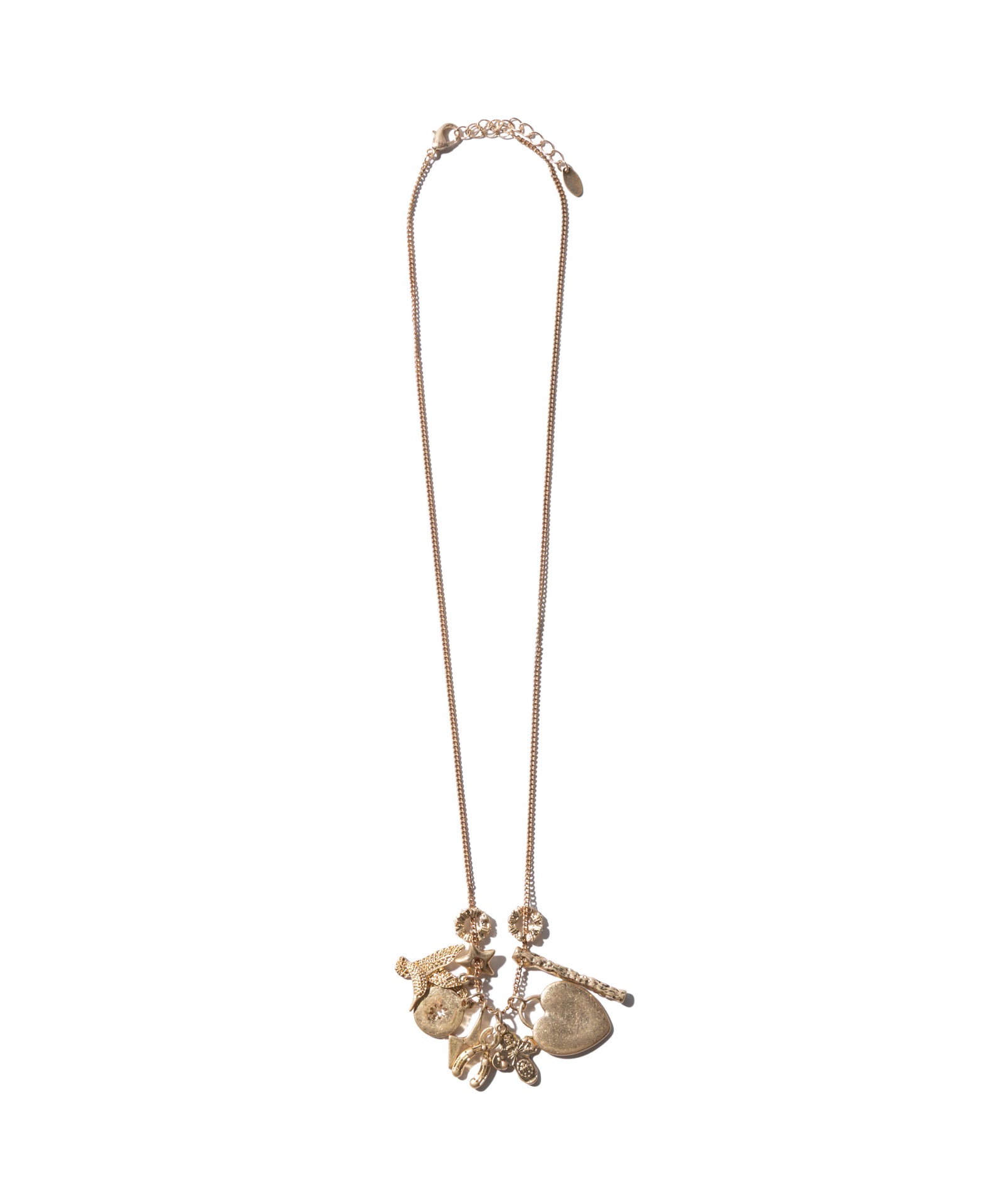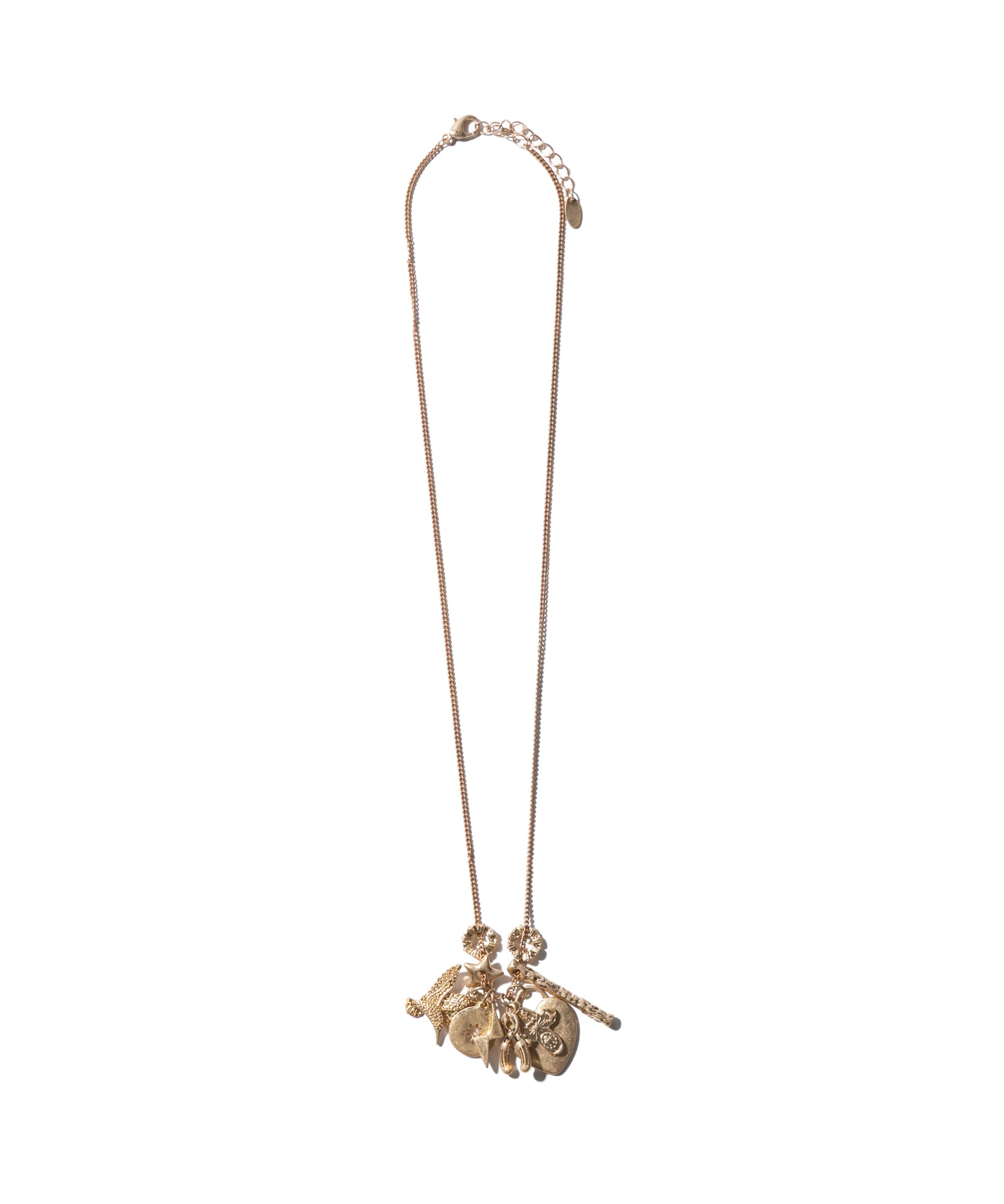 折り重なる幾つものチャームがミステリアスで幻想的な佇まいを見せるMulti Charm Necklace。メダイやピジョンなど9つものチャームを連ねたこちら。パーツにはアンティーク仕上げを施すことで長年にわたって愛用されたかの風合いをご購入時からお楽しみいただけます。デコラティブなルックスは秋冬はもちろん、春夏のカットソースタイリングでも活躍してくれることでしょう。