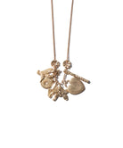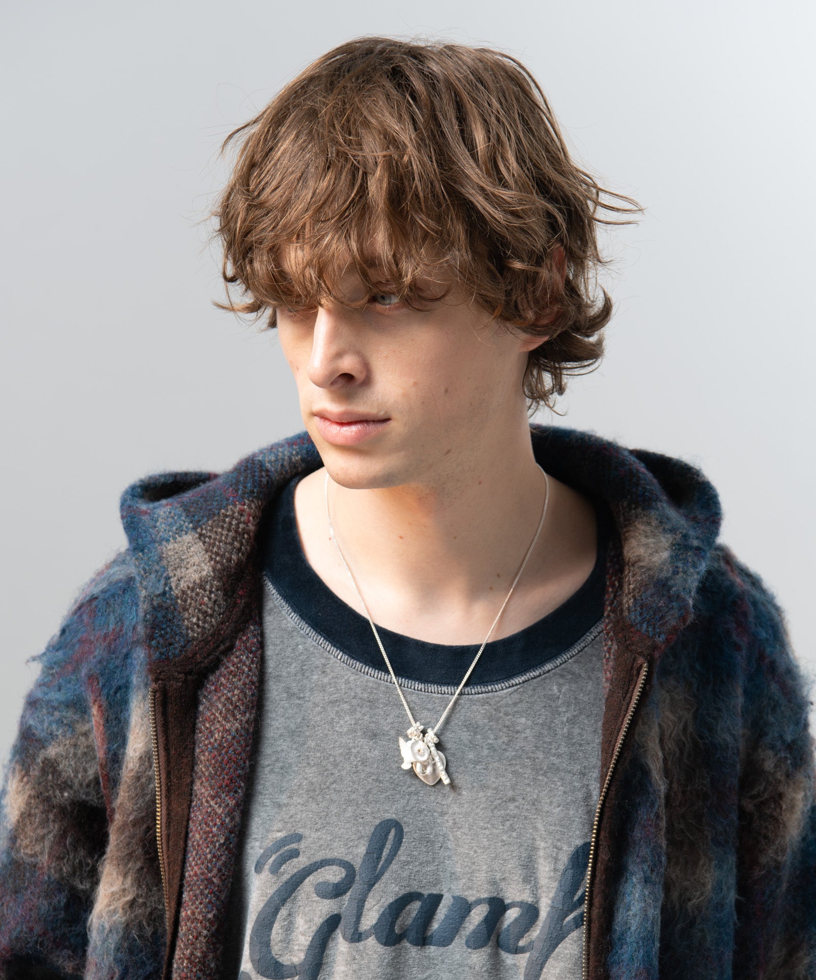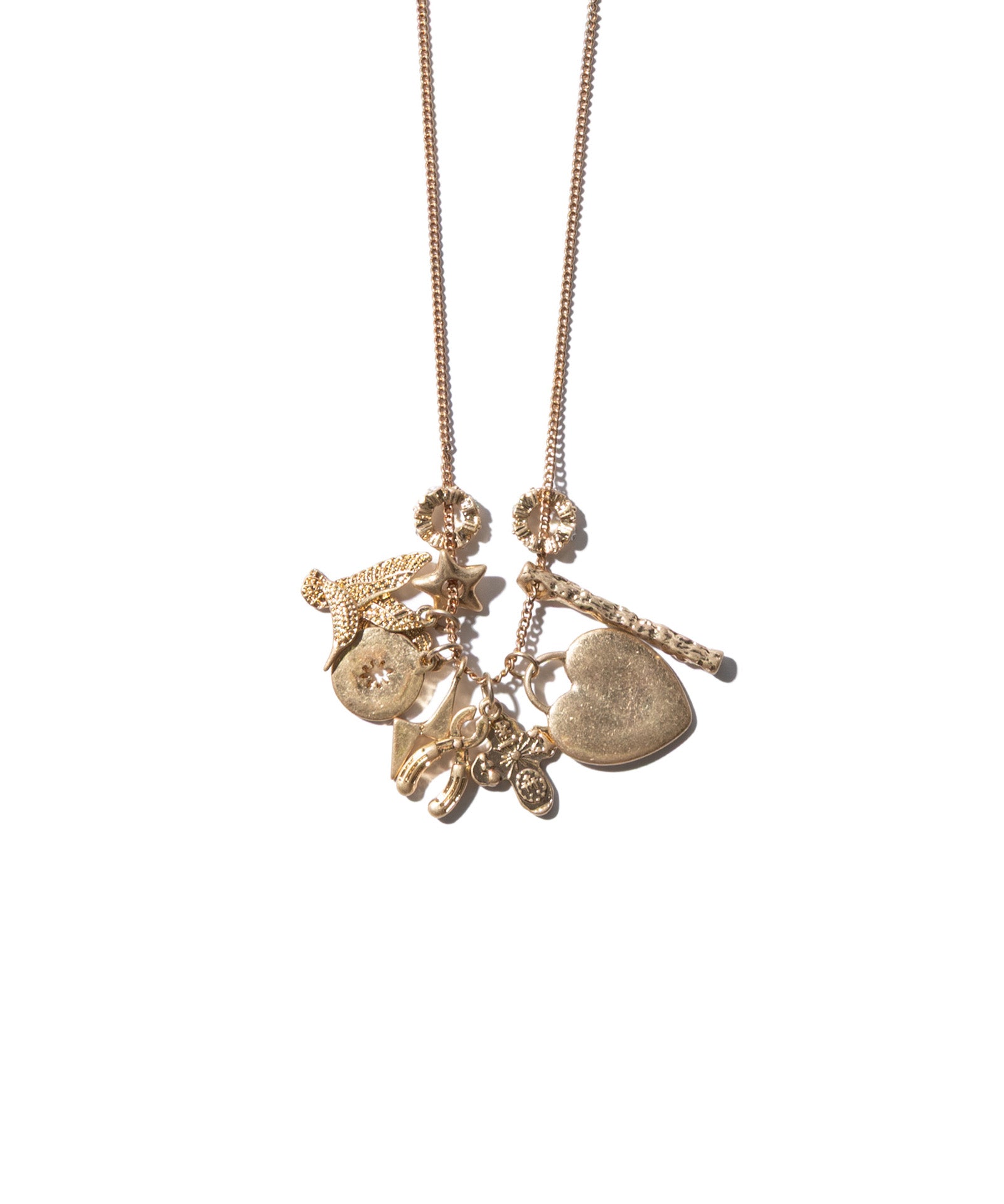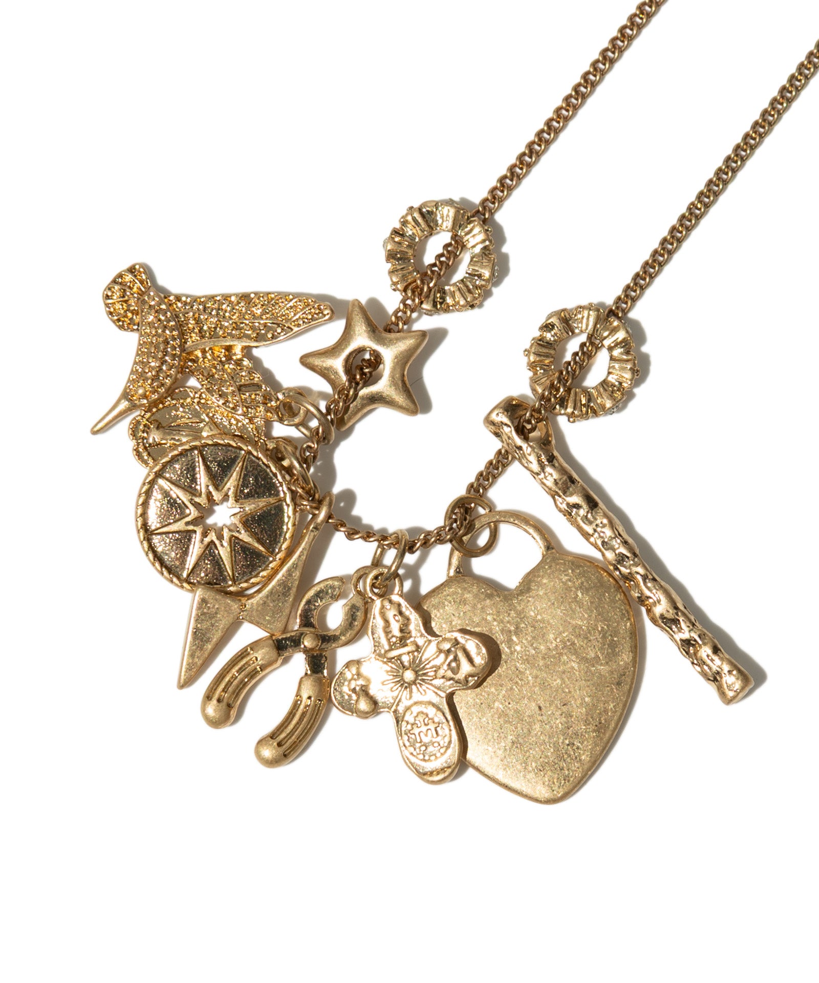 折り重なる幾つものチャームがミステリアスで幻想的な佇まいを見せるMulti Charm Necklace。メダイやピジョンなど9つものチャームを連ねたこちら。パーツにはアンティーク仕上げを施すことで長年にわたって愛用されたかの風合いをご購入時からお楽しみいただけます。デコラティブなルックスは秋冬はもちろん、春夏のカットソースタイリングでも活躍してくれることでしょう。