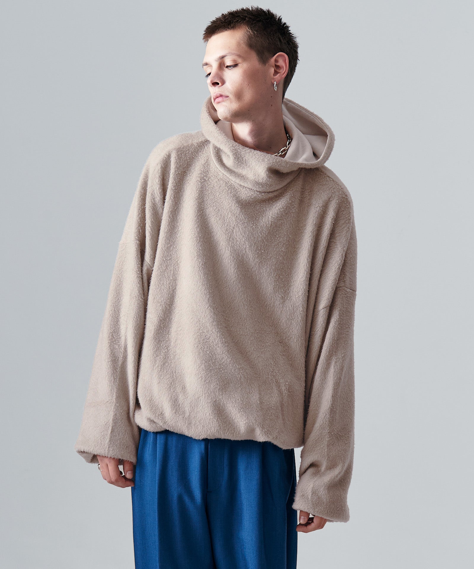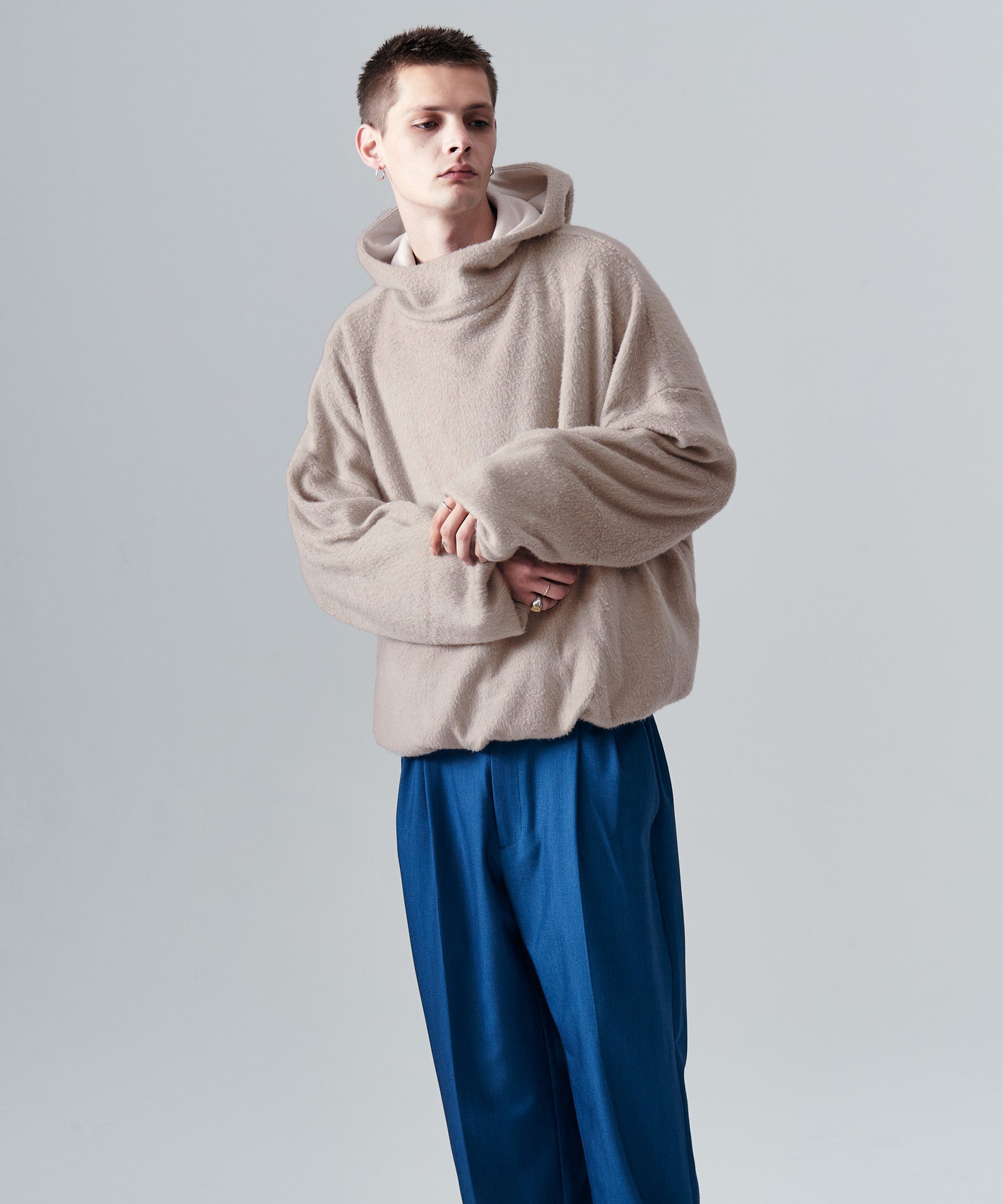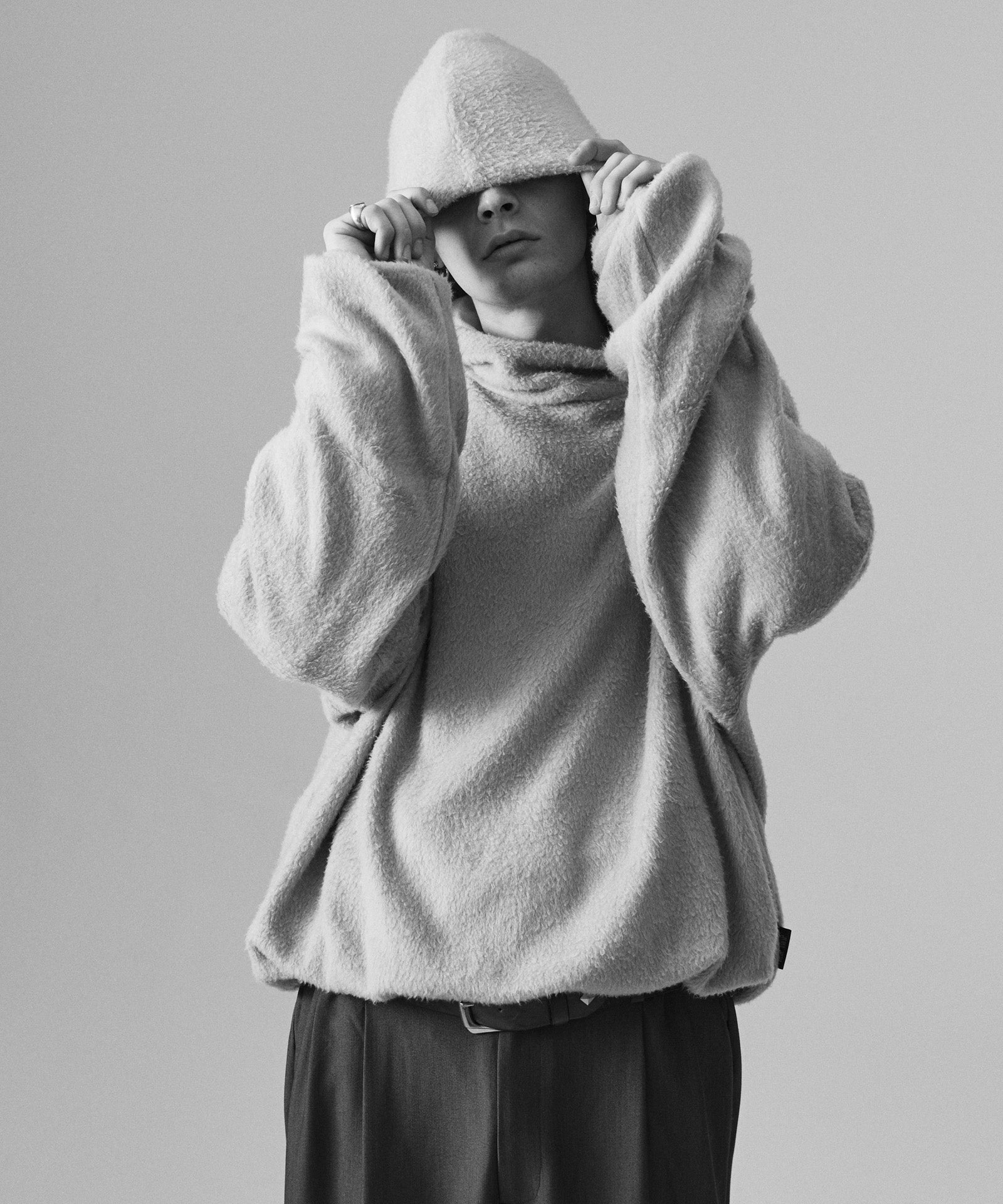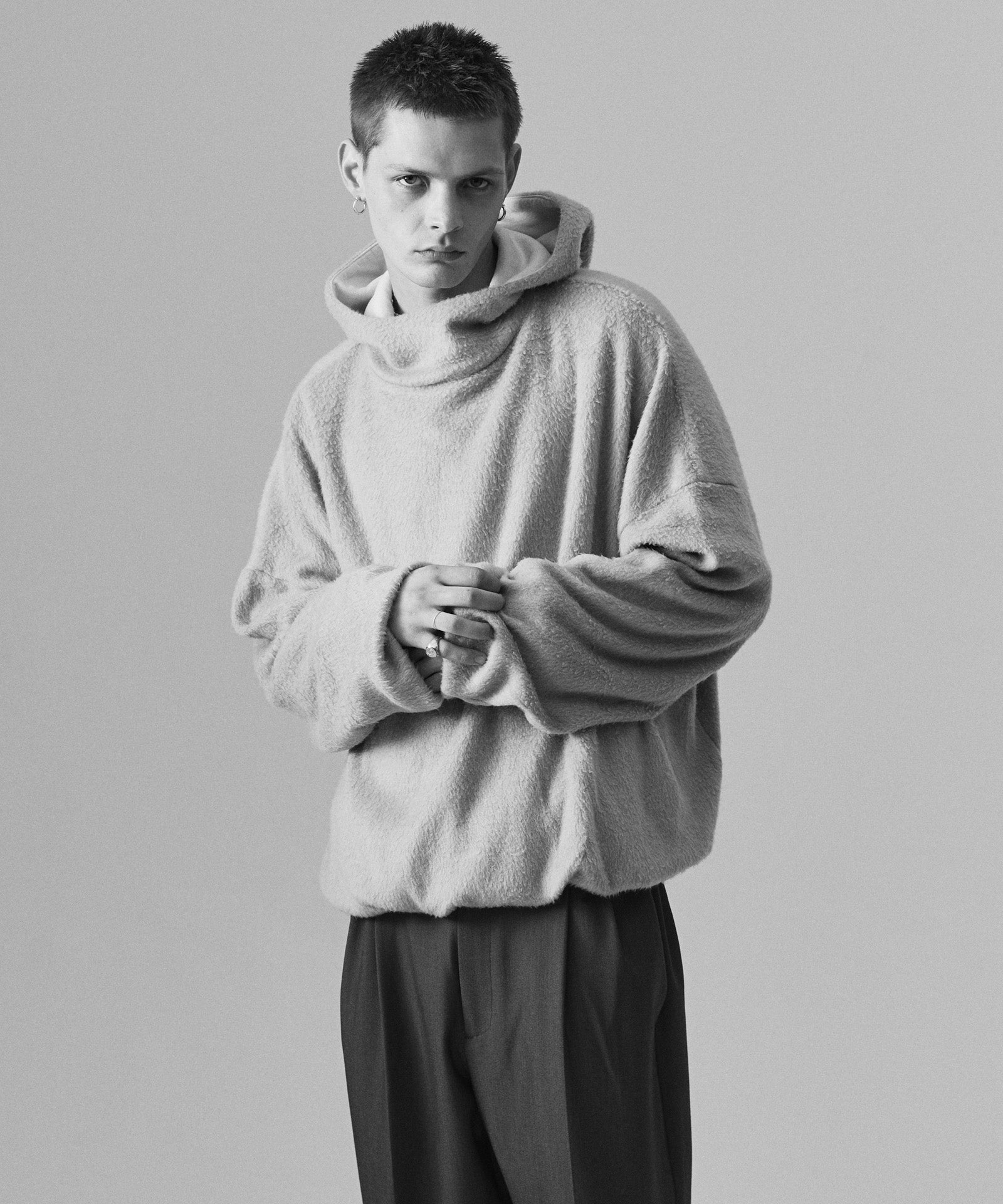 上質さを追求する素材使いでスタンダードアイテムに静謐さとエッジをもたらす“Blue Noise”シリーズからファーライク生地をフーディへと落とし込んだBlue Noise Shaggy Hoodieをリリース。テキスタイルに用いたのは、特殊紡績で糸にボリュームを出すことでふわりとした質感を持たせたウール混スムースシャギー生地。時間を惜しまない工程によって仕上げられたマテリアルは、着心地と視覚の双方で上質な体験をもたらします。袖口とショートレングスの裾は内側に設けたリブを裏地で釣り上げることでバルーンシルエットを形成。リュクスと独創性を併せ持ったヴィジュアルを作り上げました。