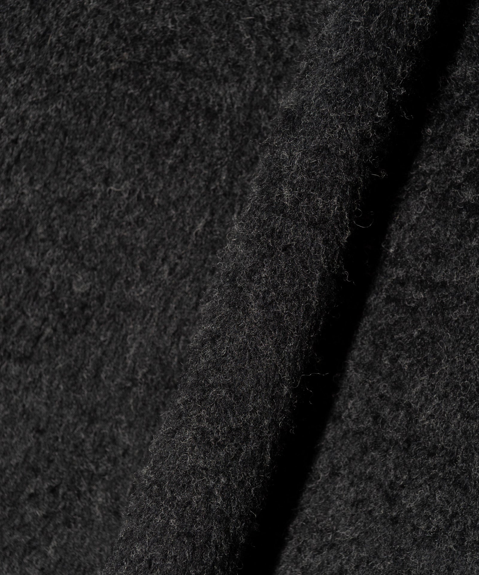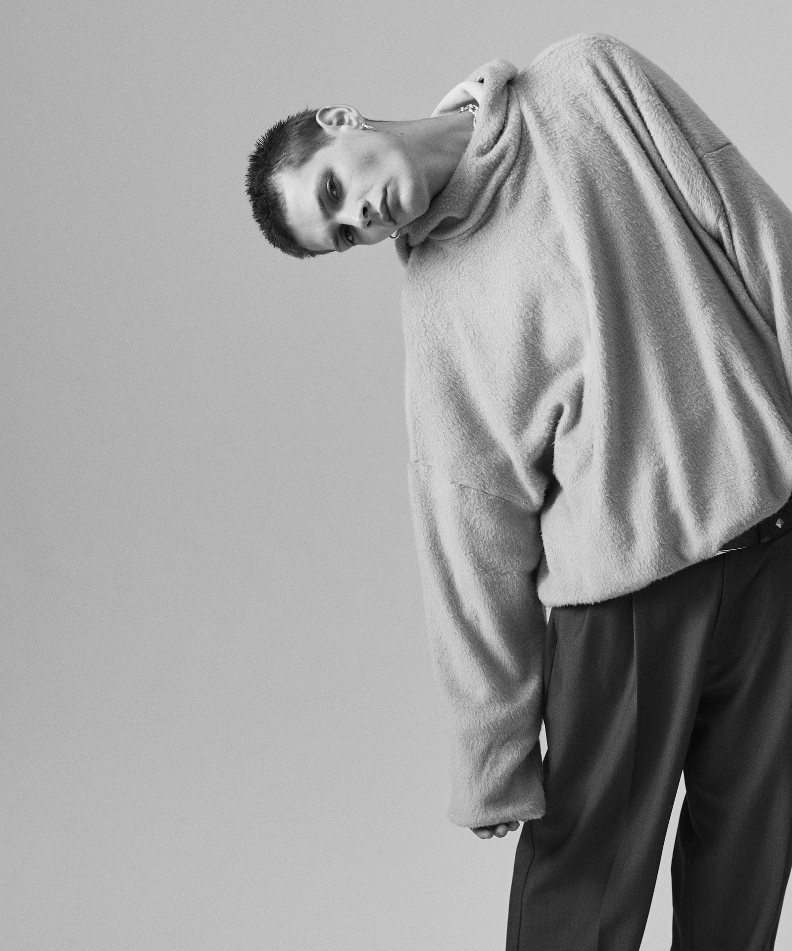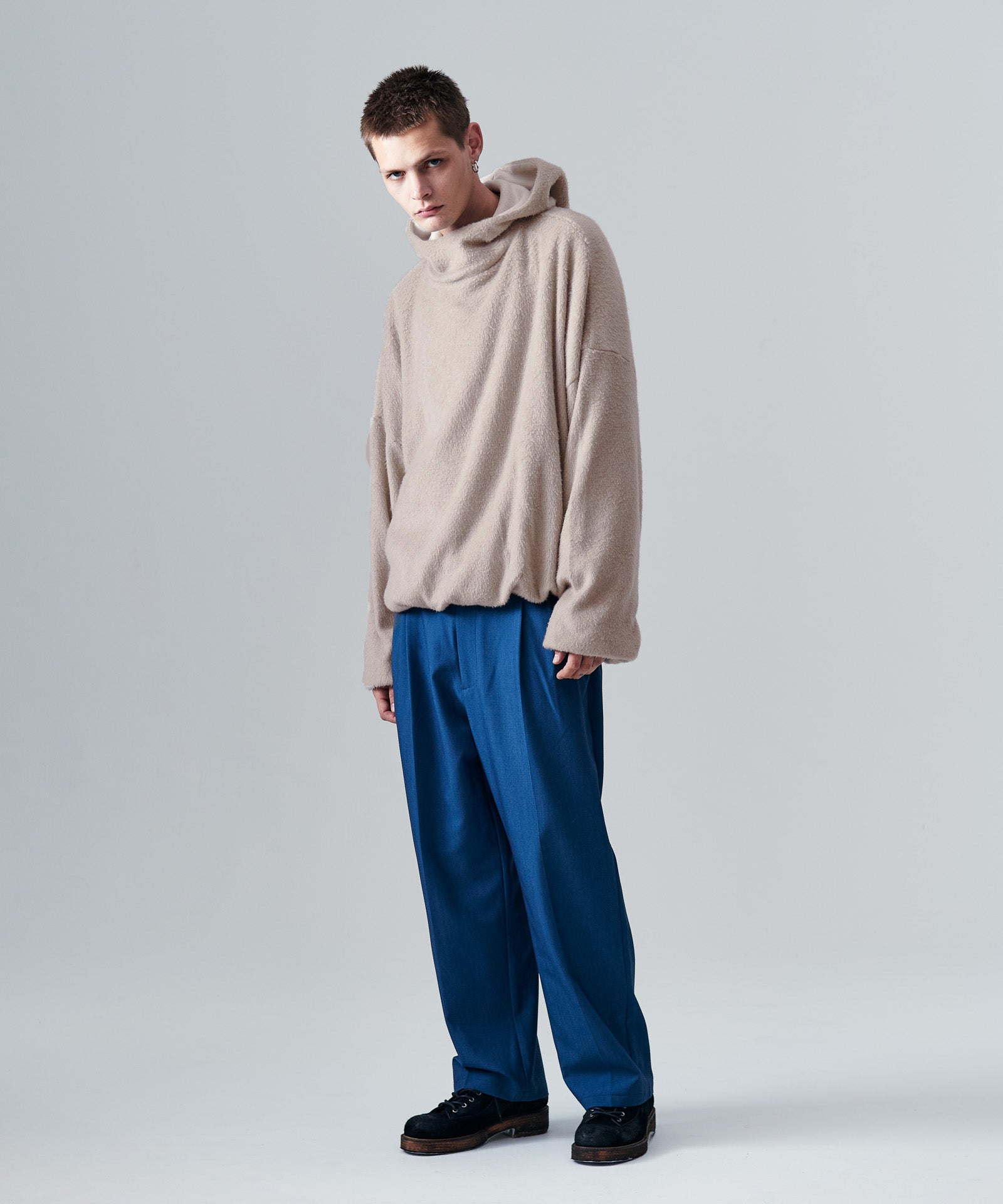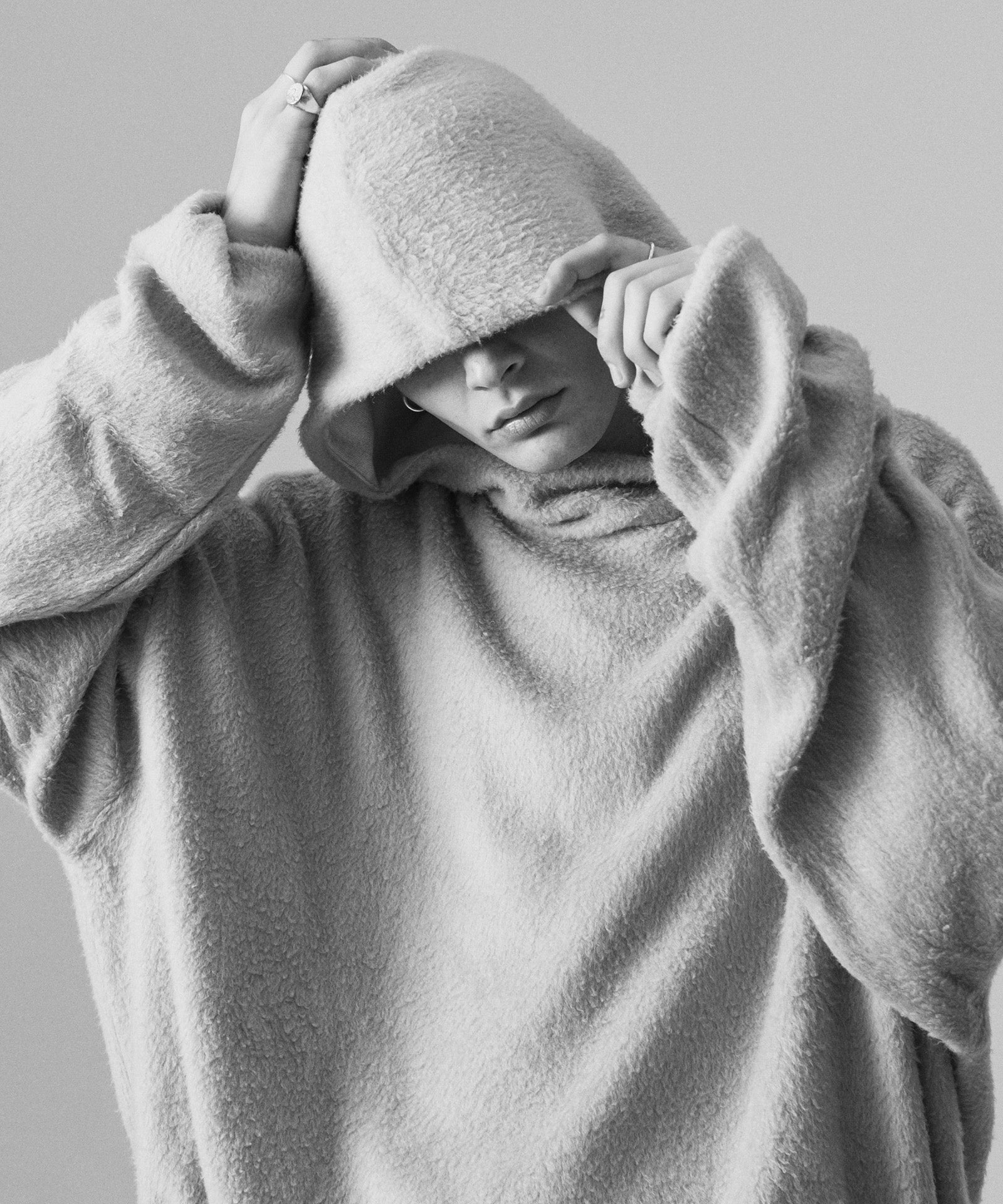 上質さを追求する素材使いでスタンダードアイテムに静謐さとエッジをもたらす“Blue Noise”シリーズからファーライク生地をフーディへと落とし込んだBlue Noise Shaggy Hoodieをリリース。テキスタイルに用いたのは、特殊紡績で糸にボリュームを出すことでふわりとした質感を持たせたウール混スムースシャギー生地。時間を惜しまない工程によって仕上げられたマテリアルは、着心地と視覚の双方で上質な体験をもたらします。袖口とショートレングスの裾は内側に設けたリブを裏地で釣り上げることでバルーンシルエットを形成。リュクスと独創性を併せ持ったヴィジュアルを作り上げました。