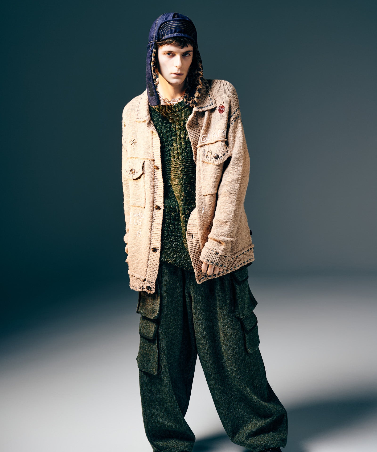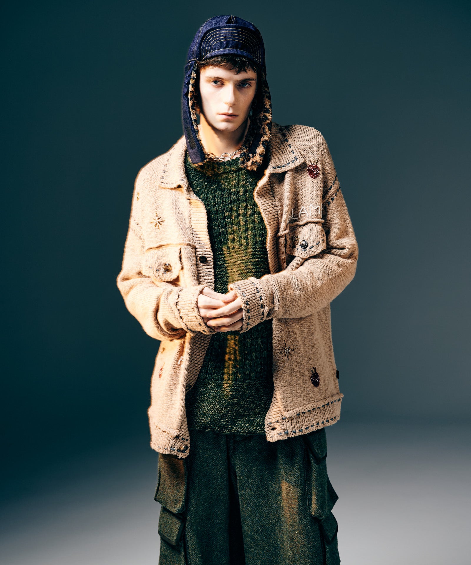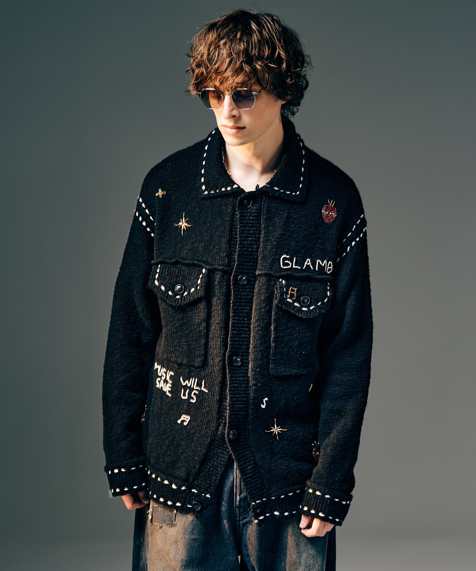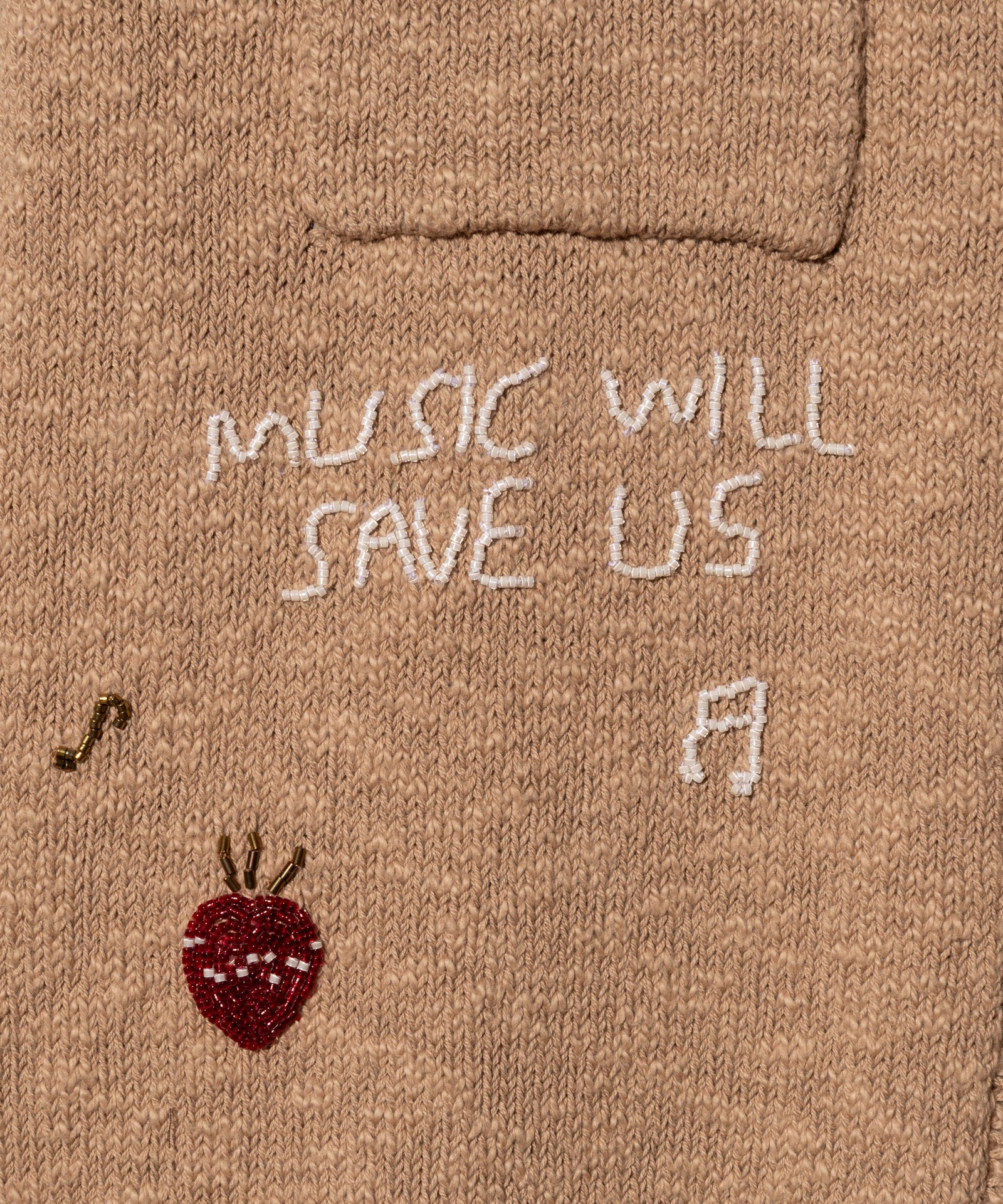 ノスタルジックなニット仕立てのジャケットへ、クラフトマンシップ息づく手刺繍で音楽愛を散りばめたBeadswork Knit Jacket。要所へあしらわれた太めのステッチは70’sヴィンテージ的な佇まい。その身頃全体にあしらわれたメッセージやアイコンのビーズ柄も全て職人の手仕事によるものとなっています。身頃の編み糸にはスラブ糸を用いて全体のテクスチャにランダムな凹凸を演出。細部のディテールに関してもフラップや衿は総針編み、ヨークを模した胸元のラインは生地を摘まんで縫い付けるというニットらしい技法で再現しております。