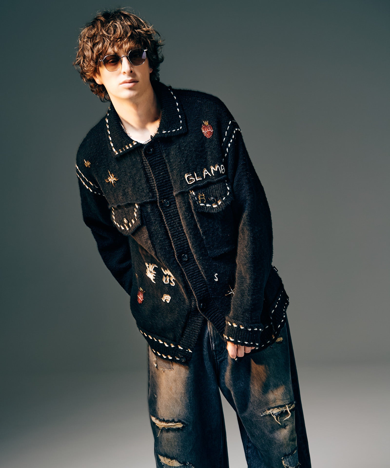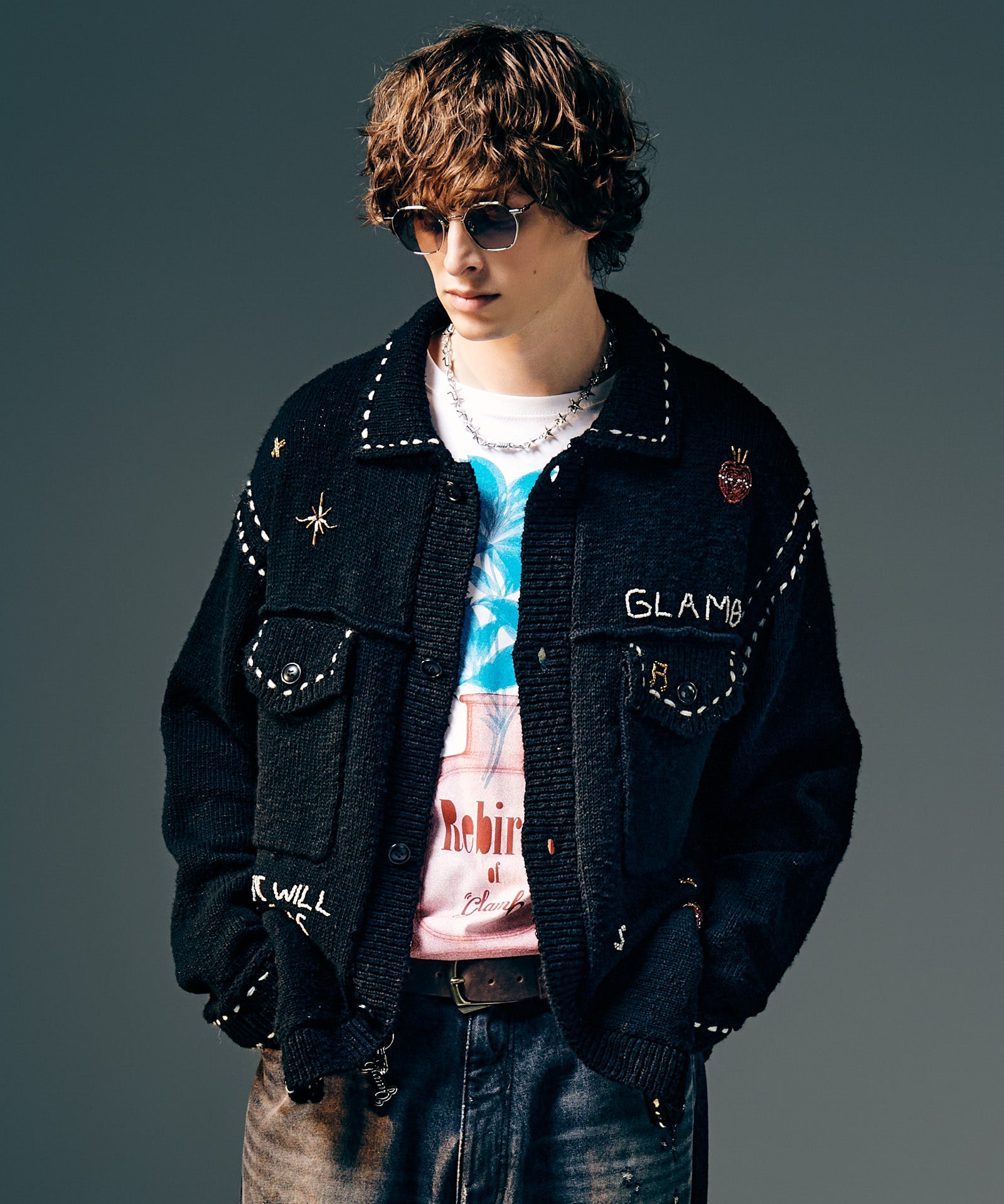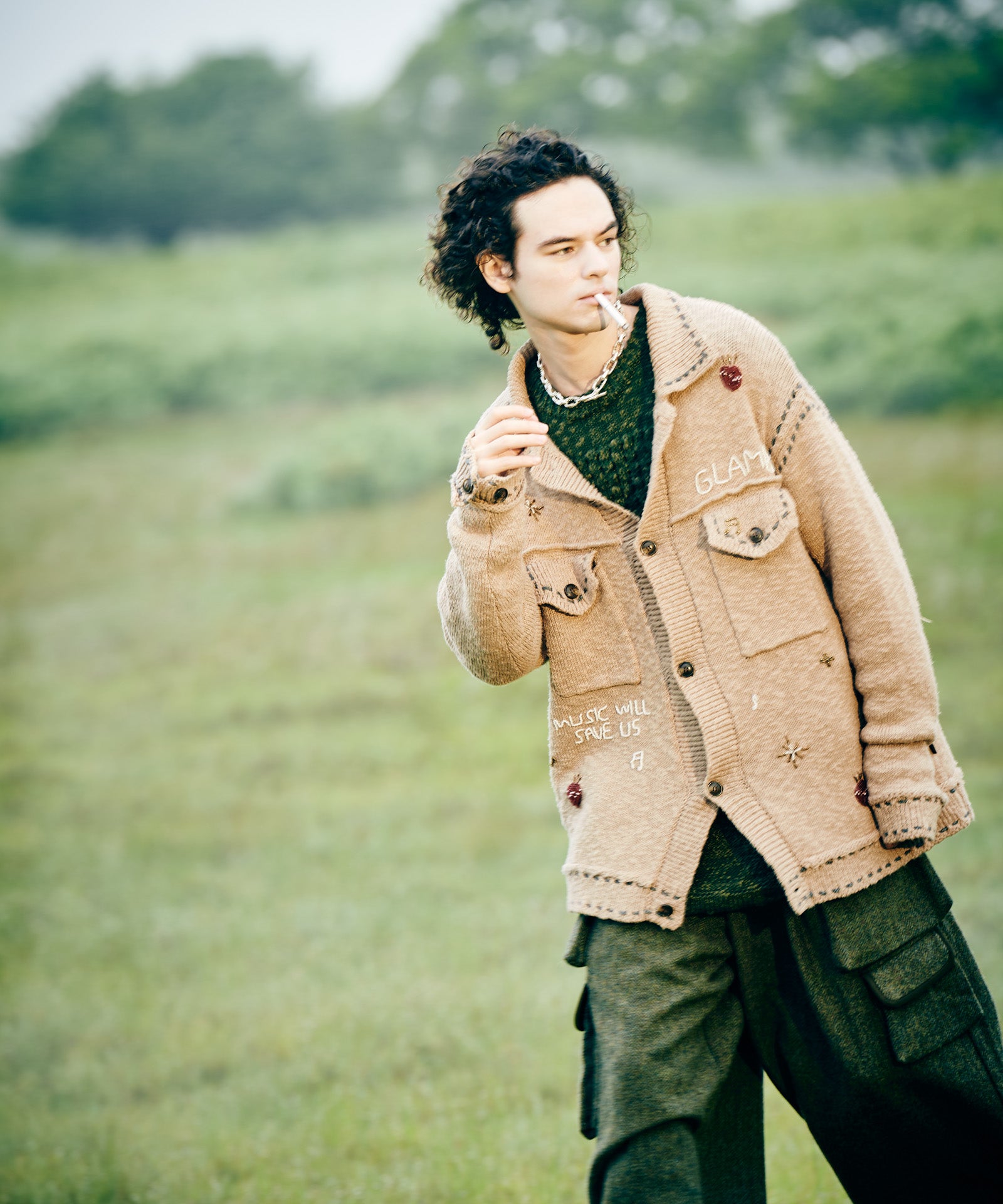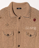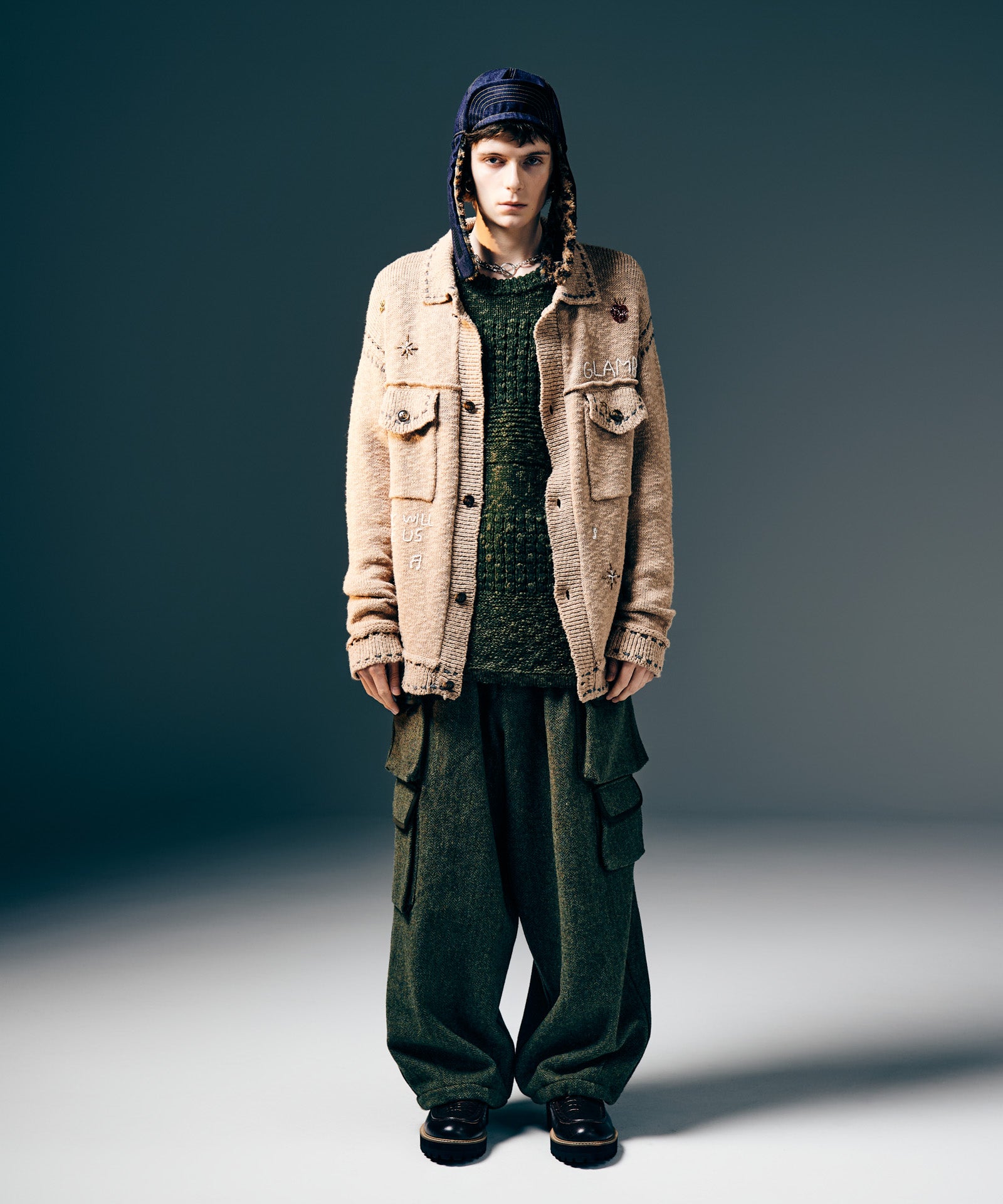 ノスタルジックなニット仕立てのジャケットへ、クラフトマンシップ息づく手刺繍で音楽愛を散りばめたBeadswork Knit Jacket。要所へあしらわれた太めのステッチは70’sヴィンテージ的な佇まい。その身頃全体にあしらわれたメッセージやアイコンのビーズ柄も全て職人の手仕事によるものとなっています。身頃の編み糸にはスラブ糸を用いて全体のテクスチャにランダムな凹凸を演出。細部のディテールに関してもフラップや衿は総針編み、ヨークを模した胸元のラインは生地を摘まんで縫い付けるというニットらしい技法で再現しております。
