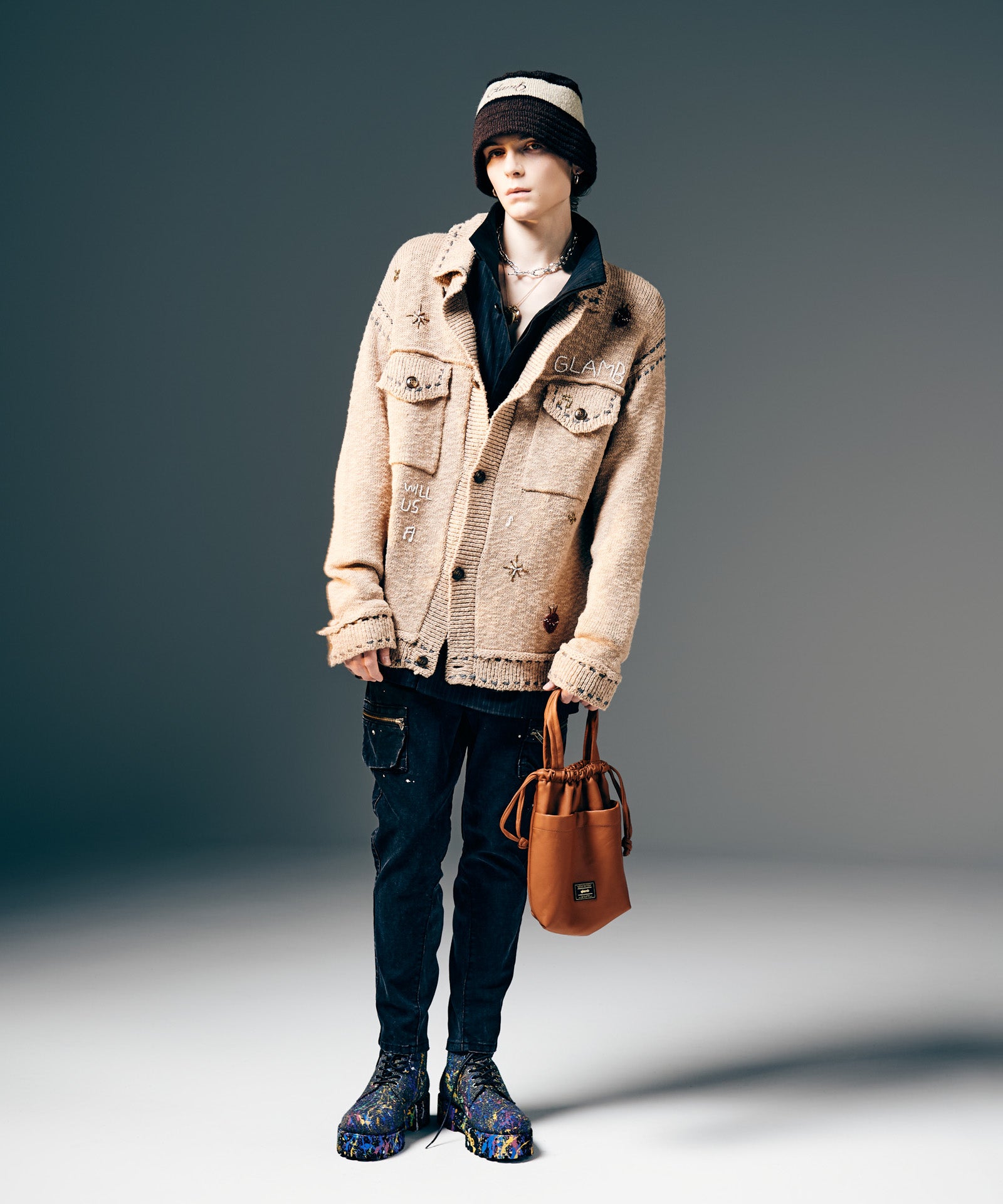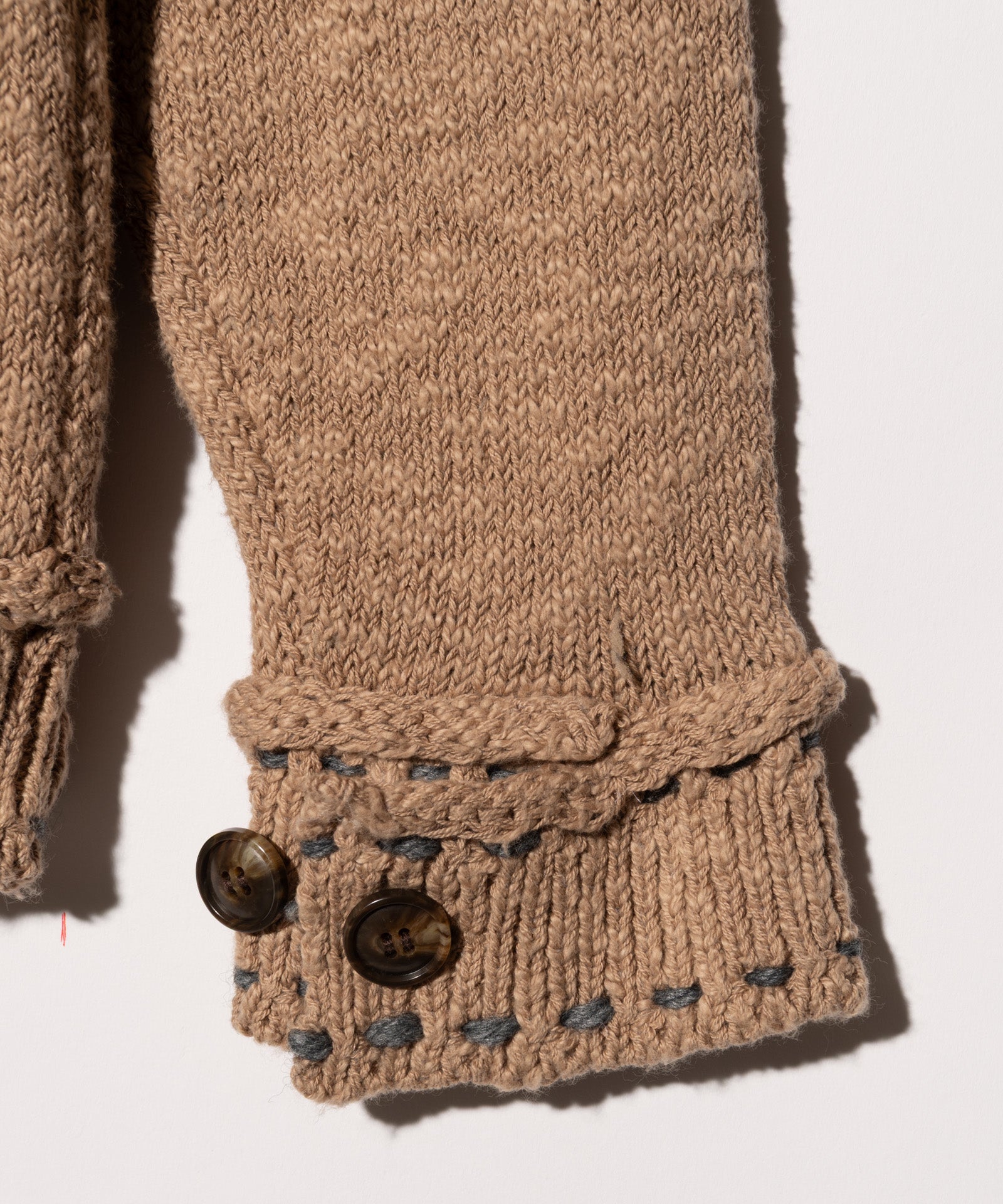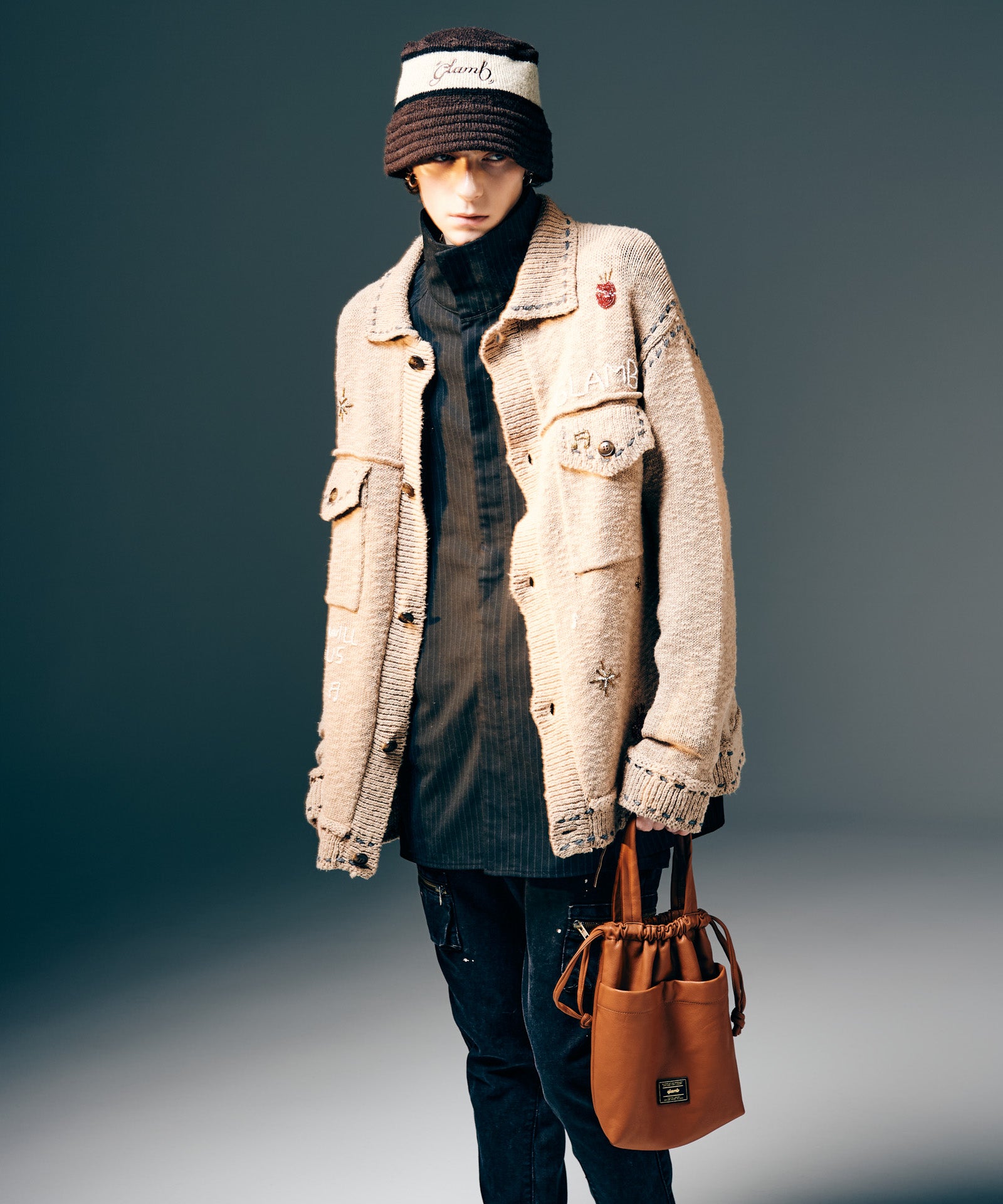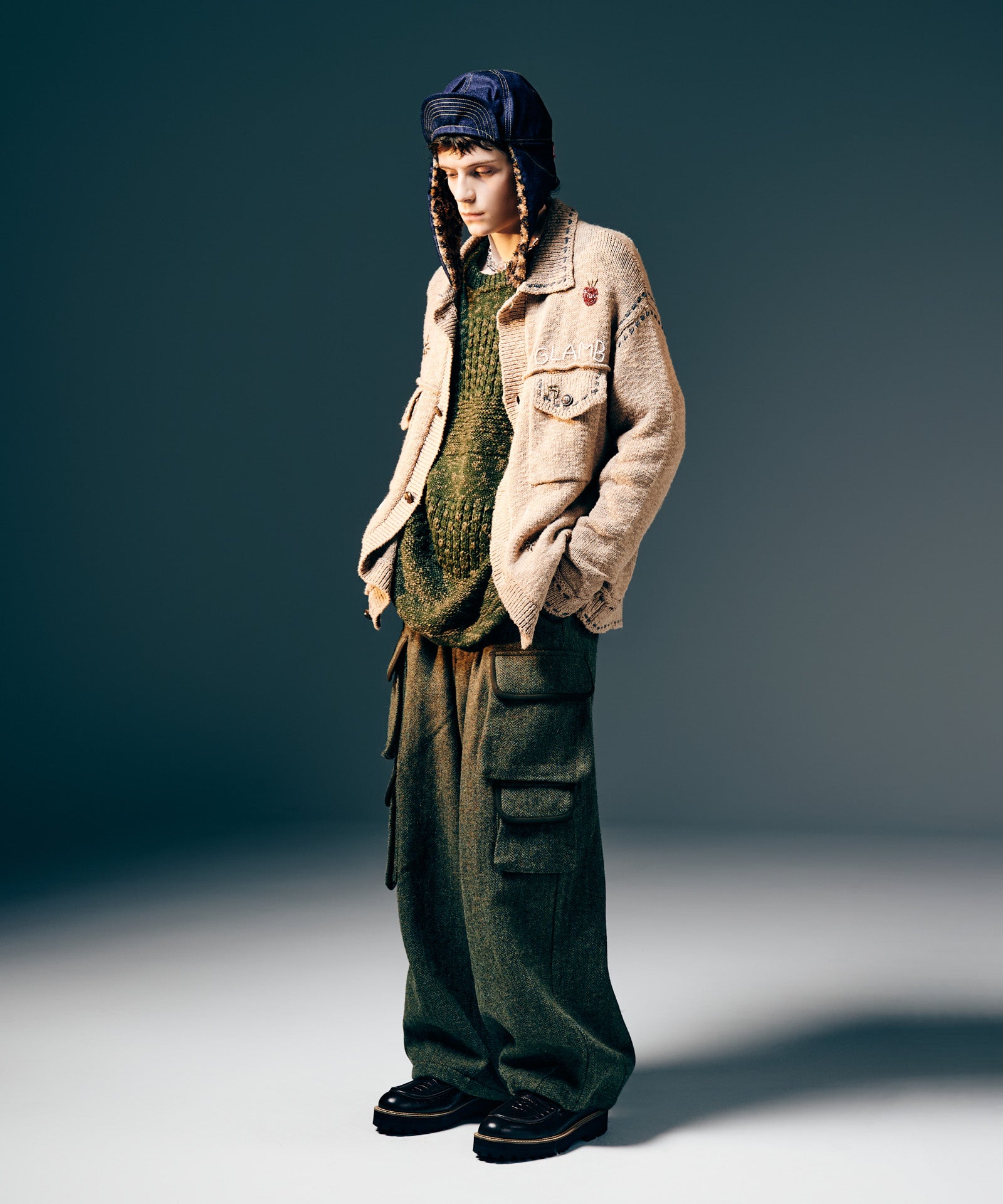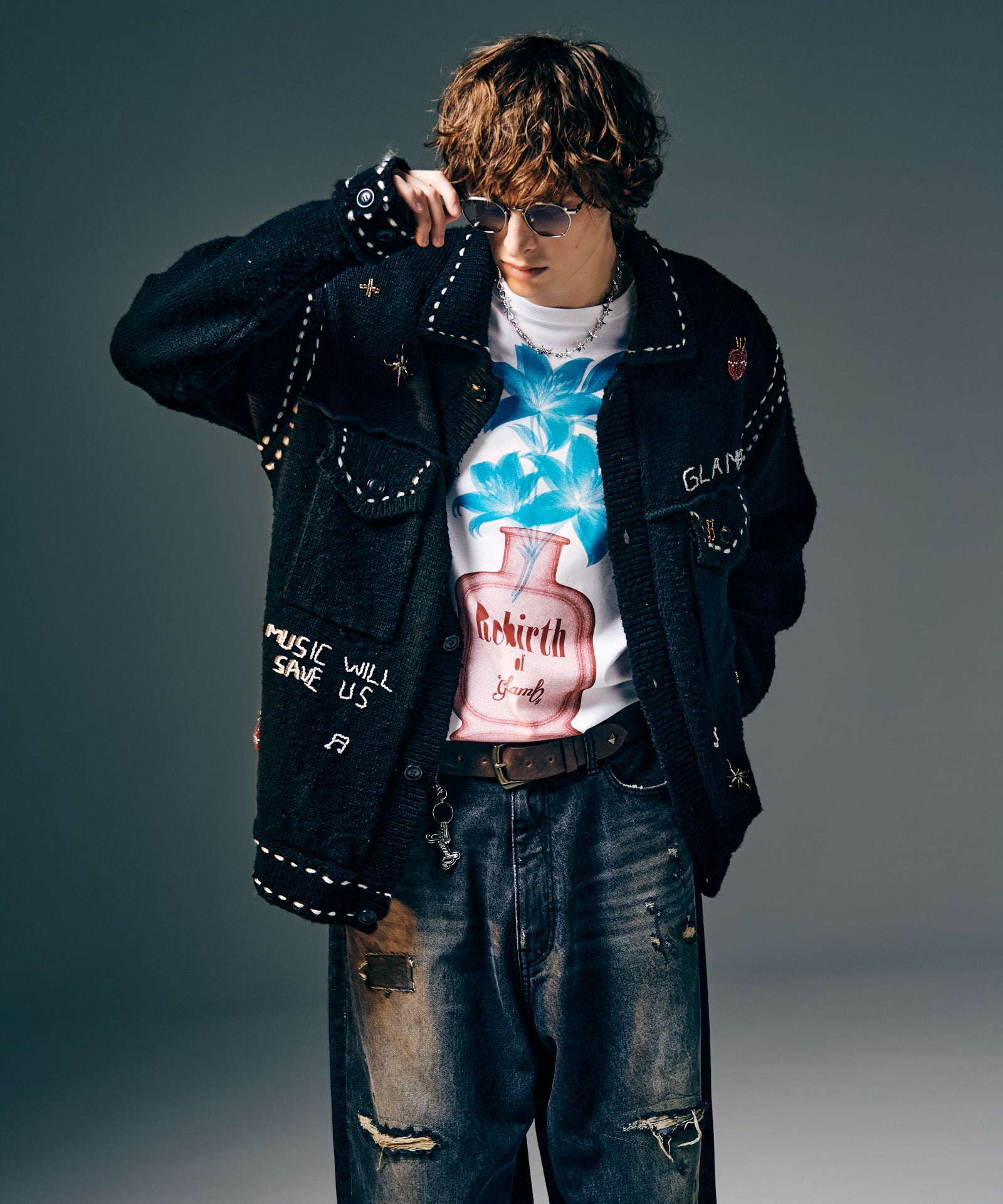 ノスタルジックなニット仕立てのジャケットへ、クラフトマンシップ息づく手刺繍で音楽愛を散りばめたBeadswork Knit Jacket。要所へあしらわれた太めのステッチは70’sヴィンテージ的な佇まい。その身頃全体にあしらわれたメッセージやアイコンのビーズ柄も全て職人の手仕事によるものとなっています。身頃の編み糸にはスラブ糸を用いて全体のテクスチャにランダムな凹凸を演出。細部のディテールに関してもフラップや衿は総針編み、ヨークを模した胸元のラインは生地を摘まんで縫い付けるというニットらしい技法で再現しております。