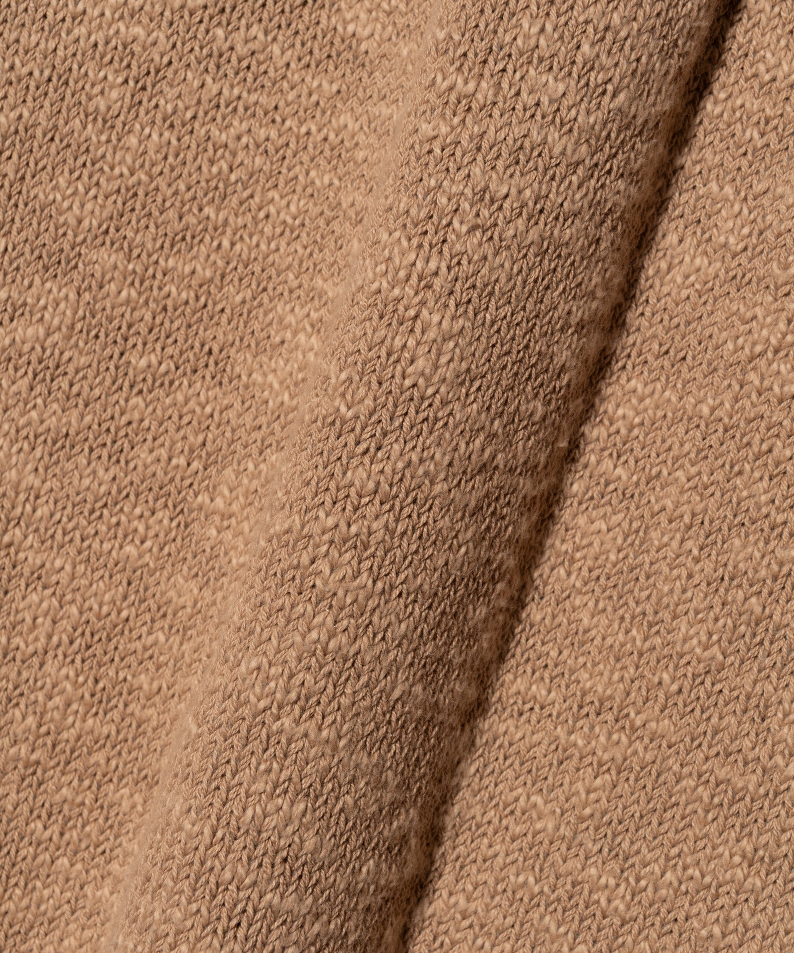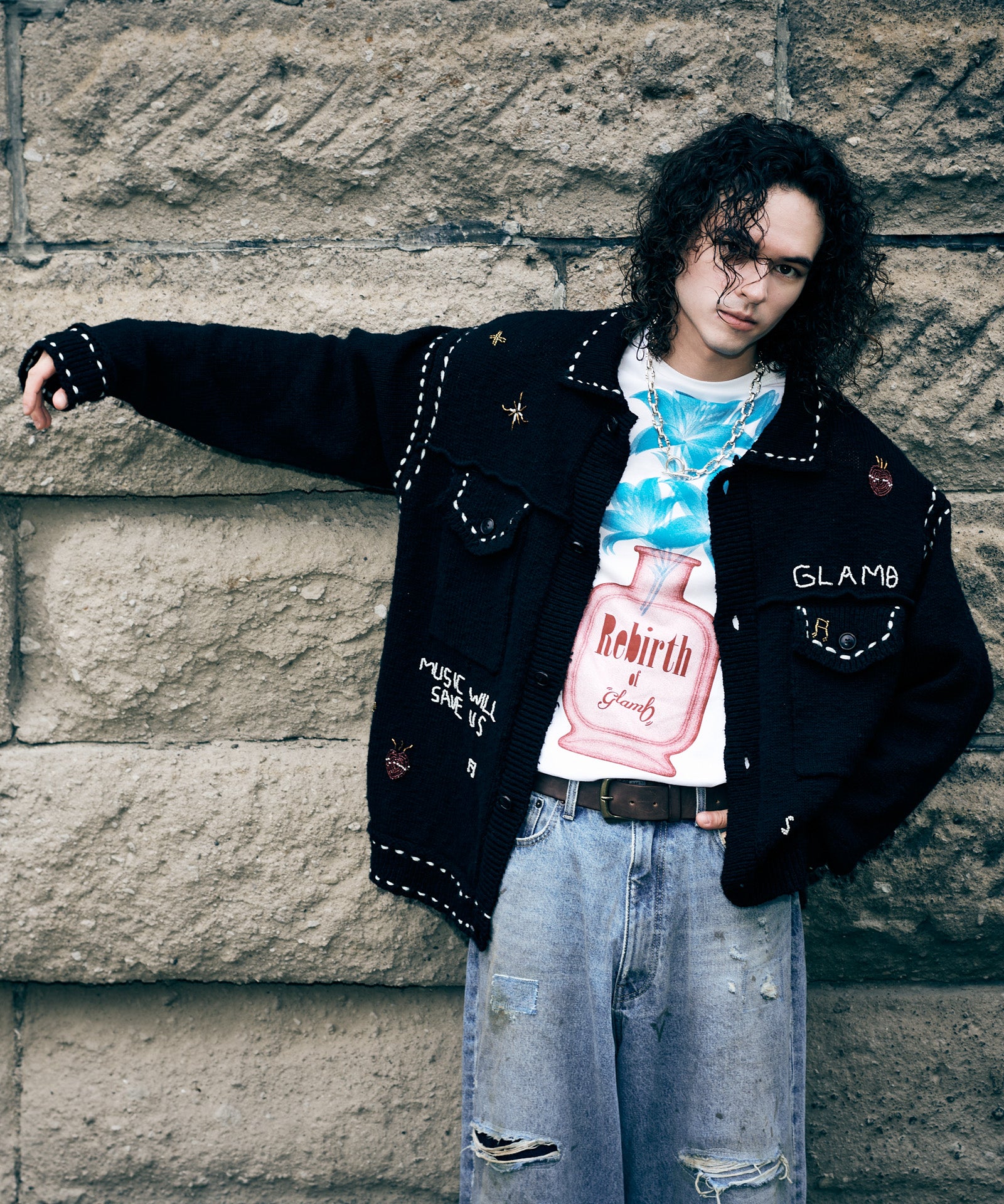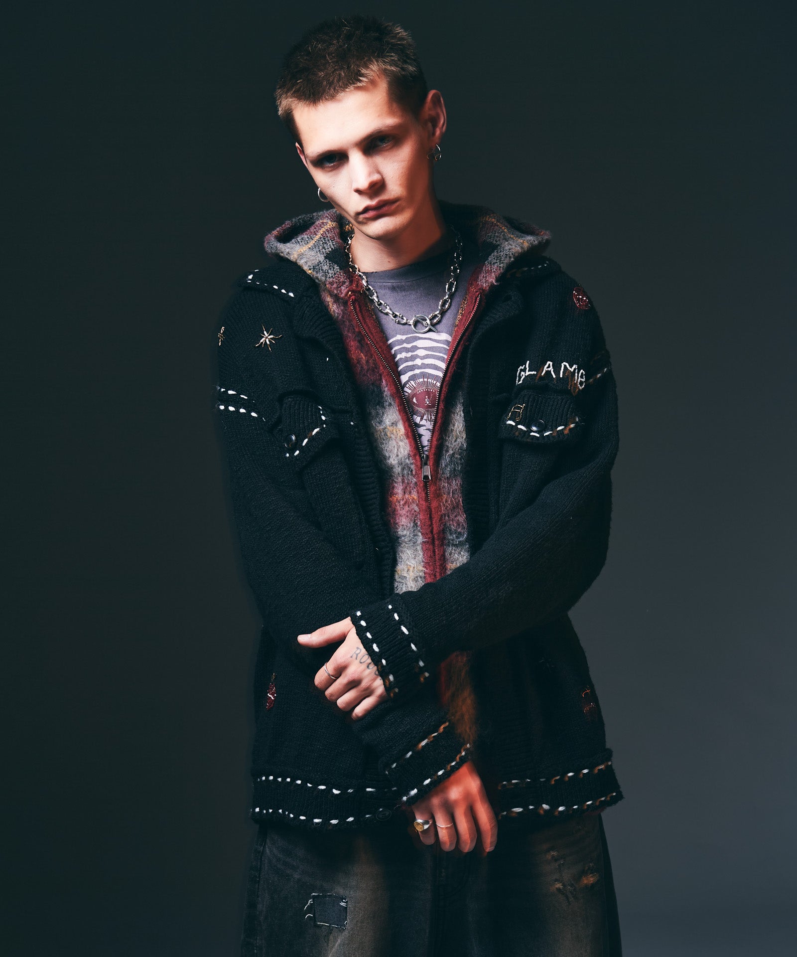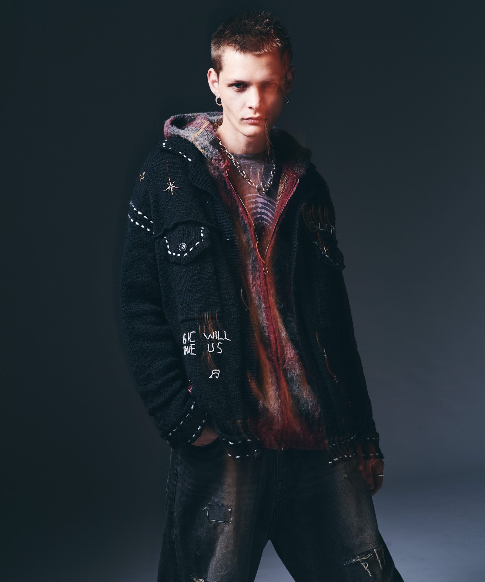 ノスタルジックなニット仕立てのジャケットへ、クラフトマンシップ息づく手刺繍で音楽愛を散りばめたBeadswork Knit Jacket。要所へあしらわれた太めのステッチは70’sヴィンテージ的な佇まい。その身頃全体にあしらわれたメッセージやアイコンのビーズ柄も全て職人の手仕事によるものとなっています。身頃の編み糸にはスラブ糸を用いて全体のテクスチャにランダムな凹凸を演出。細部のディテールに関してもフラップや衿は総針編み、ヨークを模した胸元のラインは生地を摘まんで縫い付けるというニットらしい技法で再現しております。
