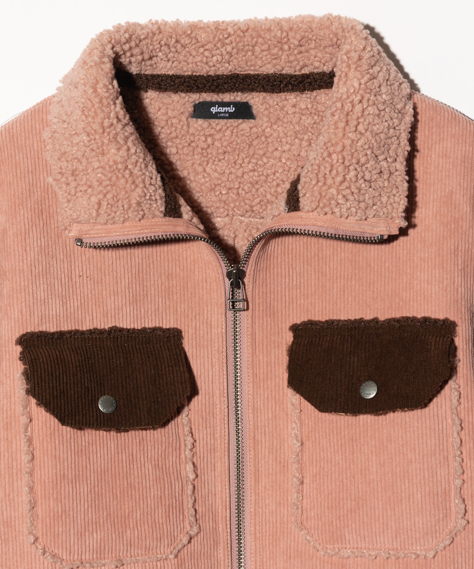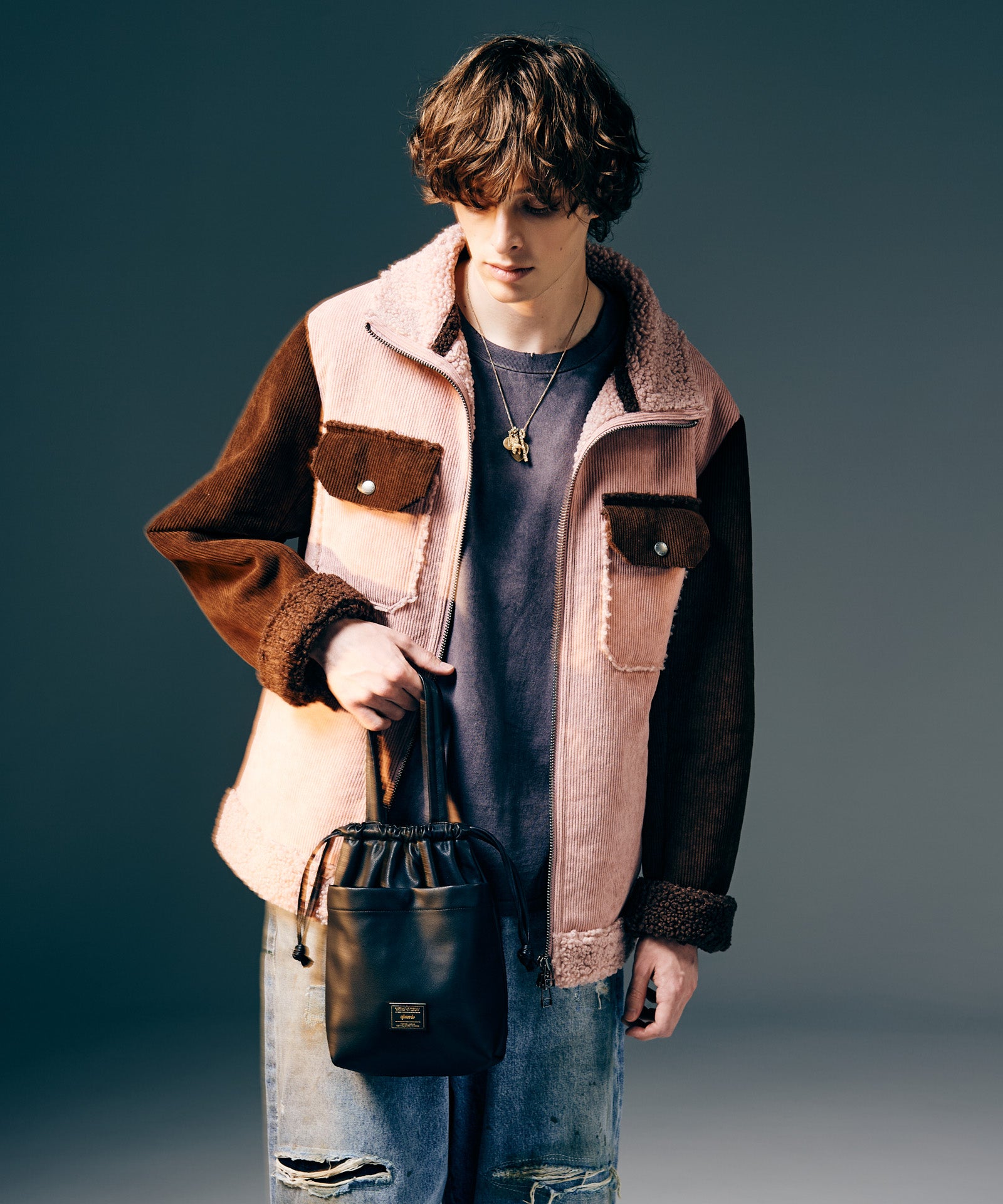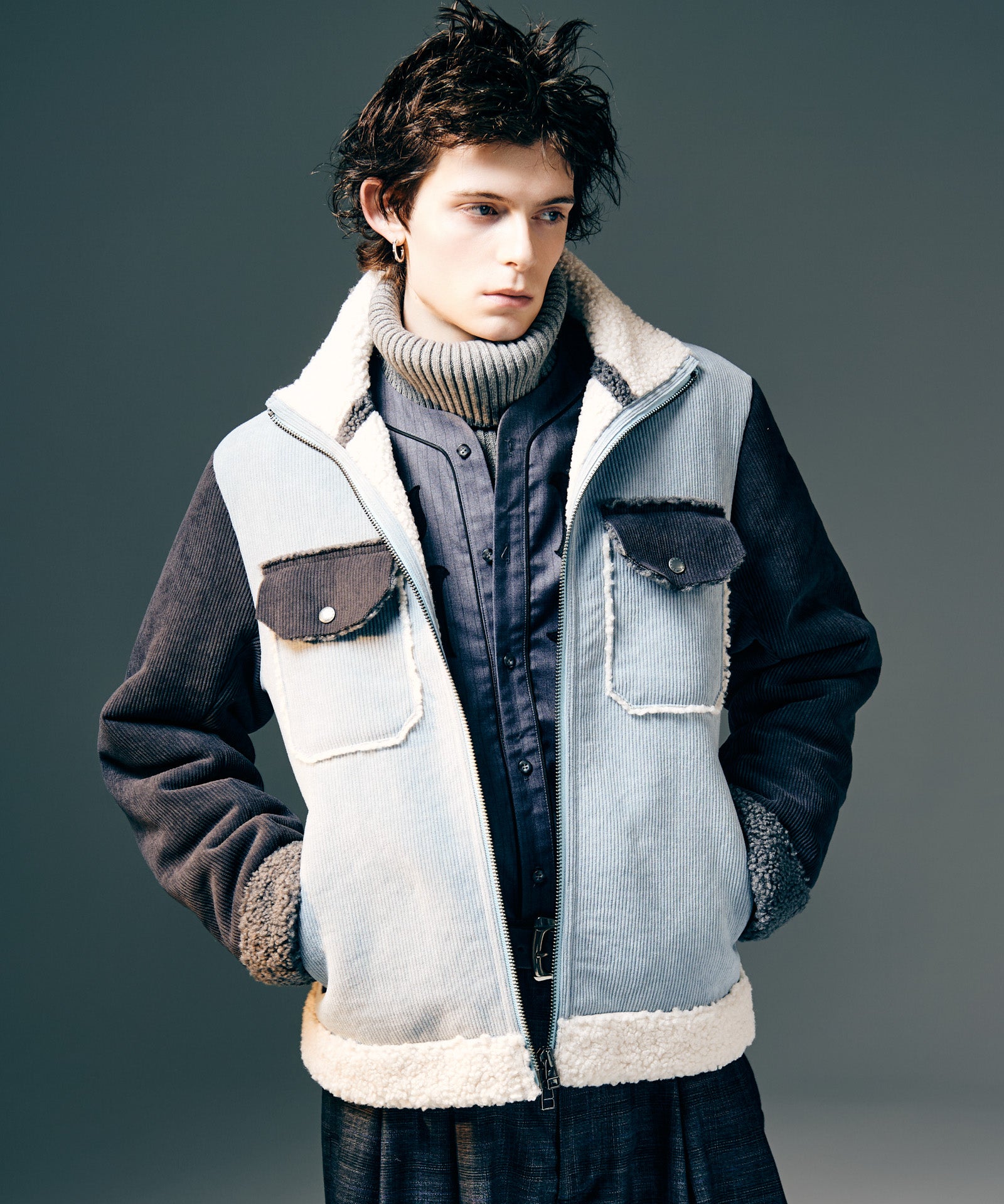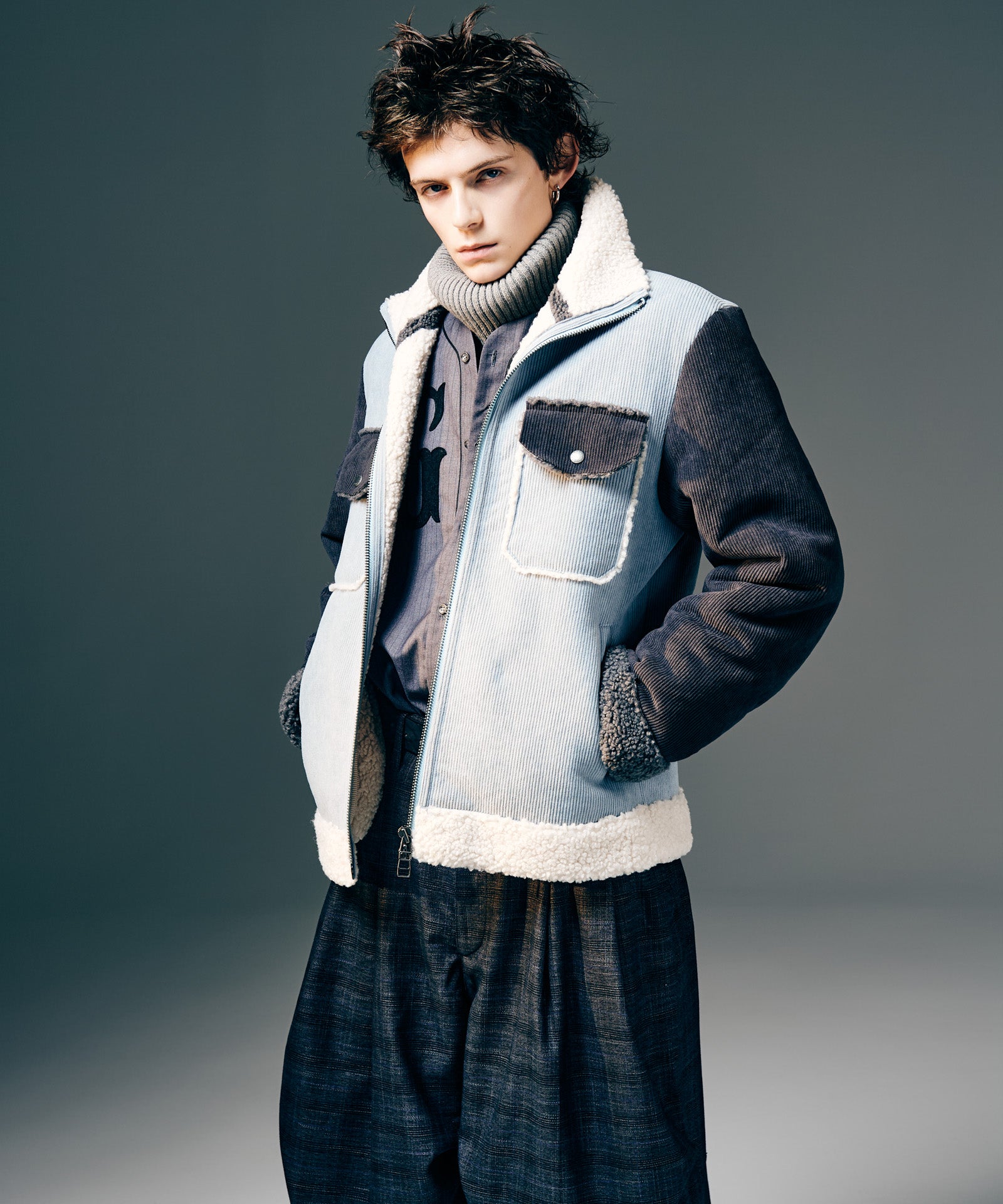 アメリカ西部カウボーイの装いを起源とするランチジャケットを、巧みな素材使いによってイージーな1着へと仕立て上げたHigh Neck Corduroy Ranch Jacket。ムートン生地が主流となる同ジャケットに対し、glambはコーデュロイ生地とボア生地をボンディングした独自のテキスタイル使いでアプローチ。首元はカットオフしたままでムートンライクなムードを演出、着心地と取り回しの良さはワークウェアを踏襲したフランクなものに仕上げています。シルエットはコンパクトな着丈とタイトな身頃を掛け合わせたジャストフィッティングに設定。首元はハイネックのスタンドカラーにまとめることで、構築的なデザイン性と寒冷への対応性もプラスしています。3色のカラーバリエーションはそれぞれ個性の異なる色使いに。モノトーンのBlackに加え、配色を施したBlueとPinkもラインナップします。