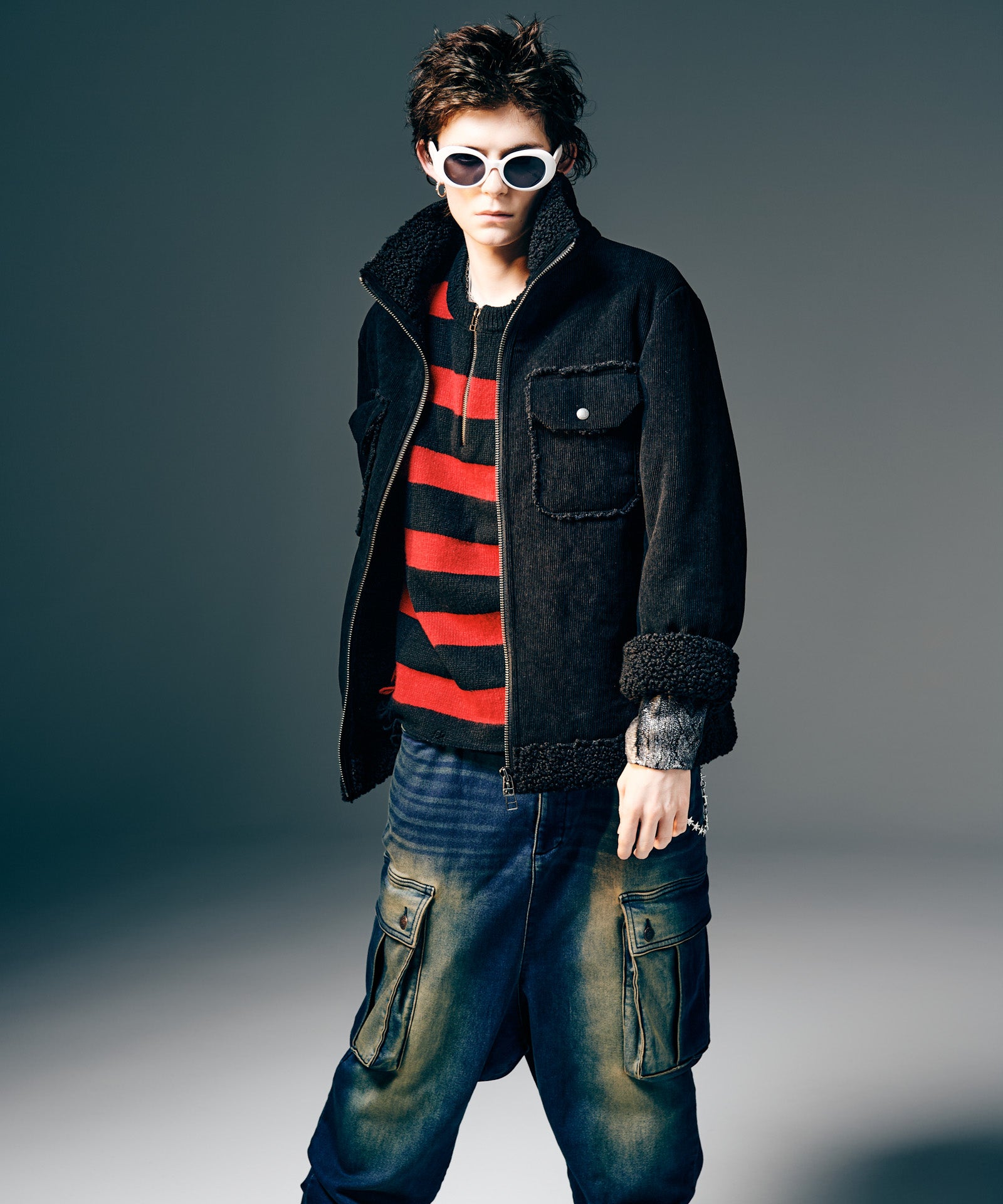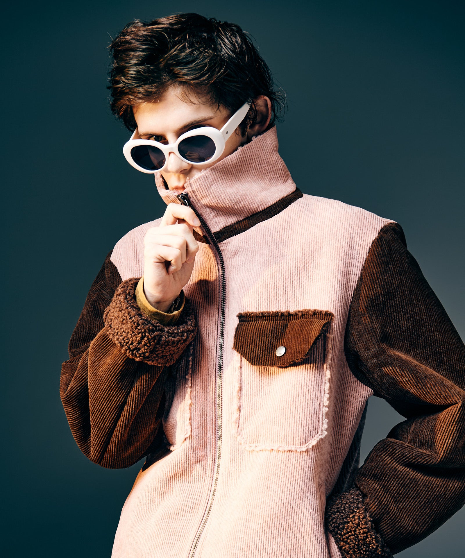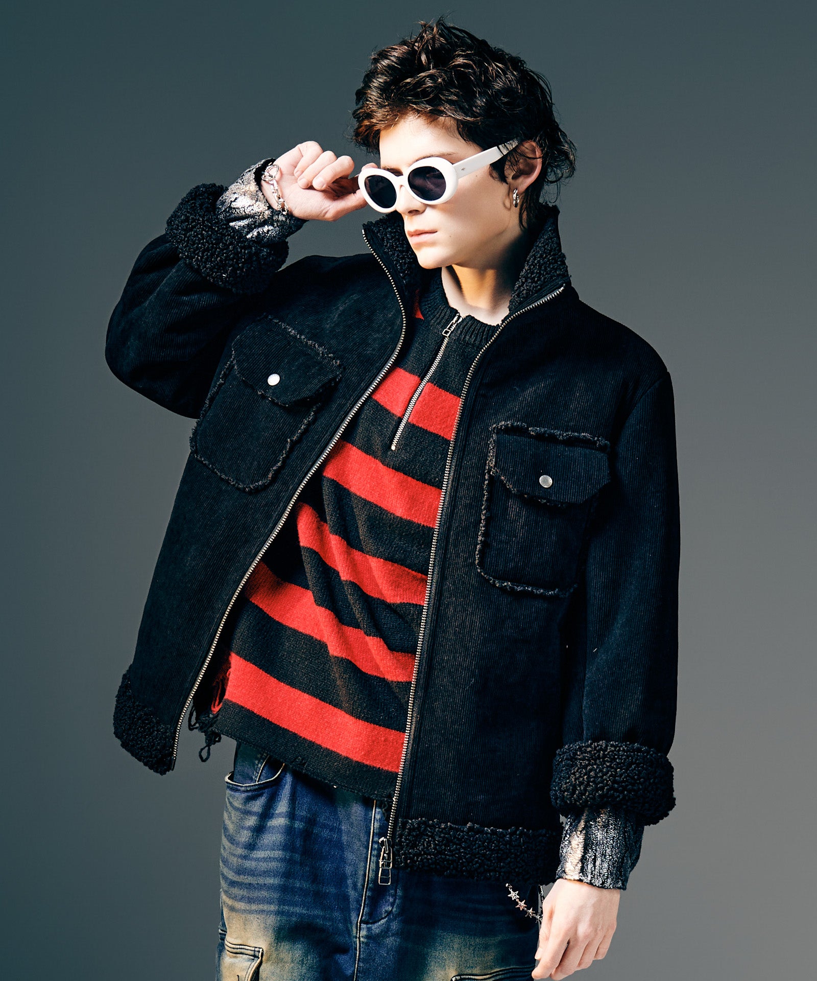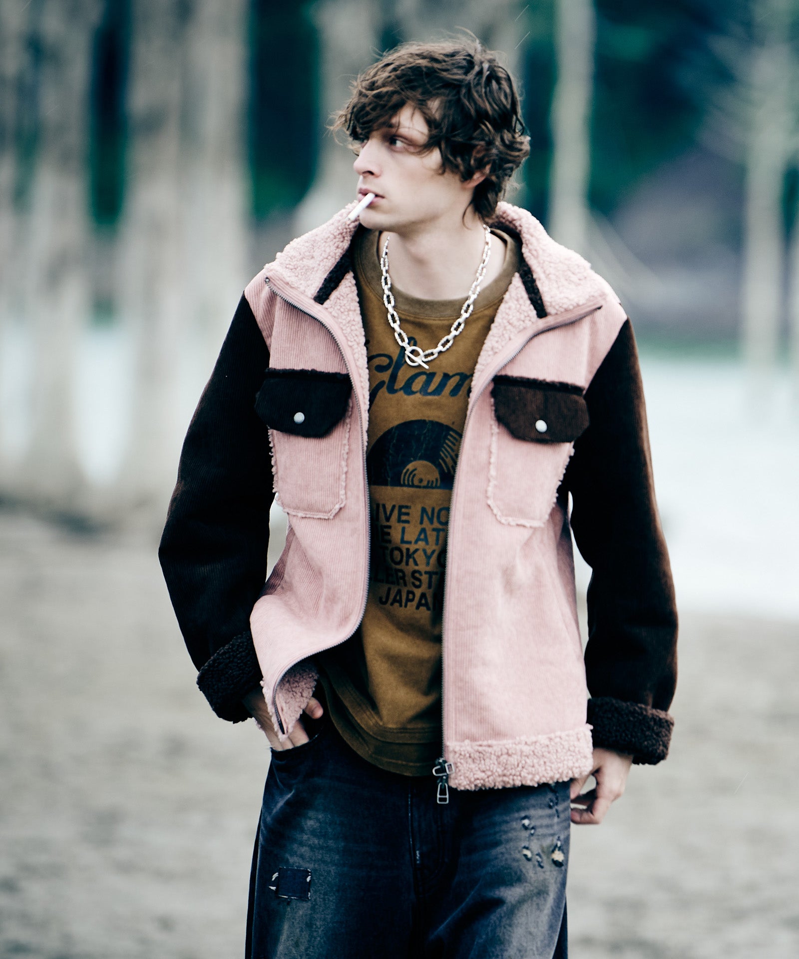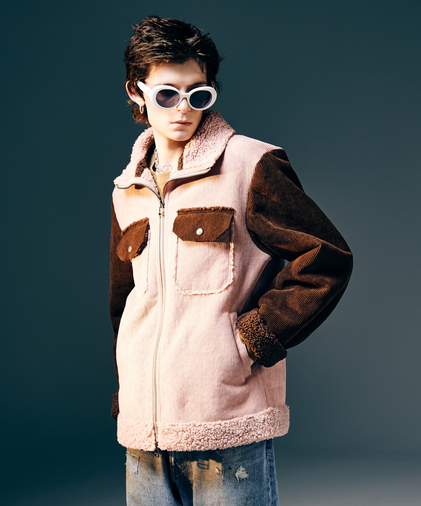 アメリカ西部カウボーイの装いを起源とするランチジャケットを、巧みな素材使いによってイージーな1着へと仕立て上げたHigh Neck Corduroy Ranch Jacket。ムートン生地が主流となる同ジャケットに対し、glambはコーデュロイ生地とボア生地をボンディングした独自のテキスタイル使いでアプローチ。首元はカットオフしたままでムートンライクなムードを演出、着心地と取り回しの良さはワークウェアを踏襲したフランクなものに仕上げています。シルエットはコンパクトな着丈とタイトな身頃を掛け合わせたジャストフィッティングに設定。首元はハイネックのスタンドカラーにまとめることで、構築的なデザイン性と寒冷への対応性もプラスしています。3色のカラーバリエーションはそれぞれ個性の異なる色使いに。モノトーンのBlackに加え、配色を施したBlueとPinkもラインナップします。