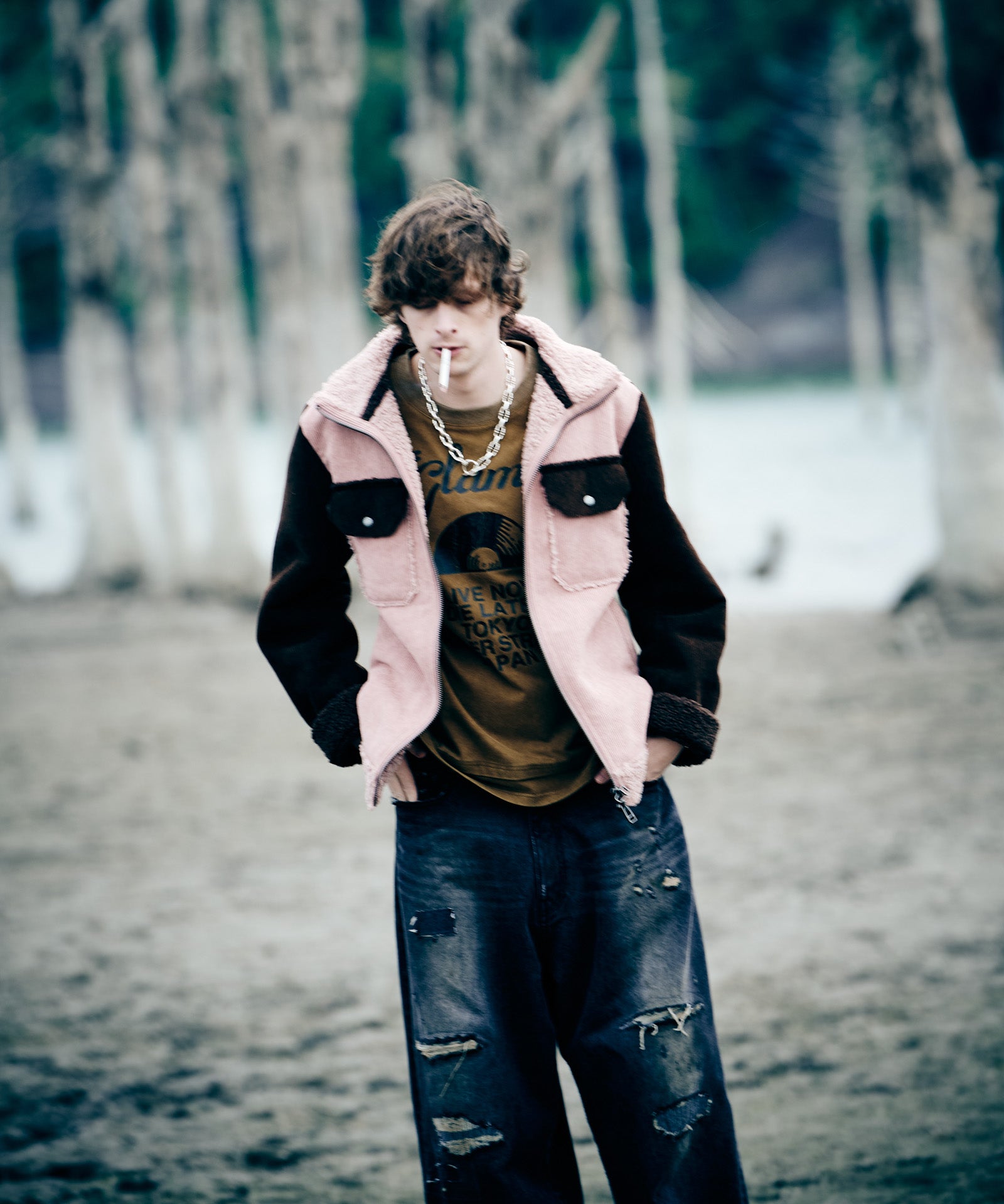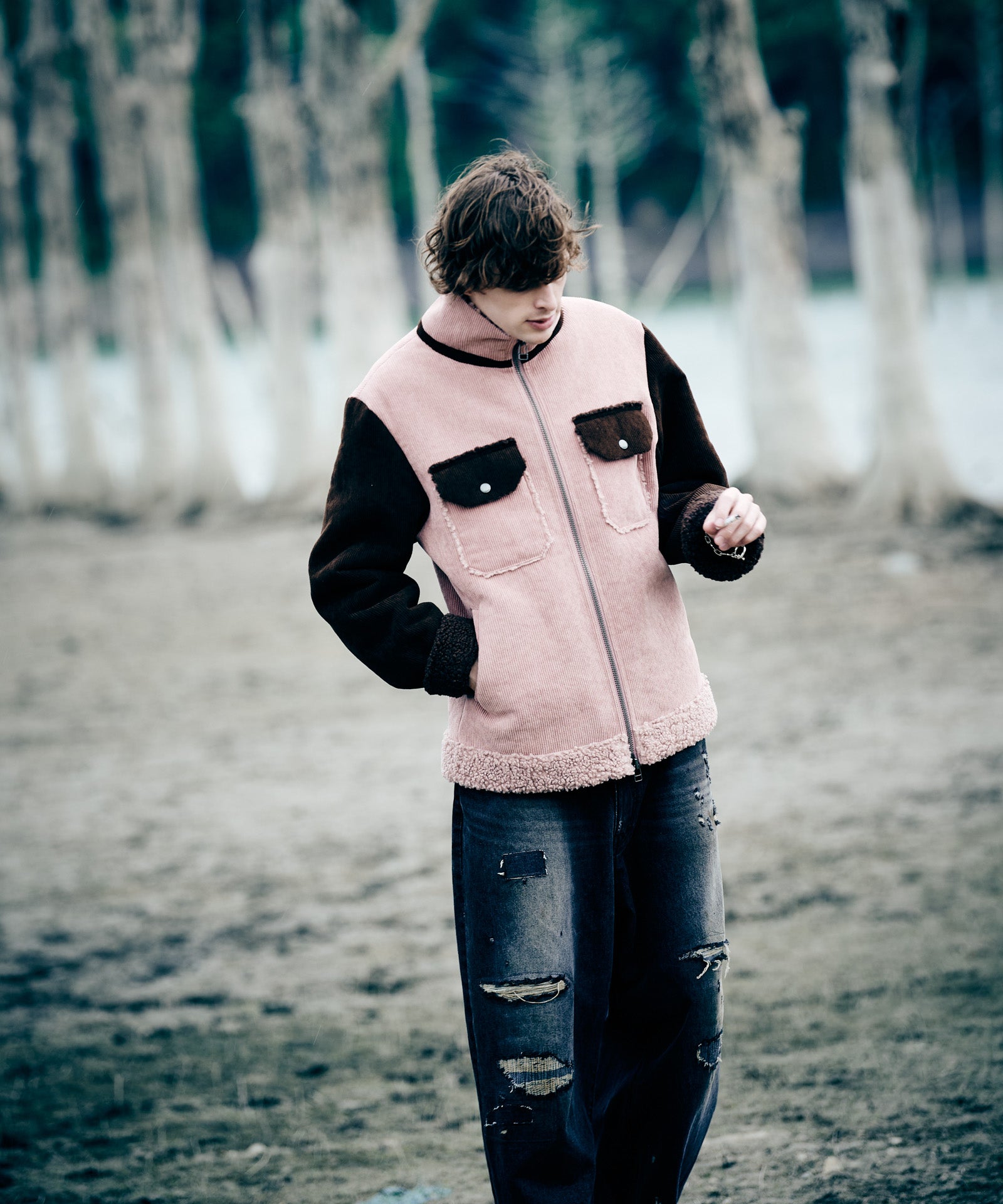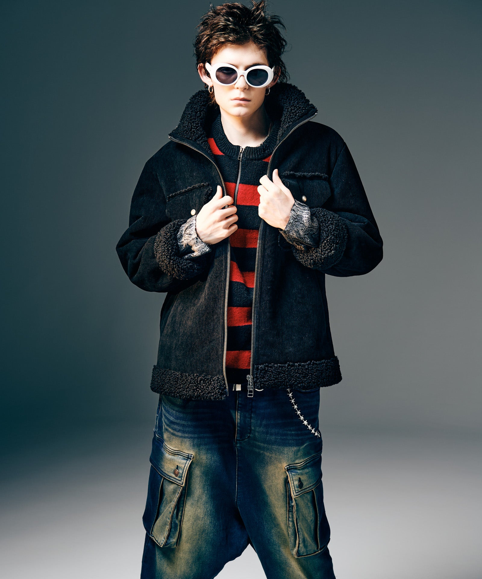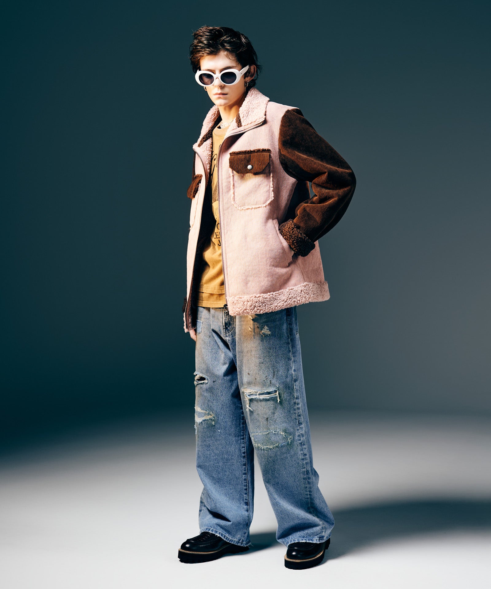 アメリカ西部カウボーイの装いを起源とするランチジャケットを、巧みな素材使いによってイージーな1着へと仕立て上げたHigh Neck Corduroy Ranch Jacket。ムートン生地が主流となる同ジャケットに対し、glambはコーデュロイ生地とボア生地をボンディングした独自のテキスタイル使いでアプローチ。首元はカットオフしたままでムートンライクなムードを演出、着心地と取り回しの良さはワークウェアを踏襲したフランクなものに仕上げています。シルエットはコンパクトな着丈とタイトな身頃を掛け合わせたジャストフィッティングに設定。首元はハイネックのスタンドカラーにまとめることで、構築的なデザイン性と寒冷への対応性もプラスしています。3色のカラーバリエーションはそれぞれ個性の異なる色使いに。モノトーンのBlackに加え、配色を施したBlueとPinkもラインナップします。