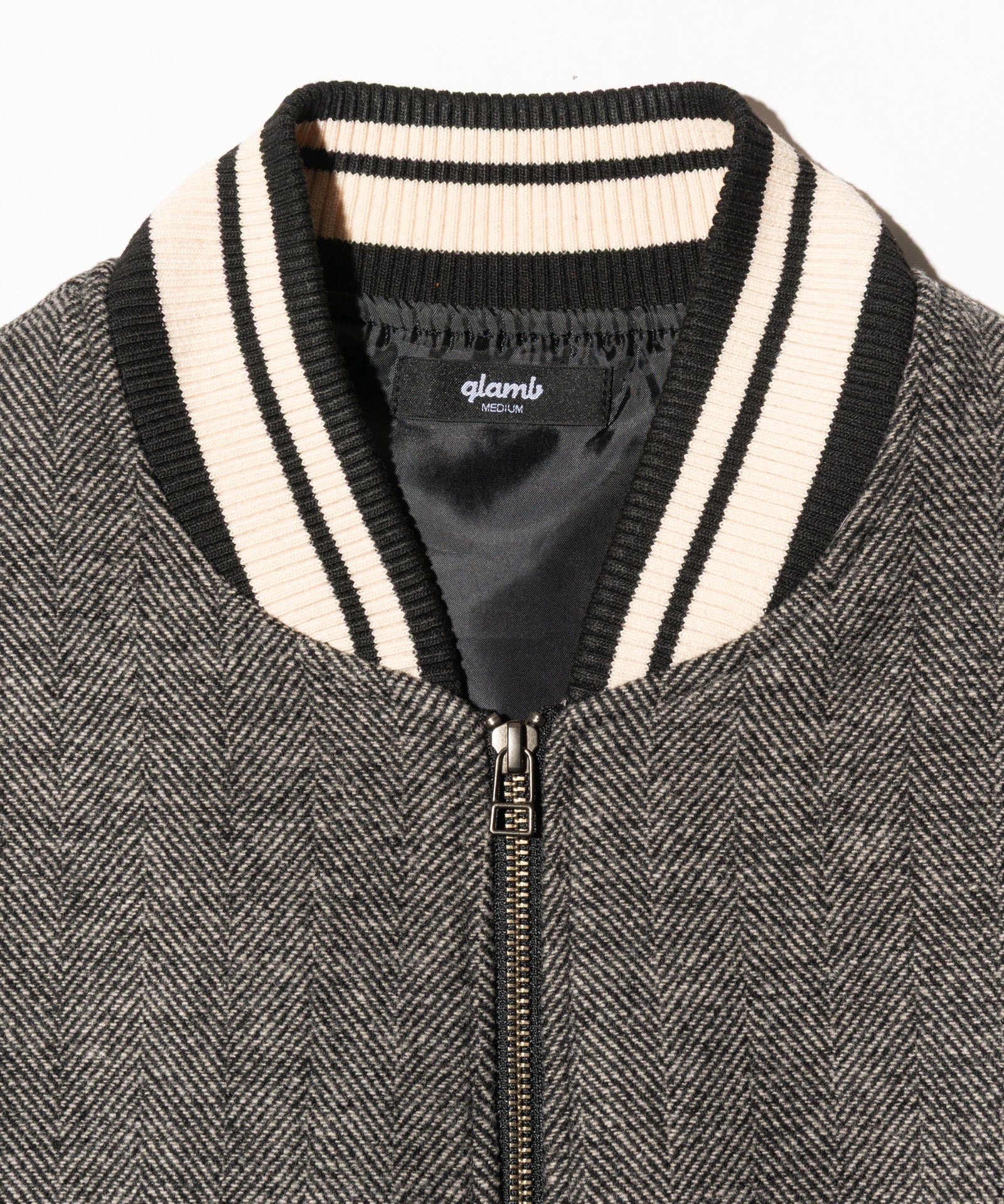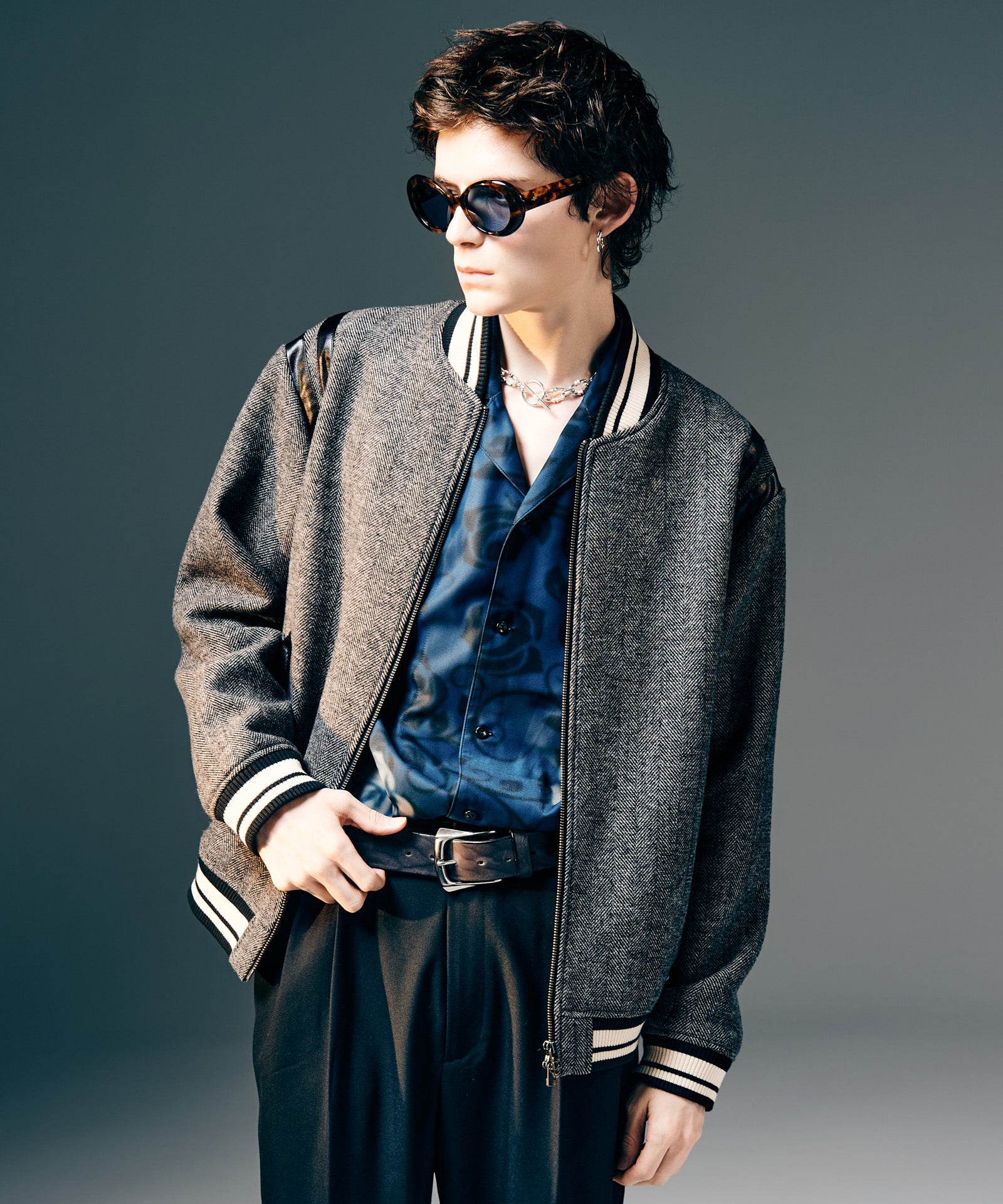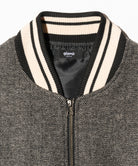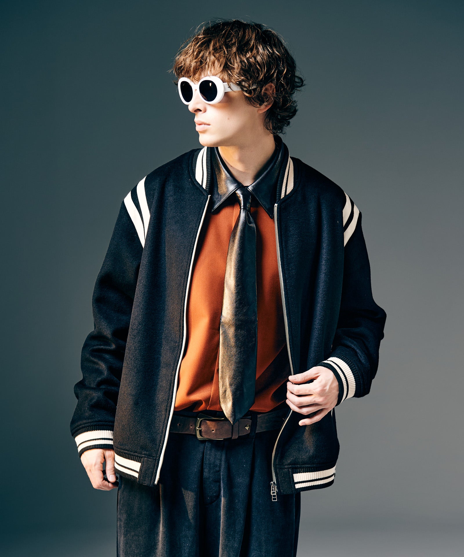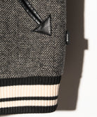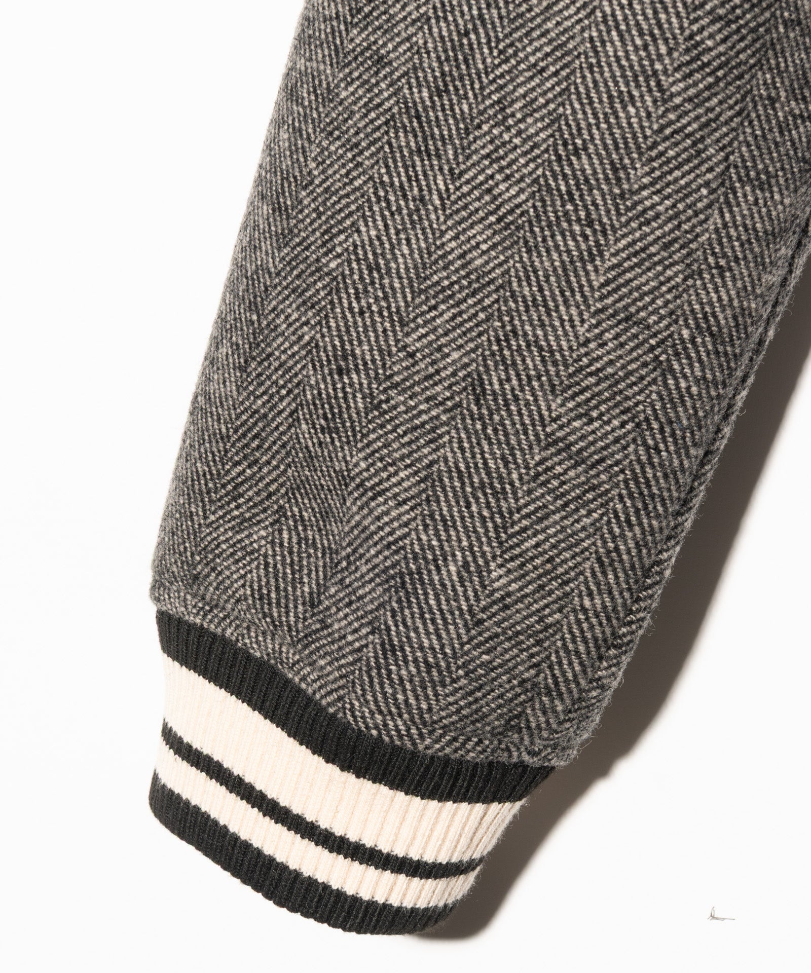 スタジアムジャンパーをコンパクトにリシェイプ、ロックマインドあるディテールを乗せて仕上げたBowler Stadium Jumper。レギュラーフィッティングのボディは着丈をショートにまとめたボックスシルエット。Blackは無地、Grayはヘリンボーンの柄違いとなりますが、いずれも素材はウール混となり繊細で風合い豊かなテクスチャをお楽しみいただけます。さらにブランドらしいエッセンスを込めたのがボウリングシャツを踏襲した随所のディテール使い。バックスタイルにはブランドロゴを刺繍、肩口にはシンセティックレザーを使用した切り替えを施してロックンロールのムードを与えています。