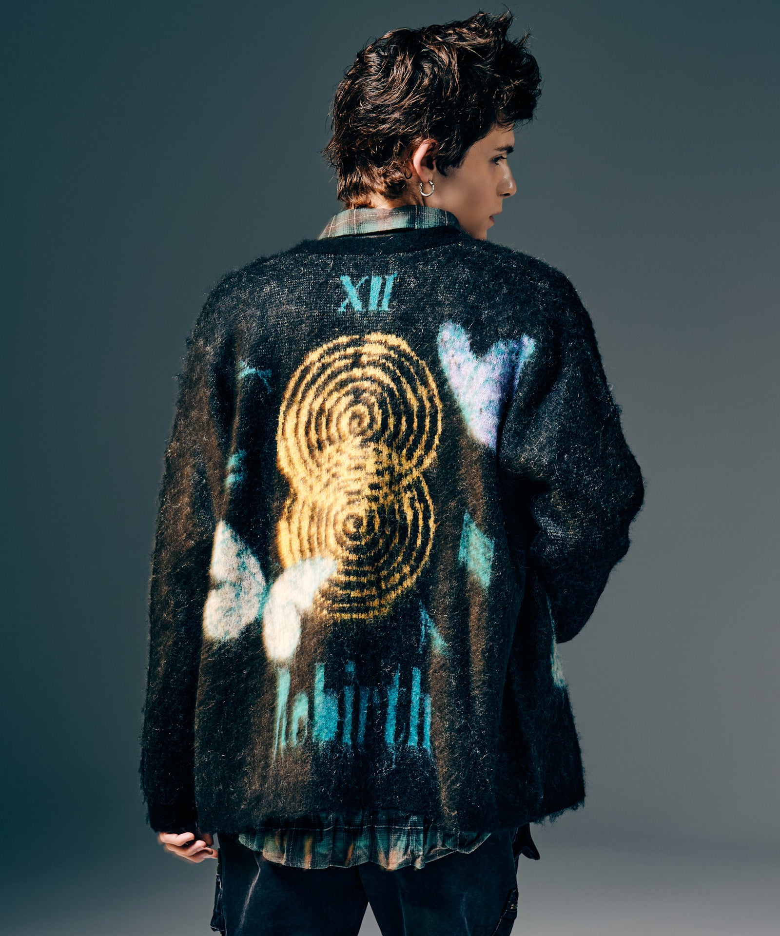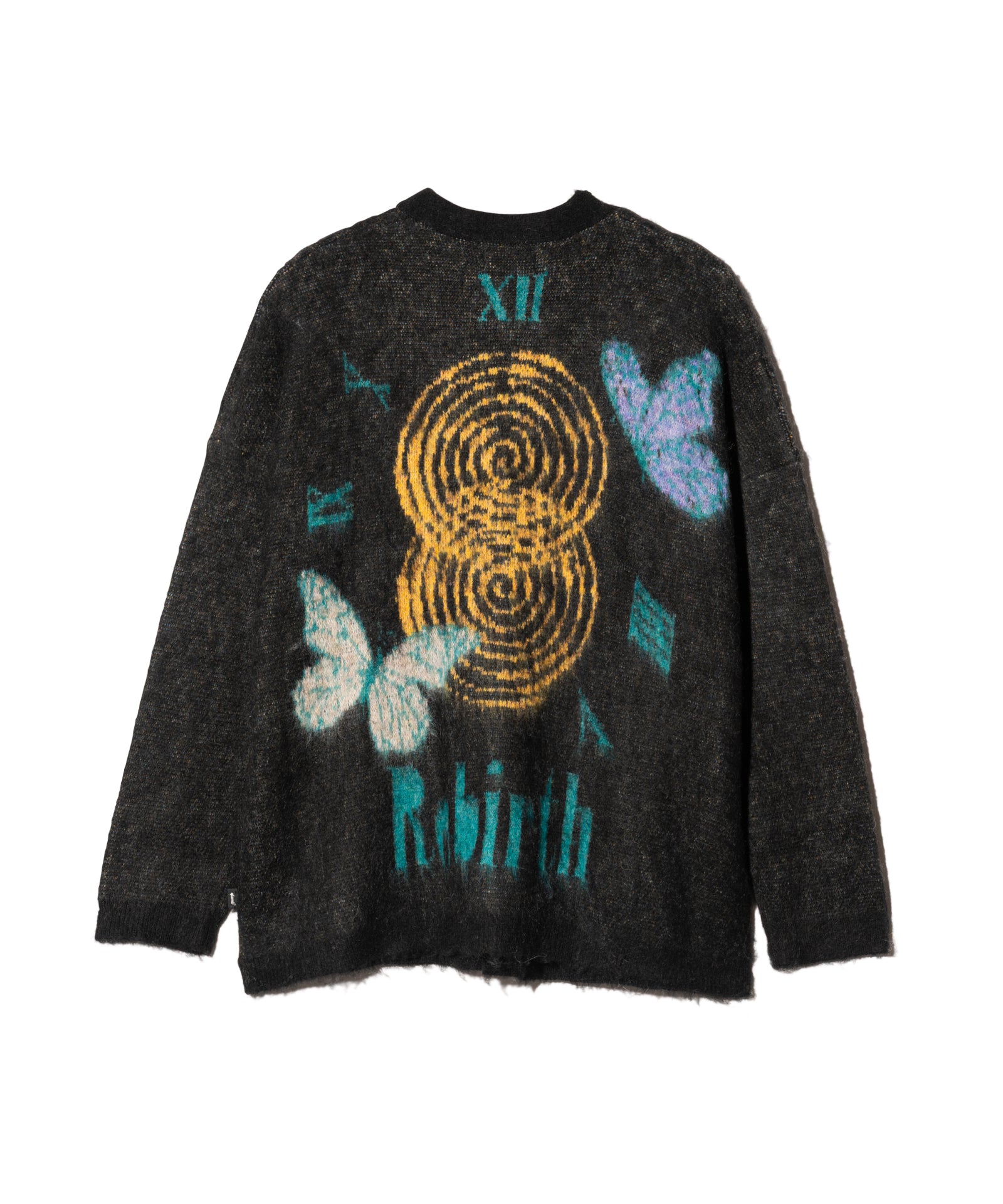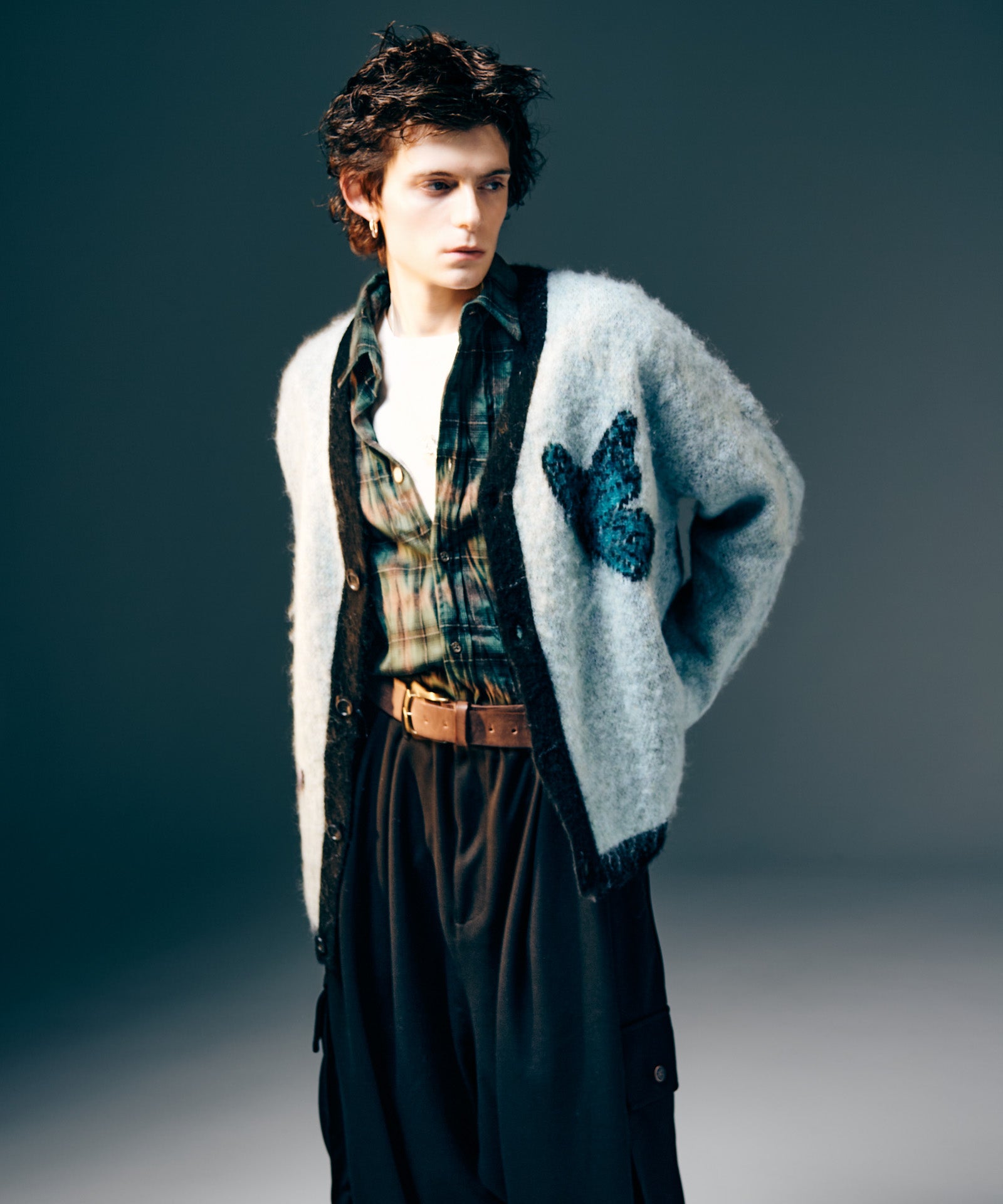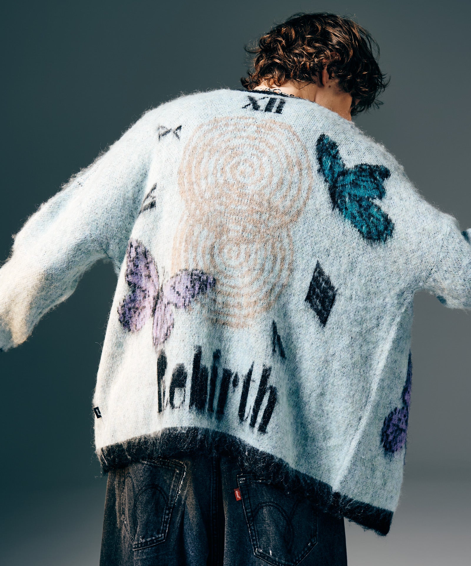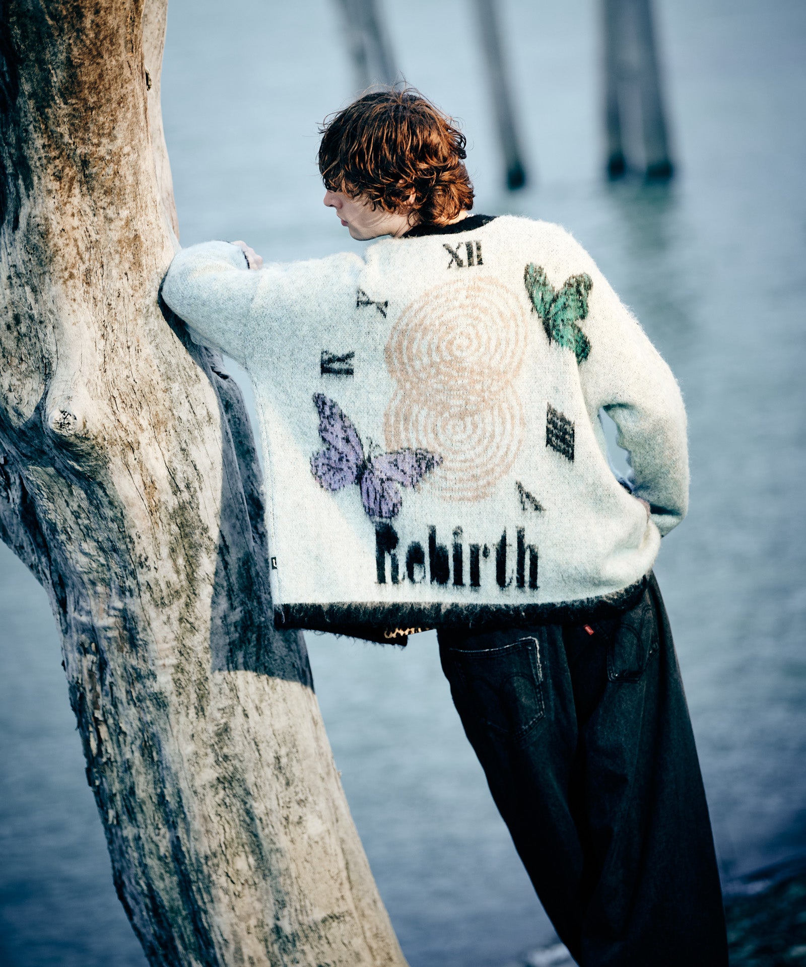今季のコレクションテーマとなる“Rebirth”の世界観をグランジカーディガンの中に描き出したRebirth Cardigan。毛羽立ちある毛糸を用いて編み上げたボディは、完成後にさらに起毛加工を施すことでモヘアのような豊かな起毛感と柔らかな肌触りを両立。“再生”をイメージした時計と渦、蝶のモチーフを用いた複雑な柄使いと相まって、ミステリアスなヴィジュアルを生み出します。シルエットは身幅を広く、着丈にもゆとりを持たせたルーズなサイジング。グランジスタイルのオーセンティックを新たに描き出すという、今季のブランドのコンセプトを反映した仕上がりとなりました。