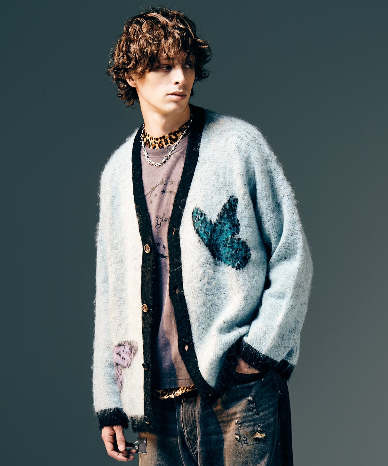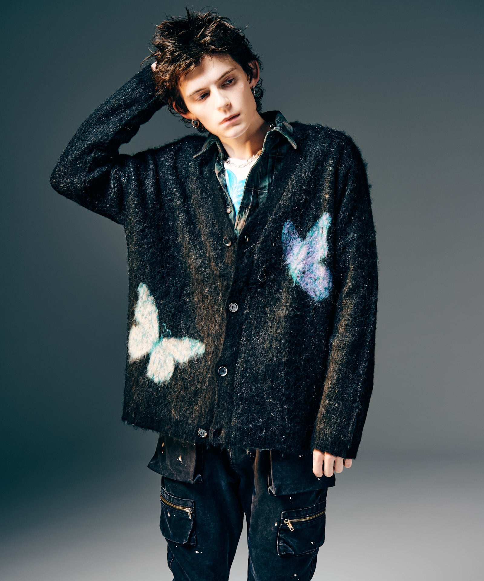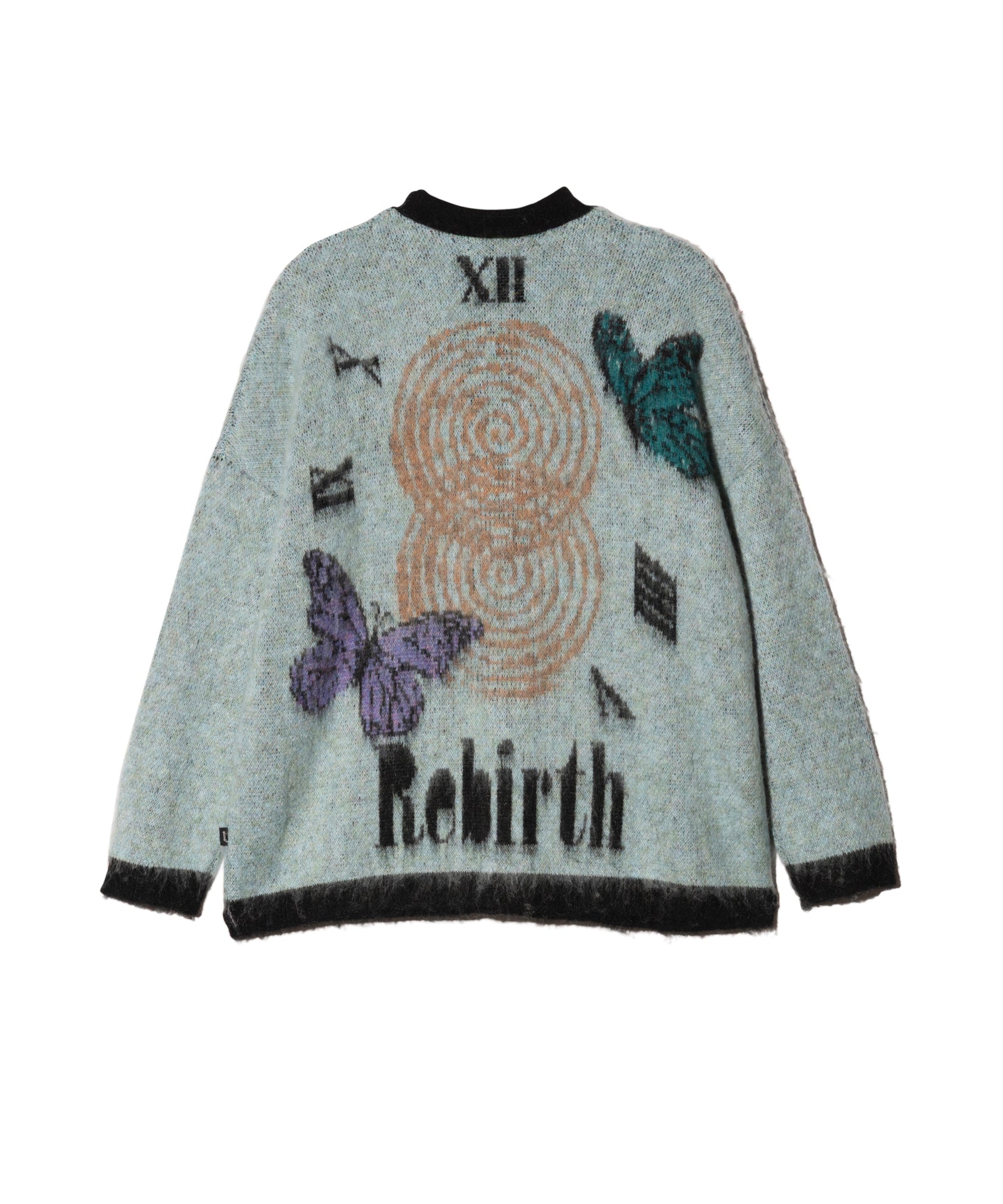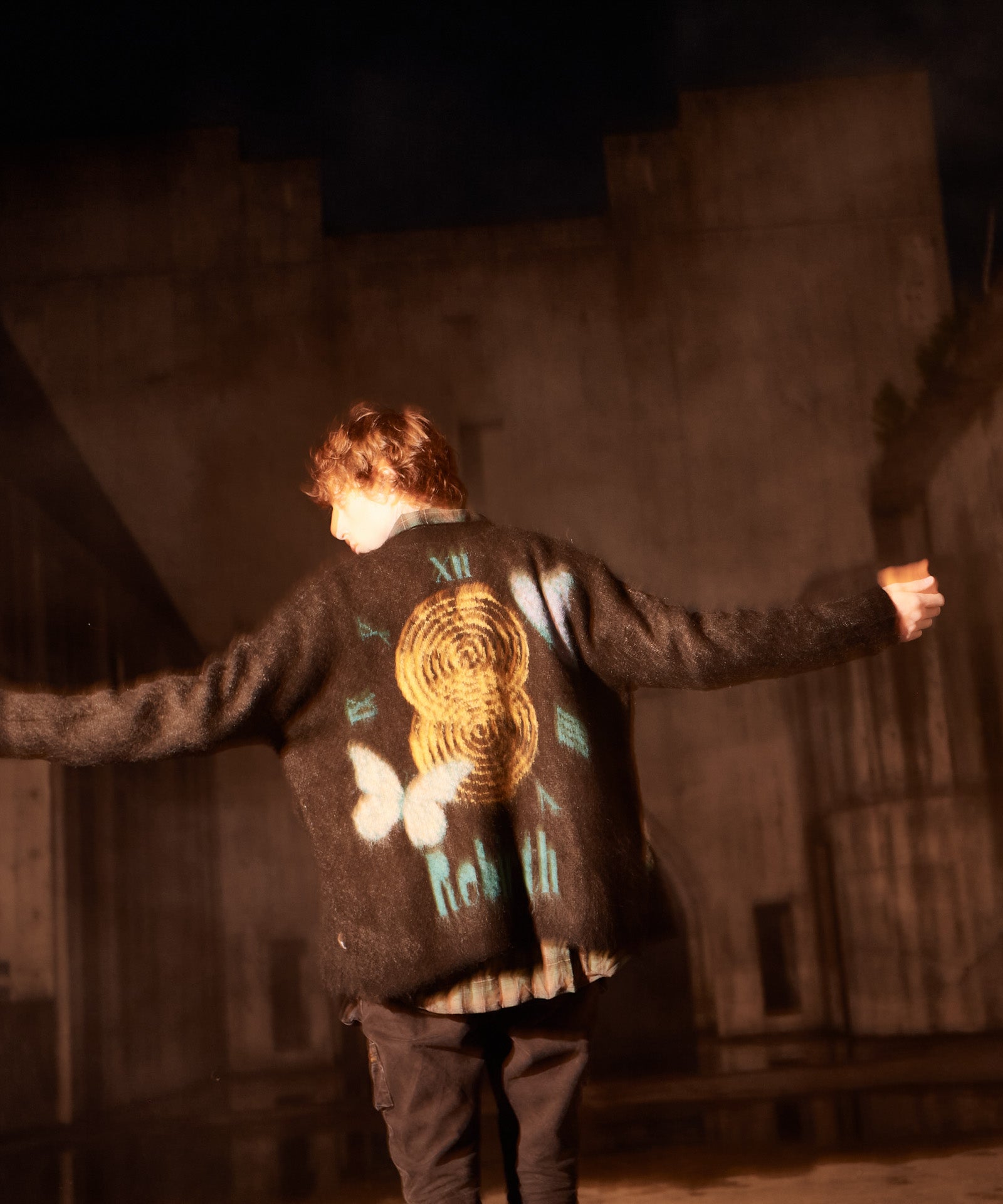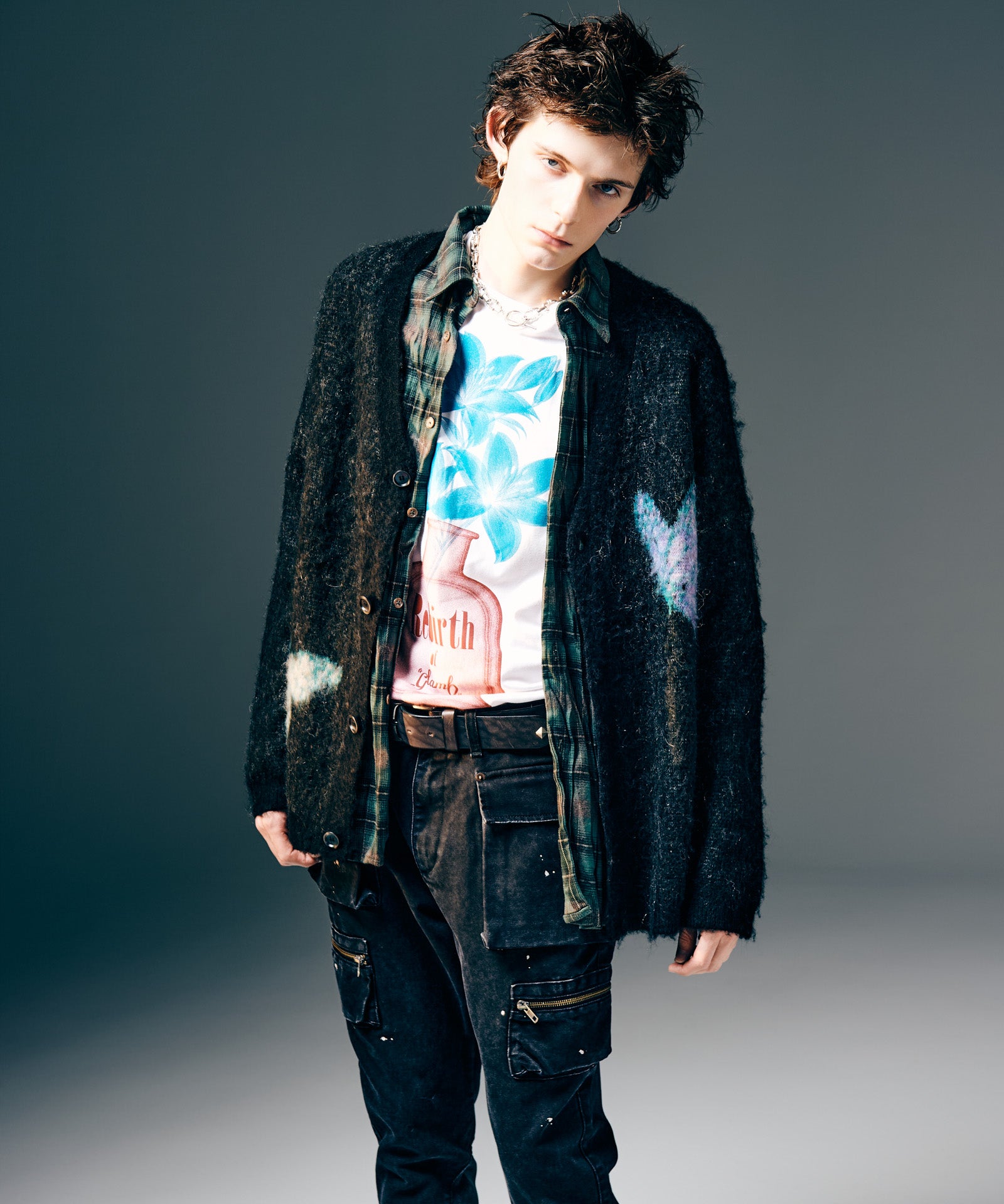今季のコレクションテーマとなる“Rebirth”の世界観をグランジカーディガンの中に描き出したRebirth Cardigan。毛羽立ちある毛糸を用いて編み上げたボディは、完成後にさらに起毛加工を施すことでモヘアのような豊かな起毛感と柔らかな肌触りを両立。“再生”をイメージした時計と渦、蝶のモチーフを用いた複雑な柄使いと相まって、ミステリアスなヴィジュアルを生み出します。シルエットは身幅を広く、着丈にもゆとりを持たせたルーズなサイジング。グランジスタイルのオーセンティックを新たに描き出すという、今季のブランドのコンセプトを反映した仕上がりとなりました。