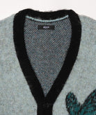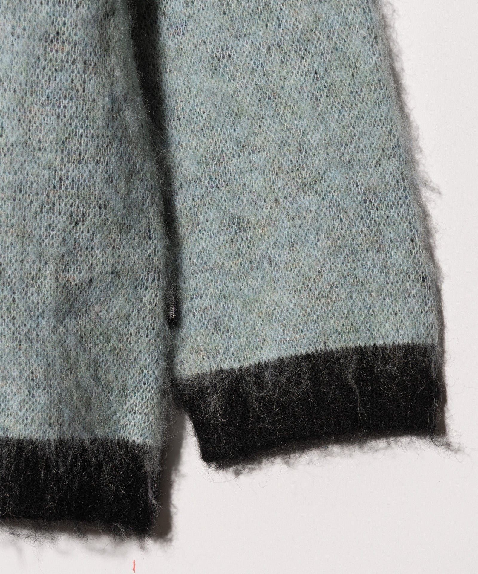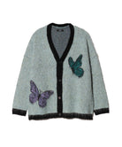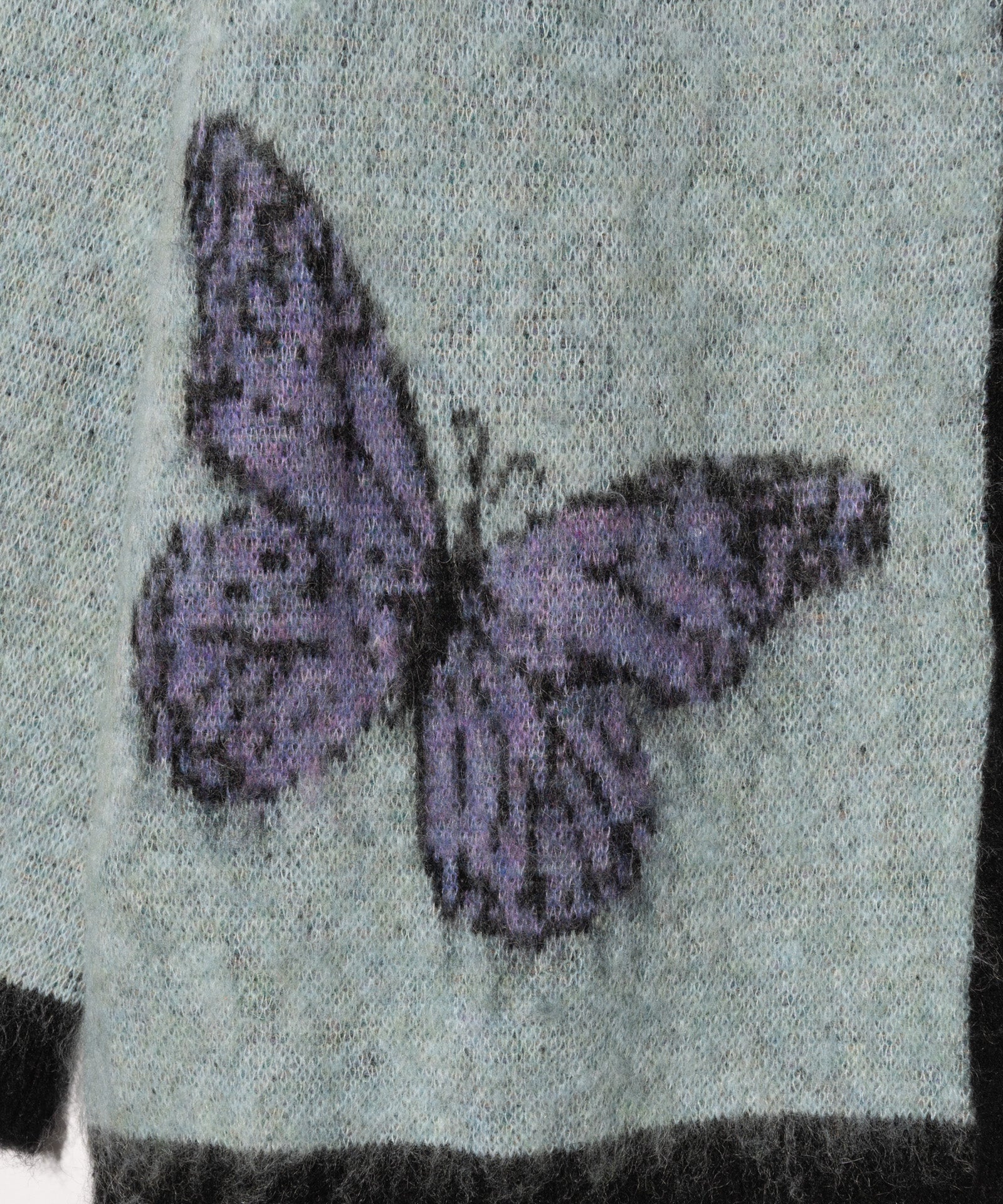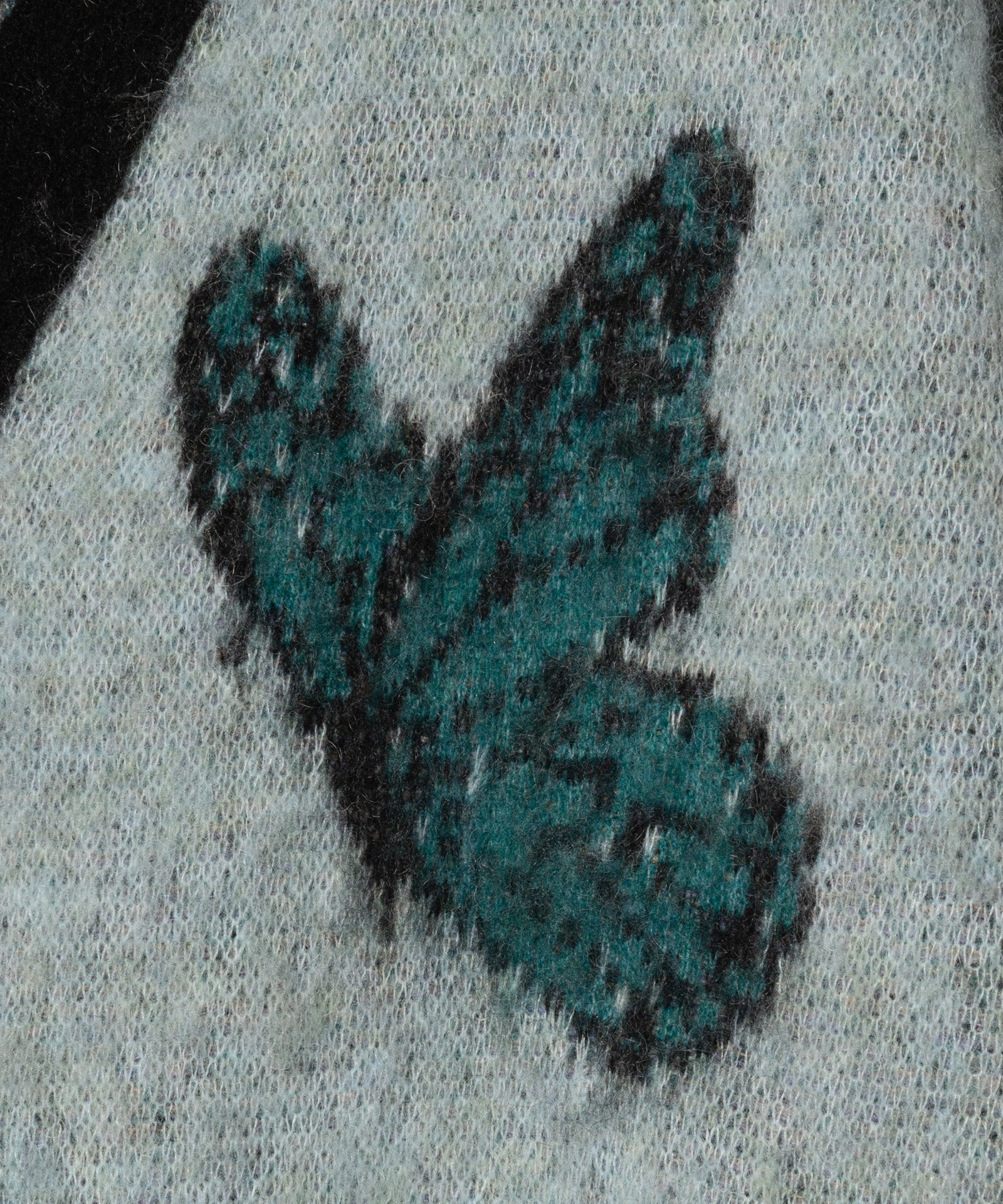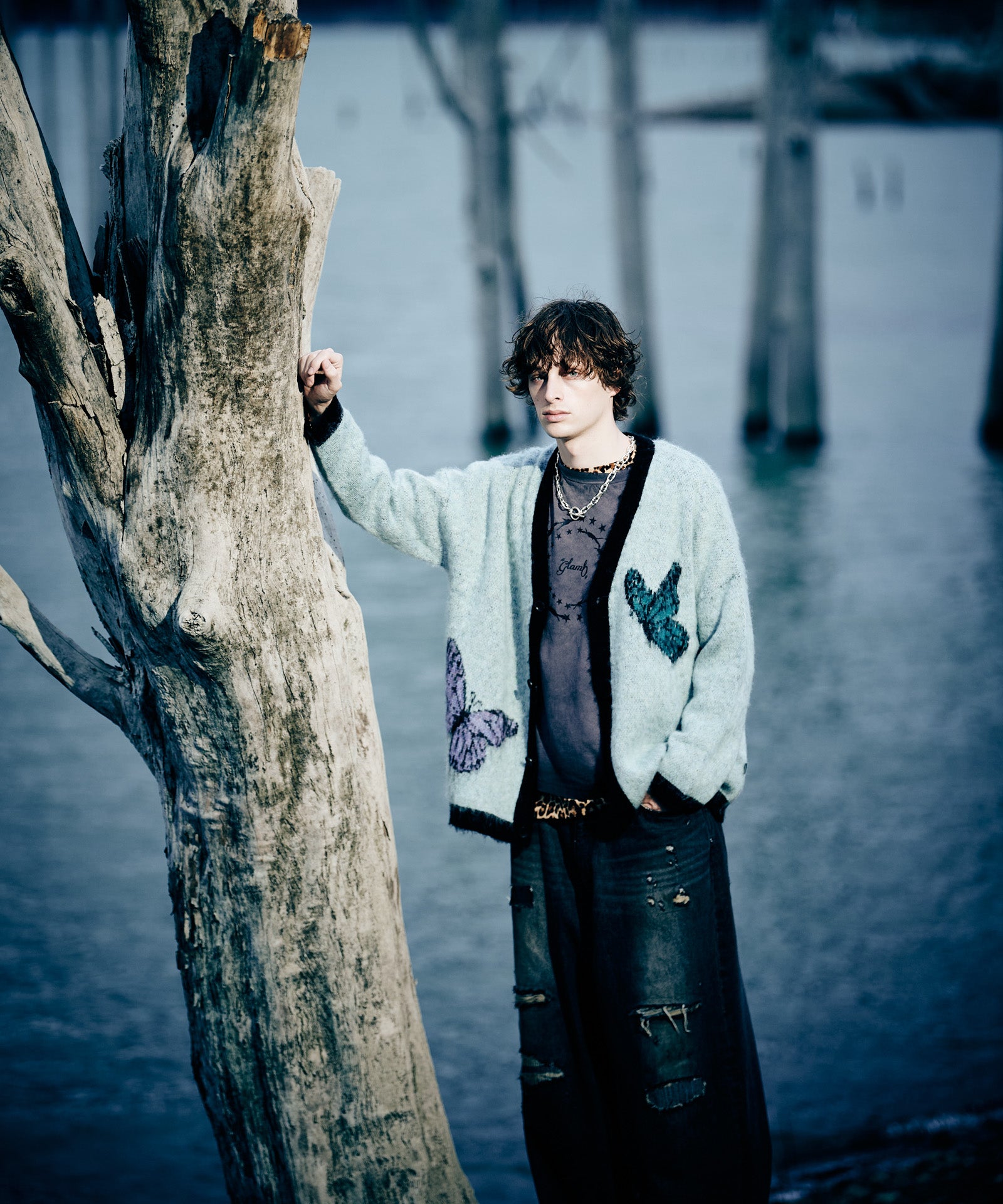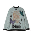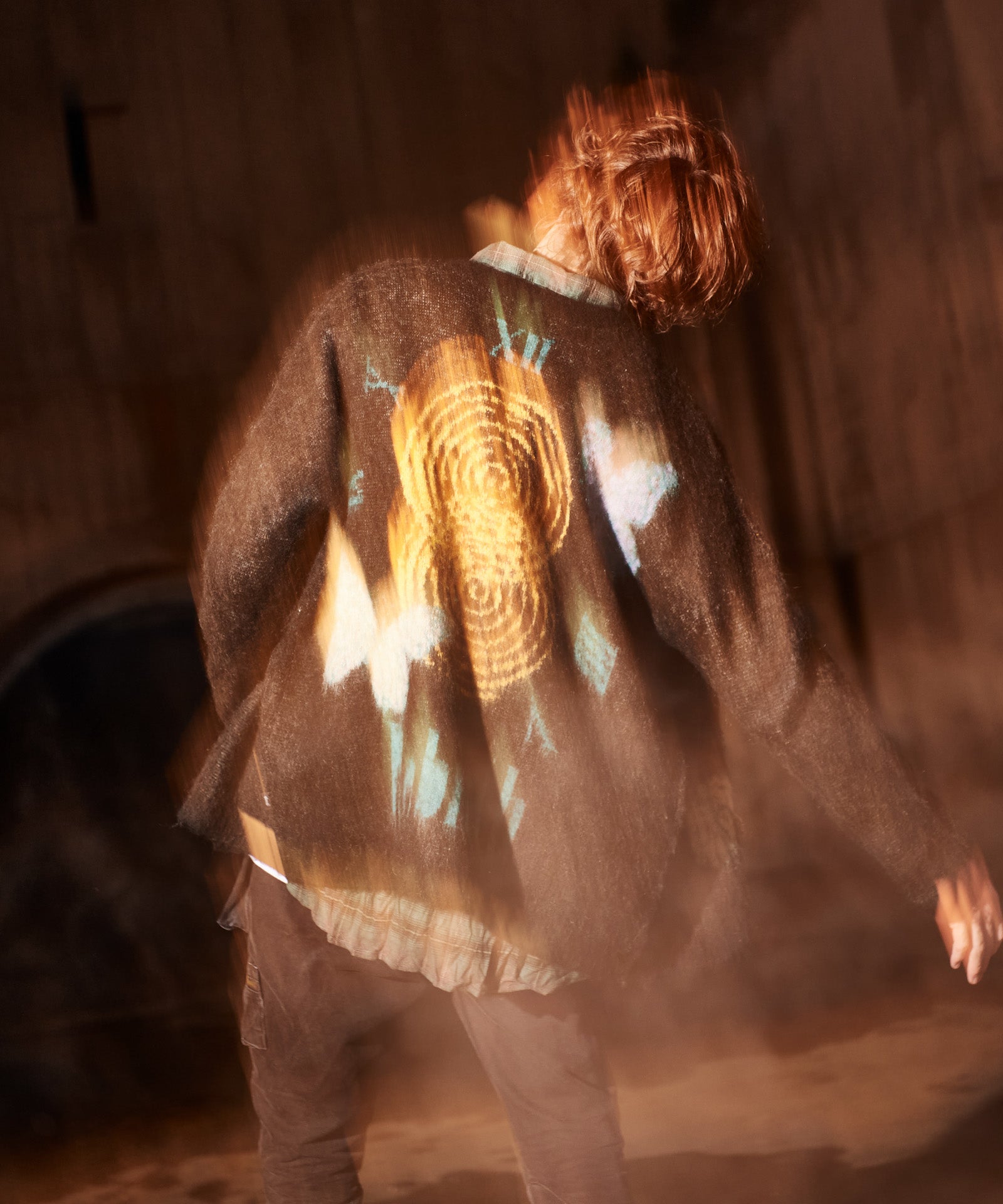 今季のコレクションテーマとなる“Rebirth”の世界観をグランジカーディガンの中に描き出したRebirth Cardigan。毛羽立ちある毛糸を用いて編み上げたボディは、完成後にさらに起毛加工を施すことでモヘアのような豊かな起毛感と柔らかな肌触りを両立。“再生”をイメージした時計と渦、蝶のモチーフを用いた複雑な柄使いと相まって、ミステリアスなヴィジュアルを生み出します。シルエットは身幅を広く、着丈にもゆとりを持たせたルーズなサイジング。グランジスタイルのオーセンティックを新たに描き出すという、今季のブランドのコンセプトを反映した仕上がりとなりました。