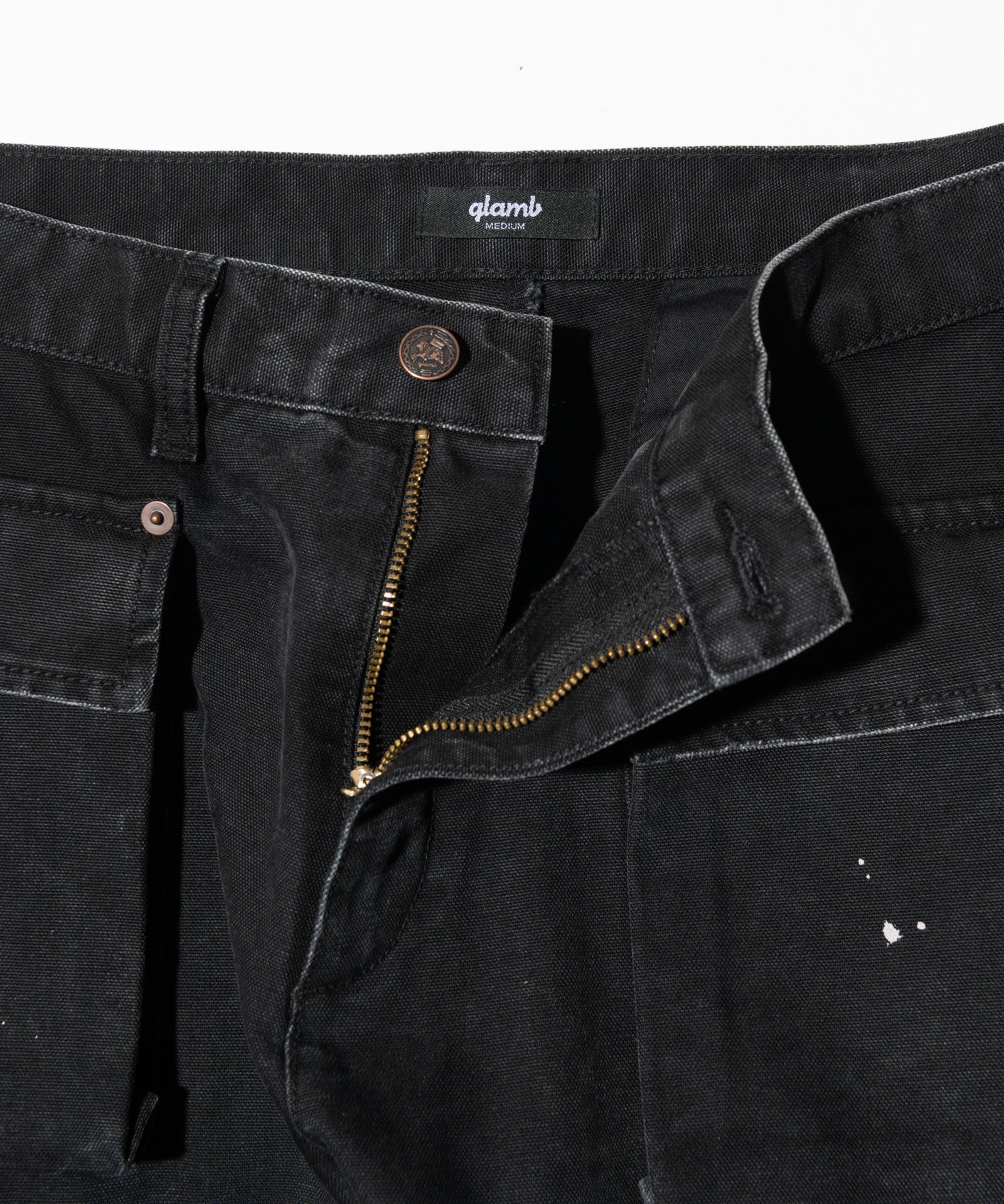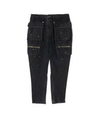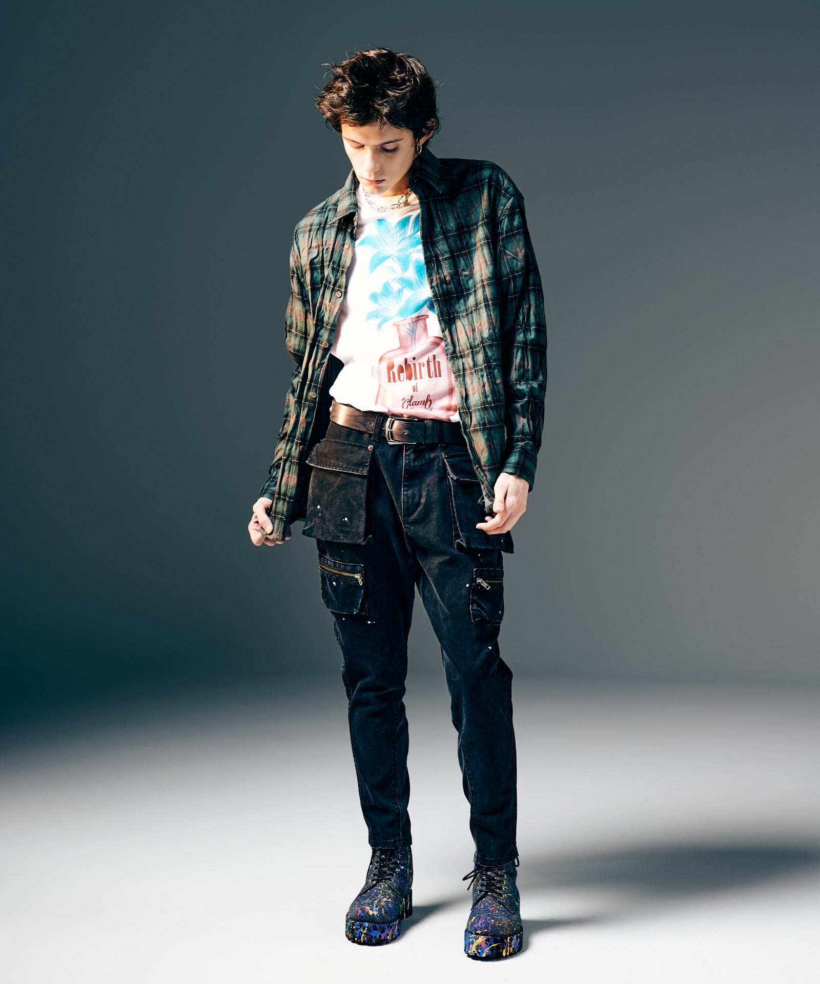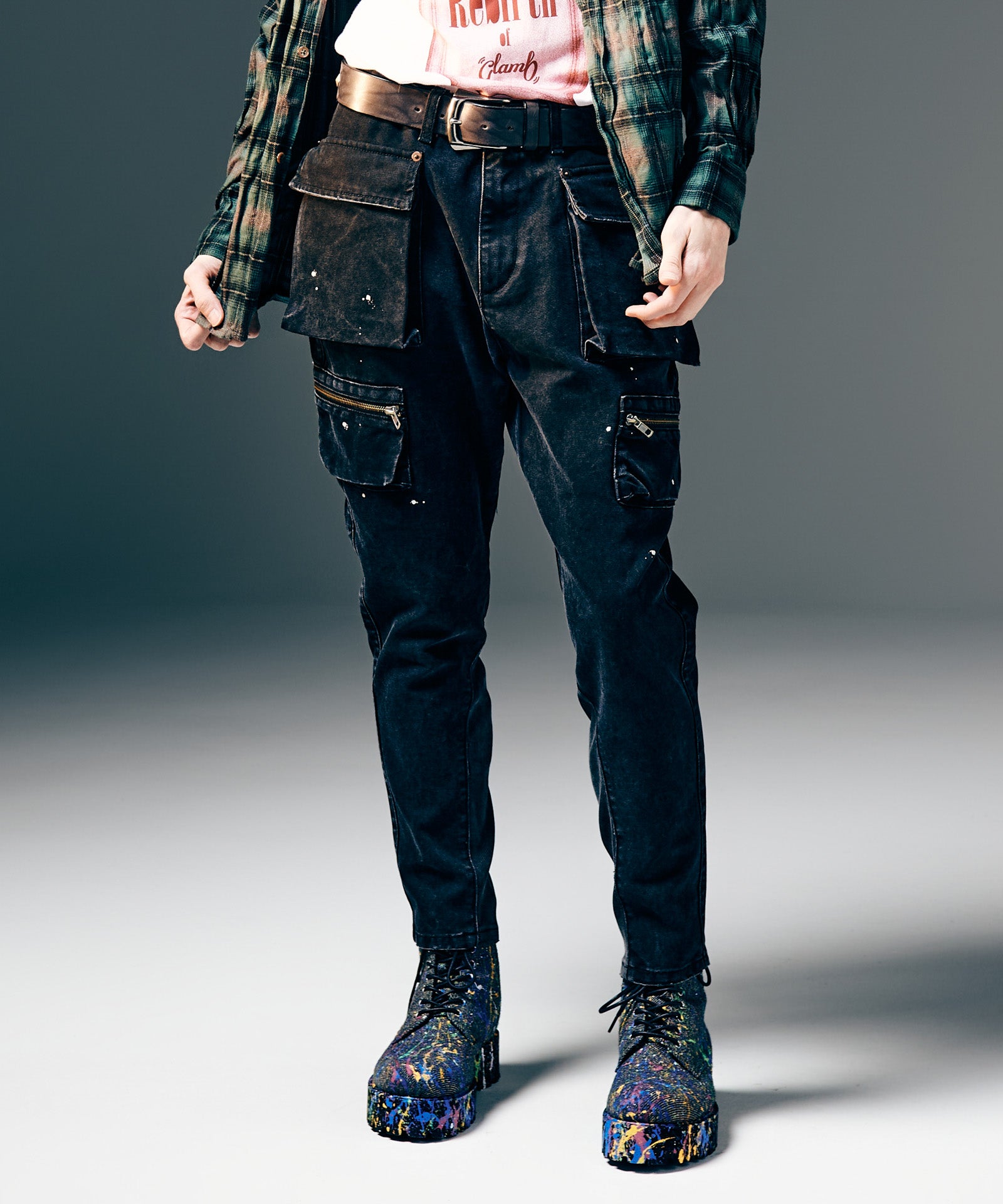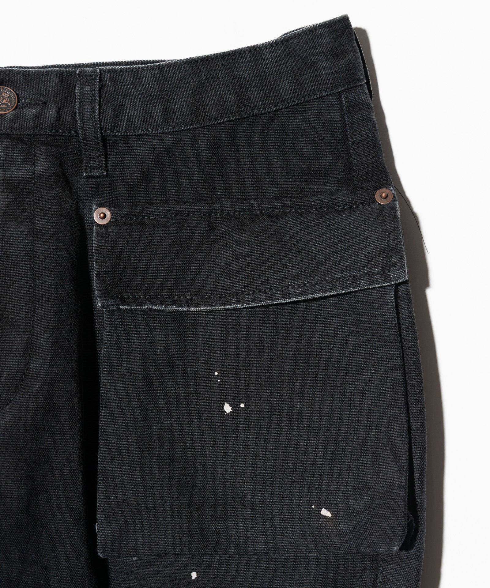 ブランドが得意とする創造的なシルエットメイキングを、無骨な色落ちとパターンワークによってエッジィな佇まいに仕上げたSnow Wash Cargo Pants。シルエットはゆとりある腿周りから膝下にかけてタイトに絞りを加えたサルエルテーパード。腰位置のカーゴポケットはリベットのメタリックな存在感が生地の風合いとコントラストを見せてアクセントとなっています。テキスタイルにはキャンバス生地を使用。縫い代やポケットの縁など要所に削りを加えた後、漂白剤に浸した石と本体を一緒に洗うスノーウォッシュ加工を施すことで、要所のアタリと生地全体に現れる霜降りのような退色を表現。仕上げにペンキ汚しを散りばめることでラギッドな表情をより一層際立たせました。