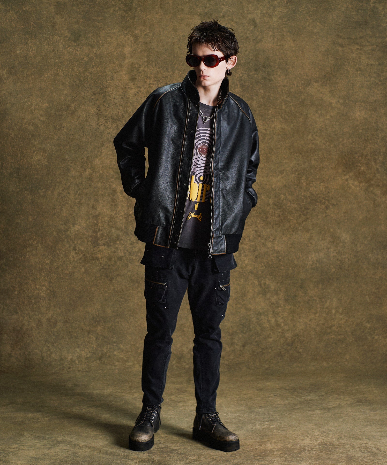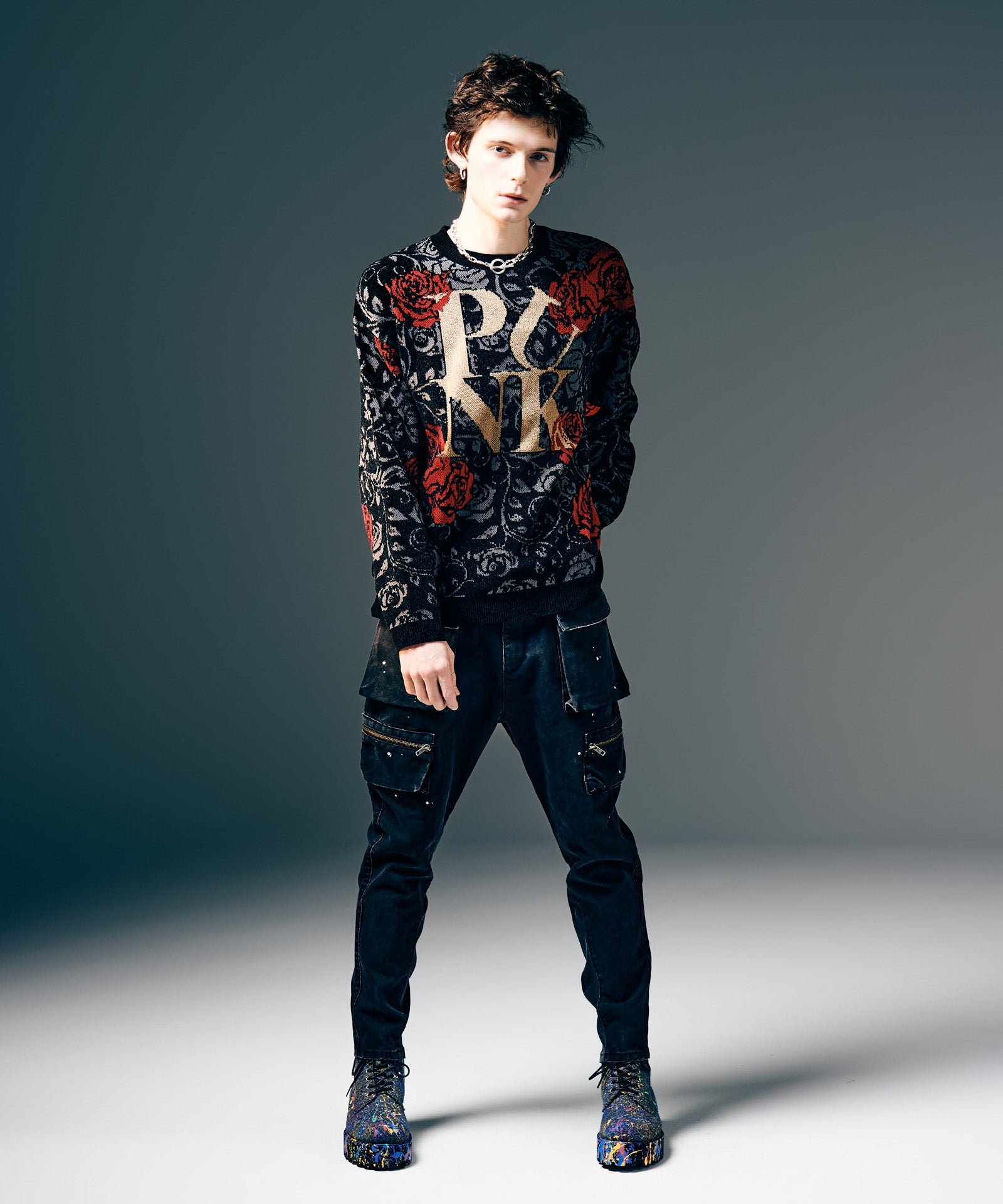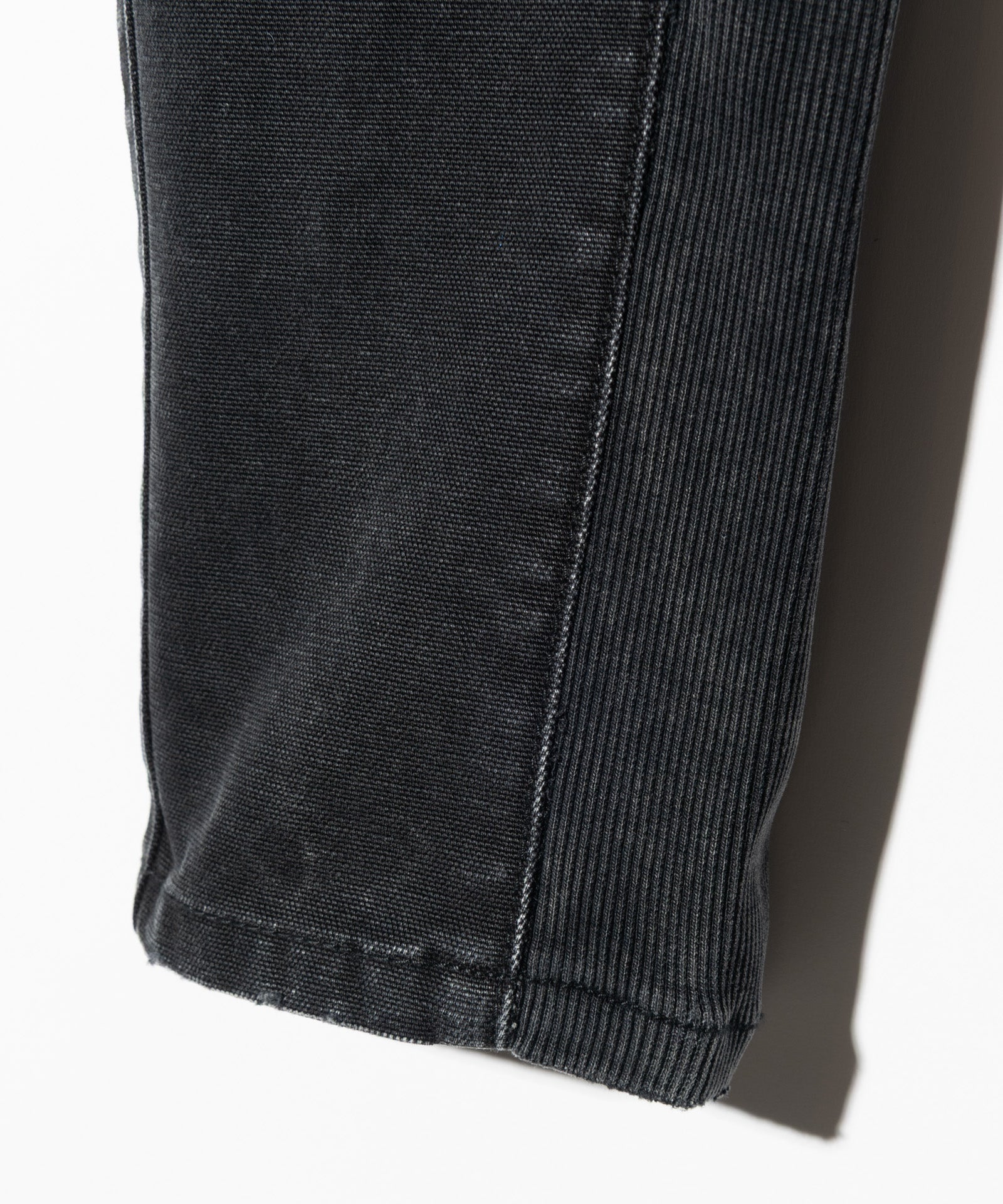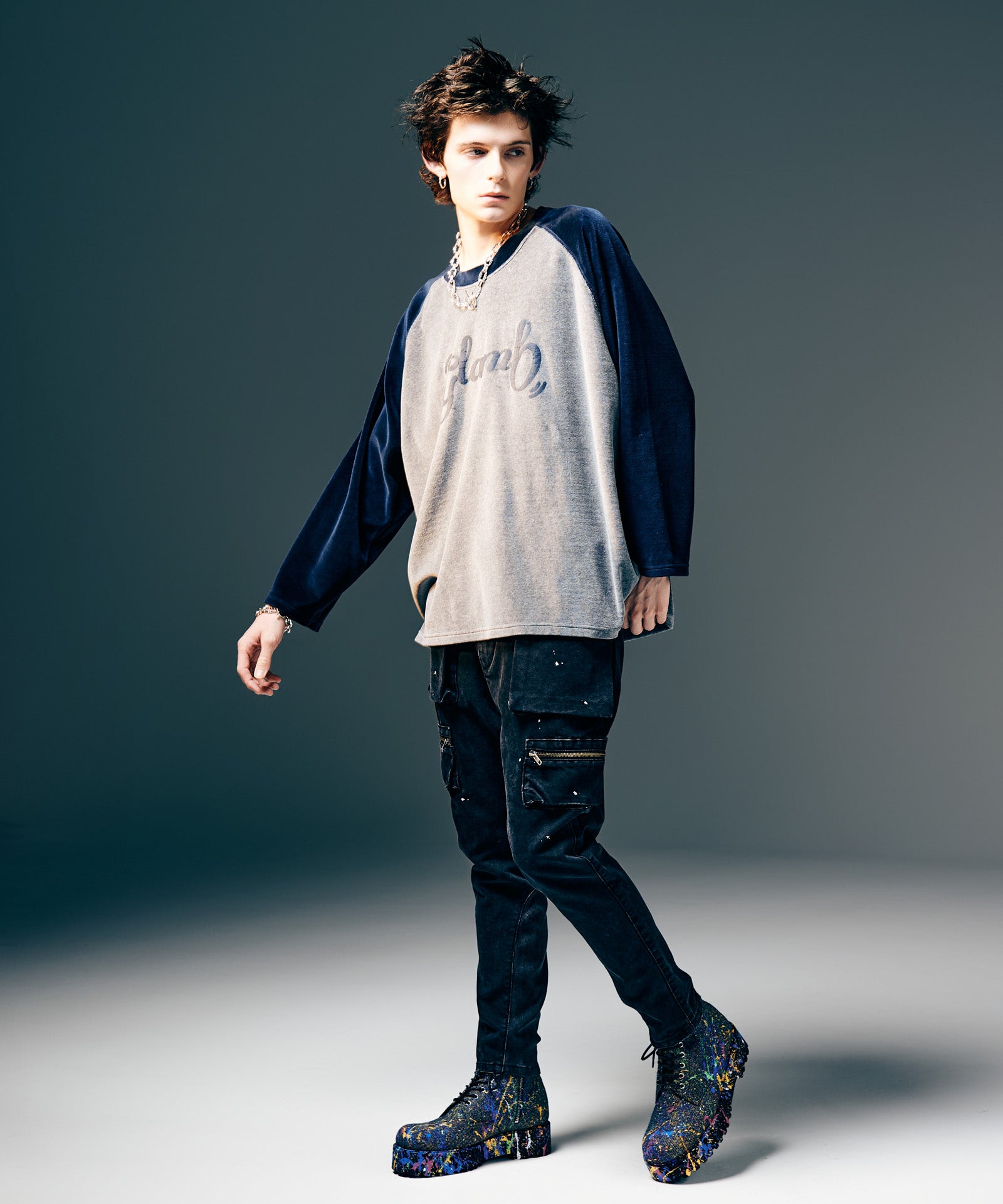 ブランドが得意とする創造的なシルエットメイキングを、無骨な色落ちとパターンワークによってエッジィな佇まいに仕上げたSnow Wash Cargo Pants。シルエットはゆとりある腿周りから膝下にかけてタイトに絞りを加えたサルエルテーパード。腰位置のカーゴポケットはリベットのメタリックな存在感が生地の風合いとコントラストを見せてアクセントとなっています。テキスタイルにはキャンバス生地を使用。縫い代やポケットの縁など要所に削りを加えた後、漂白剤に浸した石と本体を一緒に洗うスノーウォッシュ加工を施すことで、要所のアタリと生地全体に現れる霜降りのような退色を表現。仕上げにペンキ汚しを散りばめることでラギッドな表情をより一層際立たせました。