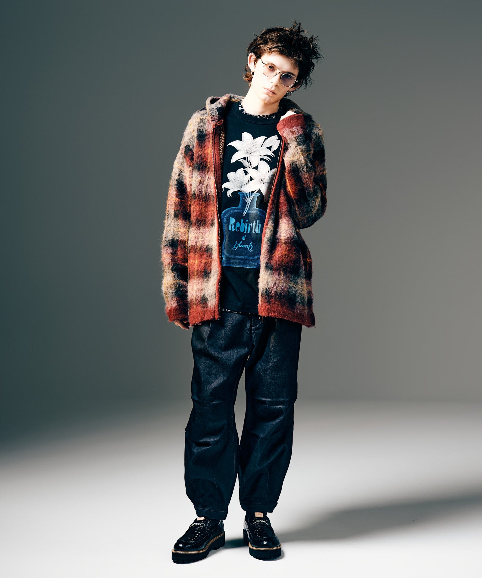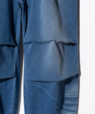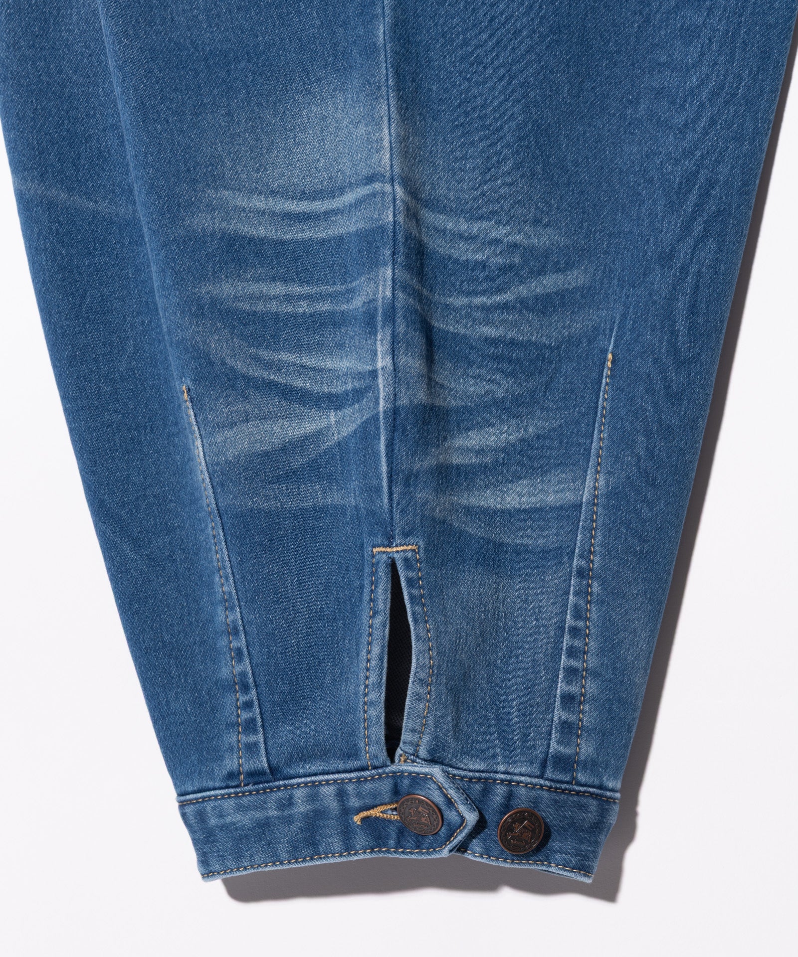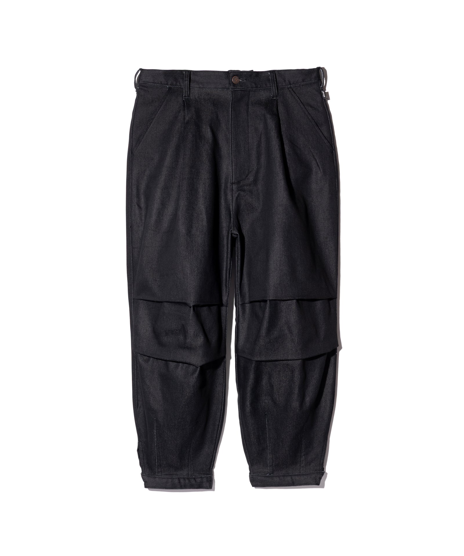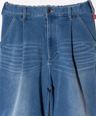 素材とシルエットの双方に変化を組み合わせ、新たなデニムスタイリングを提案するDeformed Knit Denim。ボディは腰元に1タック、膝に2タック、裾にダーツを取って構成したボリュームあるワイドシルエット。レングスは九分丈に設定しており、着用すると足元にオフバランスな視覚効果を演出します。カラーバリエーションごとに異なる生地は2つのムードを提案。テキスタイルに用いたのは複雑な織りを得意とするドビー織機で仕上げられたニットデニム。縦糸に硫化染めの色糸、横糸に白糸を用いて織り上げられた生地組織は加工によって色落ちする性質を持っており、Indigoはヴィンテージライクなヒゲやアタリを演出。一転してBlackは生デニムでの展開となり、ワークウェアのムードをクリーンに楽しませてくれます。