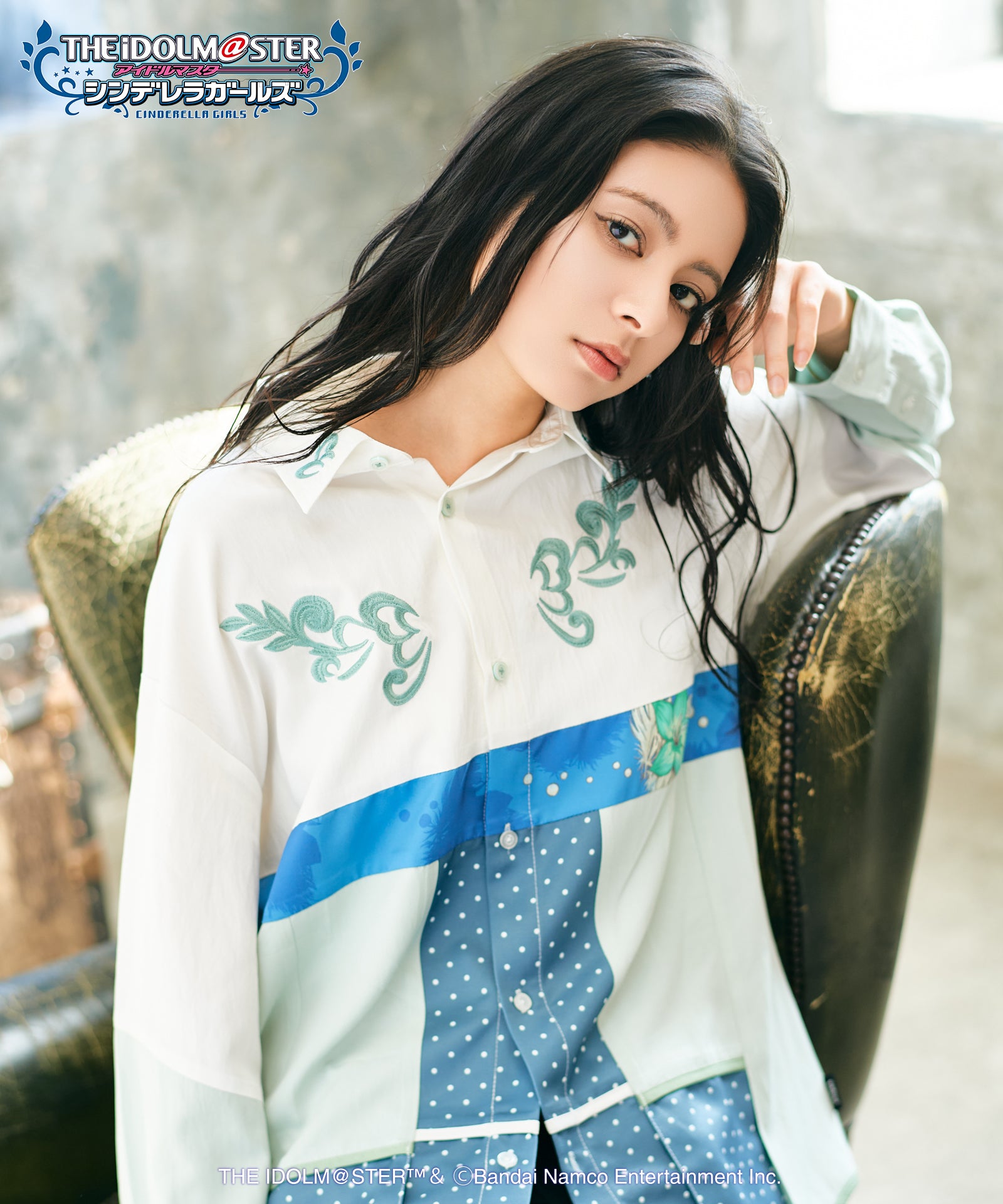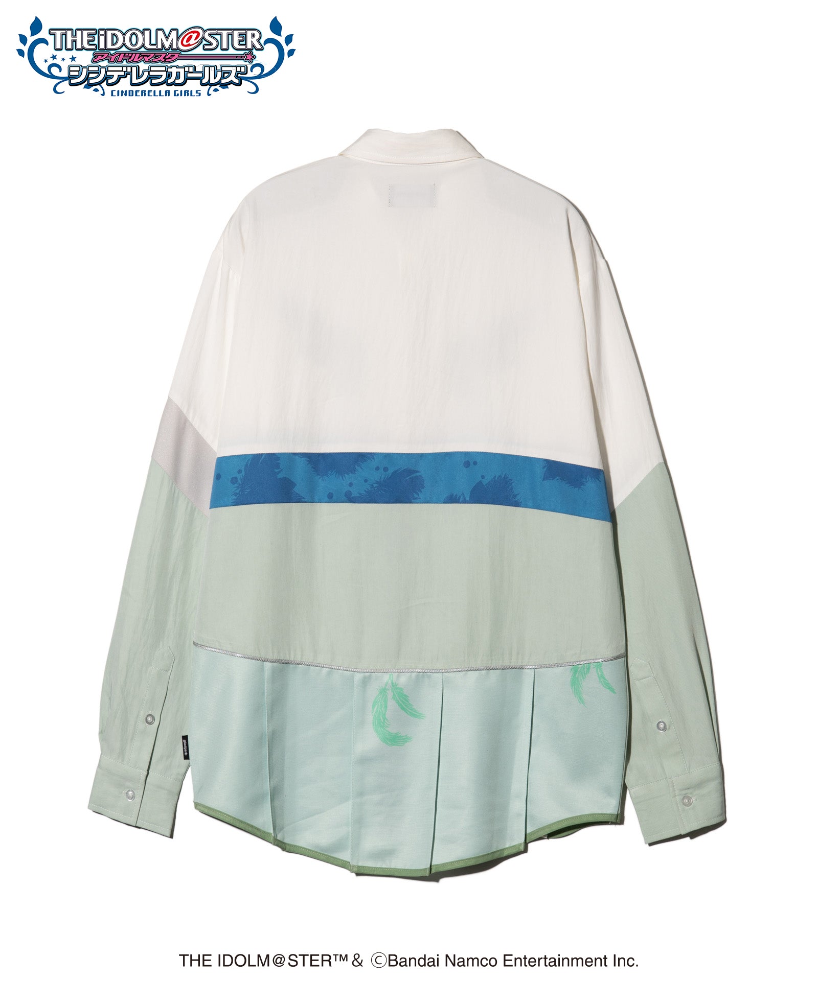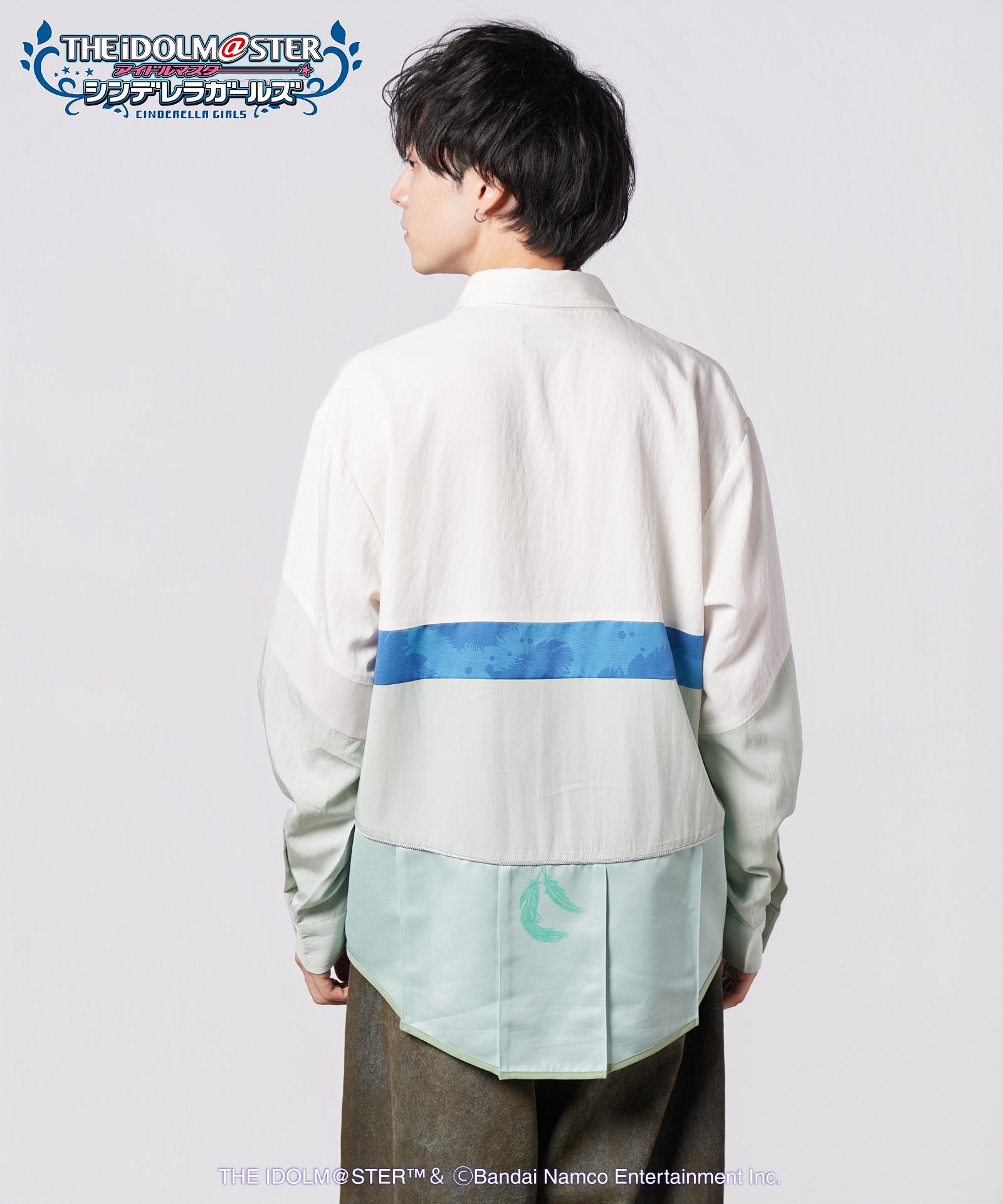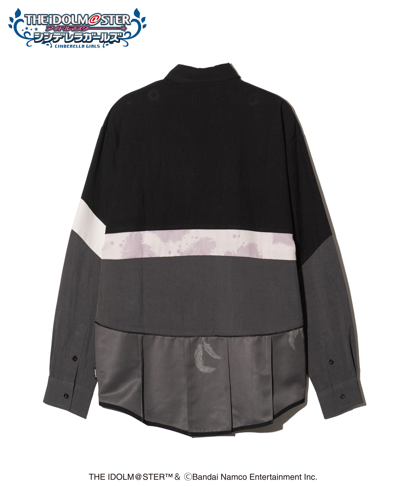 『夜風の誘い』で高垣 楓が着用したドレスをレトロでアヴァンギャルドなシャツへと落とし込んだKaede Takagaki Shirt。首や胸元に見られるディテールはボタニカルな刺繍であしらって、ウエスタンシャツを思わせるオールドアメリカンなムードに。髪飾りは胸元にヴィンテージアロハシャツを思わせるプリントで表現しています。さらには腕に巻いたアクセサリーはシャイニーな生地で、足元にかけて広がるギャザーやドットパーツも切り替えとプリーツで丹念にデザイン。バックスタイルにも着想となった衣装に見られるフェザーをプリントして作品への愛情を隅々まで込めました。