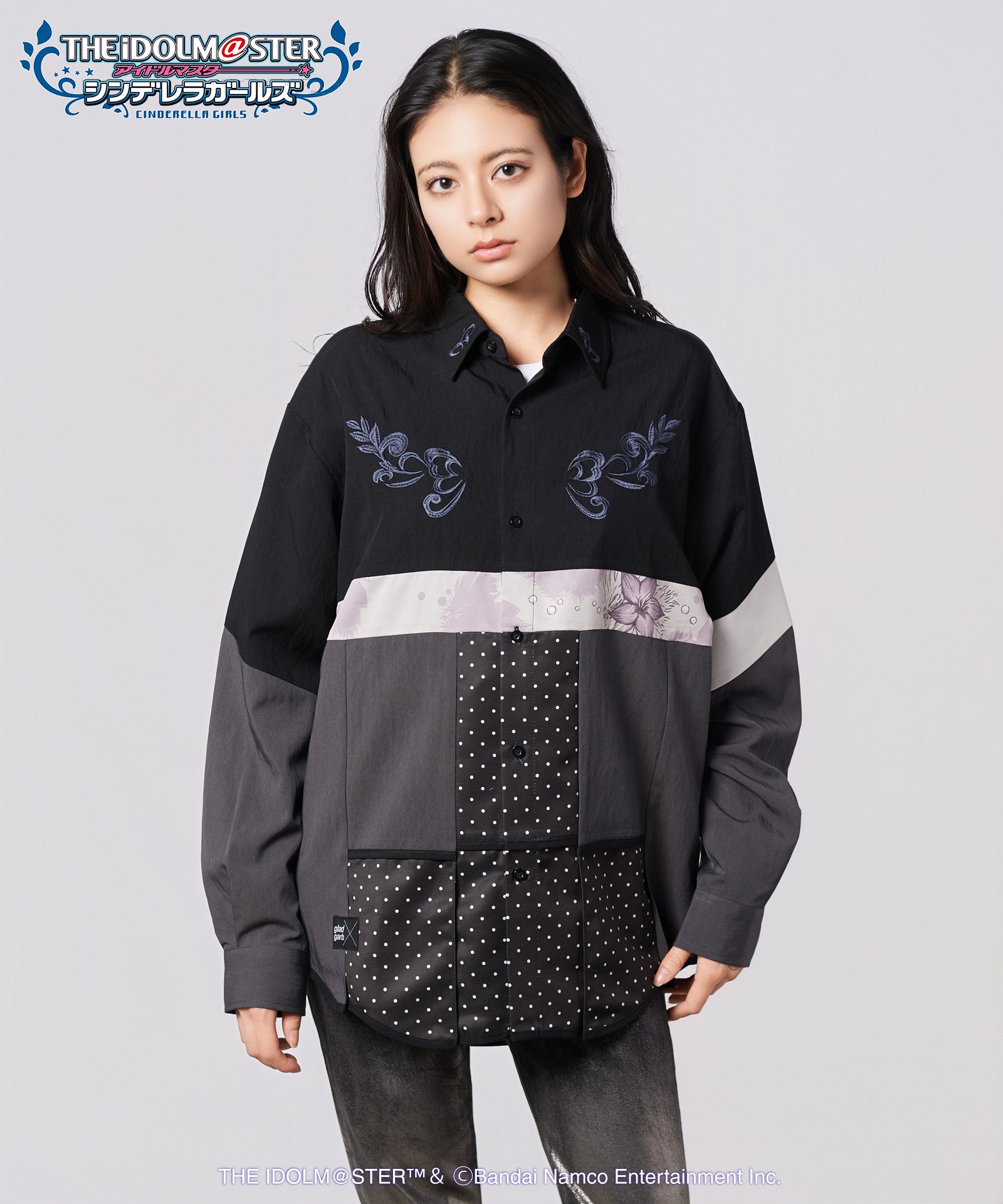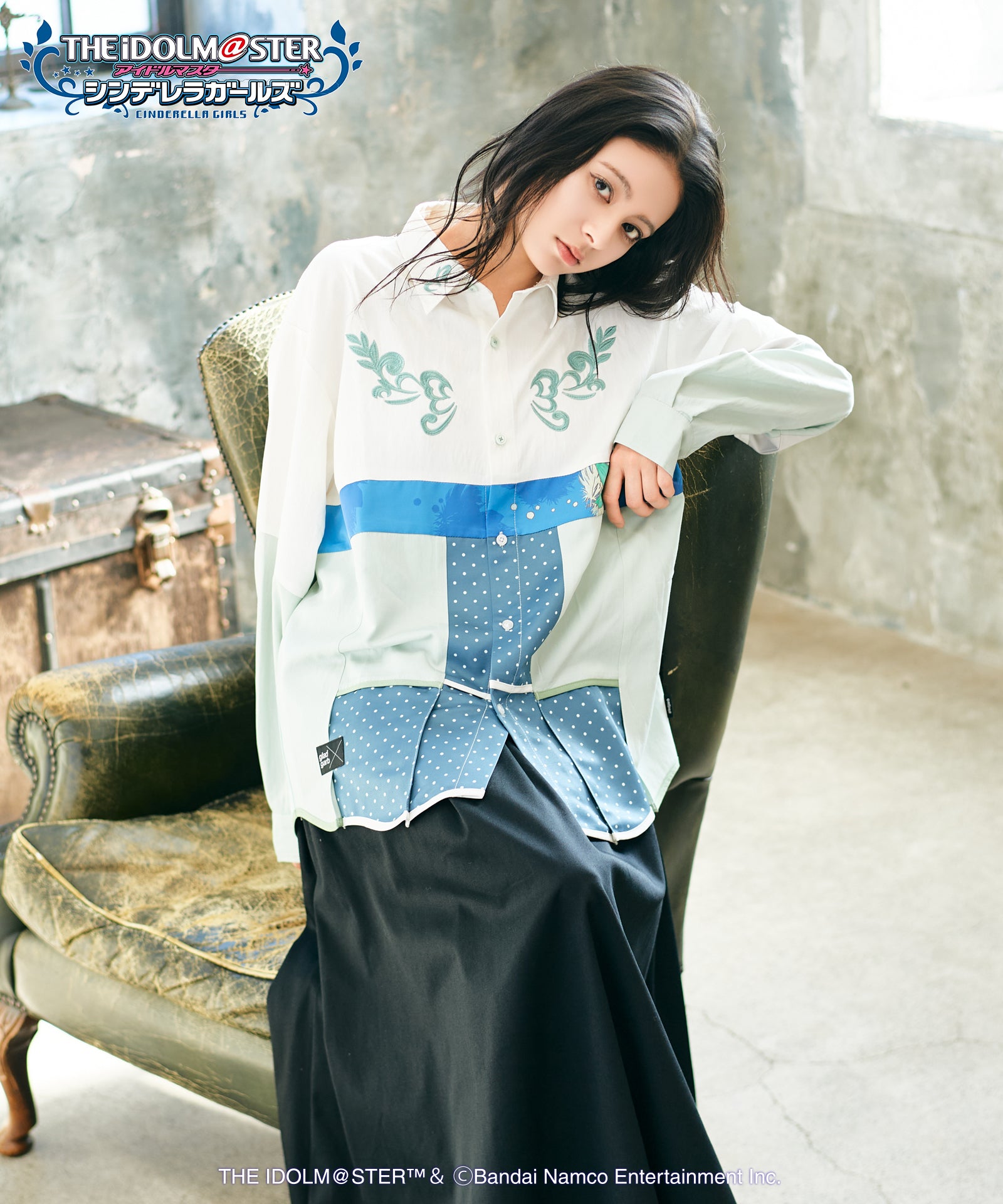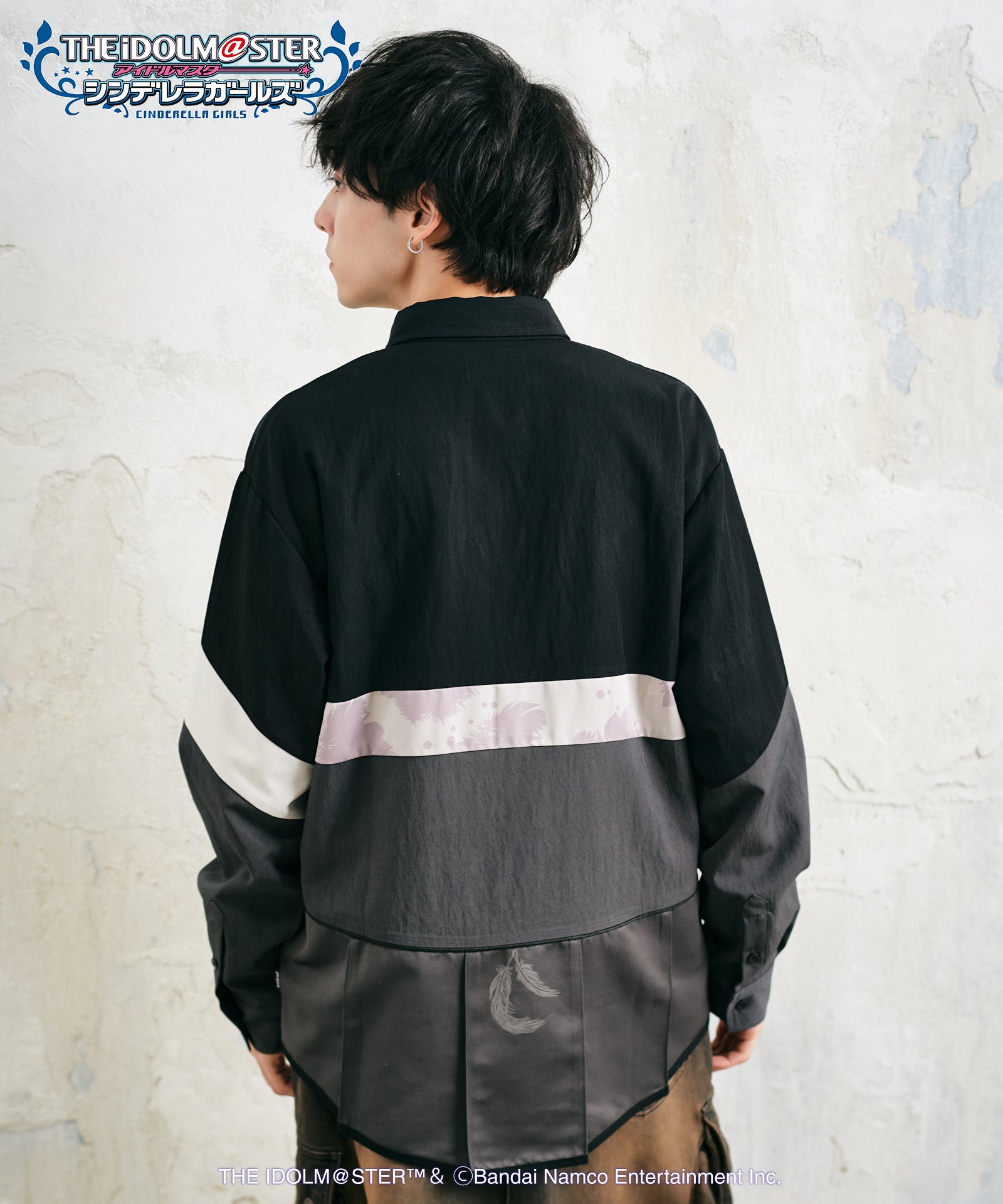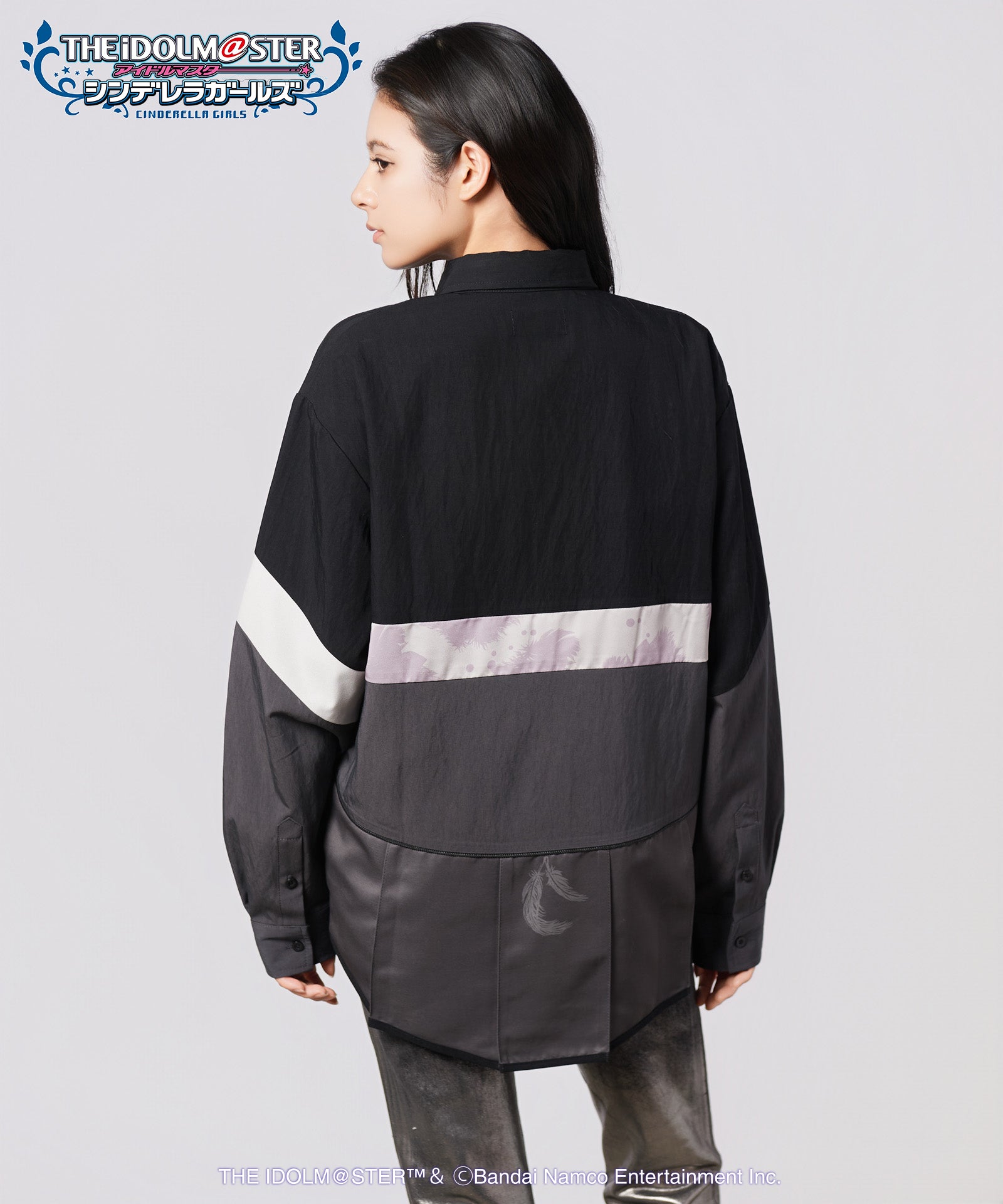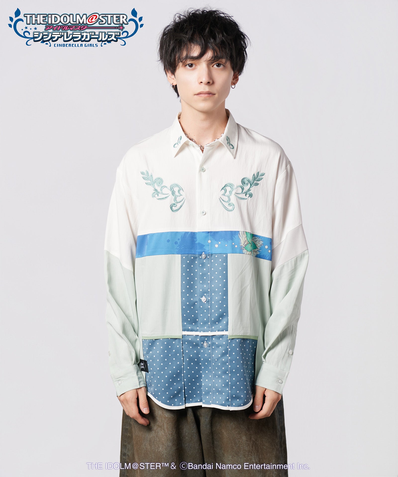 『夜風の誘い』で高垣 楓が着用したドレスをレトロでアヴァンギャルドなシャツへと落とし込んだKaede Takagaki Shirt。首や胸元に見られるディテールはボタニカルな刺繍であしらって、ウエスタンシャツを思わせるオールドアメリカンなムードに。髪飾りは胸元にヴィンテージアロハシャツを思わせるプリントで表現しています。さらには腕に巻いたアクセサリーはシャイニーな生地で、足元にかけて広がるギャザーやドットパーツも切り替えとプリーツで丹念にデザイン。バックスタイルにも着想となった衣装に見られるフェザーをプリントして作品への愛情を隅々まで込めました。