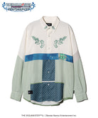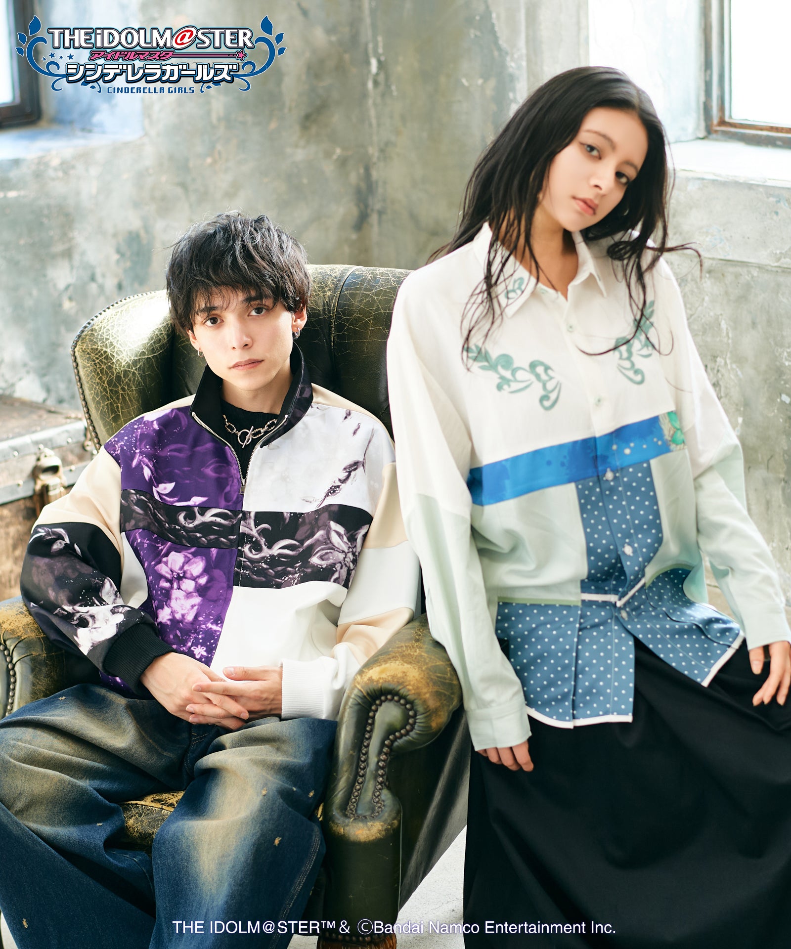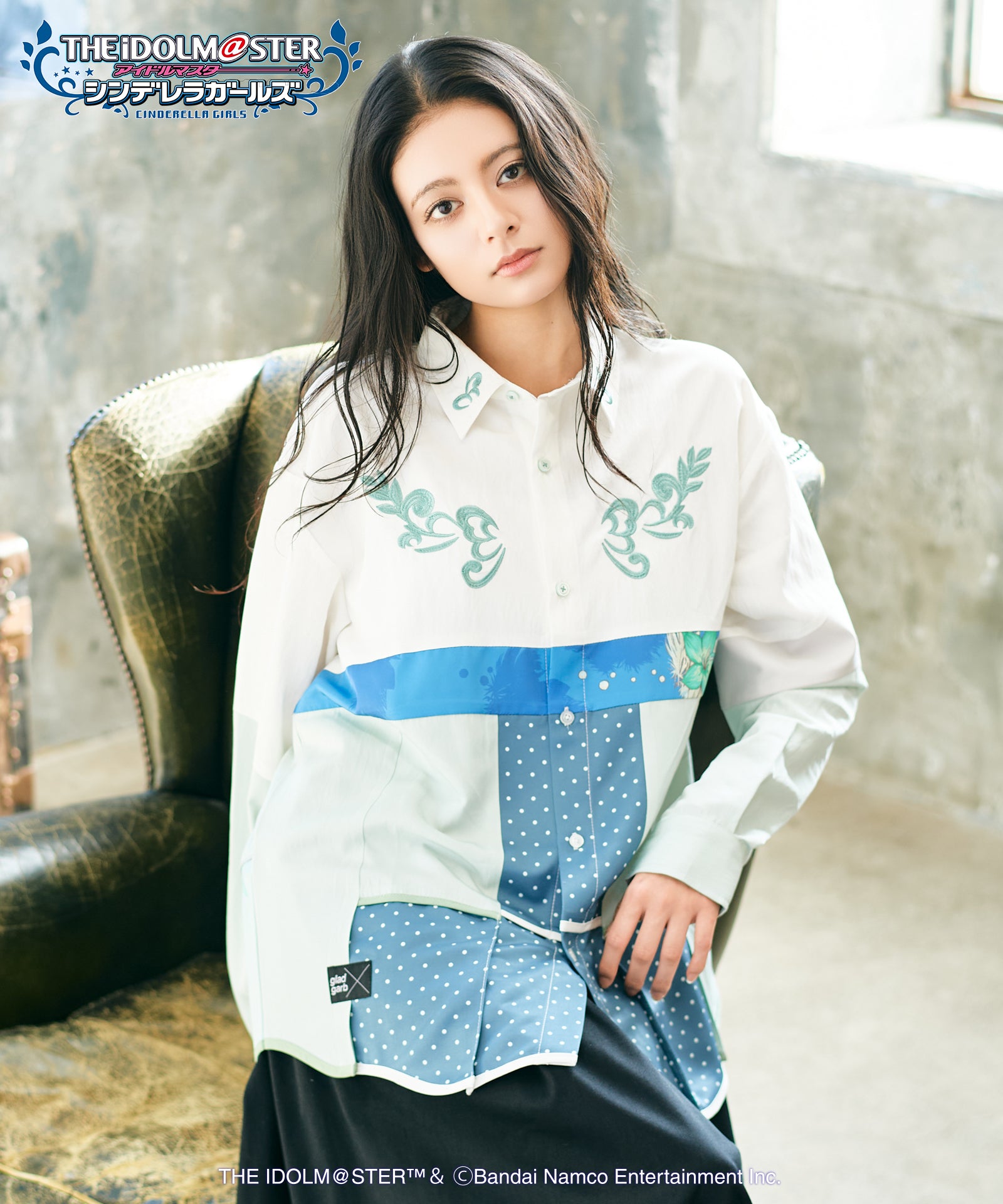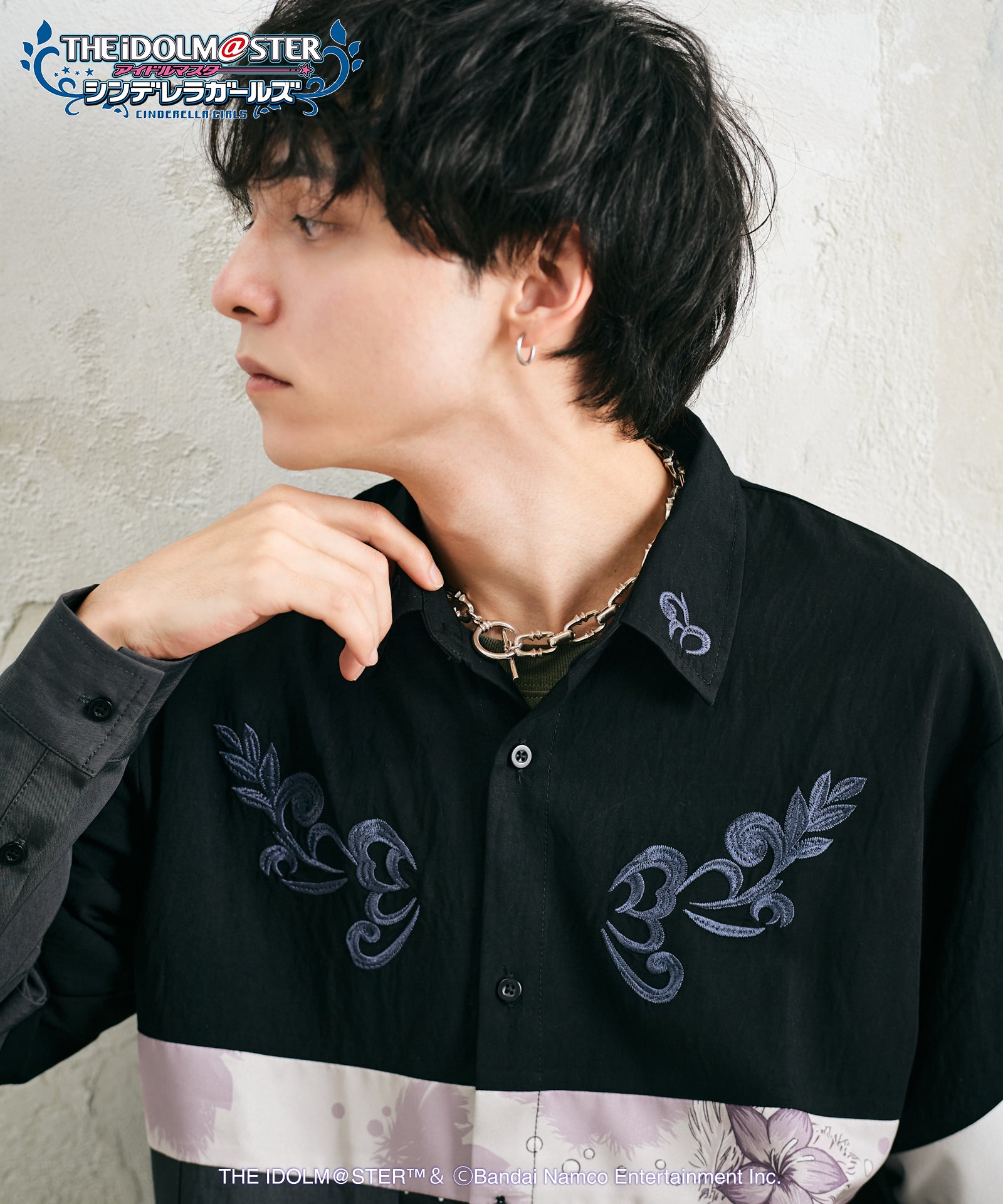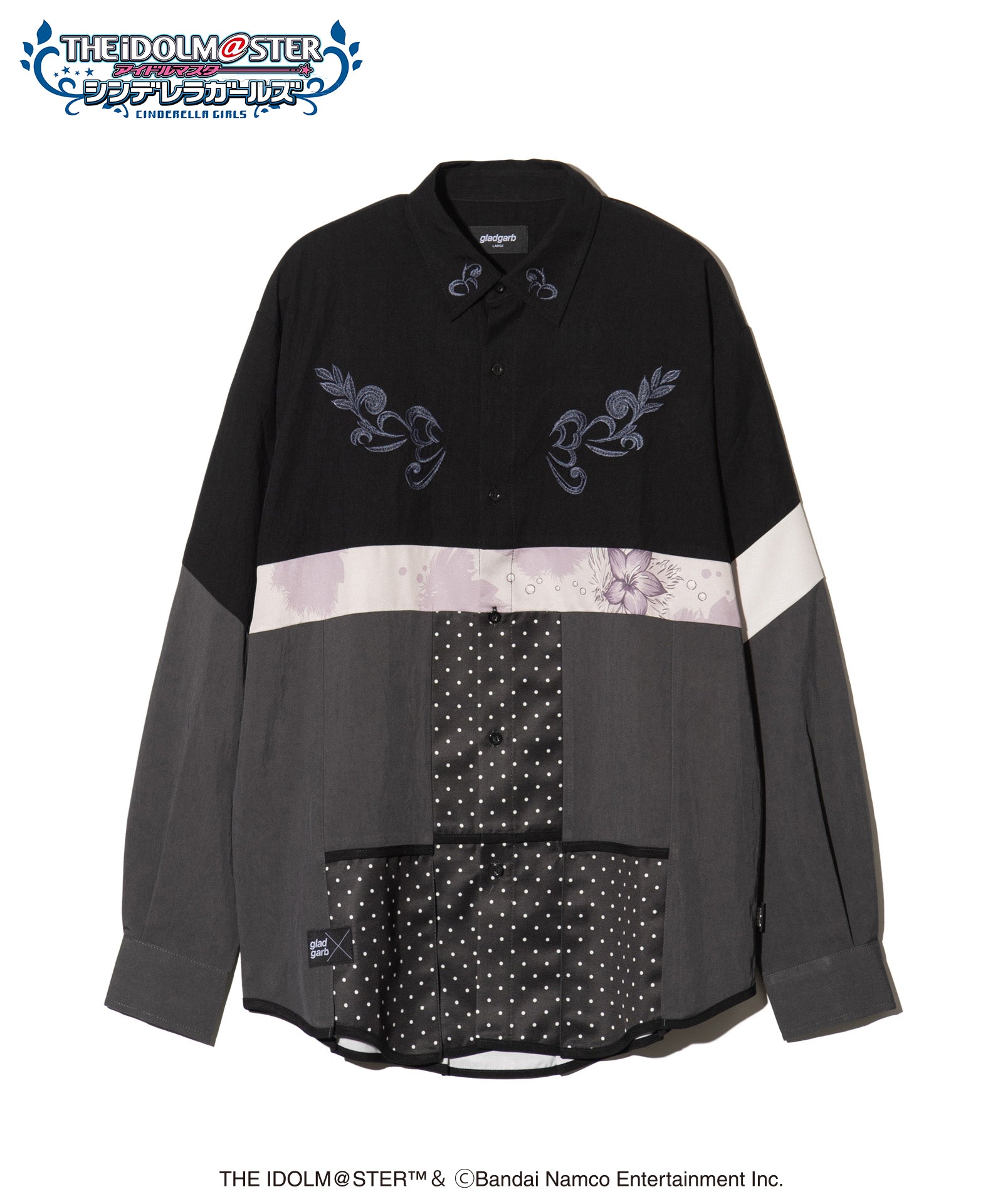 『夜風の誘い』で高垣 楓が着用したドレスをレトロでアヴァンギャルドなシャツへと落とし込んだKaede Takagaki Shirt。首や胸元に見られるディテールはボタニカルな刺繍であしらって、ウエスタンシャツを思わせるオールドアメリカンなムードに。髪飾りは胸元にヴィンテージアロハシャツを思わせるプリントで表現しています。さらには腕に巻いたアクセサリーはシャイニーな生地で、足元にかけて広がるギャザーやドットパーツも切り替えとプリーツで丹念にデザイン。バックスタイルにも着想となった衣装に見られるフェザーをプリントして作品への愛情を隅々まで込めました。