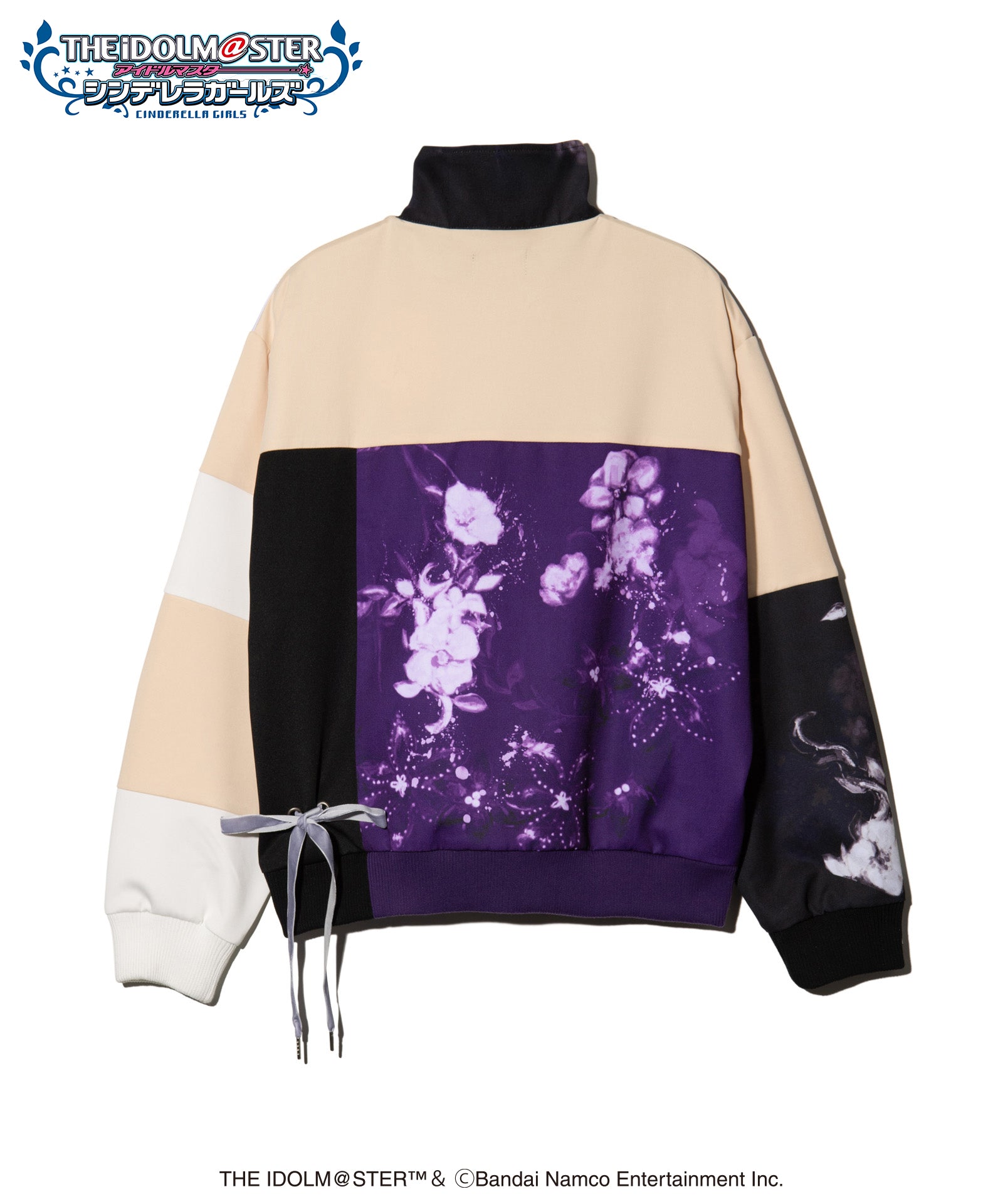 『サイハテに咲く鏡花』における速水 奏の衣装デザインをモチーフにトラックジャケットにリリカルなムードを持たせたKanade Hayami Track Jacket。gladgarbらしい水彩画のタッチでドレスの花々を描きながら、構築的なパッチワークでアシンメトリーなヴィジュアルを表現。後ろ身頃に見られるリボンはベルベットであしらってエレガントなムードを強調しました。