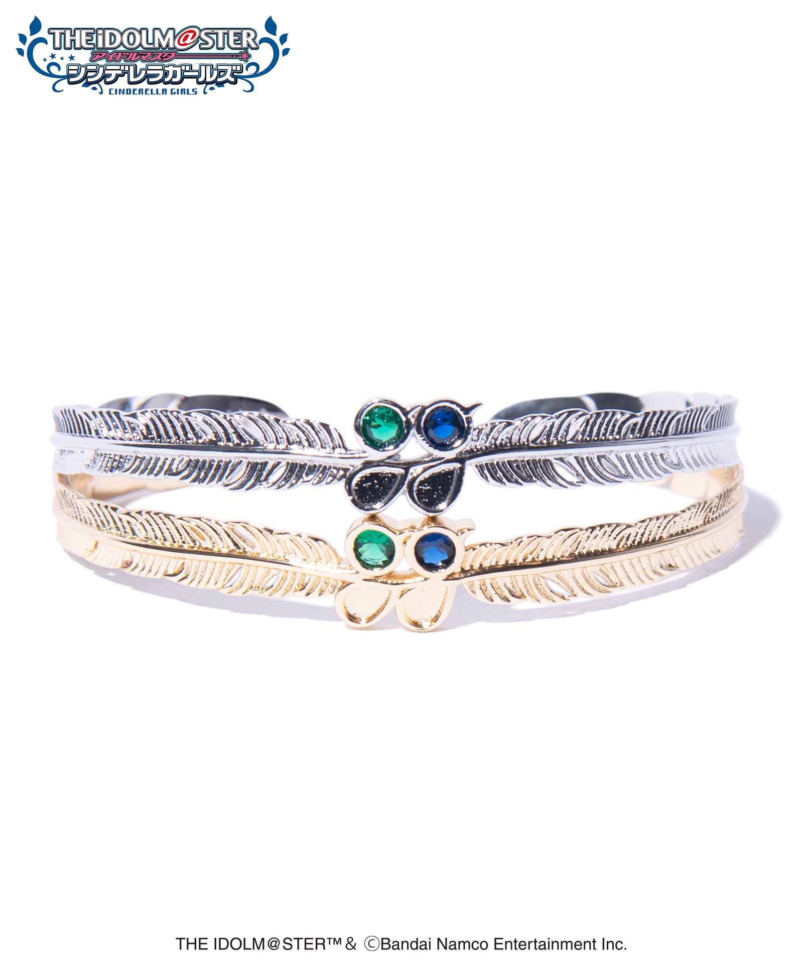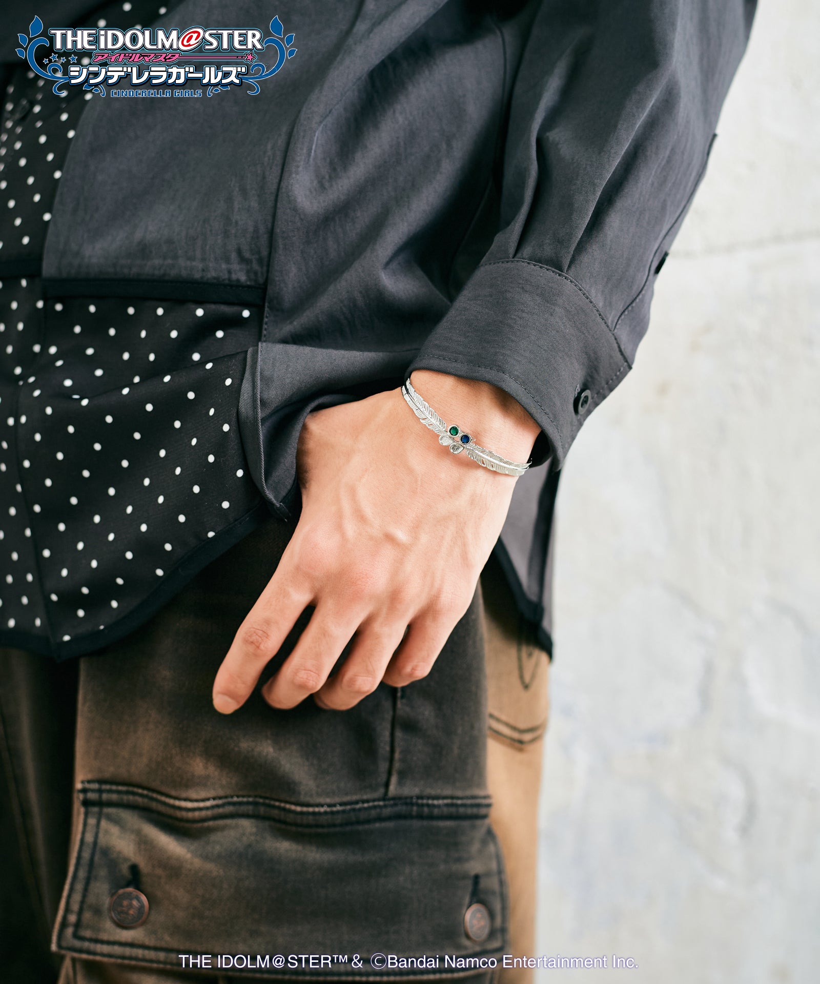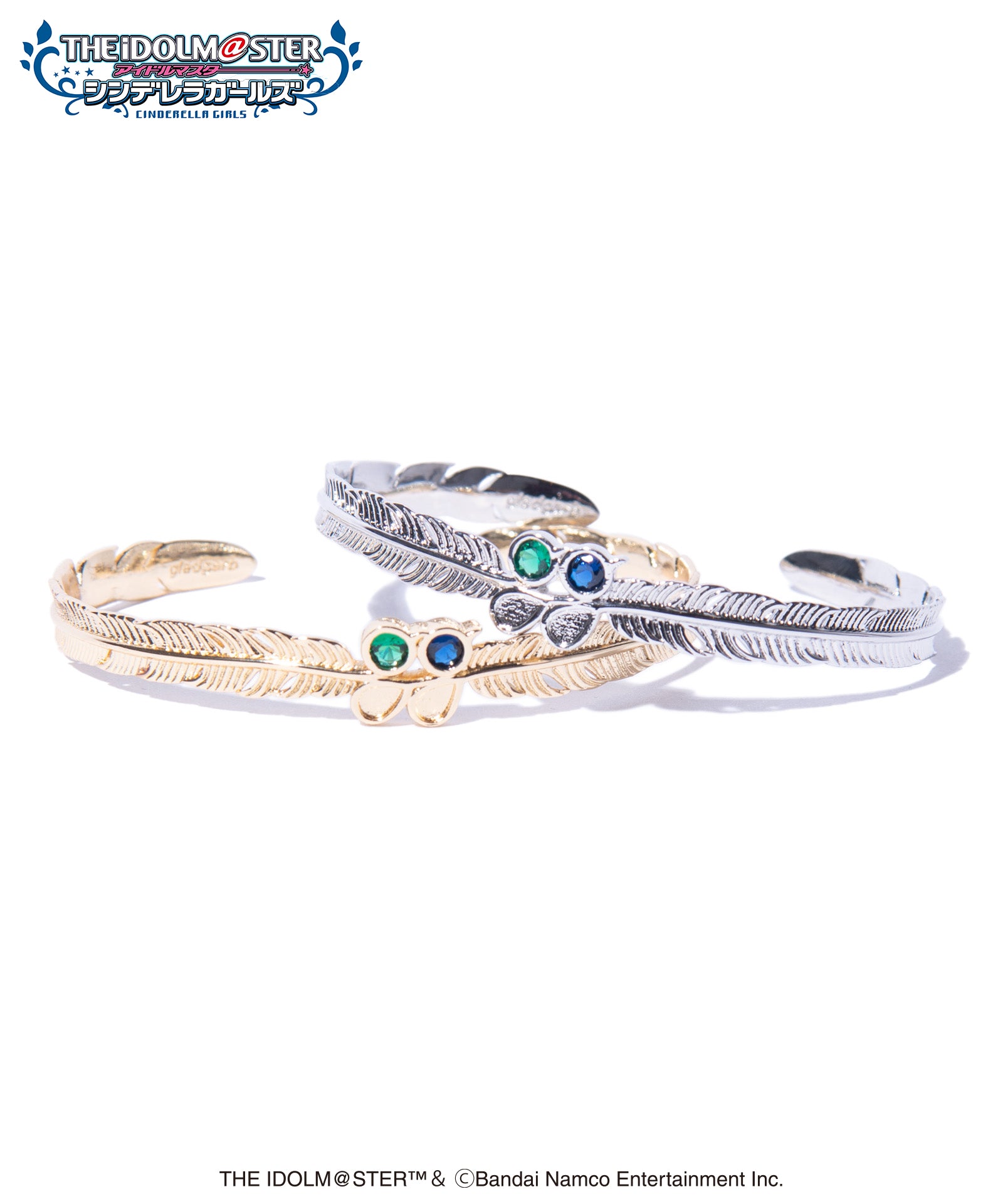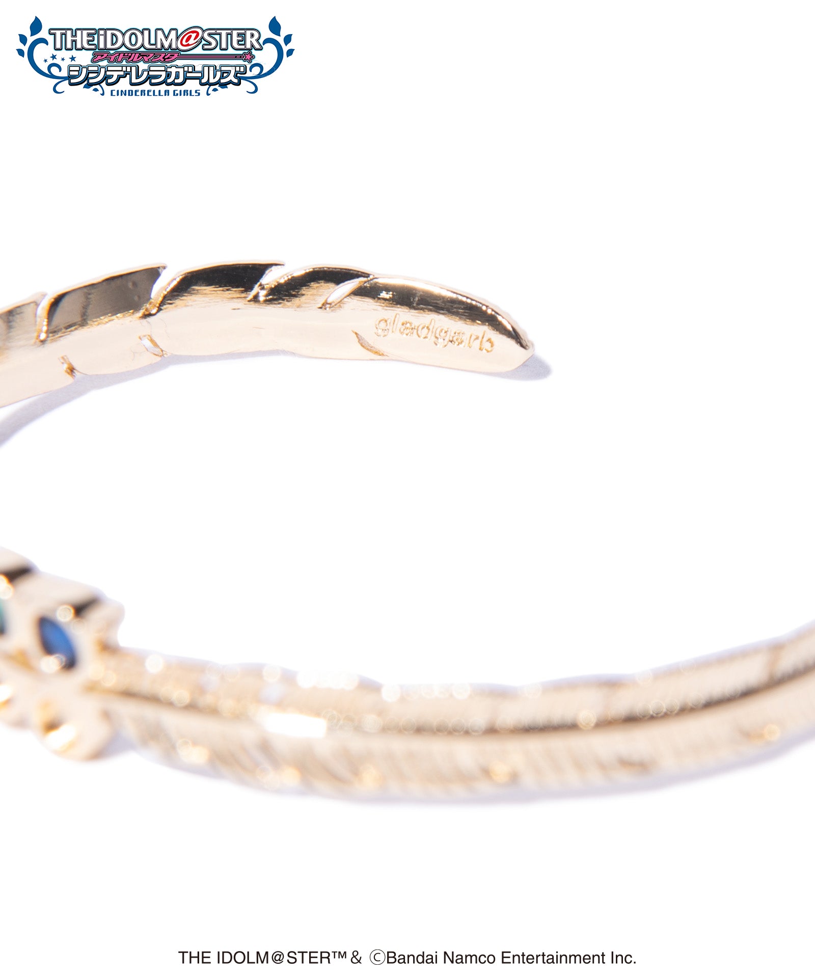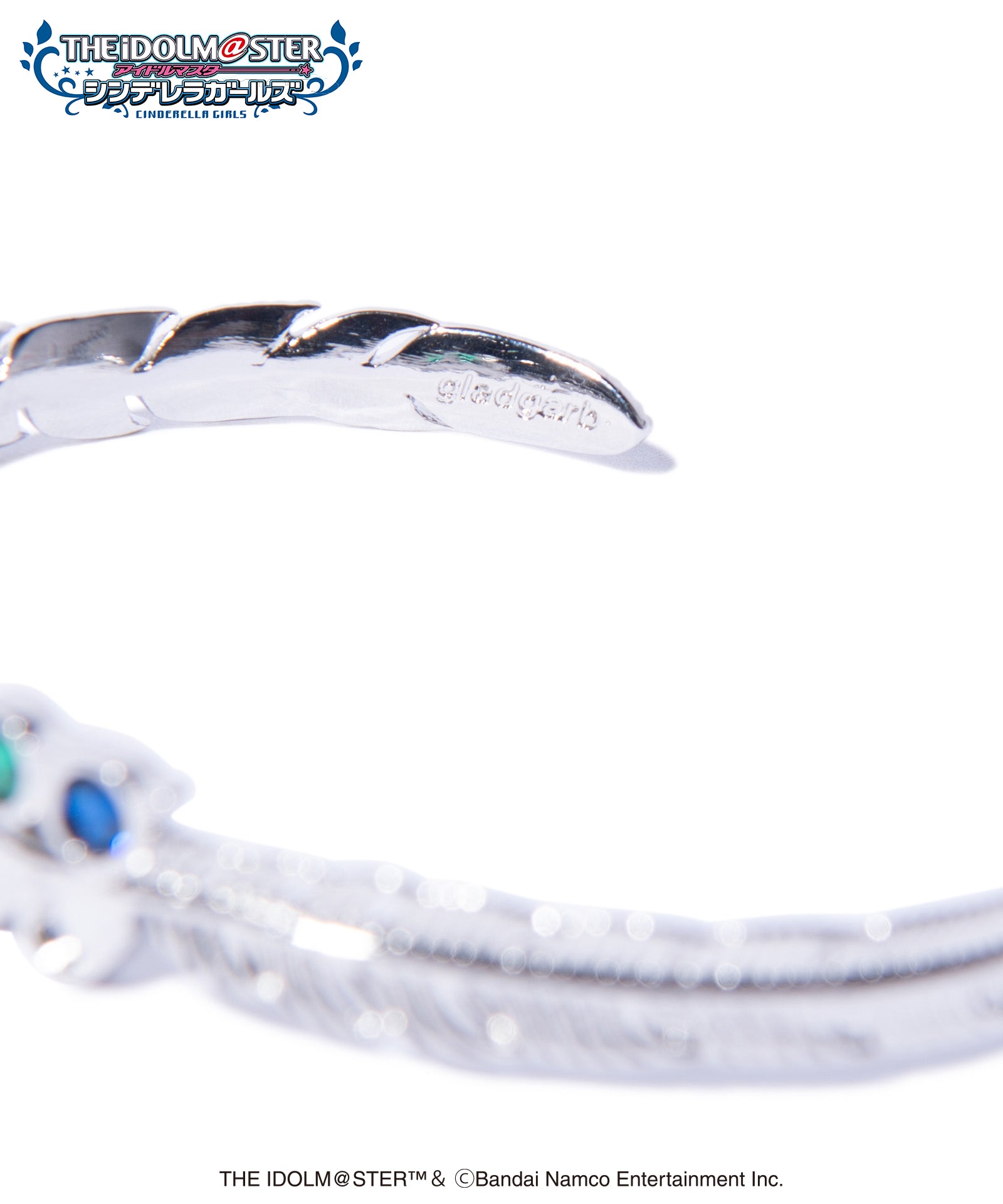 手元にユニットを想起させるジュエリーを提案するMysterious Eyes Bangle。フェザーモチーフのボディにあしらったのは二人のカラーを用いたストーン。gladgarbを表す「gg」の輪郭に落とし込んでコラボレーションならではの特別なデザインを作り上げました。