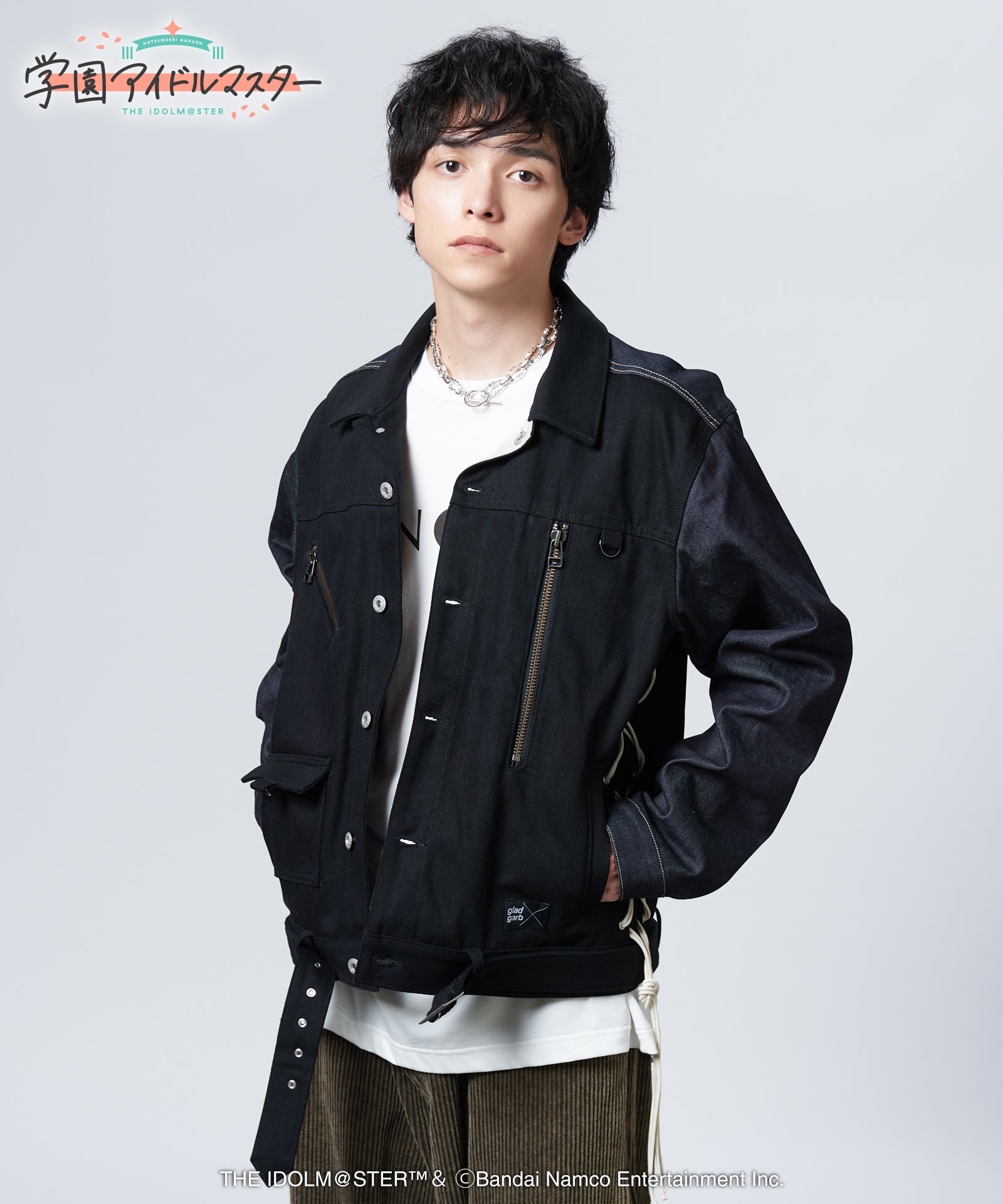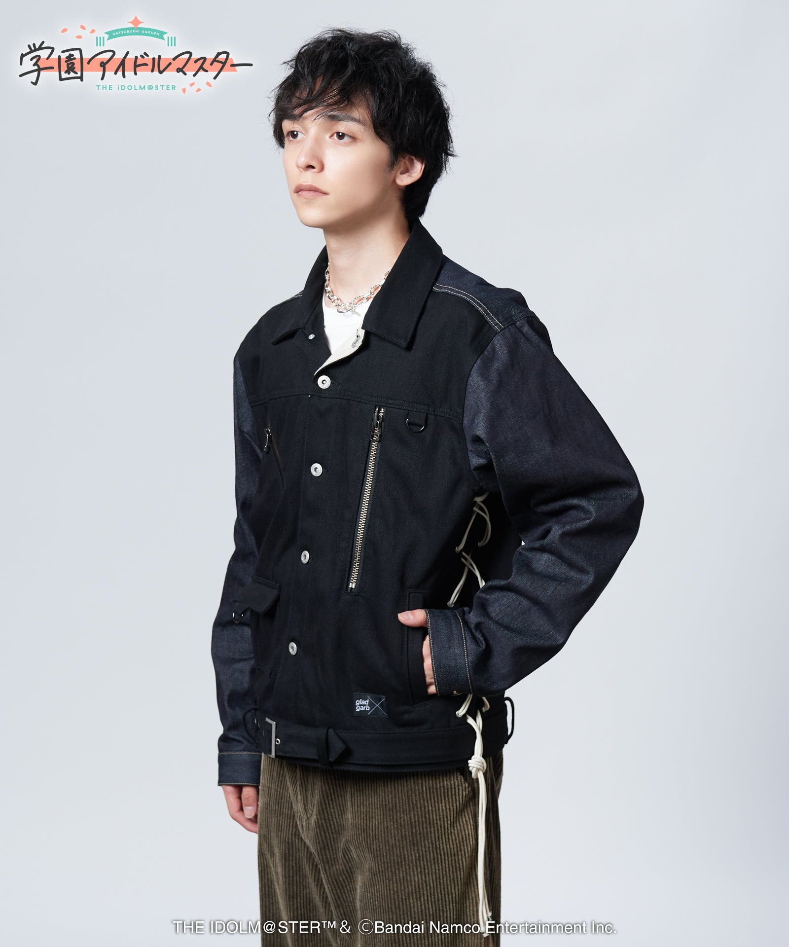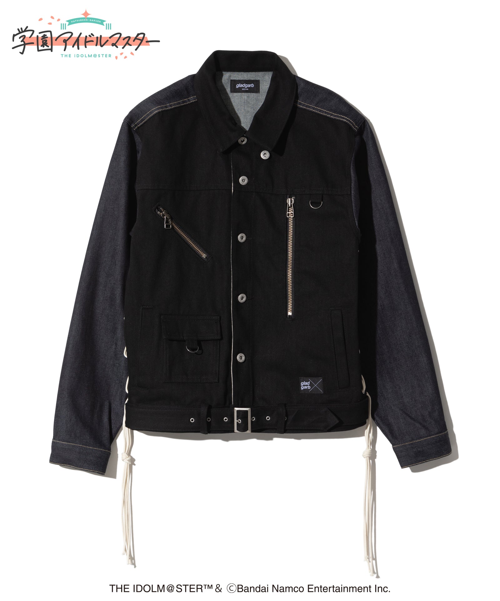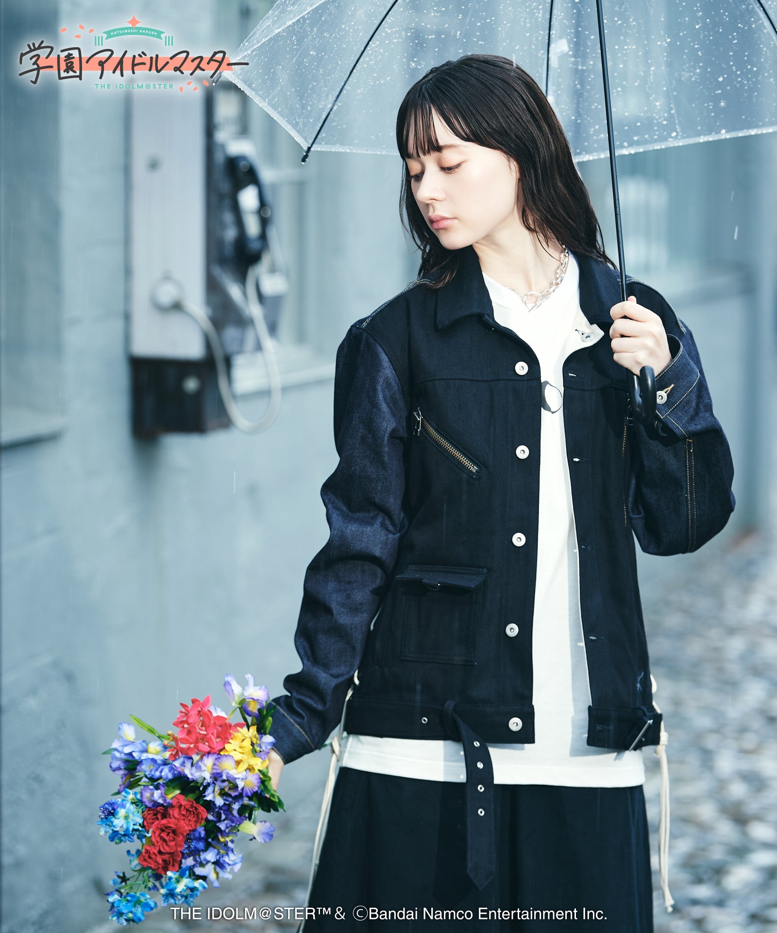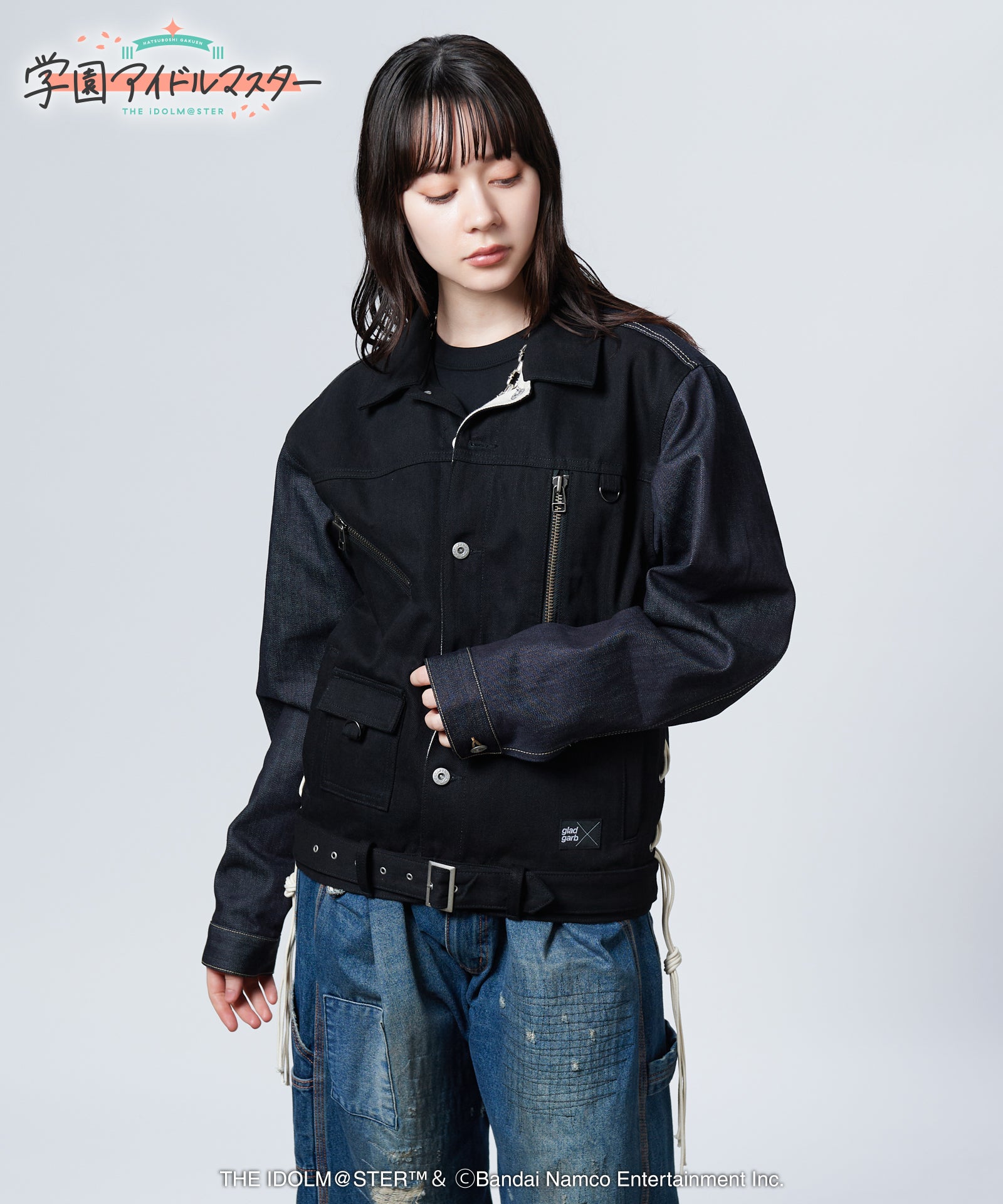 gladgarbと『学園アイドルマスター』がコラボレーション。月村手毬のソロ楽曲「Luna say maybe」の衣装をオントレンドなデニムジャケットへと再構築したLuna say maybe Denim Jacket。オリジナルに見せるライダースライクなラギッドさは継承しながら、テキスタイルにデニムを用いることでカジュアルな印象に。アームとボディをインディゴとブラックで切り替えることで、デニムらしい素材使いで衣装デザインを再現しました。さらにディテールを見ると、ベースとなった衣装の胸元を折り返す着こなしを襟を開いてボディに留めて裏地を見せることで表現。ジッパーやポケットのDカンもオリジナル同様に配しながら、衣装のスカートに見られる編み込みをボディサイドにアレンジにすることでパンクのニュアンスを持たせました。シルエットは身幅にゆとりを持たせたルーズフィットながら着丈は短めに設定。素材使いと相まって現代的なスタイリングでお楽しみいただけます。
