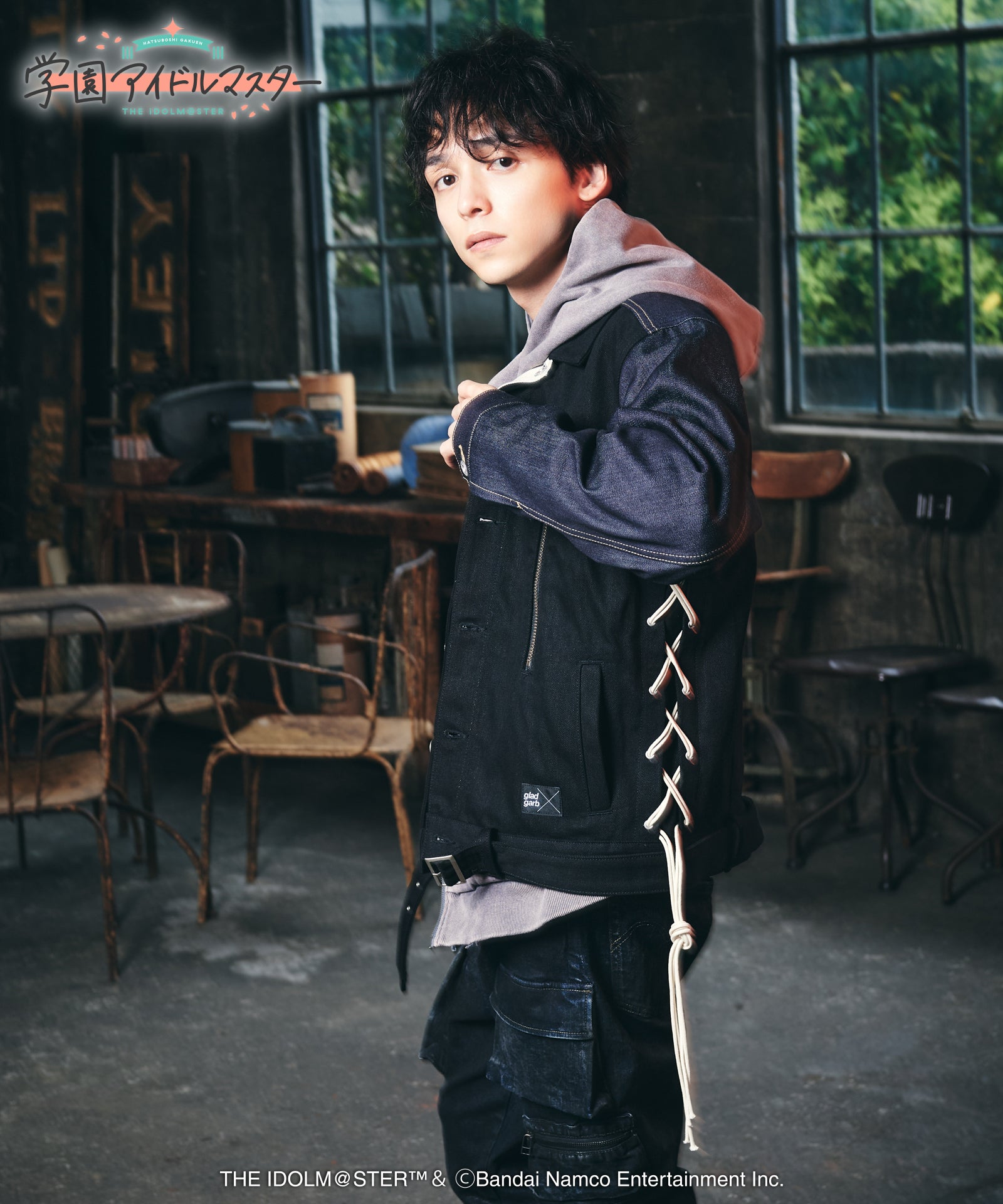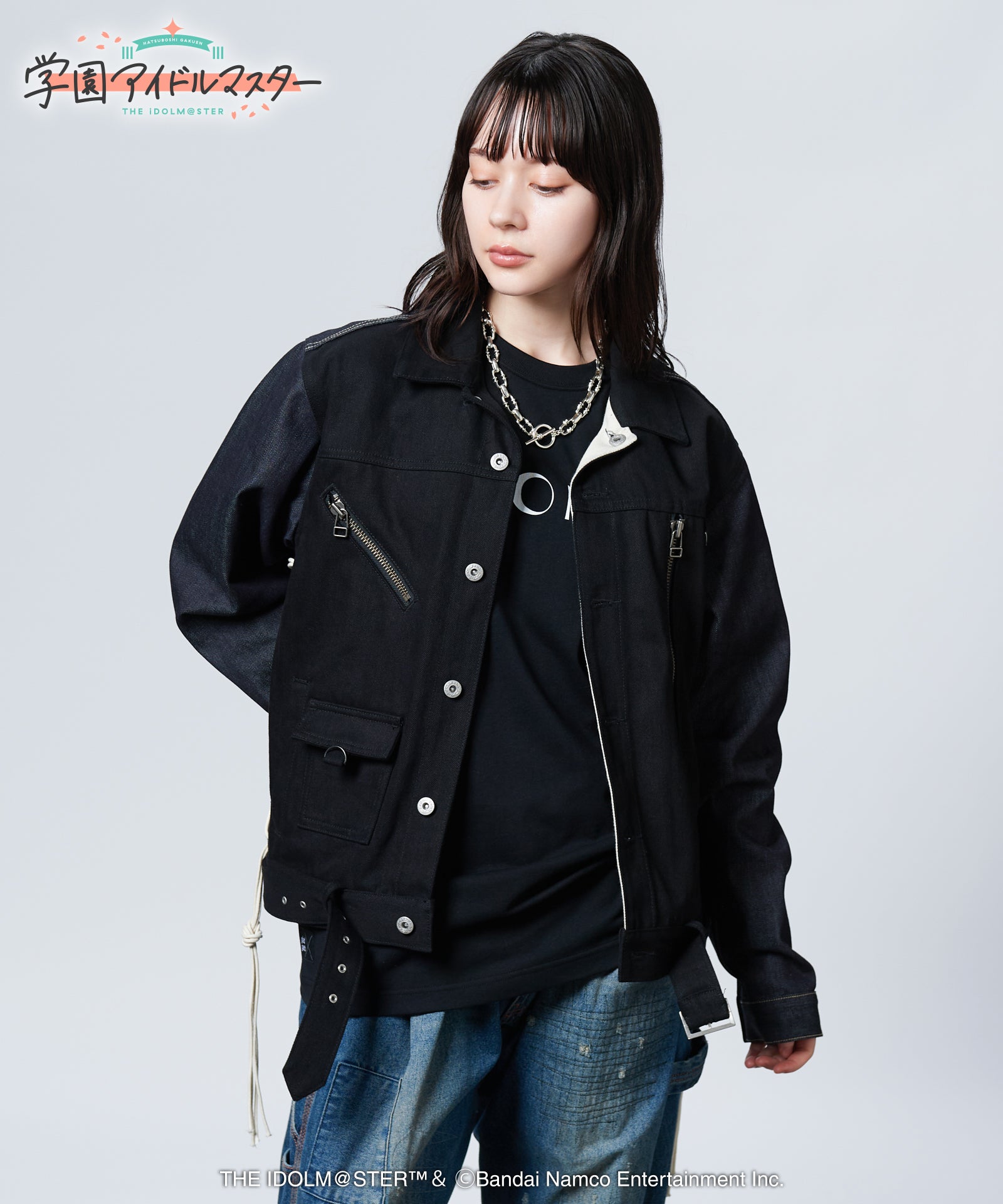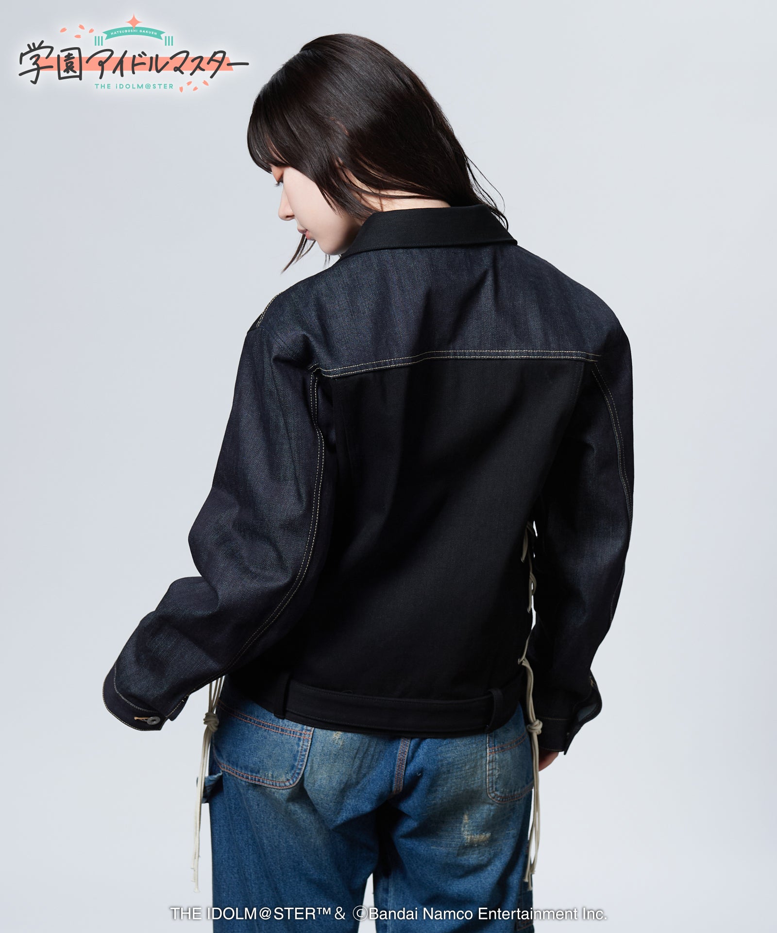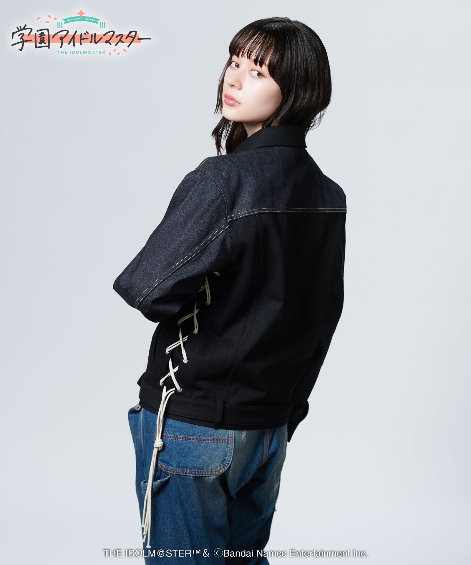 gladgarbと『学園アイドルマスター』がコラボレーション。月村手毬のソロ楽曲「Luna say maybe」の衣装をオントレンドなデニムジャケットへと再構築したLuna say maybe Denim Jacket。オリジナルに見せるライダースライクなラギッドさは継承しながら、テキスタイルにデニムを用いることでカジュアルな印象に。アームとボディをインディゴとブラックで切り替えることで、デニムらしい素材使いで衣装デザインを再現しました。さらにディテールを見ると、ベースとなった衣装の胸元を折り返す着こなしを襟を開いてボディに留めて裏地を見せることで表現。ジッパーやポケットのDカンもオリジナル同様に配しながら、衣装のスカートに見られる編み込みをボディサイドにアレンジにすることでパンクのニュアンスを持たせました。シルエットは身幅にゆとりを持たせたルーズフィットながら着丈は短めに設定。素材使いと相まって現代的なスタイリングでお楽しみいただけます。