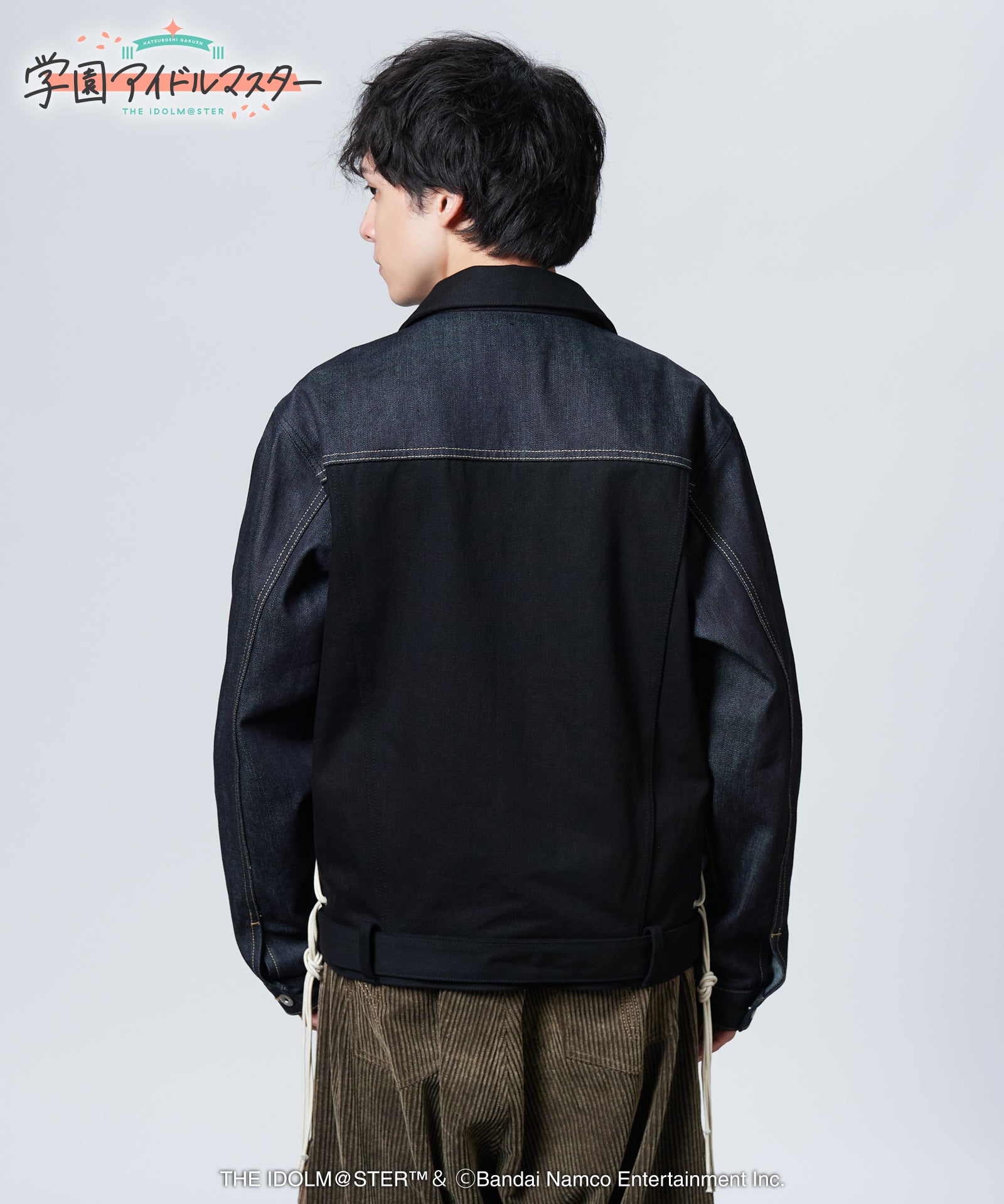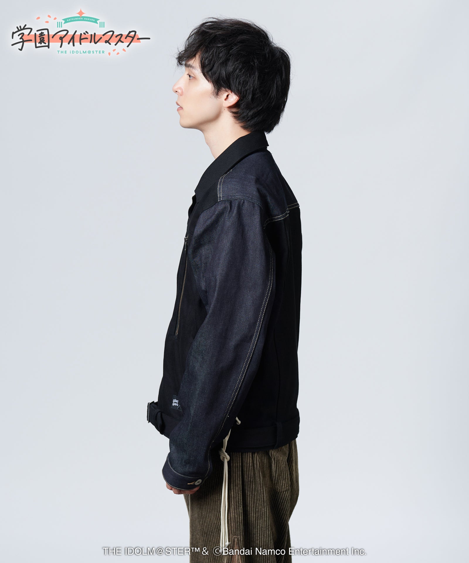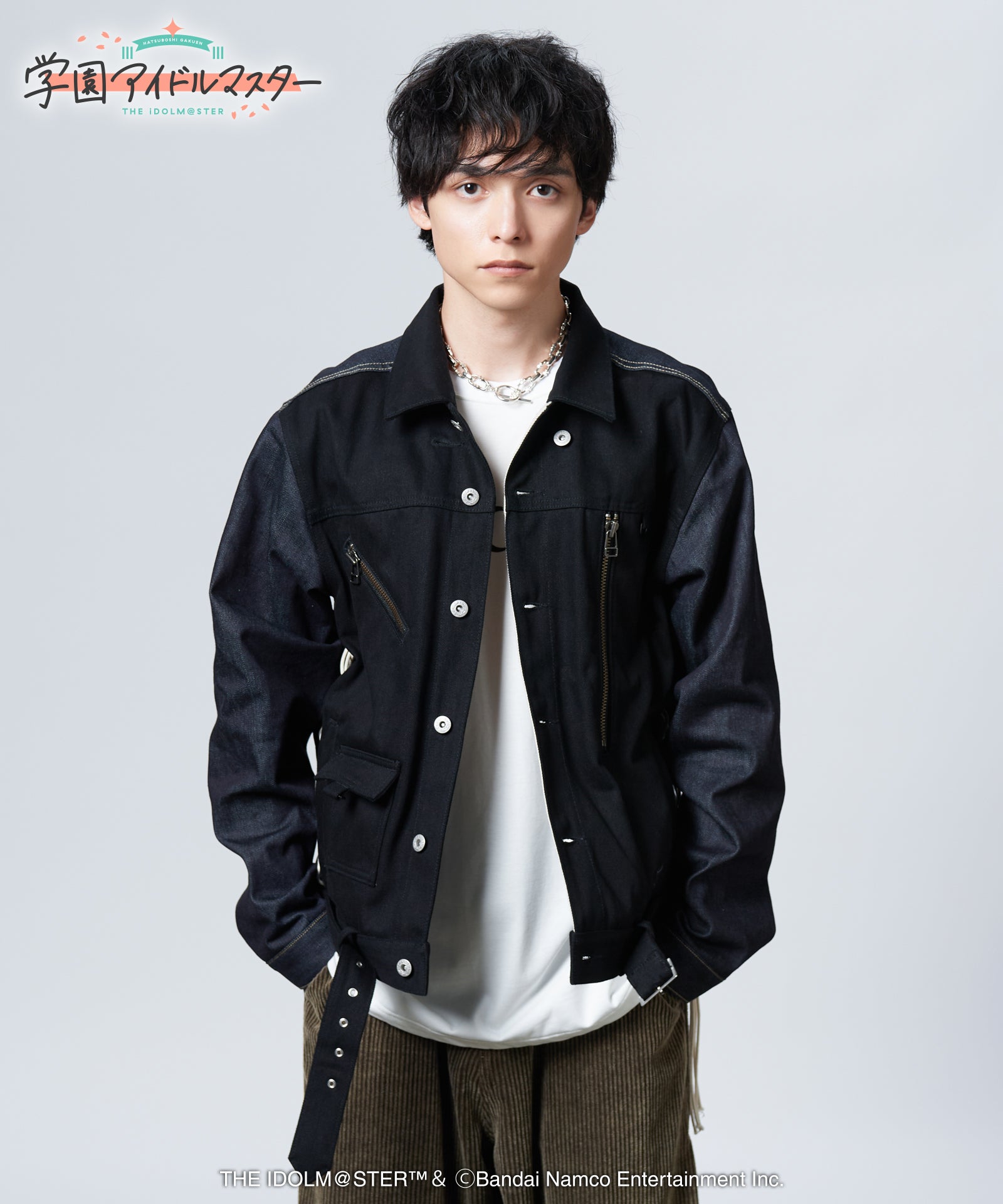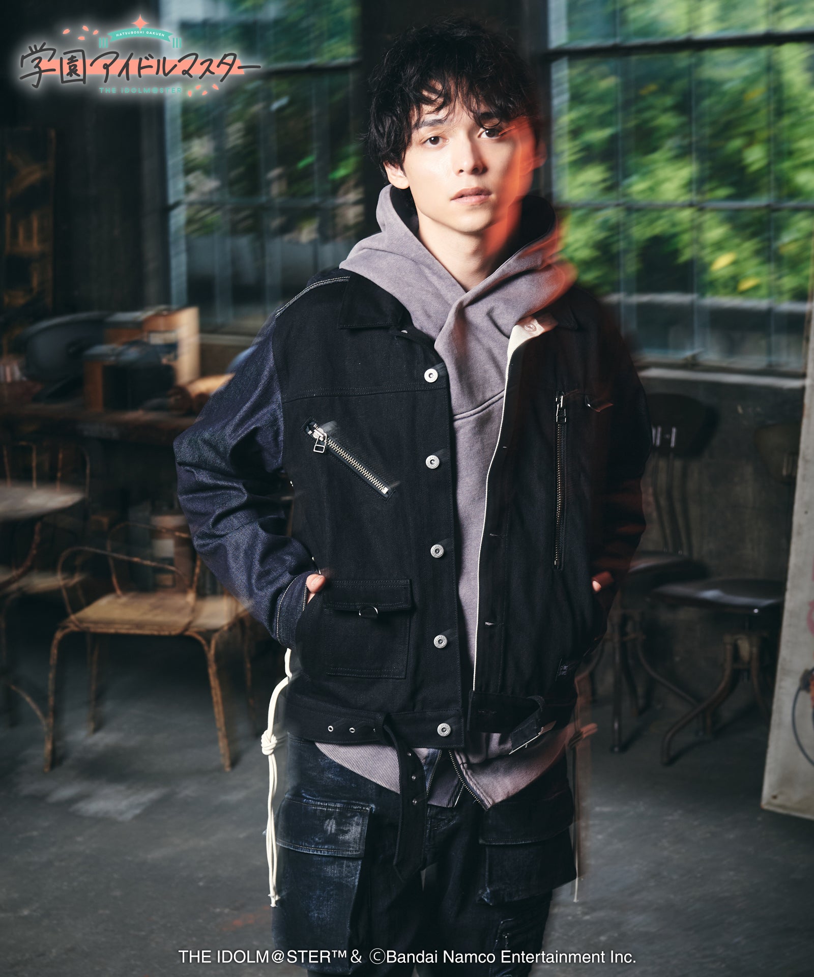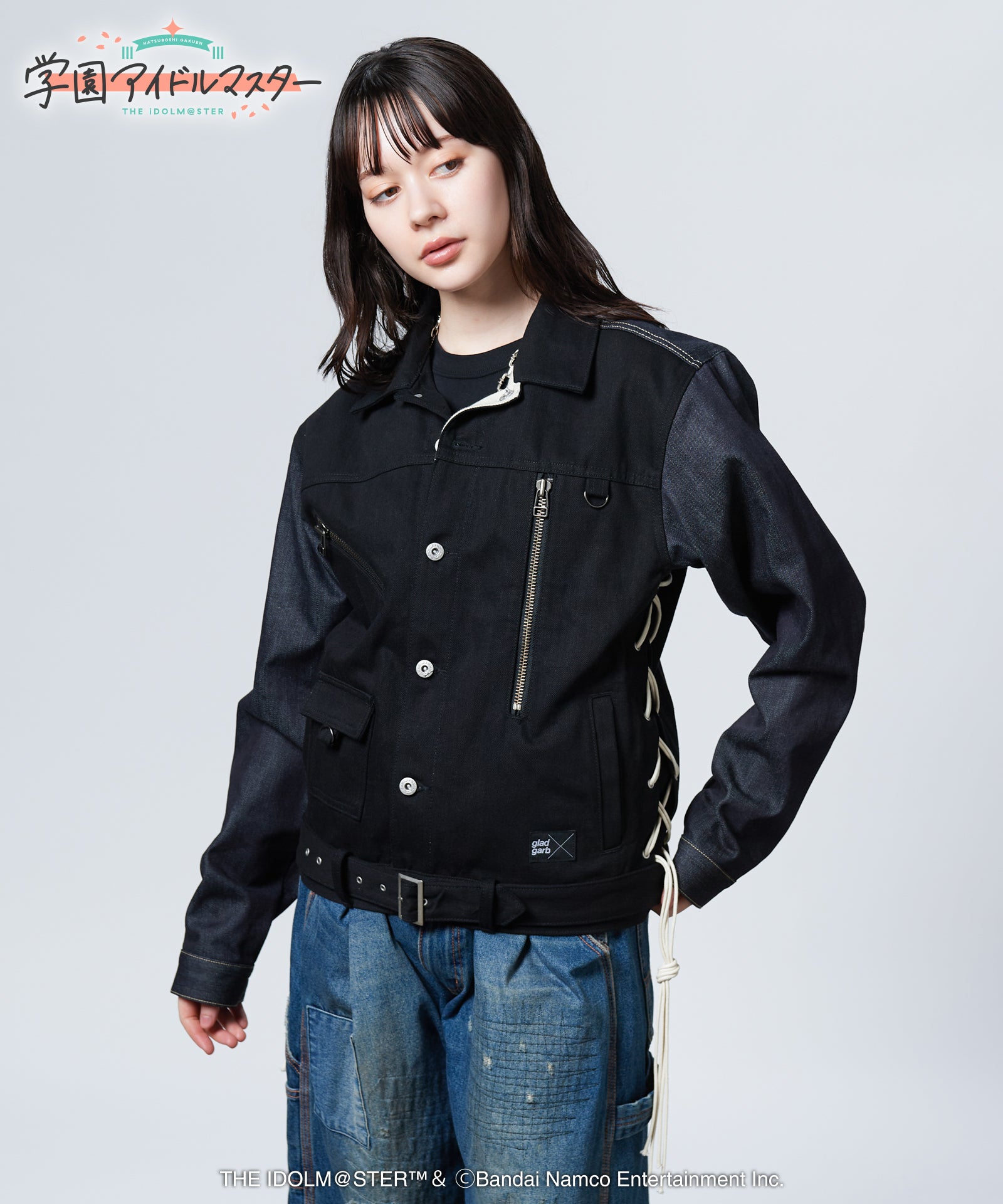 gladgarbと『学園アイドルマスター』がコラボレーション。月村手毬のソロ楽曲「Luna say maybe」の衣装をオントレンドなデニムジャケットへと再構築したLuna say maybe Denim Jacket。オリジナルに見せるライダースライクなラギッドさは継承しながら、テキスタイルにデニムを用いることでカジュアルな印象に。アームとボディをインディゴとブラックで切り替えることで、デニムらしい素材使いで衣装デザインを再現しました。さらにディテールを見ると、ベースとなった衣装の胸元を折り返す着こなしを襟を開いてボディに留めて裏地を見せることで表現。ジッパーやポケットのDカンもオリジナル同様に配しながら、衣装のスカートに見られる編み込みをボディサイドにアレンジにすることでパンクのニュアンスを持たせました。シルエットは身幅にゆとりを持たせたルーズフィットながら着丈は短めに設定。素材使いと相まって現代的なスタイリングでお楽しみいただけます。