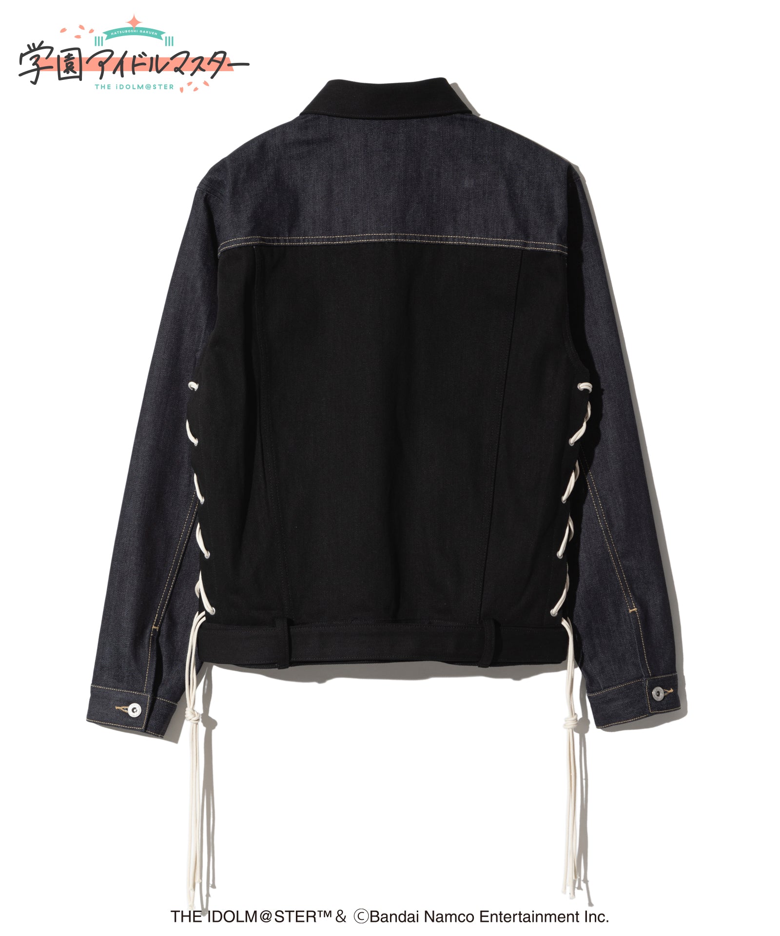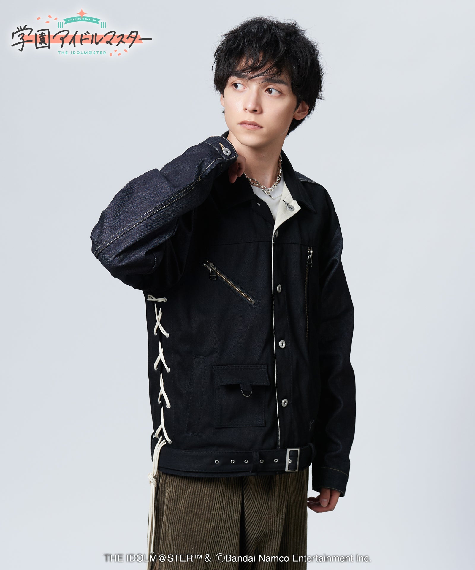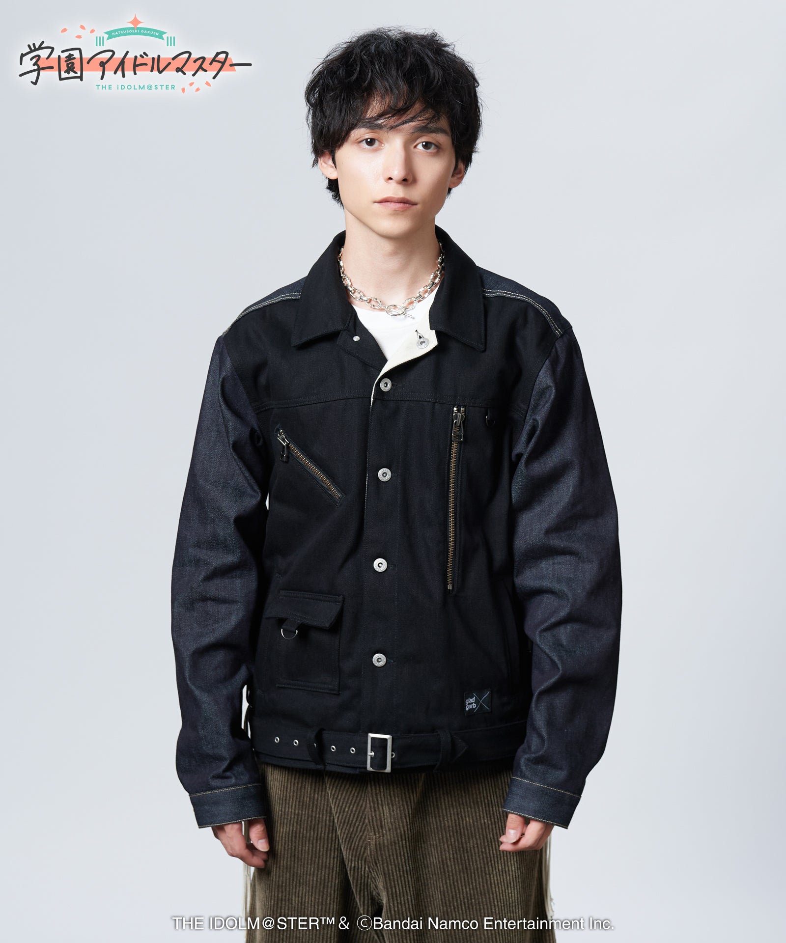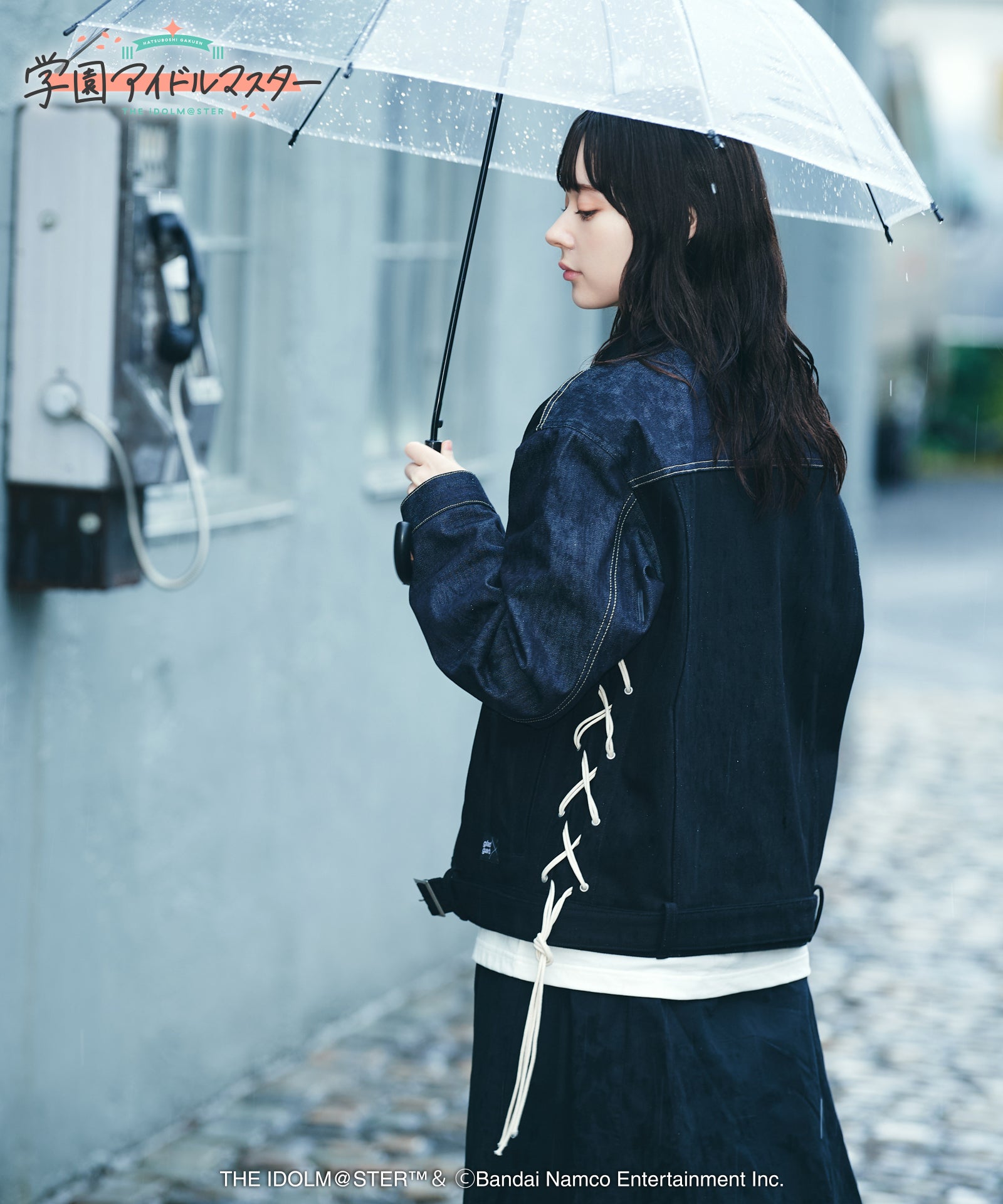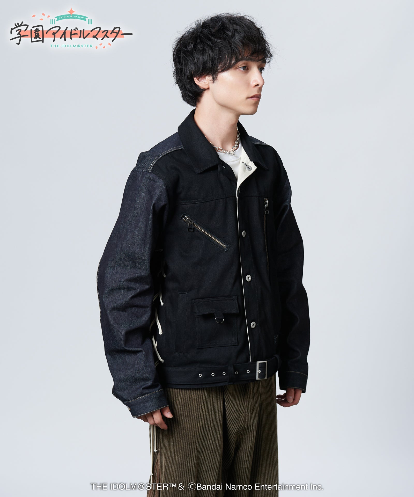 gladgarbと『学園アイドルマスター』がコラボレーション。月村手毬のソロ楽曲「Luna say maybe」の衣装をオントレンドなデニムジャケットへと再構築したLuna say maybe Denim Jacket。オリジナルに見せるライダースライクなラギッドさは継承しながら、テキスタイルにデニムを用いることでカジュアルな印象に。アームとボディをインディゴとブラックで切り替えることで、デニムらしい素材使いで衣装デザインを再現しました。さらにディテールを見ると、ベースとなった衣装の胸元を折り返す着こなしを襟を開いてボディに留めて裏地を見せることで表現。ジッパーやポケットのDカンもオリジナル同様に配しながら、衣装のスカートに見られる編み込みをボディサイドにアレンジにすることでパンクのニュアンスを持たせました。シルエットは身幅にゆとりを持たせたルーズフィットながら着丈は短めに設定。素材使いと相まって現代的なスタイリングでお楽しみいただけます。