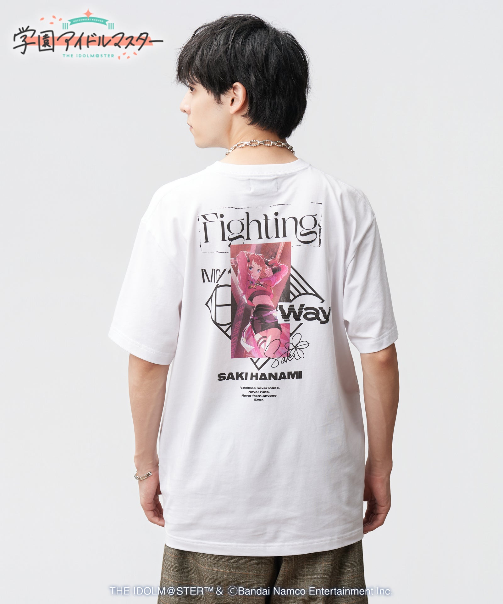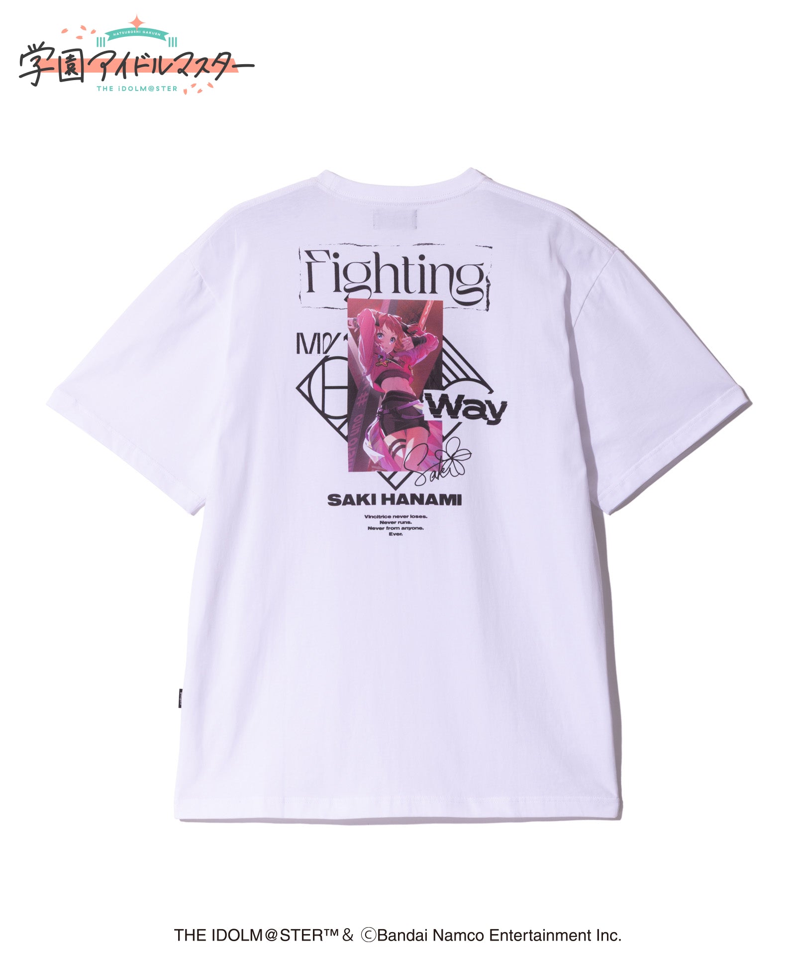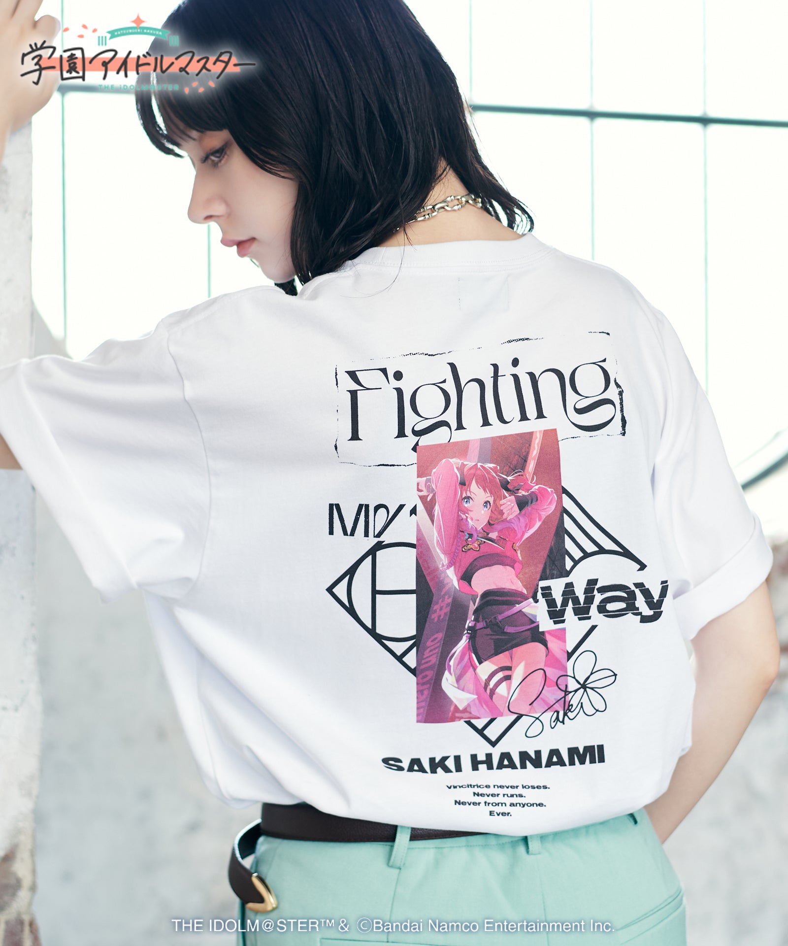 gladgarbと『学園アイドルマスター』がコラボレーション。花海咲季をパンキッシュなコラージュアートに落とし込んだFighting My Way Tee。バックプリントにあしらったのは、第一弾ソロ楽曲『Fighting My Way』をモチーフとしたアートワーク。アシッドグラフィックを思わせる構図に花海咲季と楽曲のエッセンスを散りばめました。フロント胸元には花海咲季のレッスン着に見られるフレーズと、彼女のパーソナリティを表すメッセージをコラージュしてロゴ使い。ストリートのムードを持たせました。テキスタイルはしなやかな肌触りとデイリーユースにふさわしい強度を兼ね備えたコットン100%の40/2天竺。シルエットは着丈を短めに設定したルーズフィットにまとめました。